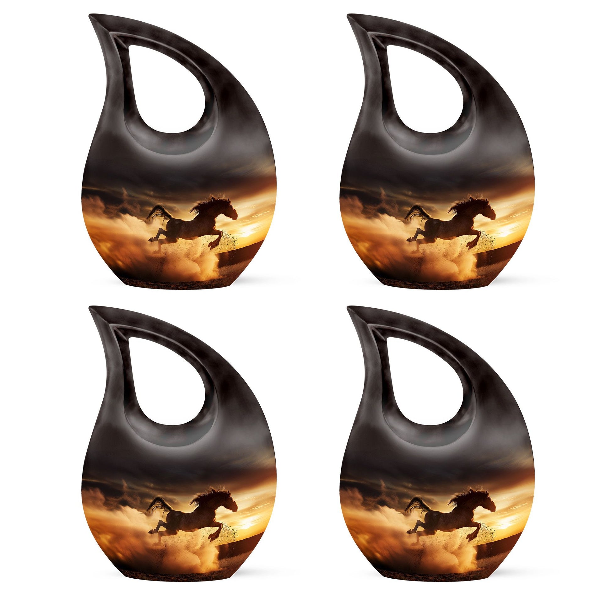 Crafted from durable aluminium, the main 10-inch urn showcases graceful horse-themed artwork, symbolizing strength, compassion, and freedom. This set is ideal for families looking for a funeral urn, funeral ashes urn, funeral urn adult, or adult funeral urn that pairs beautifully with smaller keepsake pieces. The smooth finish, secure screw-top lid, and detailed design make it a perfect choice for those seeking unique urns for human ashes, adult funeral urns, or a meaningful funeral urns for human ashes small companion set. The included mini keepsakes allow families to share memories through keepsake funeral urns, mini keepsake funeral urn, or coordinated funeral keepsake urns.