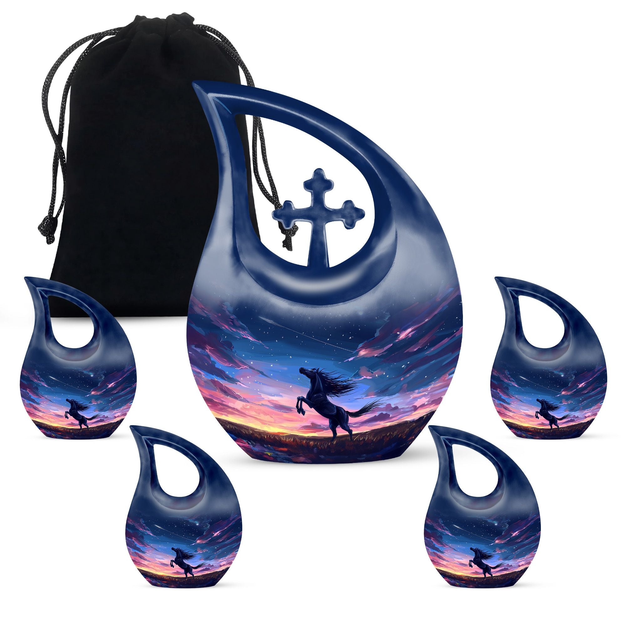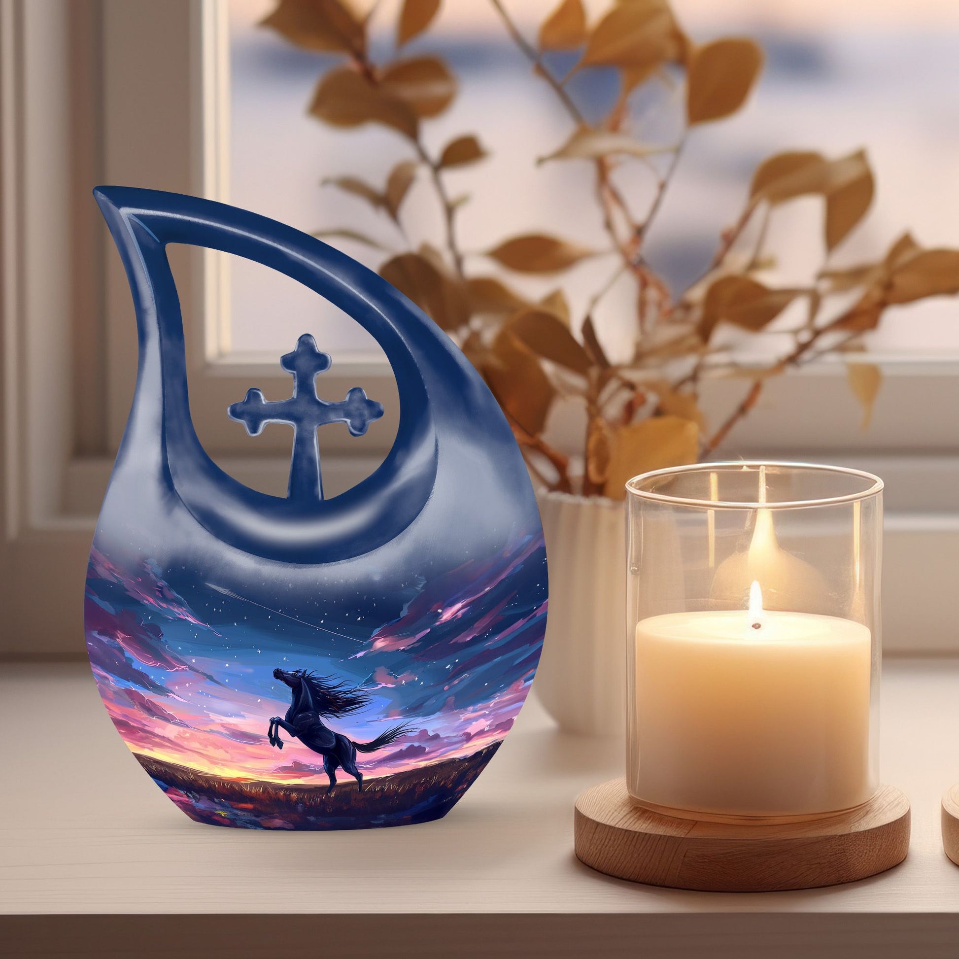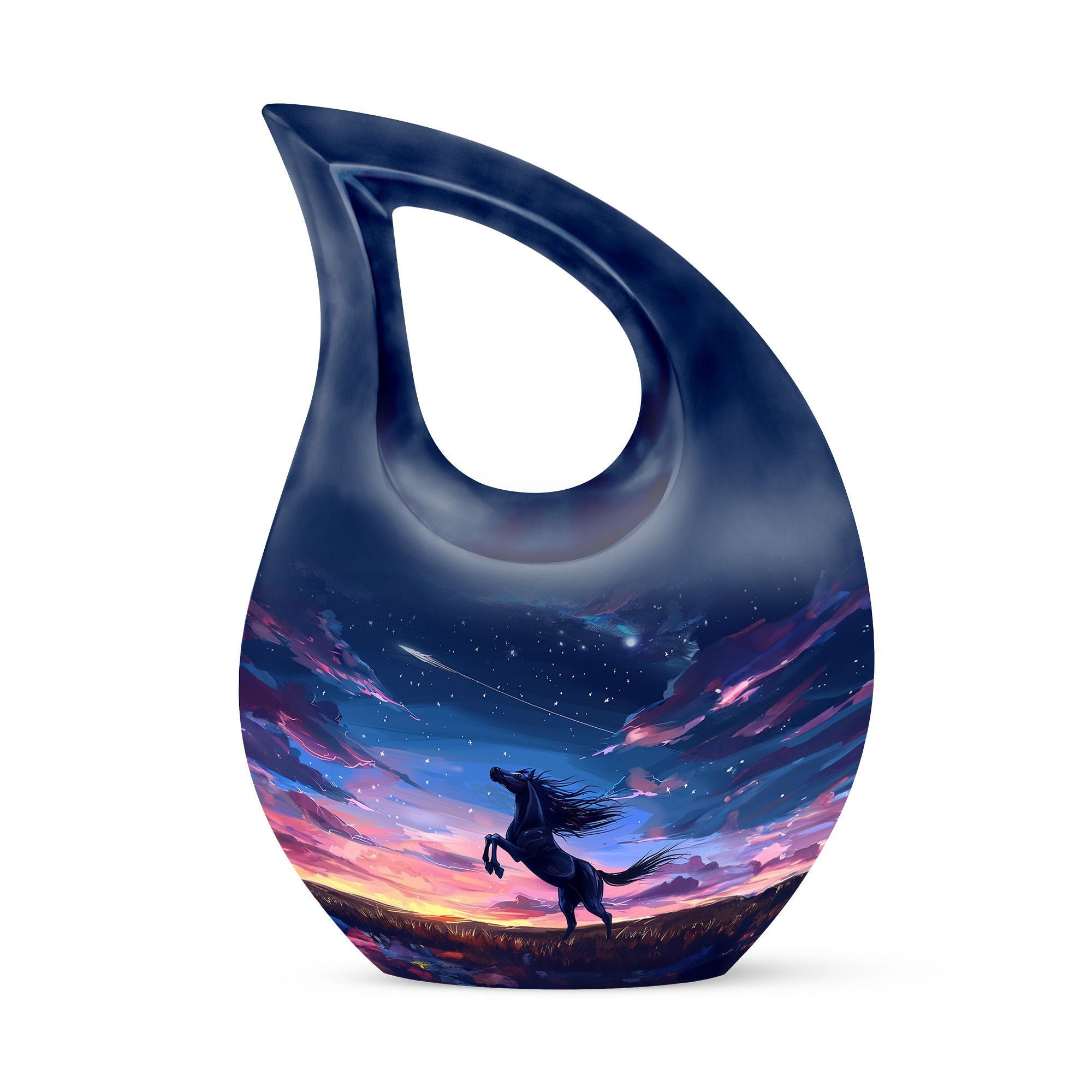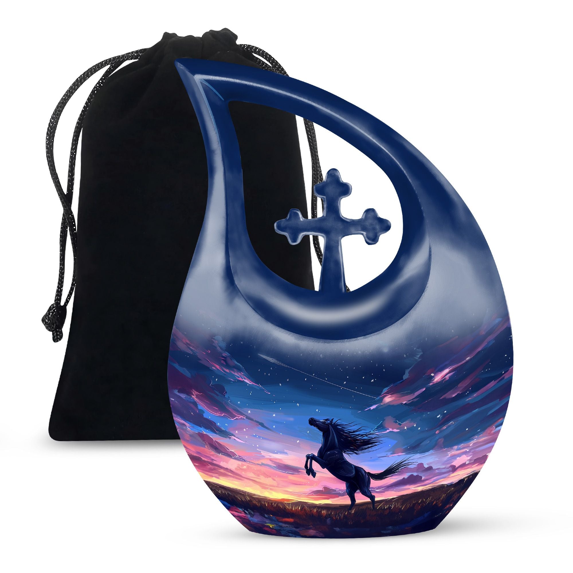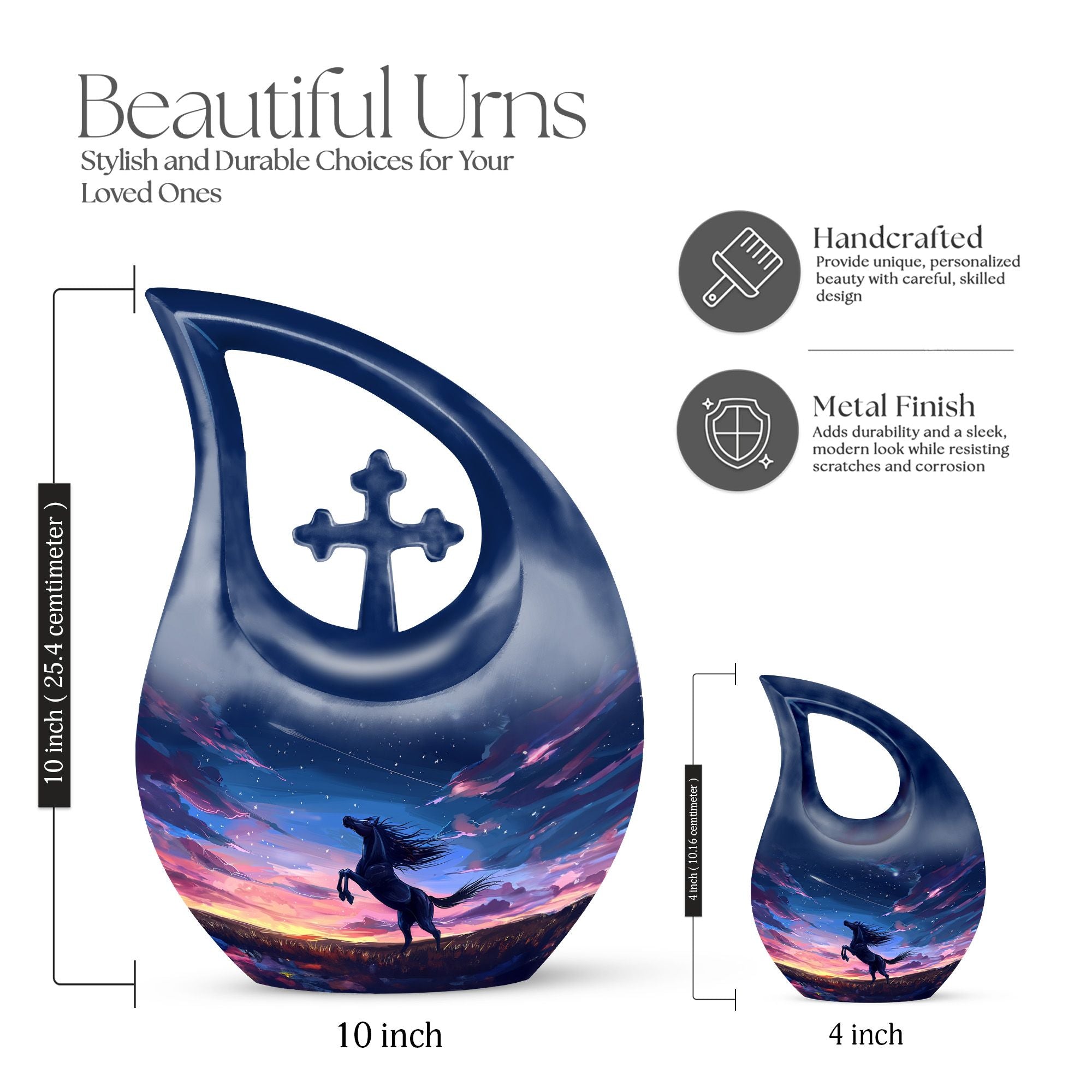 Cherish the memory of your loved one with this exquisitely crafted Horse Urn, designed specially as Large Urns. This unique Horse themed, 10-inch urn resonates with the free spirit of a galloping steed. Weighing 3.3 pounds, this aluminium urn is sturdy and lasting. Its cross drop detail is an elegant touch, symbolizing faith, courage, and eternal life. The urn offers a capacity of 200 cubic inches, sufficient to hold the ashes of adults. Along with the urn, the package includes a soft velvet pouch for safe retention of the ash. If you wish, choose to personalize this unique piece with engraved names as a special tribute. This undoubtedly makes our Horse Urn a standout among other memorial urns, companion urns for adults, or even box urns for human ashes. Rest assured, it's an authentic way to honor your loved one's journey, making it a valuable addition to your memorial ceremony supplies.