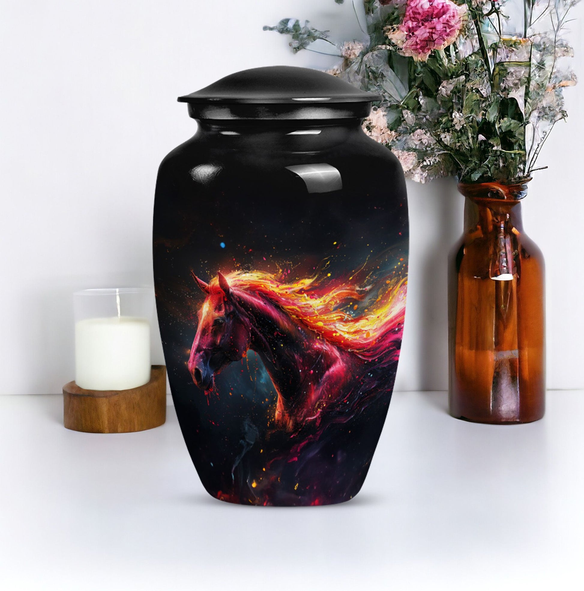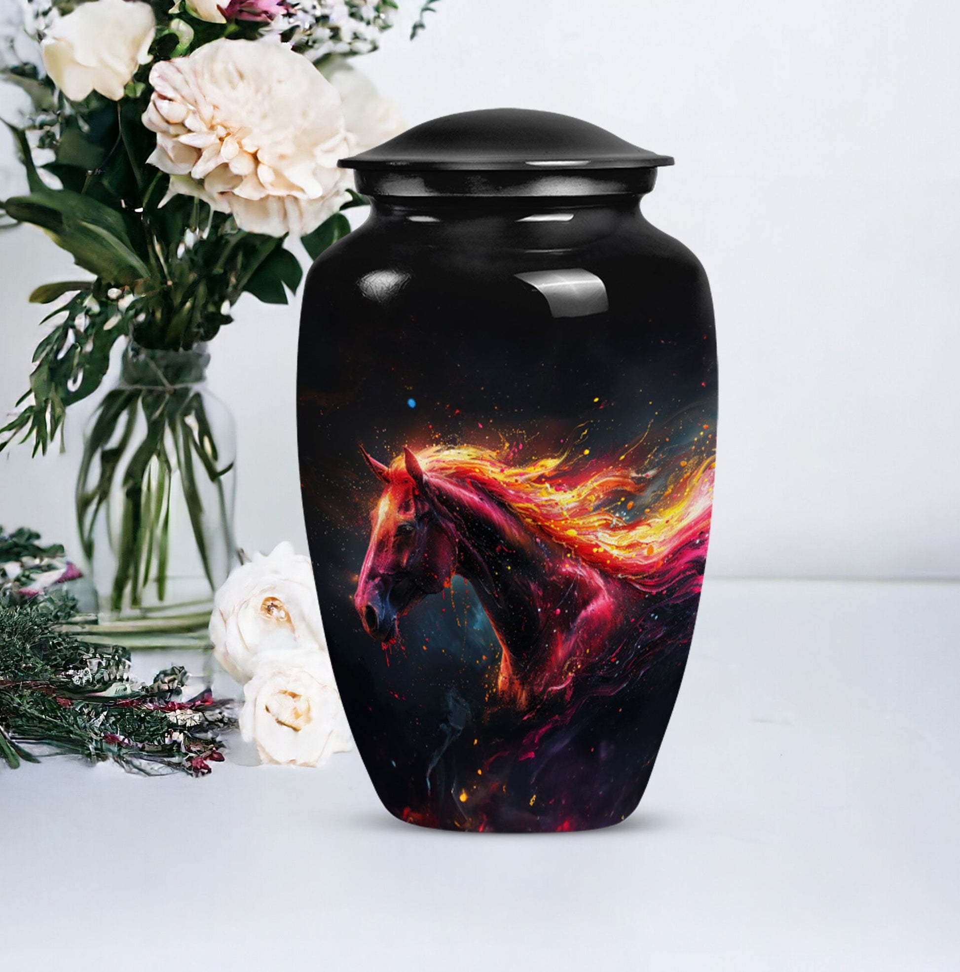 For those seeking closure and grandeur, this 10-inch Horse Urn is a touching and robust testament to your loved one's memories. Crafted from durable Aluminium, this 3.3 pound 'funeral urn for men ashes' provides a fitting vessel for honoring those who lived fully and loved with intensity. Boasting a capacity of 200 cubic inches, it impeccably infuses magnitude and meaning into the mourning process. The abstract theme adds a touch of timeless artistry, making it a stand-out among 'Large Urns.' Every package is complete with a tender velvet pouch to faithfully hold the ashes. We further offer personalized engravings to add a touch of individuality, ensuring every memory is immortalized caring. This 'cremation urn' strikes a sumptuous balance between mourning and celebration, making it an exceptional pick within our 'Adult Urns for Ashes' and 'Decorative Human Ashes Urns' collection. Unleash the freedom of loving memory with the Horse Urn.