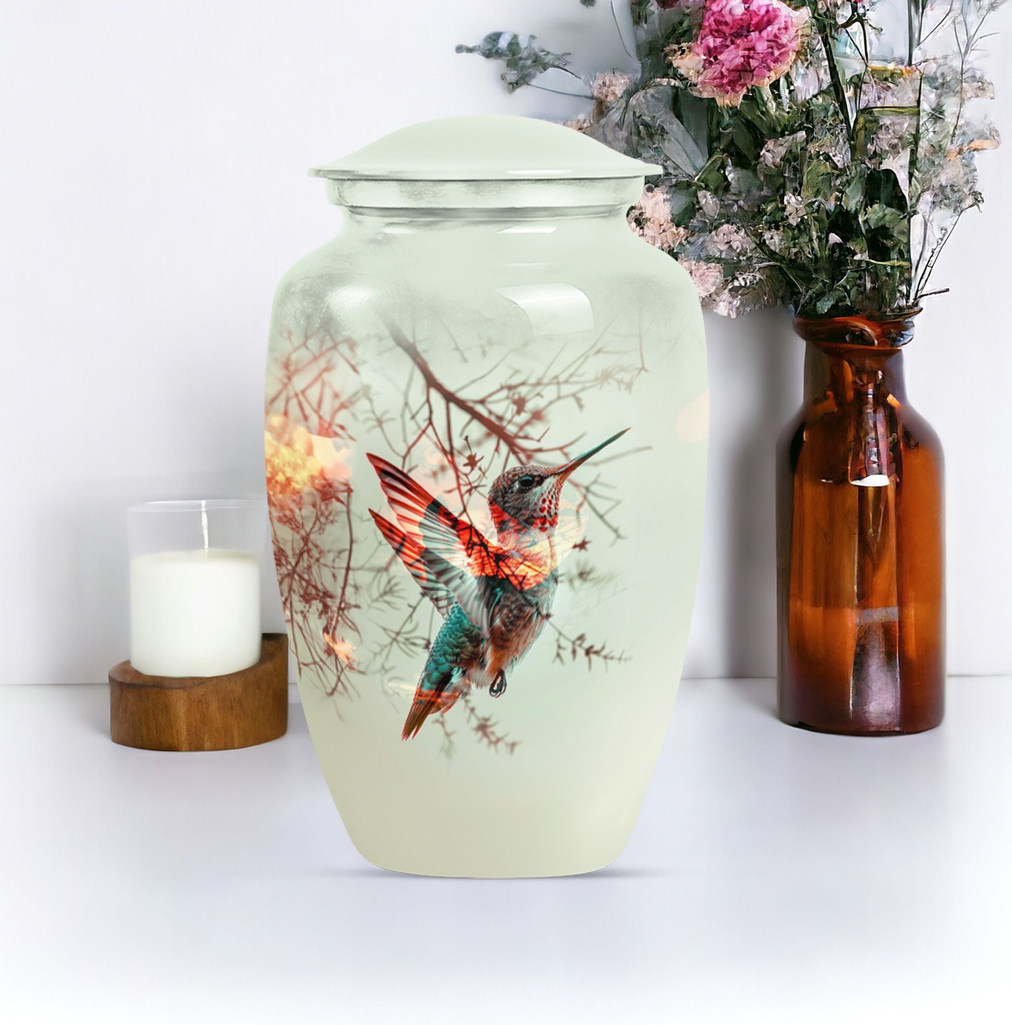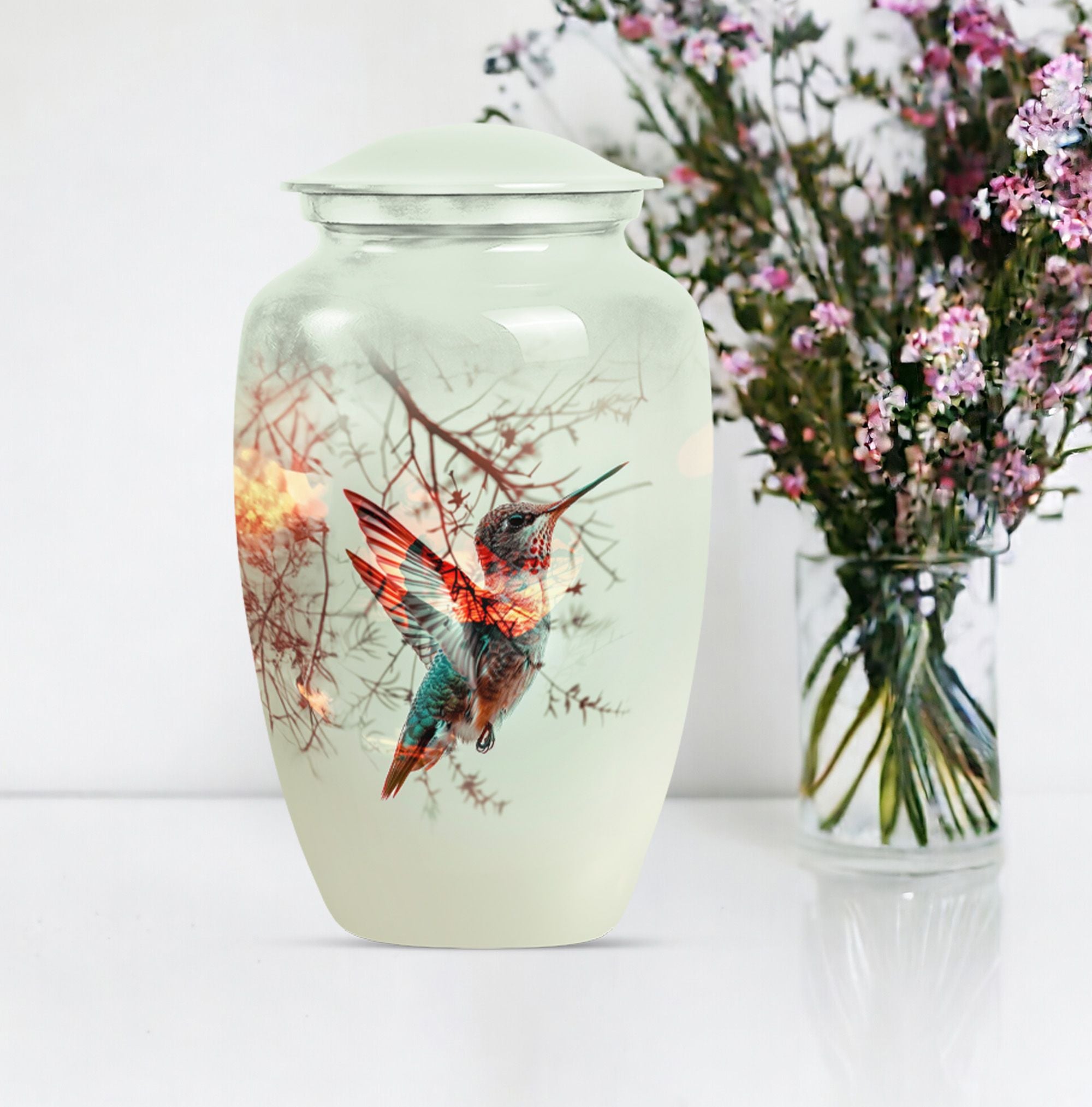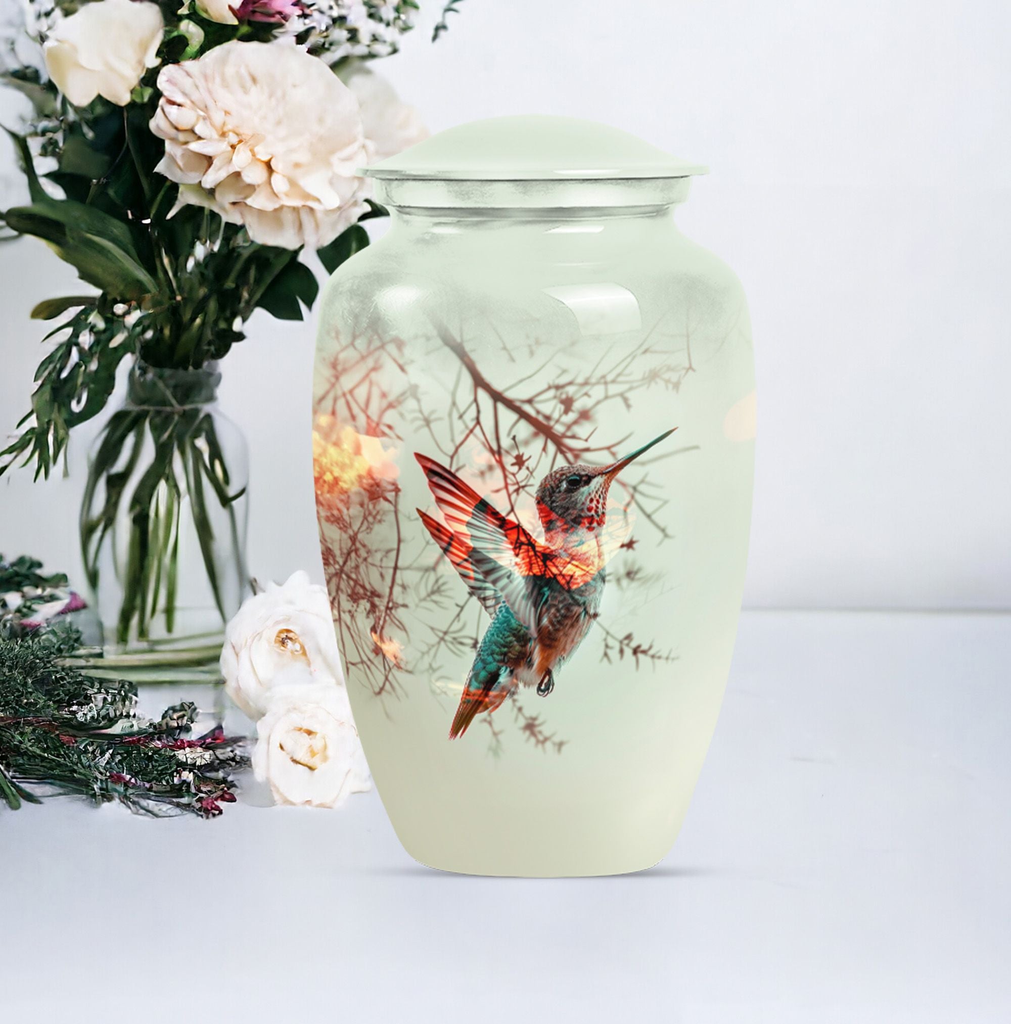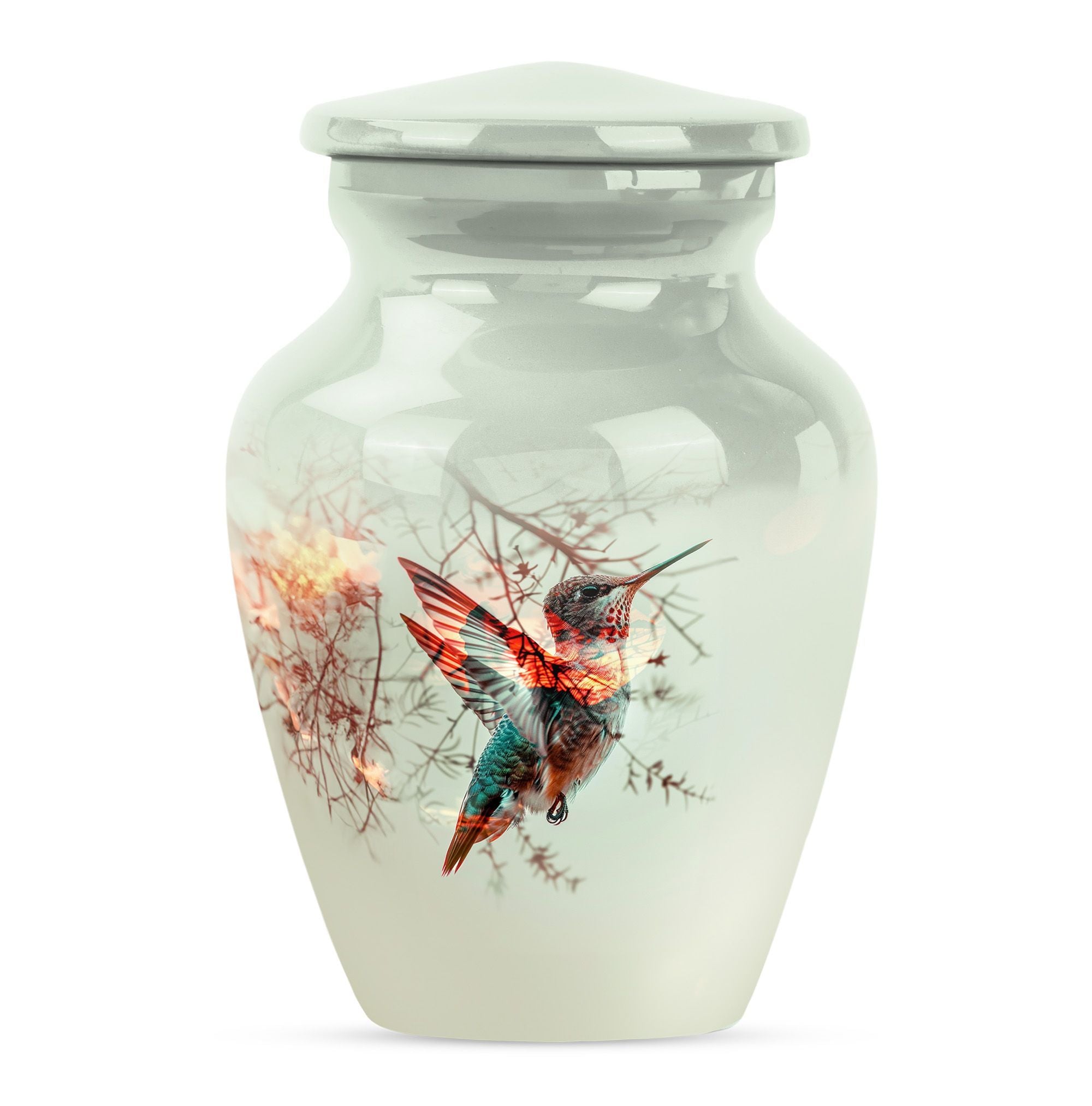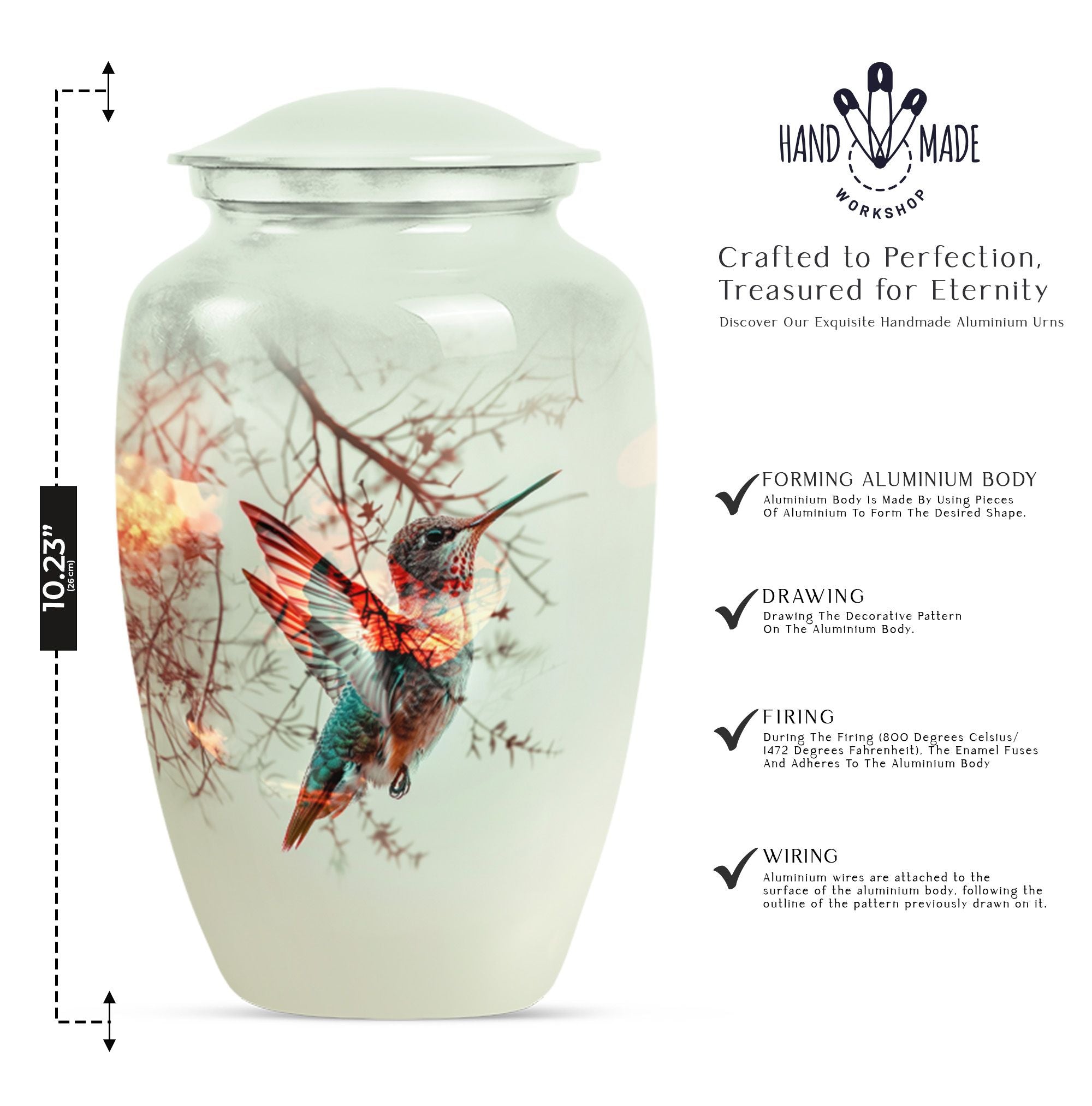 This captivating 10-inch 'Humming Bird Urn' is meticulously crafted to honour your loved one's life. Our type-Large Urns are timelessly elegant, exuding the beauty of their abstract theme. These cremation funeral urns are made of the highest quality aluminium, ensuring utmost durability and preserving the integrity of its content. Weighing a mere 3.3 pounds and standing 10 inches high, this urn has a capacity of 200 cubic inches, sizable enough to accommodate the ashes of an adult male. We offer the ability to personalize this cremation urn with engraved names, adding an intimate touch to this memorial. Furthermore, this purchase comes with a delicate velvet pouch, providing a respectful containment for the ashes. These funeral decorative urns personify a gentle hummingbird's serenity and grace and are surely the final respectful resting vessel your loved one deserves. Frequently found by searches for 'urns for ashes' and 'cremation urns for human ashes,' this product is a popular choice for many in need of a respectful and sentimental keepsake.