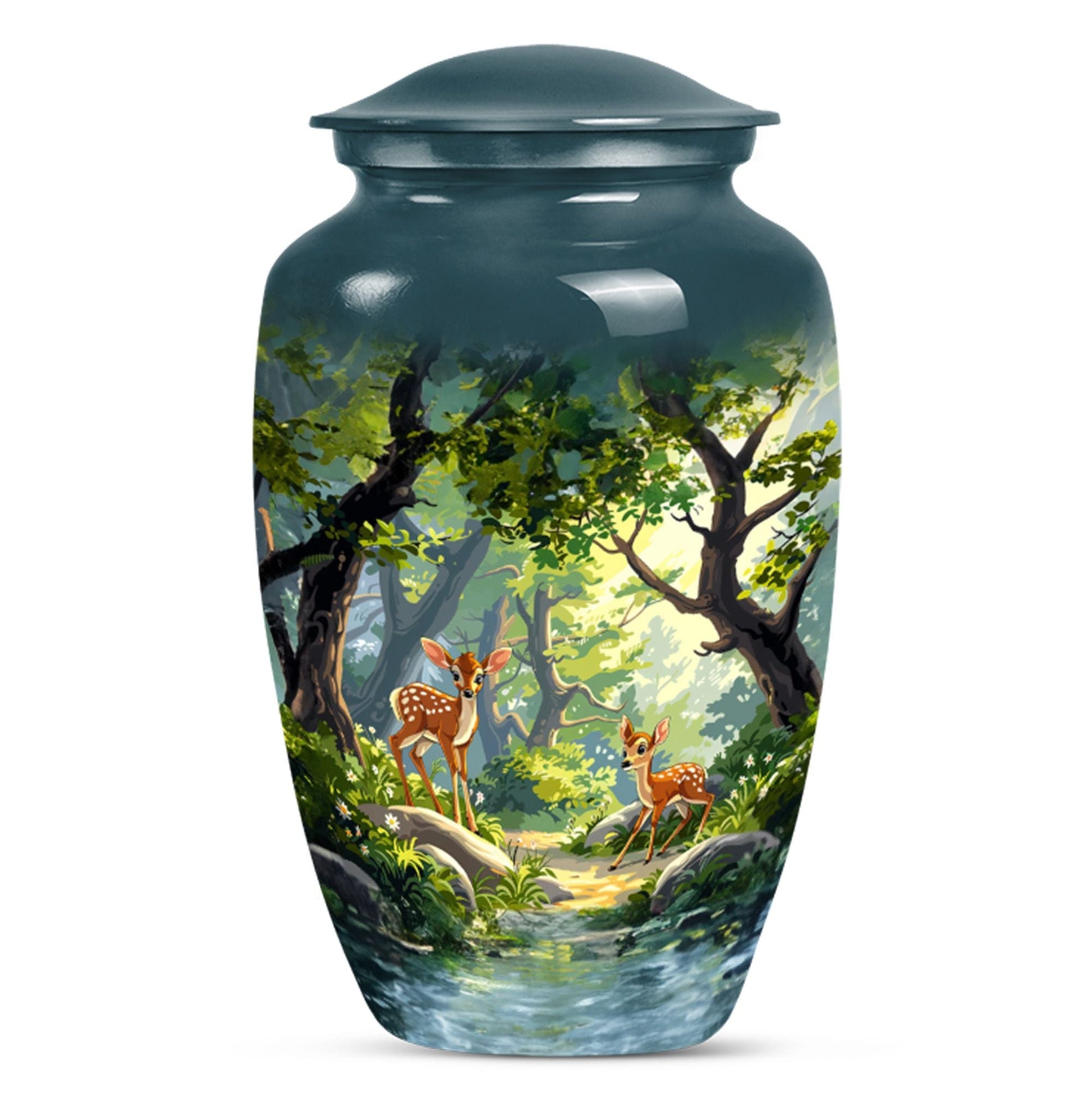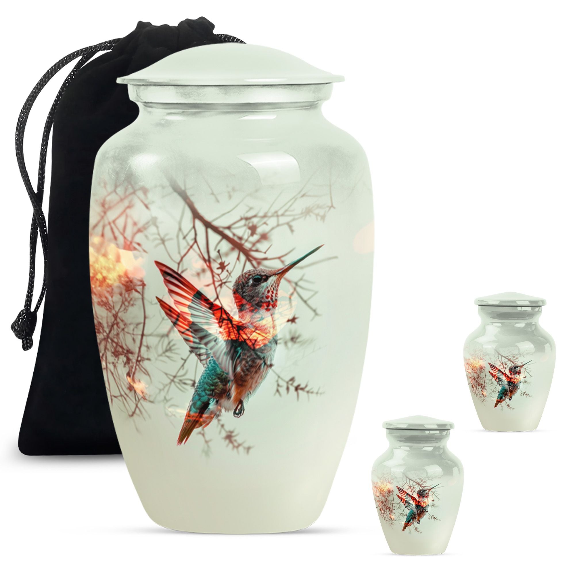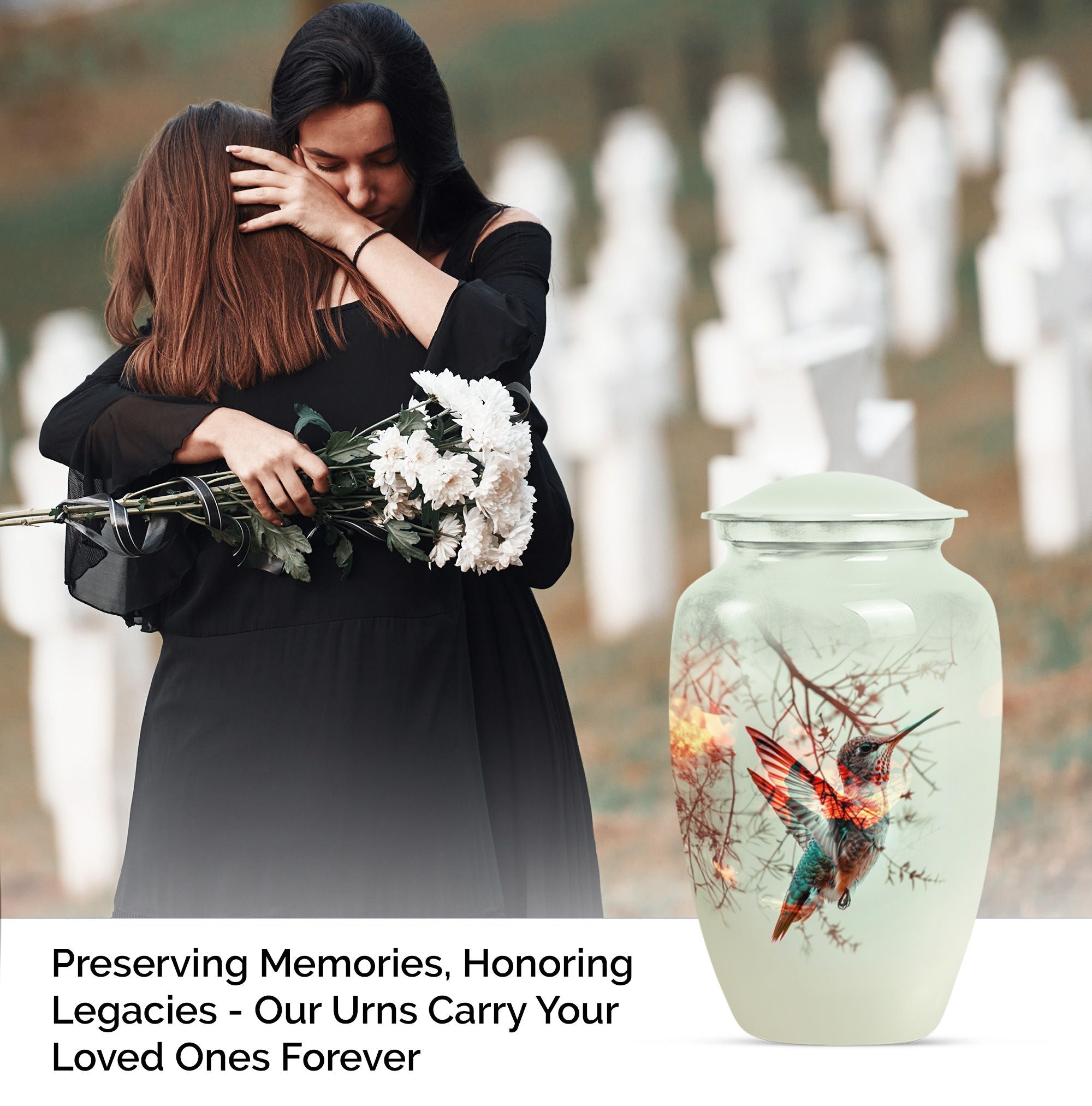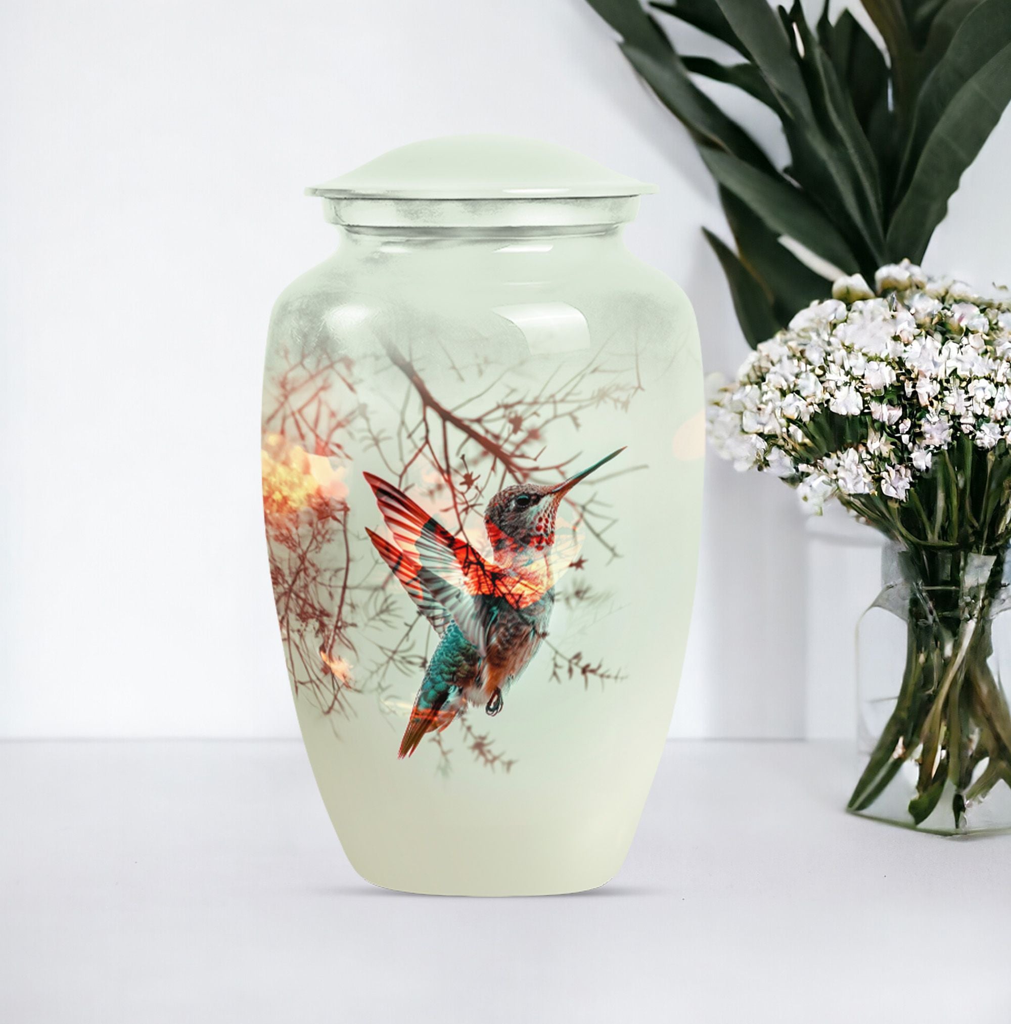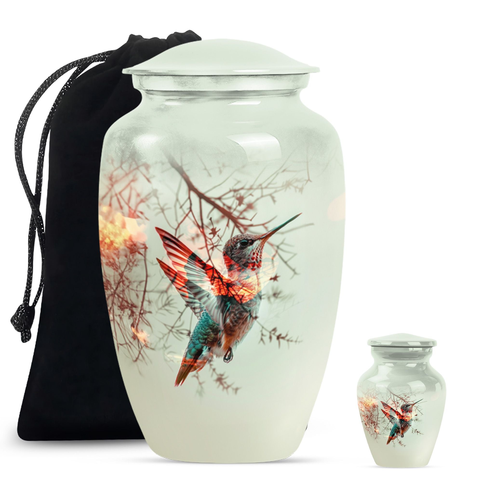 This captivating 10-inch 'Humming Bird Urn' is meticulously crafted to honour your loved one's life. Our type-Large Urns are timelessly elegant, exuding the beauty of their abstract theme. These cremation funeral urns are made of the highest quality aluminium, ensuring utmost durability and preserving the integrity of its content. Weighing a mere 3.3 pounds and standing 10 inches high, this urn has a capacity of 200 cubic inches, sizable enough to accommodate the ashes of an adult male. We offer the ability to personalize this cremation urn with engraved names, adding an intimate touch to this memorial. Furthermore, this purchase comes with a delicate velvet pouch, providing a respectful containment for the ashes. These funeral decorative urns personify a gentle hummingbird's serenity and grace and are surely the final respectful resting vessel your loved one deserves. Frequently found by searches for 'urns for ashes' and 'cremation urns for human ashes,' this product is a popular choice for many in need of a respectful and sentimental keepsake.