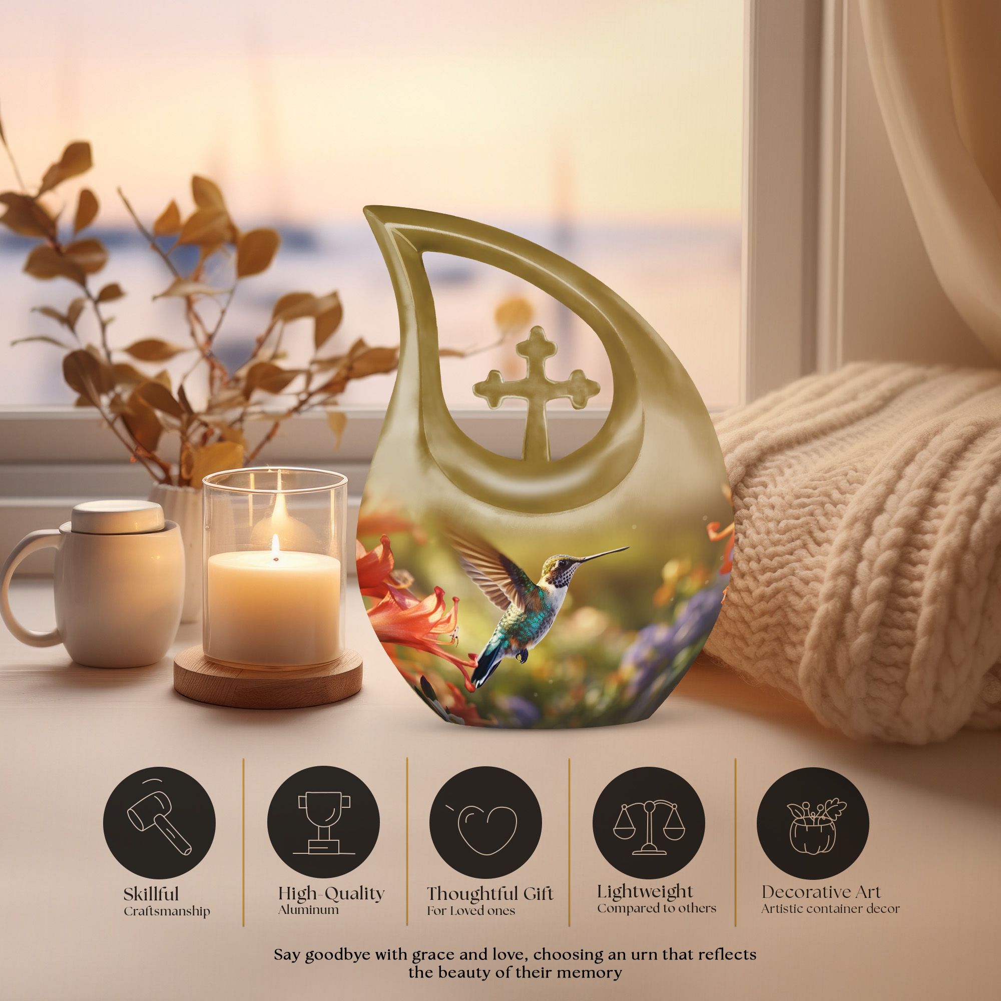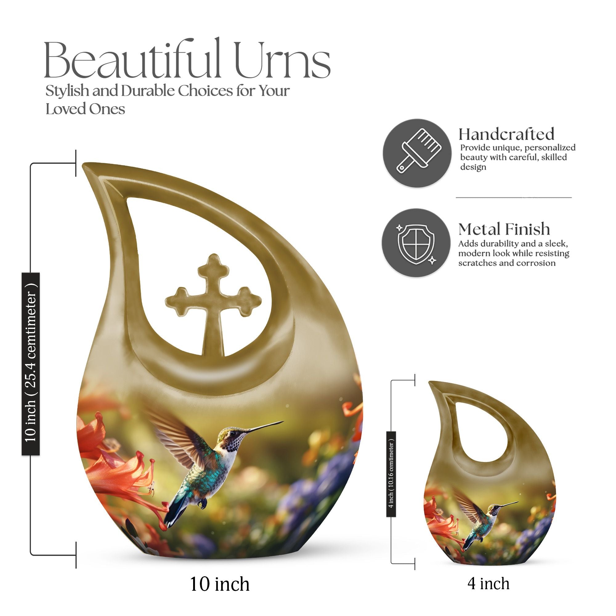 Crafted from durable aluminium, this urn features a beautiful green hummingbird design set against a calming background, creating a serene and symbolic memorial. Its polished finish and detailed artwork make it ideal for families needing an ashes keepsake urn, elegant keepsake urns for ashes, or keepsake companions such as keepsake urns for human ashes dad or a classic urn for ashes keepsake. The secure screw-top lid ensures lasting protection, while the 10-inch size provides ample capacity for adult remains. Families may also pair this urn with matching mini options like keepsake for human ashes, memorial keepsake, or memorial urns for human ashes keepsake for shared remembrance.