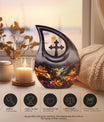 This memorial urn creates a soothing remembrance space, offering comfort through its gentle artwork and symbolic representation of peace and spiritual continuity. Whether chosen for men or women, it provides a heartfelt and timeless tribute.