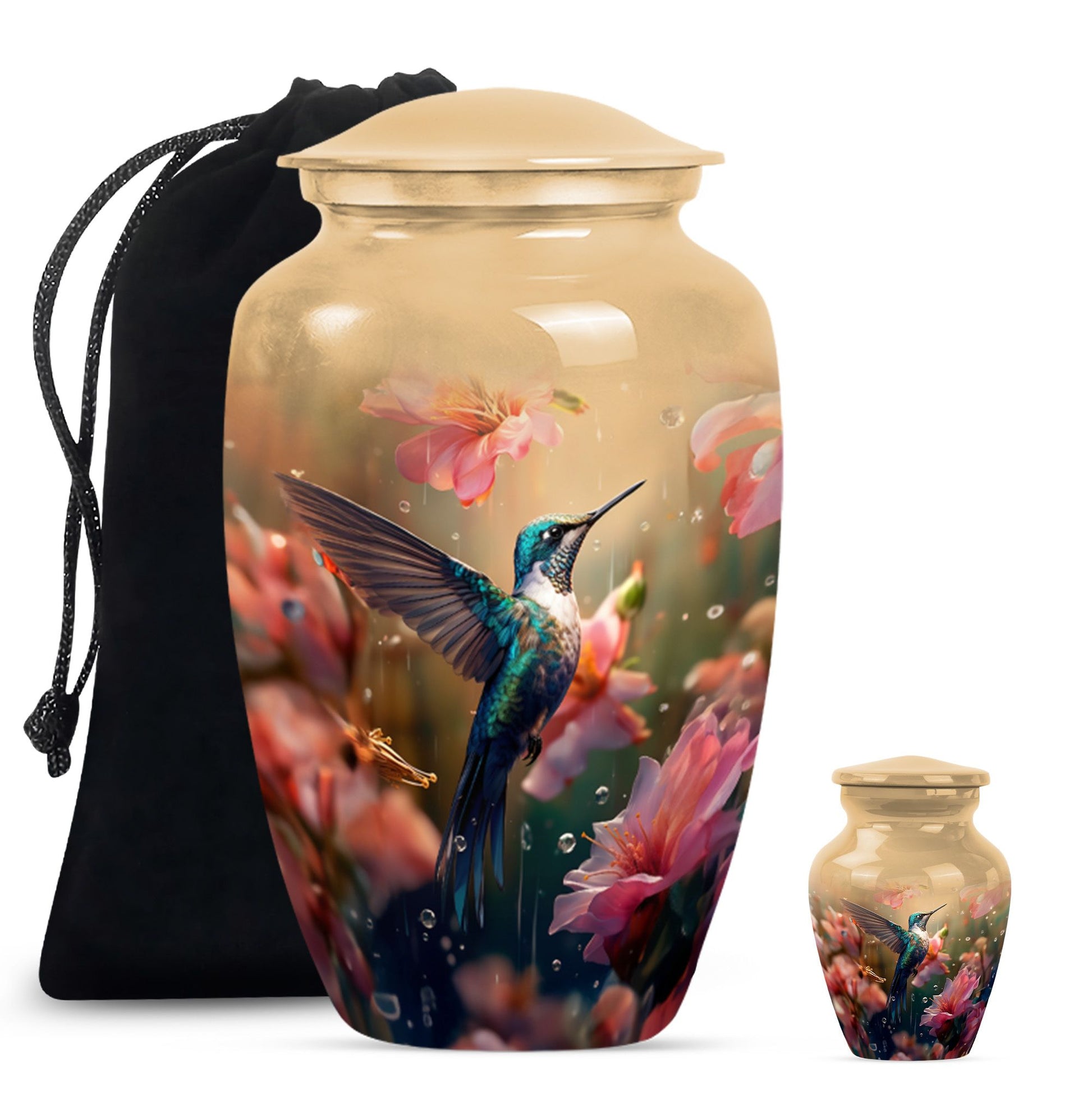 Preserve valuable memories of your loved ones with our refined 10-inch hummingbird urn. This large urn, made for preserving human ashes of an adult male or female, brings an abstract theme. Crafted from high-quality aluminium, the urn has a remarkable solid build that boasts longevity. Weighing a sturdy 3.3 pounds, this urn provides a capacity of up to a spacious 200 cubic inches. The funeral large urn also comes with a velvet pouch, a deeply thoughtful touch for the containment of ashes, presenting a discrete and respectful presentation. Moreover, our urn allows you to create a personal touch with an option to personalize it with engraved names. Our hummingbird urn transcends traditional funeral large urns, providing not only a time-honored way to pay homage to those departed but also an elegant home decor item. This urn, along with cremation companion urns, makes an ideal choice in memorial urns for ashes. Note: The abstract design is inherent of the classic urn theme, setting it apart from regular offerings in the market.