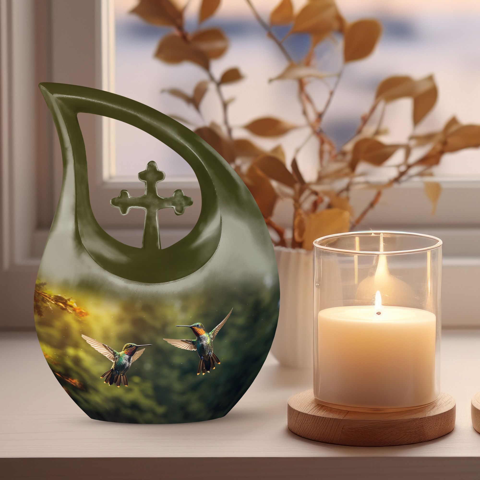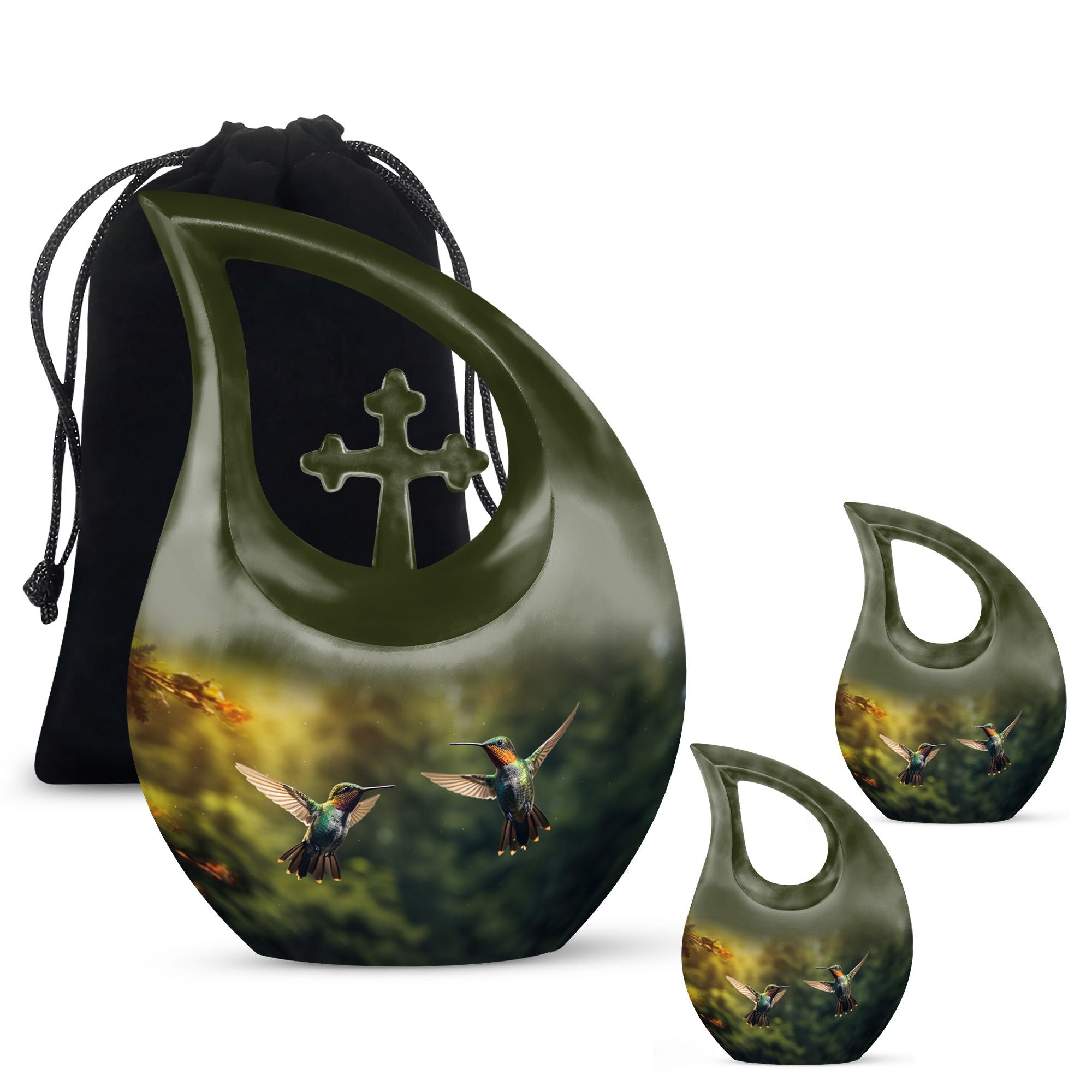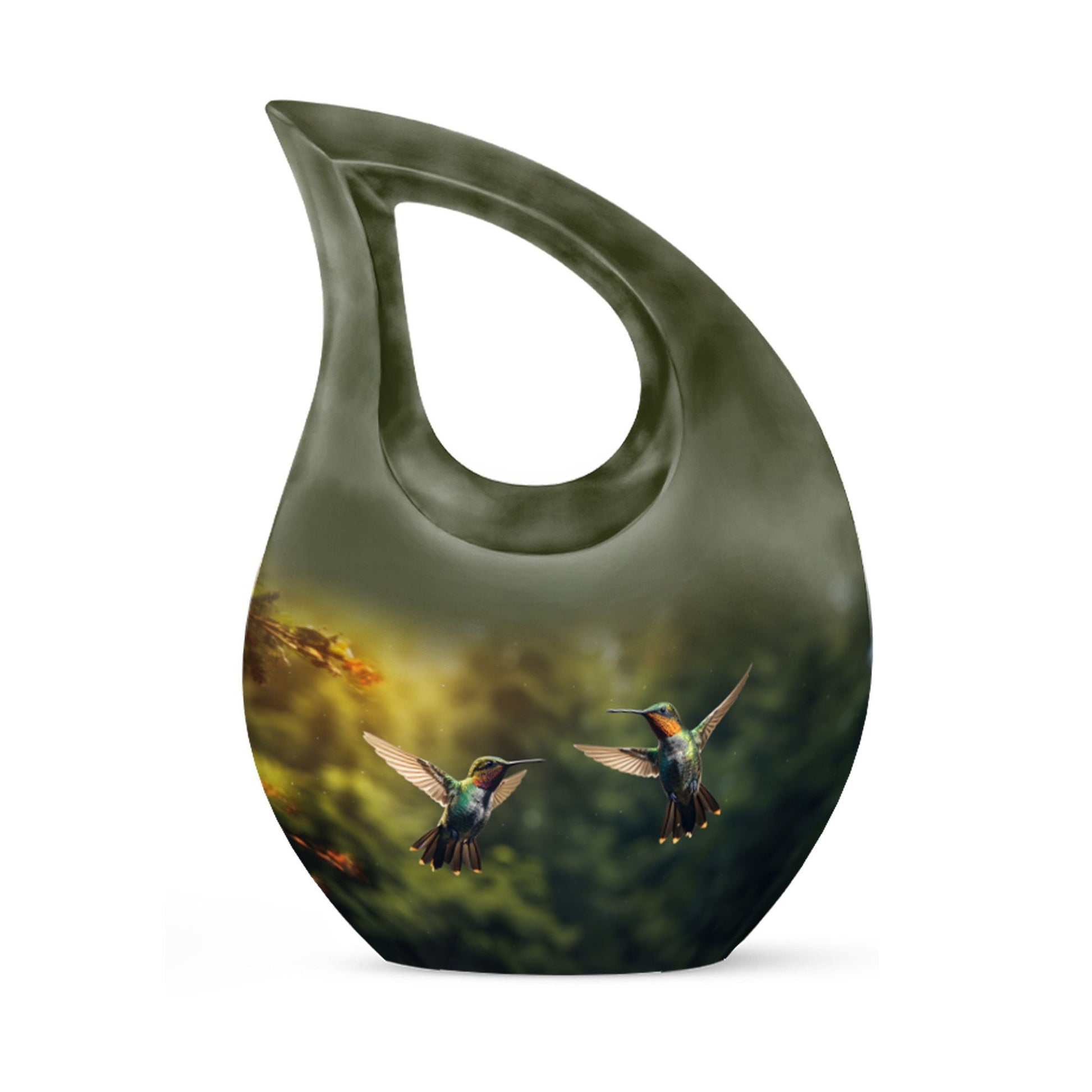 The Humming Bird Pair Urn Set beautifully reflects harmony, freedom, and the enduring bond of love. Designed as both a large memorial urn and keepsake for ashes, this elegant set symbolizes two souls united in eternal peace — much like the graceful hummingbirds depicted on its surface. Perfect for couples, parents, or loved ones, this urn set offers a dignified tribute for remembrance and connection.