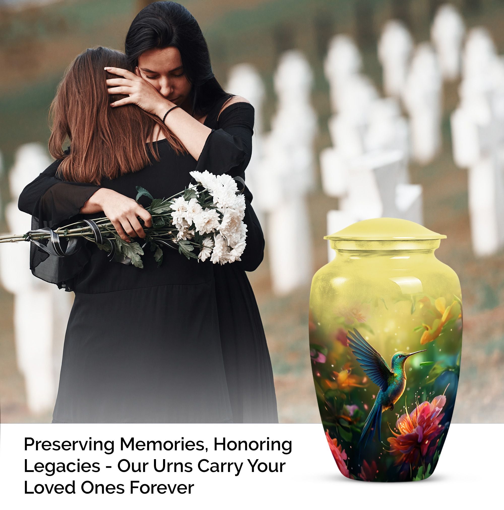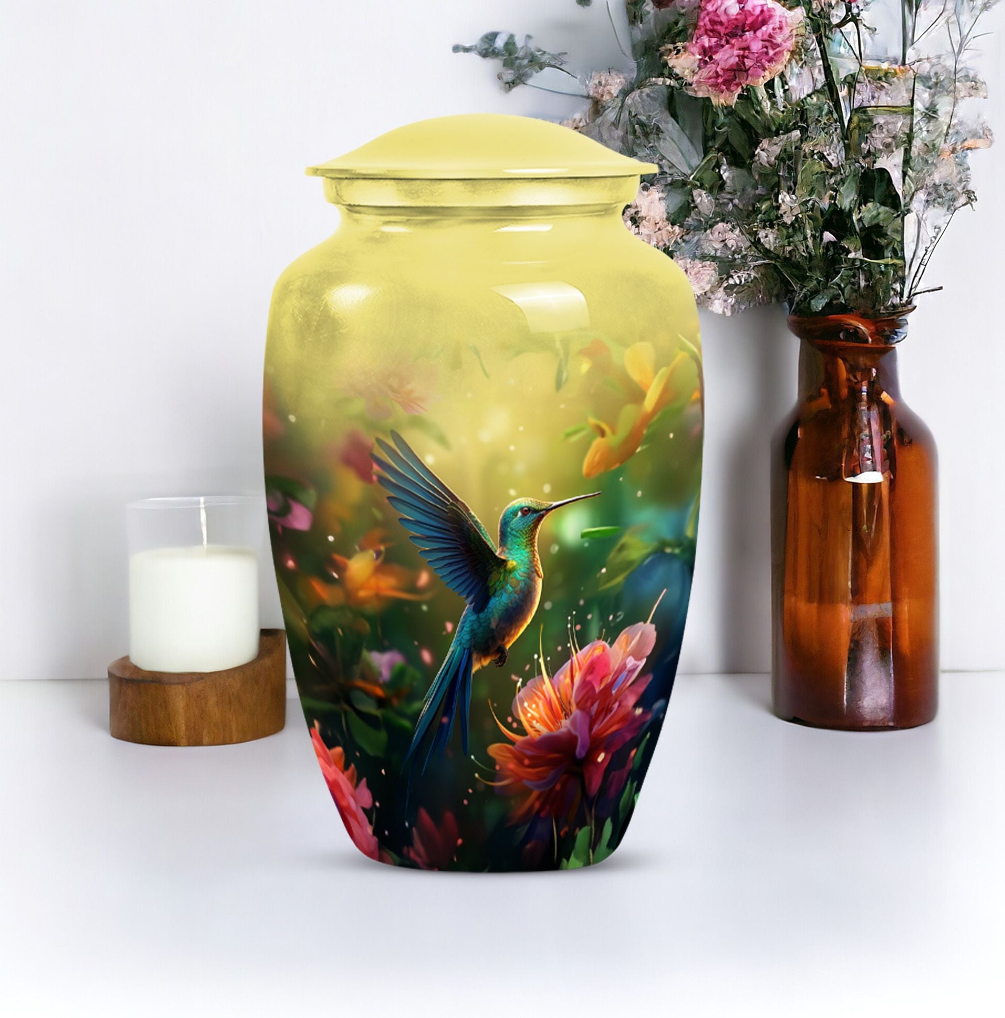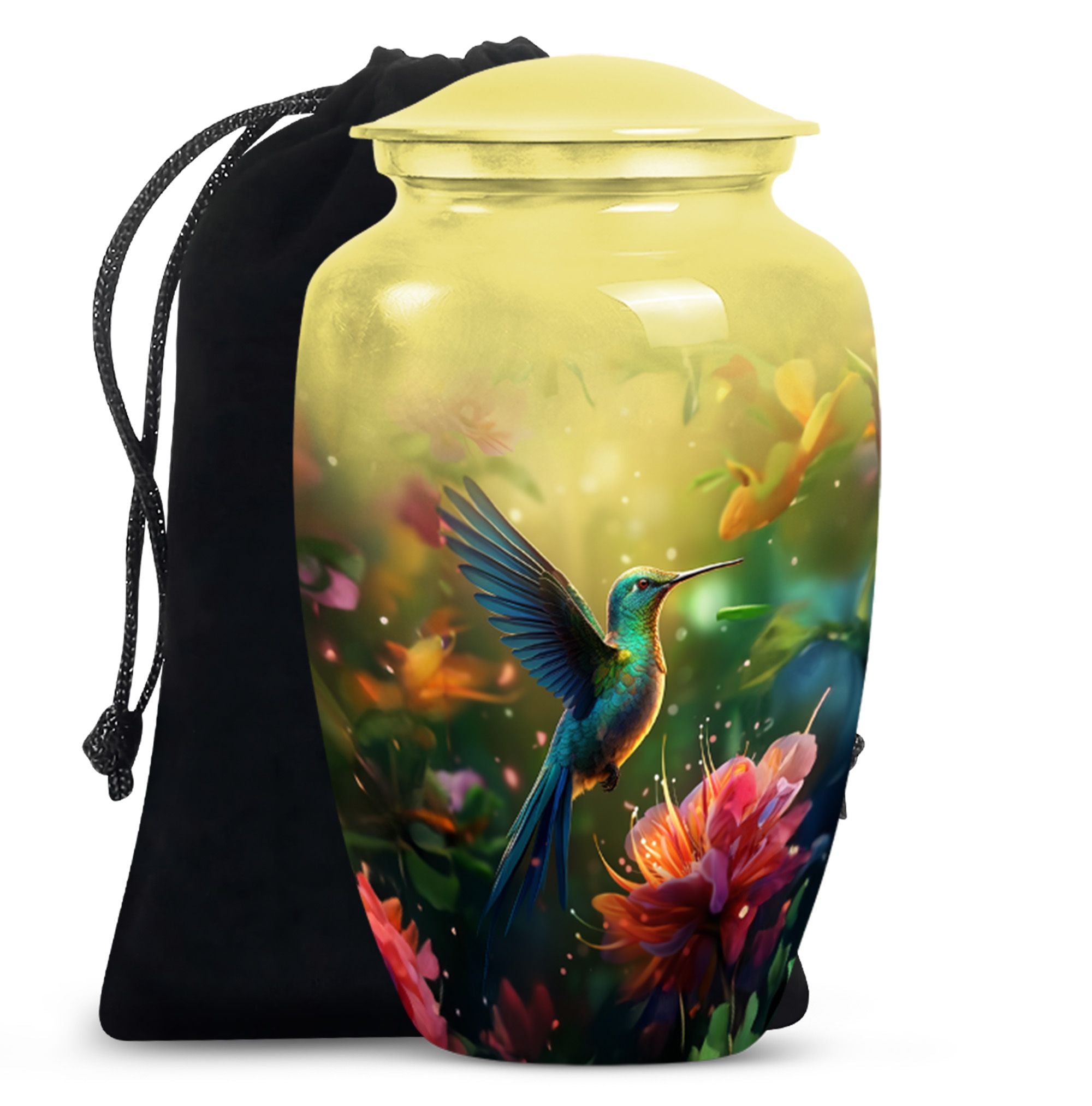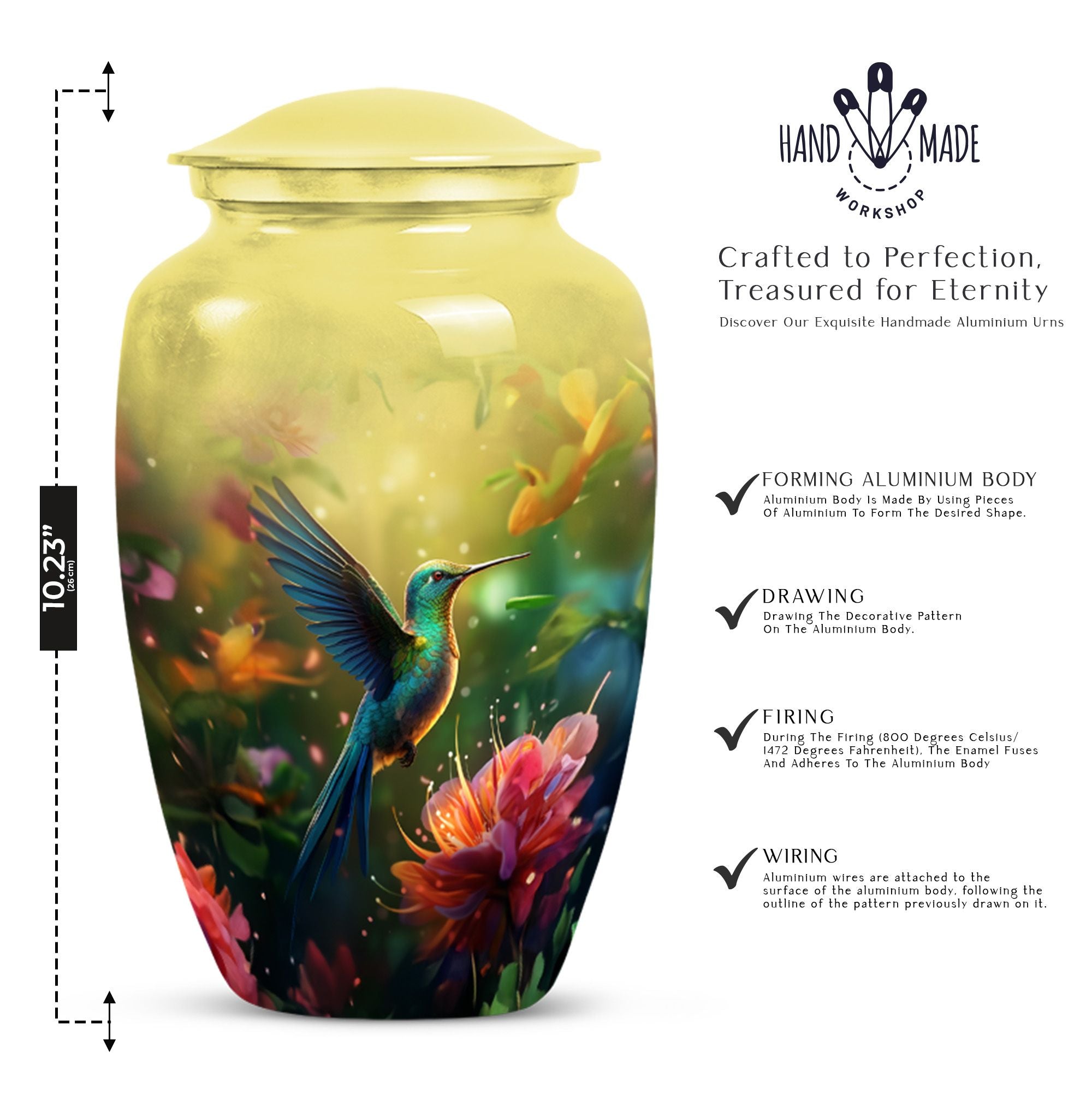 Honor the memory of your departed loved ones with our beautifully crafted 'Hummingbirds Urn', an aesthetically appealing memorial piece that exemplifies elegance. Constructed from robust aluminium, this medium-sized cremation urn characterizes a blend of abstract theme and classic design, forming a timeless tribute. This meticulously-produced 10-inch urn, weighing 3.3 pounds, holds a capacity for 200 cubic inches of ashes. Uniquely designed to cater to adults, this burial urn not only offers a vivid presentation but also houses a velvet pouch for a dignified containment of ashes. Customize it with engraved names to leave a personal touch that mirrors the singular individuality of your beloved. Ideal for both men and women, it truly blends a sense of tranquility with the echoes of fond reminisces. This urn uniquely stands out in the expansive memorial medium urns and large urns segment. Filter out your search for 'cremation urns for burial' or 'cremation urn for dad' to find this heartfelt commemoration. Be rest assured, purchasing this urn will provide you an expressive memorial yet a decorous homage for your cherished ones.