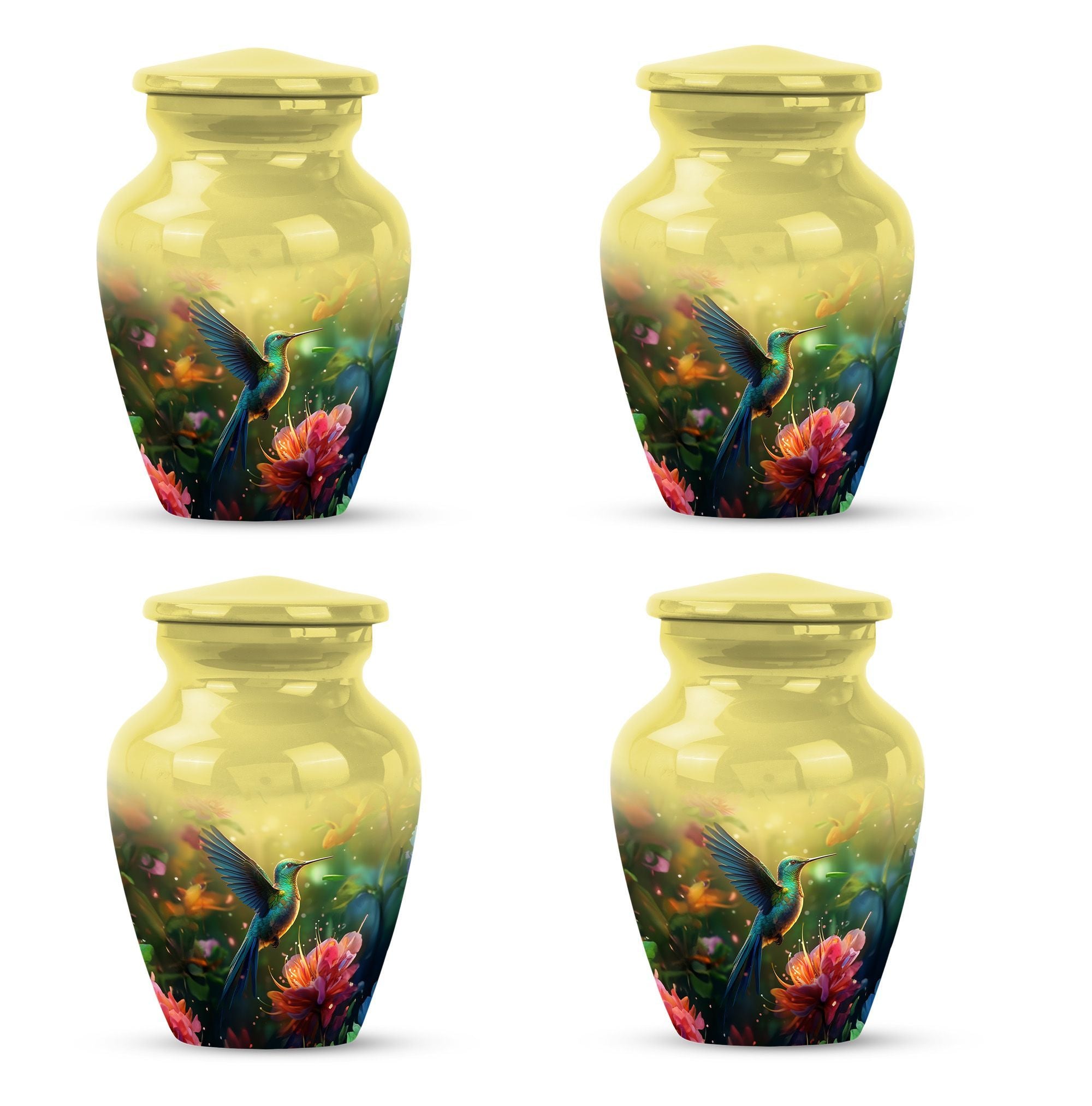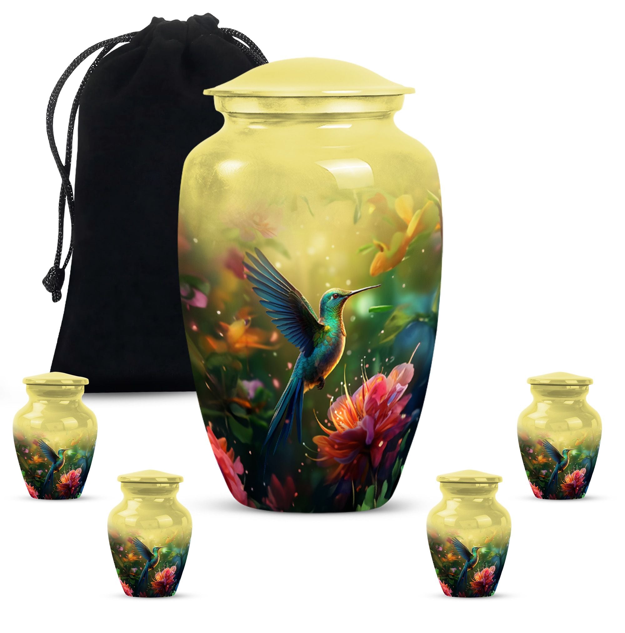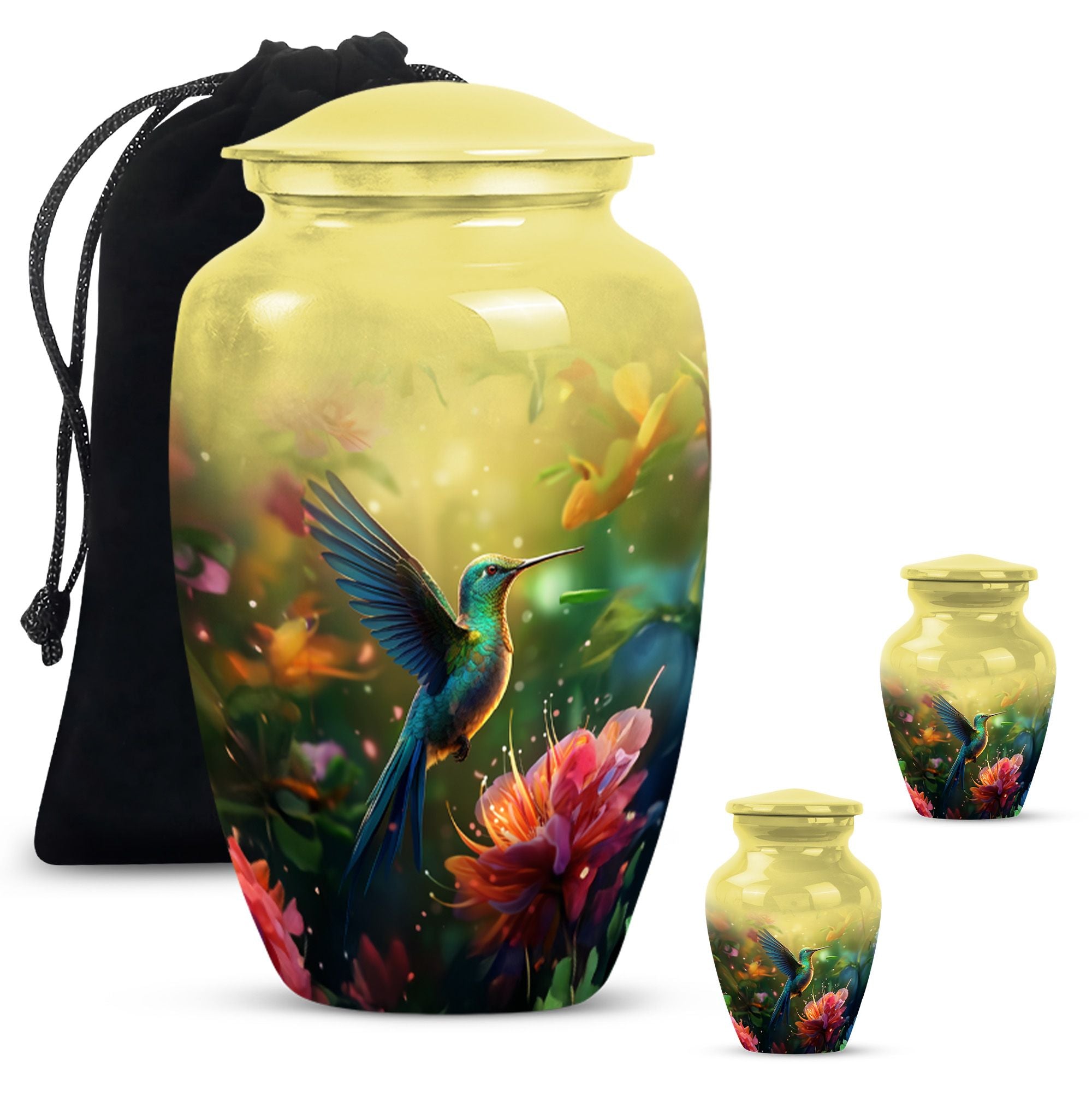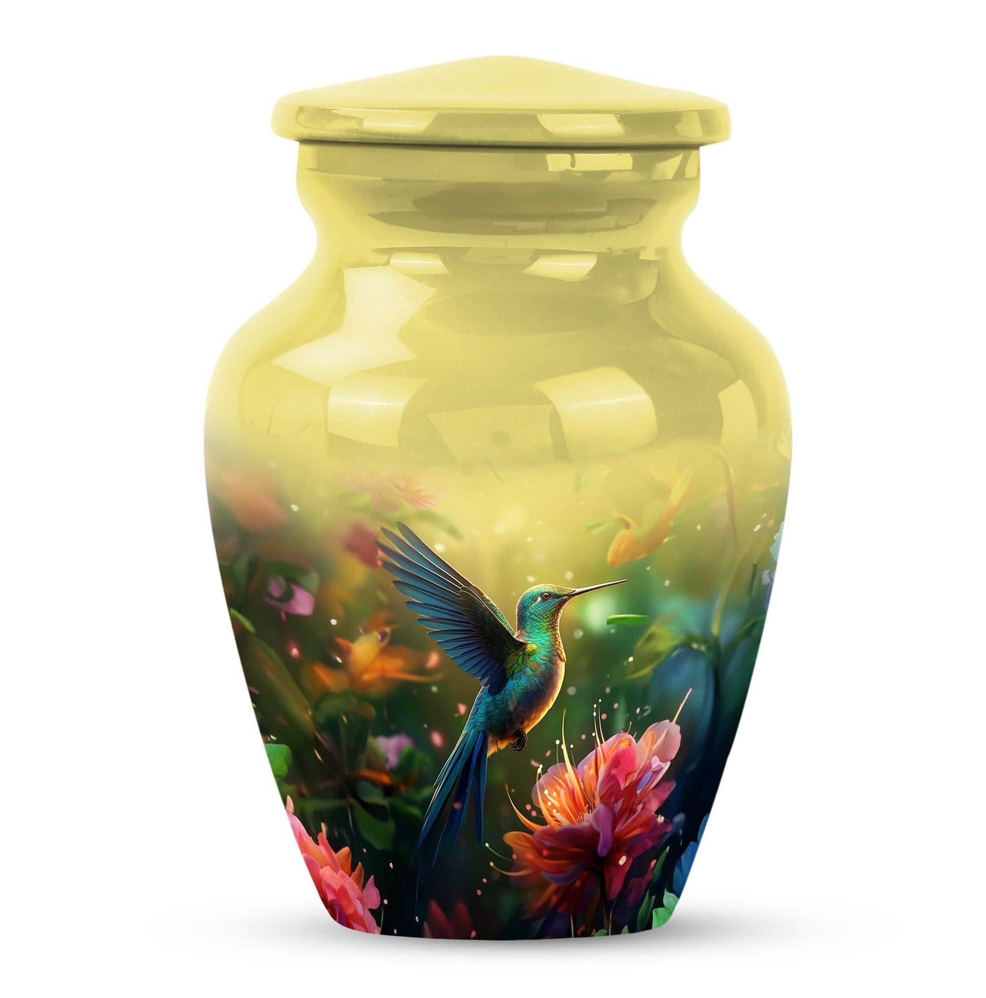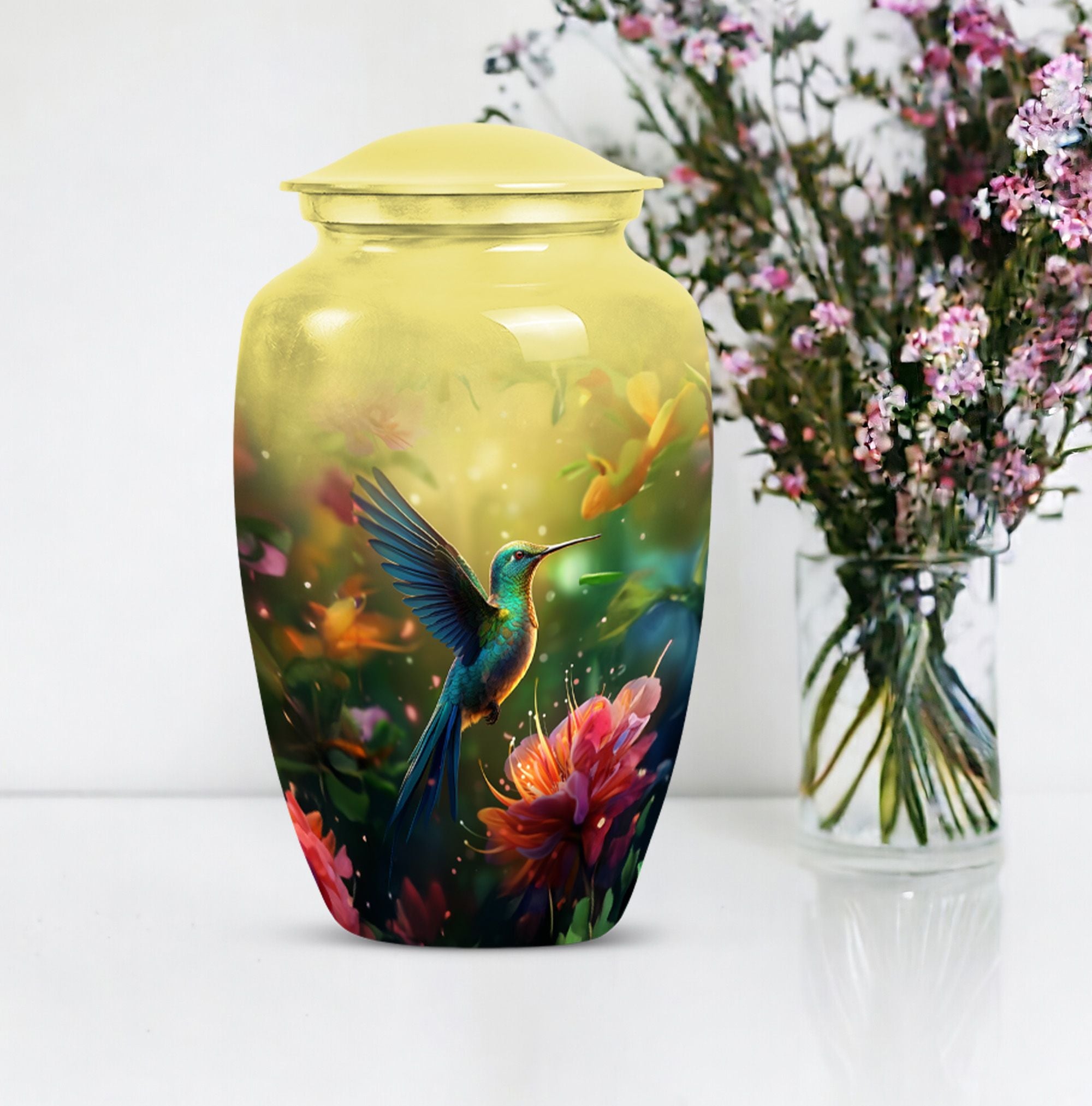Honor the memory of your departed loved ones with our beautifully crafted 'Hummingbirds Urn', an aesthetically appealing memorial piece that exemplifies elegance. Constructed from robust aluminium, this medium-sized cremation urn characterizes a blend of abstract theme and classic design, forming a timeless tribute. This meticulously-produced 10-inch urn, weighing 3.3 pounds, holds a capacity for 200 cubic inches of ashes. Uniquely designed to cater to adults, this burial urn not only offers a vivid presentation but also houses a velvet pouch for a dignified containment of ashes. Customize it with engraved names to leave a personal touch that mirrors the singular individuality of your beloved. Ideal for both men and women, it truly blends a sense of tranquility with the echoes of fond reminisces. This urn uniquely stands out in the expansive memorial medium urns and large urns segment. Filter out your search for 'cremation urns for burial' or 'cremation urn for dad' to find this heartfelt commemoration. Be rest assured, purchasing this urn will provide you an expressive memorial yet a decorous homage for your cherished ones.