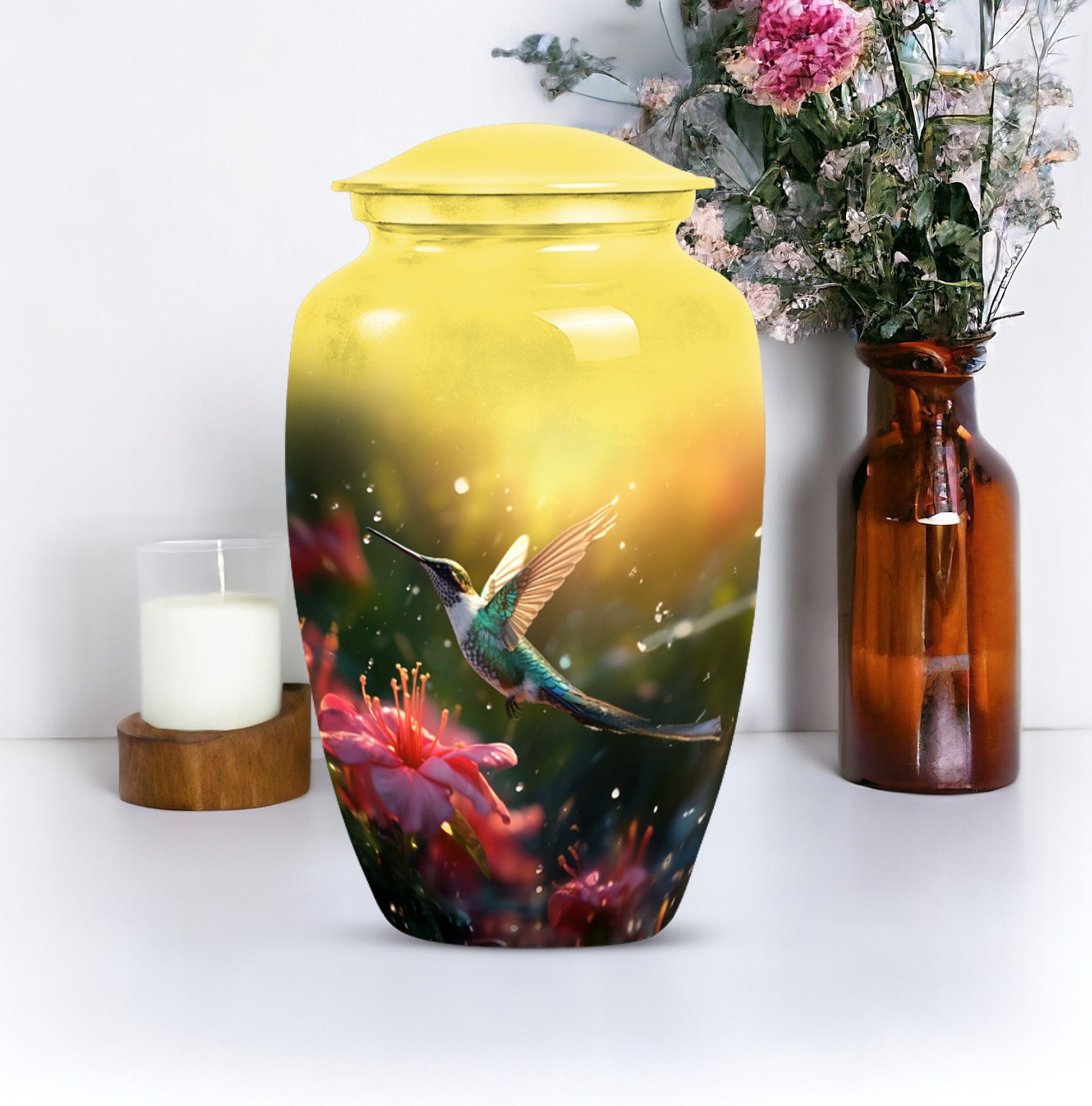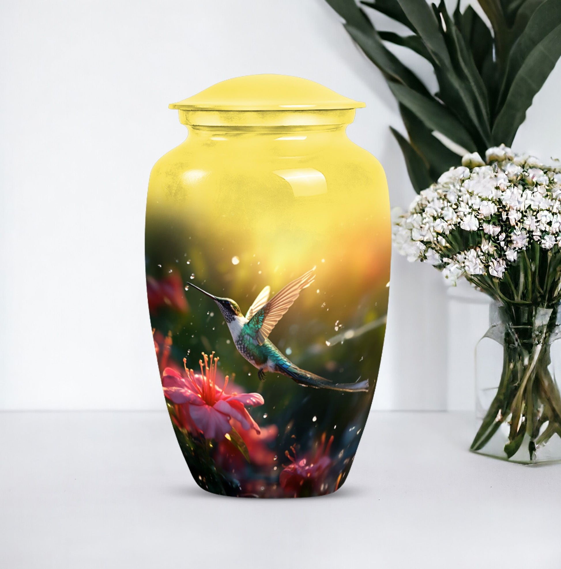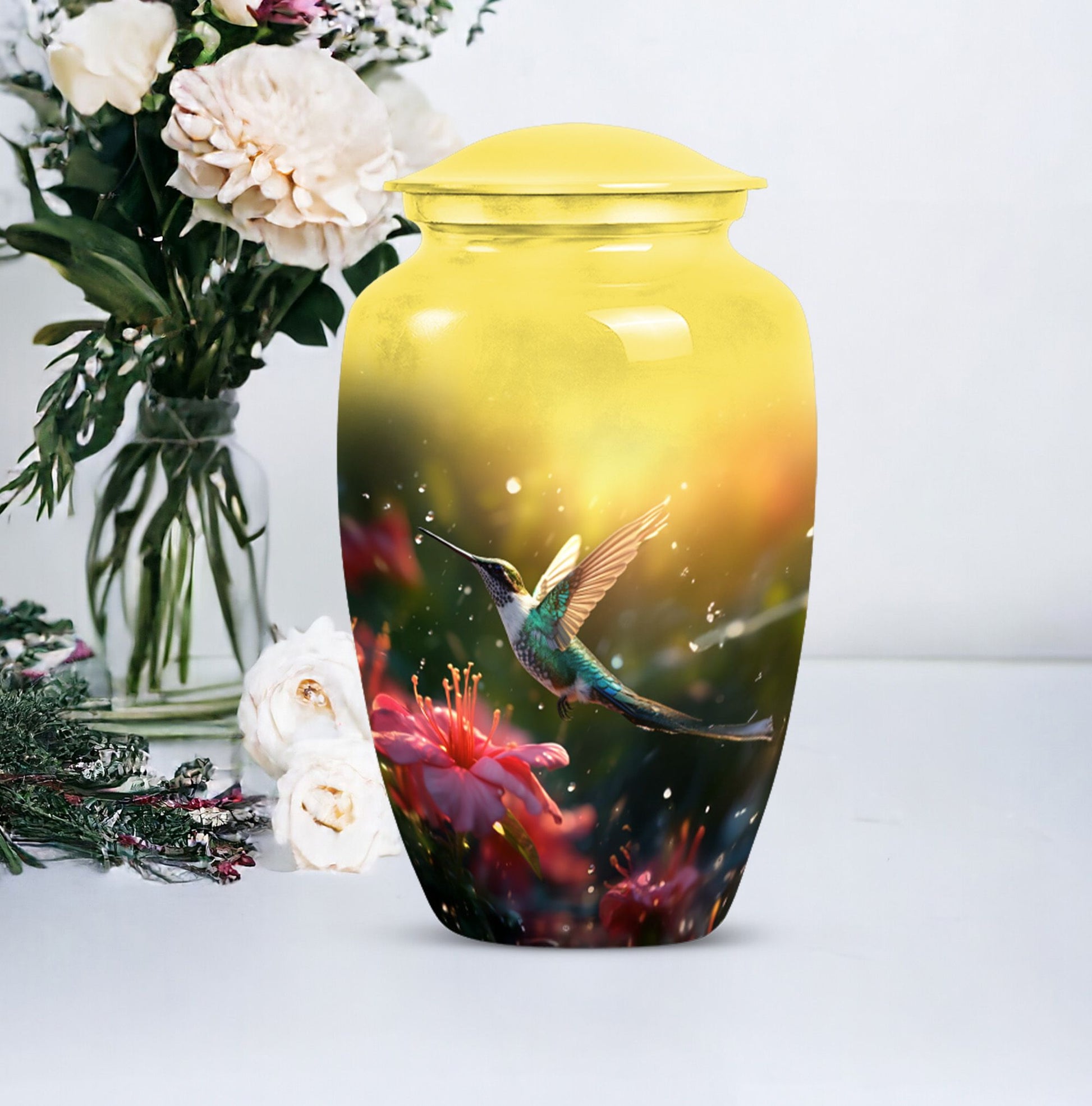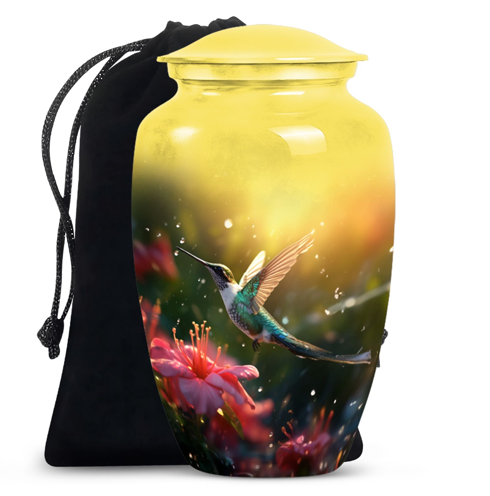 The large-sized humming birds urn is an ideal choice for those in search of memorial urns that reverberate with the soothing tranquility of nature. Crafted from robust aluminium, this burial urn for human ashes weighs a sturdy 3.3 pounds and measures a full 10 inches in height. It has a capacity of 200 cubic inches, making it fitting for adult use. The urn comes with an elegant velvet pouch for discrete and respectful containment of ashes. This particular urn dons an abstract theme, embodying a sophisticated balance between tradition and modernity. With the option to personalize with engraved names, it allows for a unique, touching tribute to your loved ones. This urn is more than just a vessel, it's a testament to a well-spent life. This hummingbird urn might just be the perfect tribute, whether you're searching for cremation urns for human ashes for men or women alike. The timeless appeal makes it an appropriate choice for funeral, burial, and other memorial services. As durable as it is elegant, it also makes for a thoughtful gift in these difficult times.