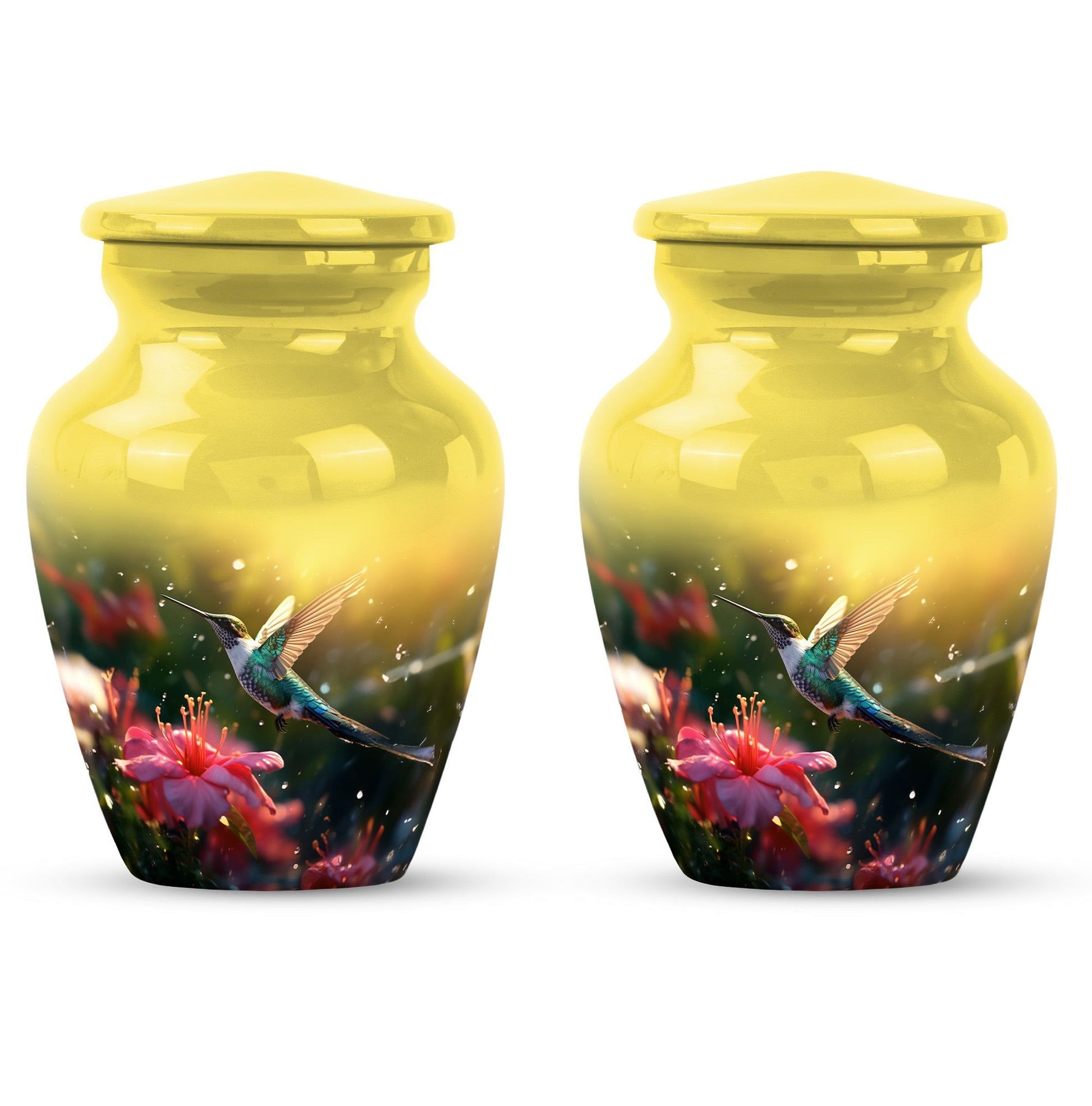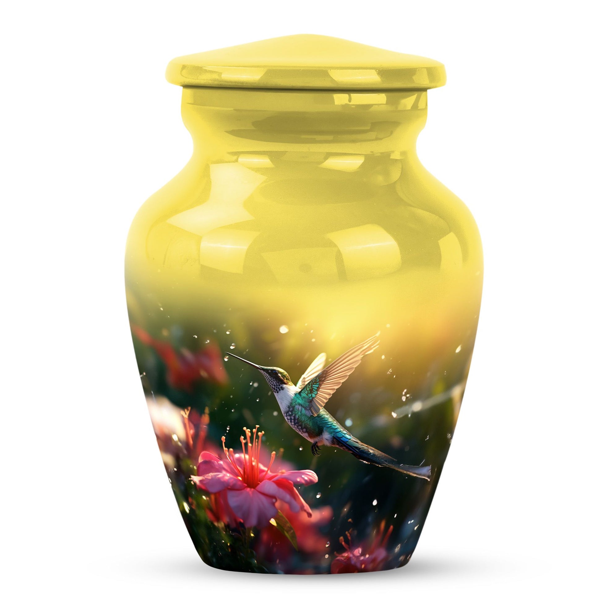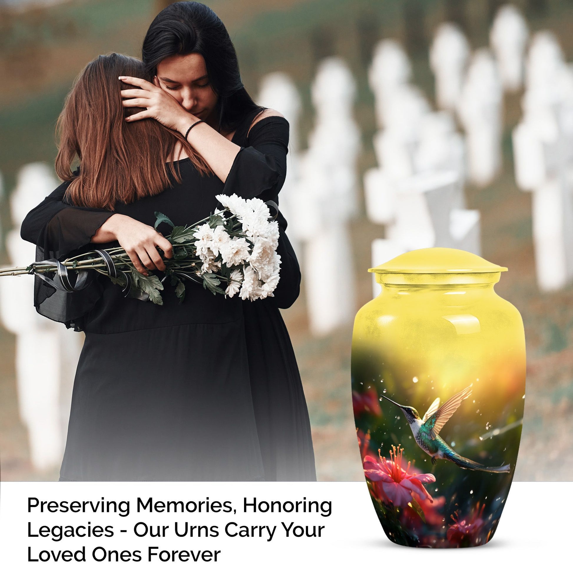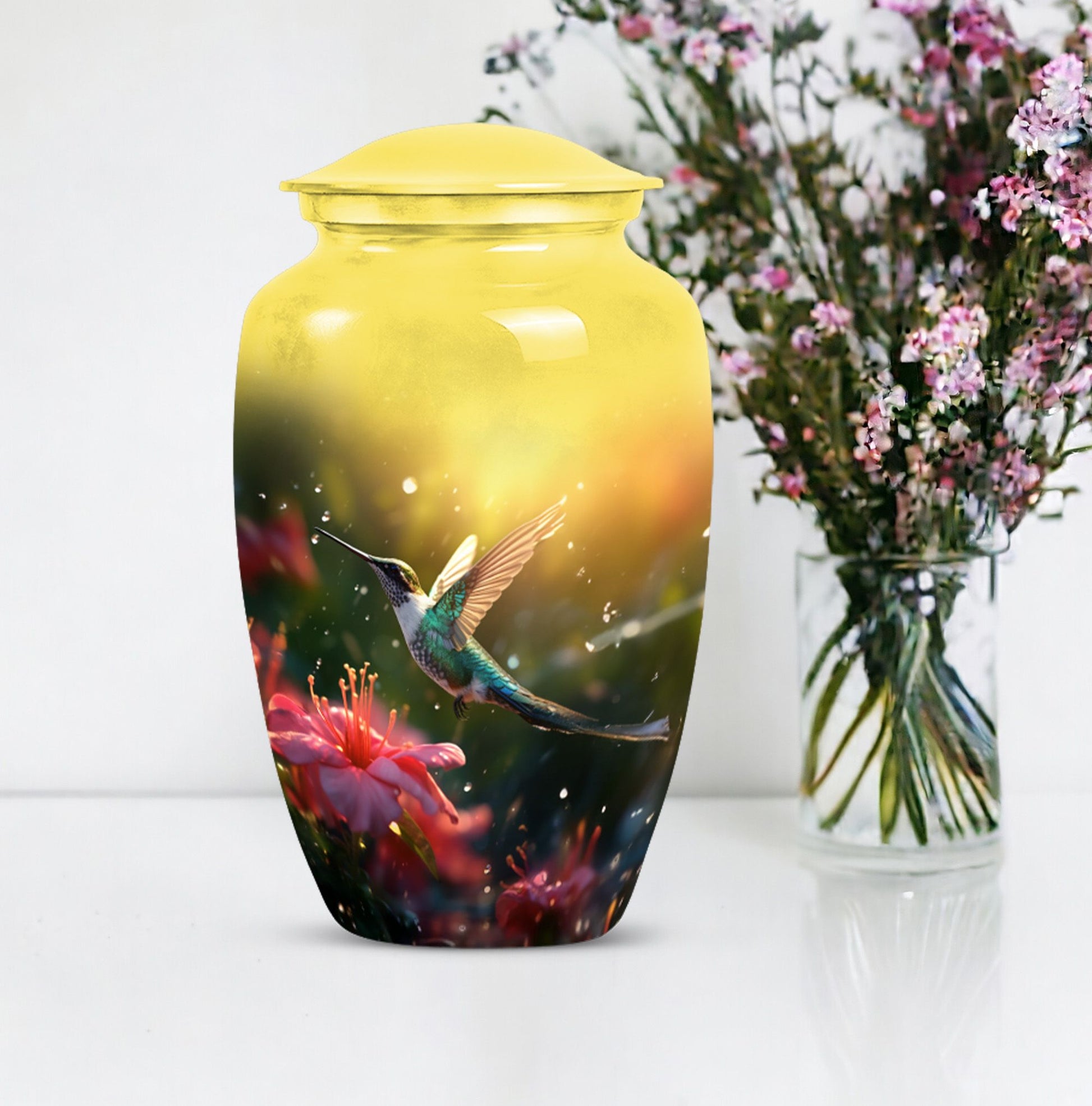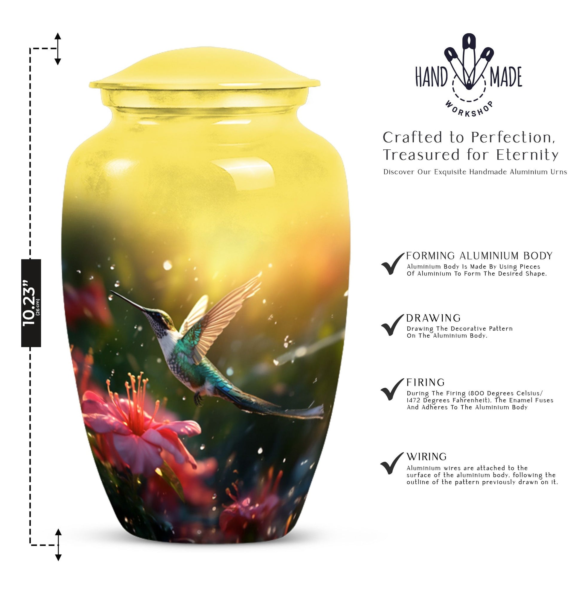 The large-sized humming birds urn is an ideal choice for those in search of memorial urns that reverberate with the soothing tranquility of nature. Crafted from robust aluminium, this burial urn for human ashes weighs a sturdy 3.3 pounds and measures a full 10 inches in height. It has a capacity of 200 cubic inches, making it fitting for adult use. The urn comes with an elegant velvet pouch for discrete and respectful containment of ashes. This particular urn dons an abstract theme, embodying a sophisticated balance between tradition and modernity. With the option to personalize with engraved names, it allows for a unique, touching tribute to your loved ones. This urn is more than just a vessel, it's a testament to a well-spent life. This hummingbird urn might just be the perfect tribute, whether you're searching for cremation urns for human ashes for men or women alike. The timeless appeal makes it an appropriate choice for funeral, burial, and other memorial services. As durable as it is elegant, it also makes for a thoughtful gift in these difficult times.