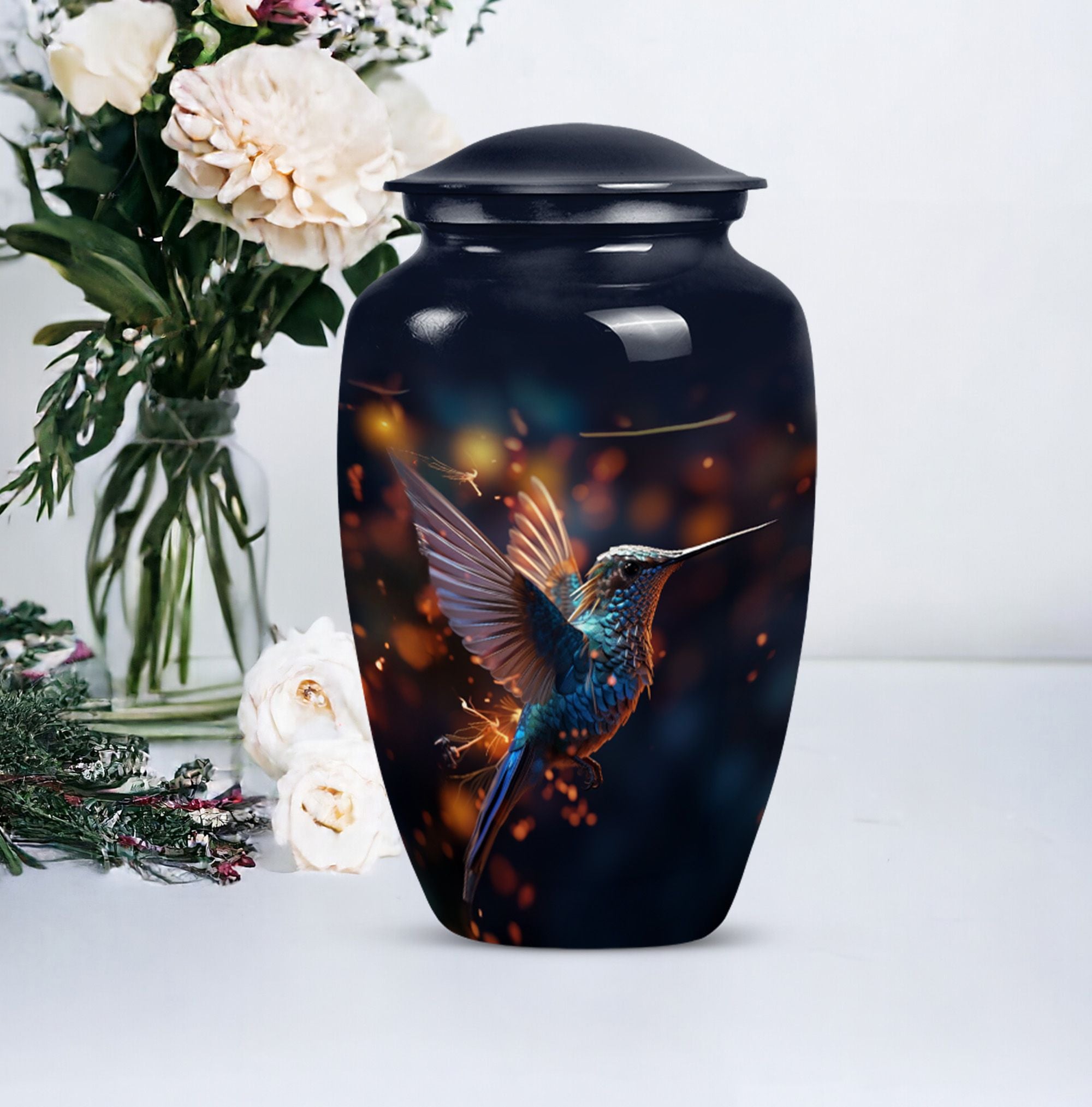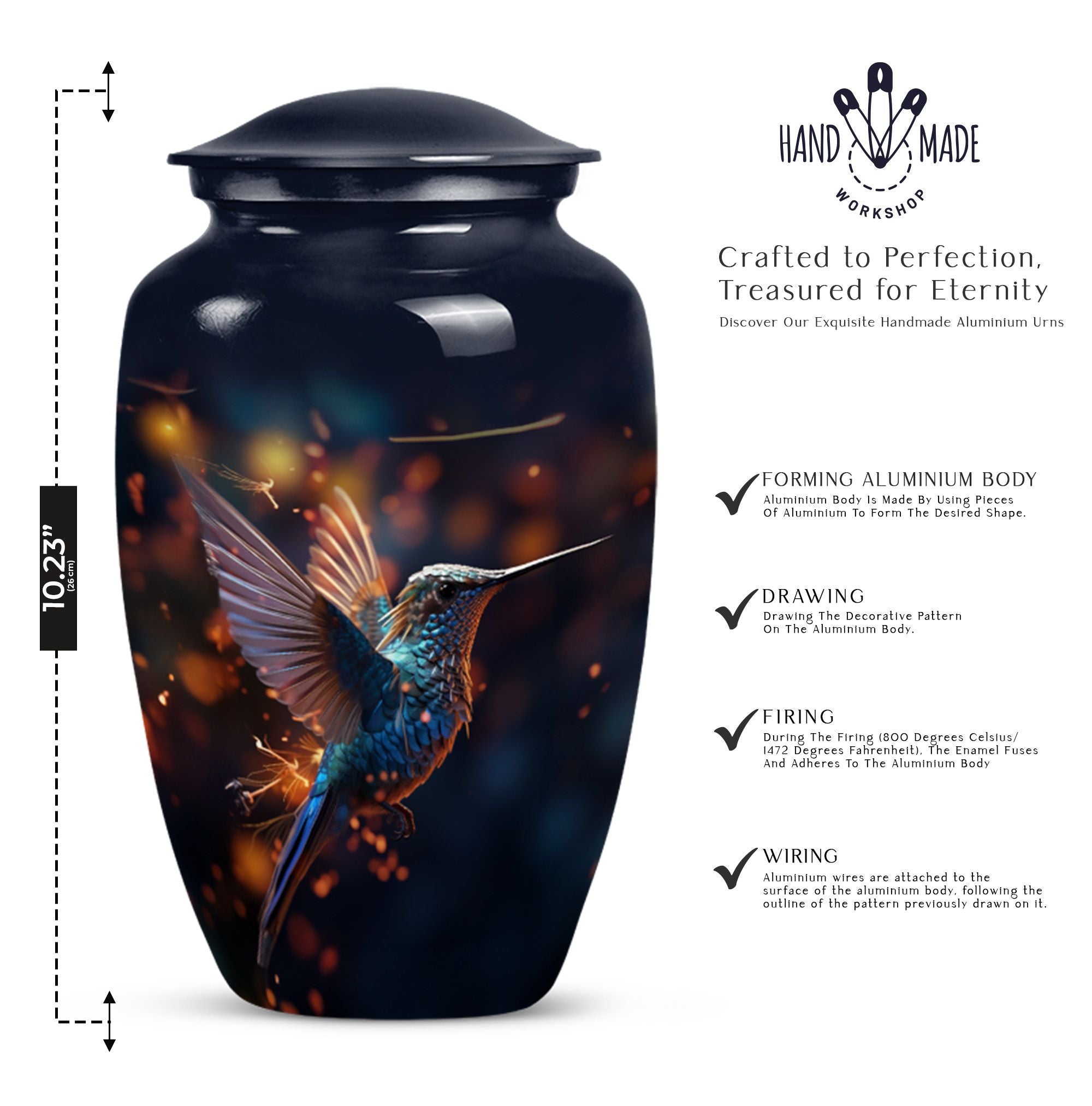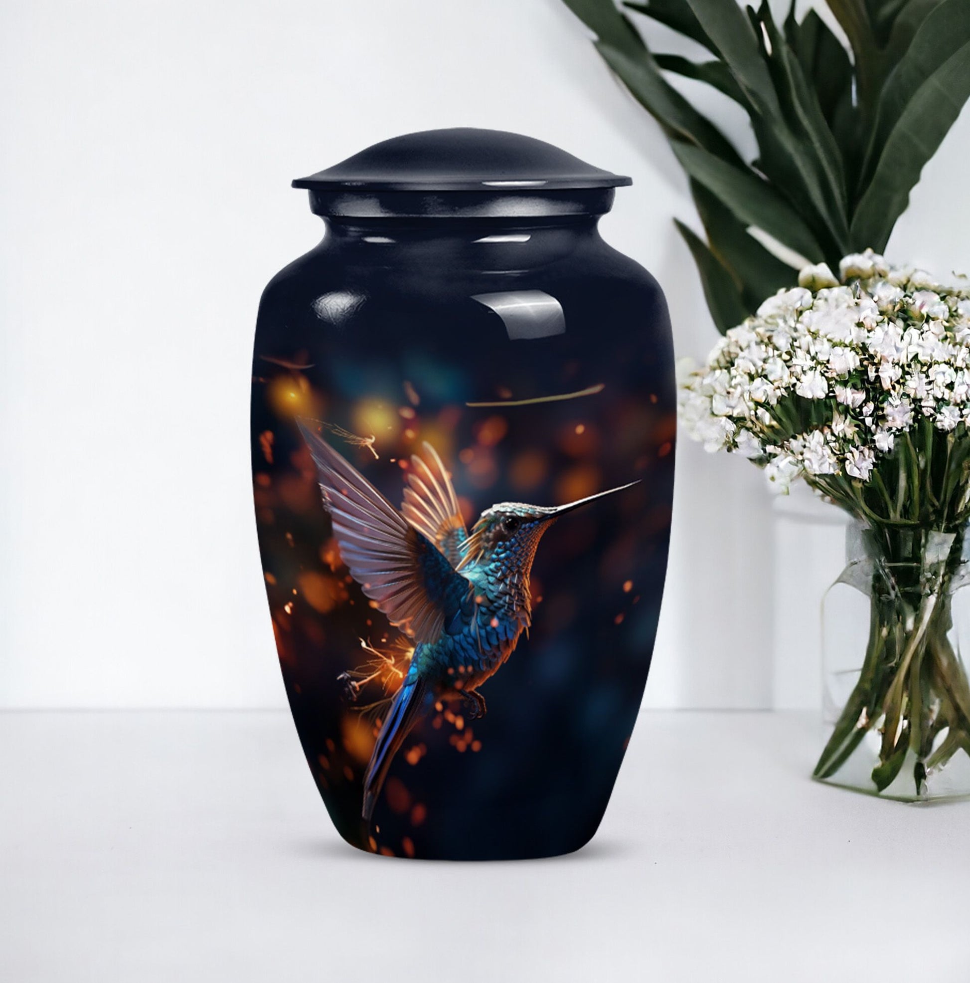 Introducing our stunning 10 inch 'Humming Birds Urn,' a profound and tasteful way to preserve the cherished memories of a loved one. Though constructed from robust aluminium, this abstract-themed large urn weighs a mere 3.3 pounds and is designed to be unobtrusive while signifying profound reverence. The capacity of this cremation large urn is around 200 cubic inches - ample space to securely house the ashes. The urn is delivered complete with a velvet pouch, offering an elegant and secure containment solution to honor and remember your beloved. A unique feature of this burial ashes urn is that it can be personalized with the name, providing an intimate touch to this already significantly symbolic item. This item is not just an urn for human ashes but a tribute and memorial vase representing endless affection and honour. Choose the Humming Birds Urn for the ideal blend of elegance, durability, and remembrance.