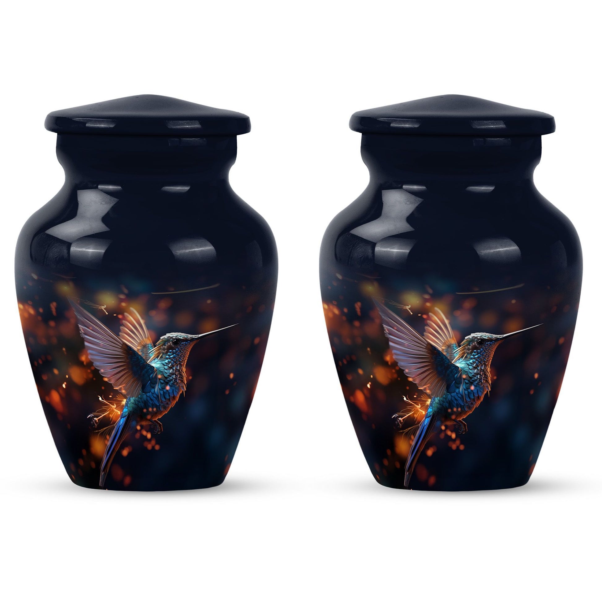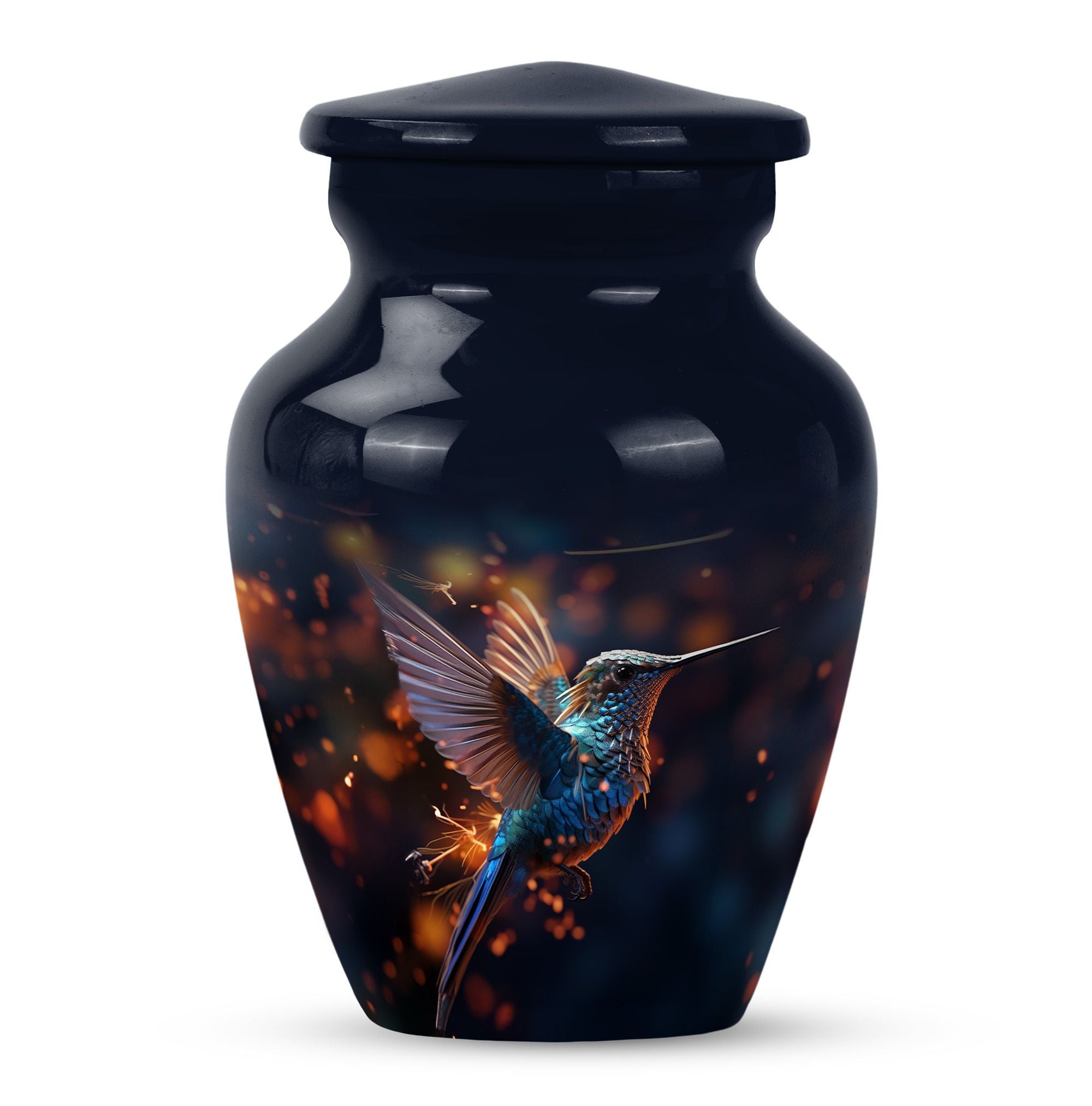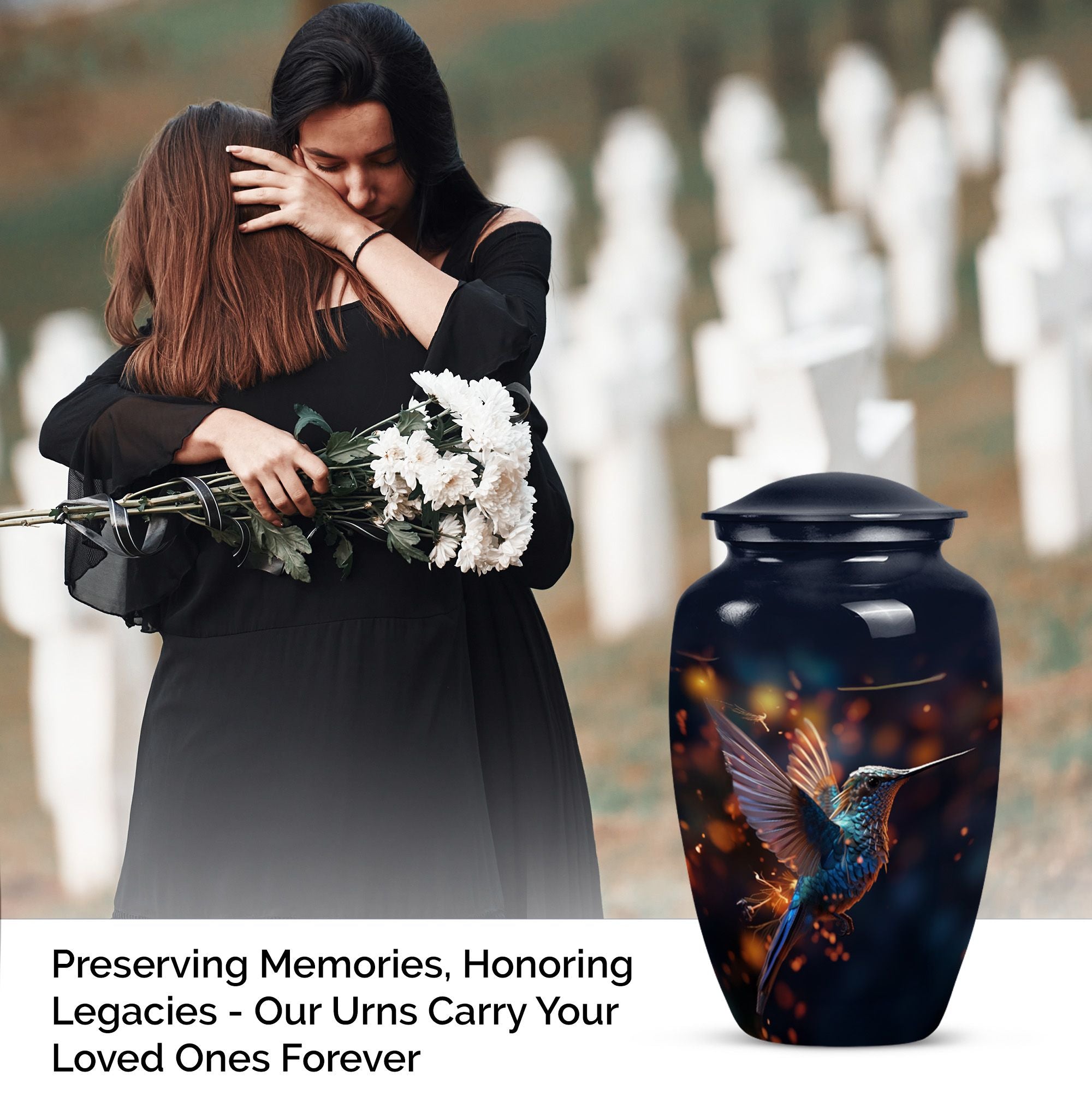 Introducing our stunning 10 inch 'Humming Birds Urn,' a profound and tasteful way to preserve the cherished memories of a loved one. Though constructed from robust aluminium, this abstract-themed large urn weighs a mere 3.3 pounds and is designed to be unobtrusive while signifying profound reverence. The capacity of this cremation large urn is around 200 cubic inches - ample space to securely house the ashes. The urn is delivered complete with a velvet pouch, offering an elegant and secure containment solution to honor and remember your beloved. A unique feature of this burial ashes urn is that it can be personalized with the name, providing an intimate touch to this already significantly symbolic item. This item is not just an urn for human ashes but a tribute and memorial vase representing endless affection and honour. Choose the Humming Birds Urn for the ideal blend of elegance, durability, and remembrance.