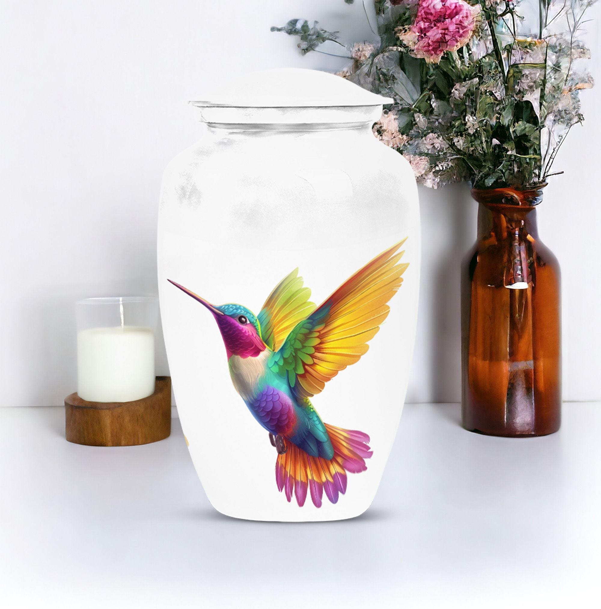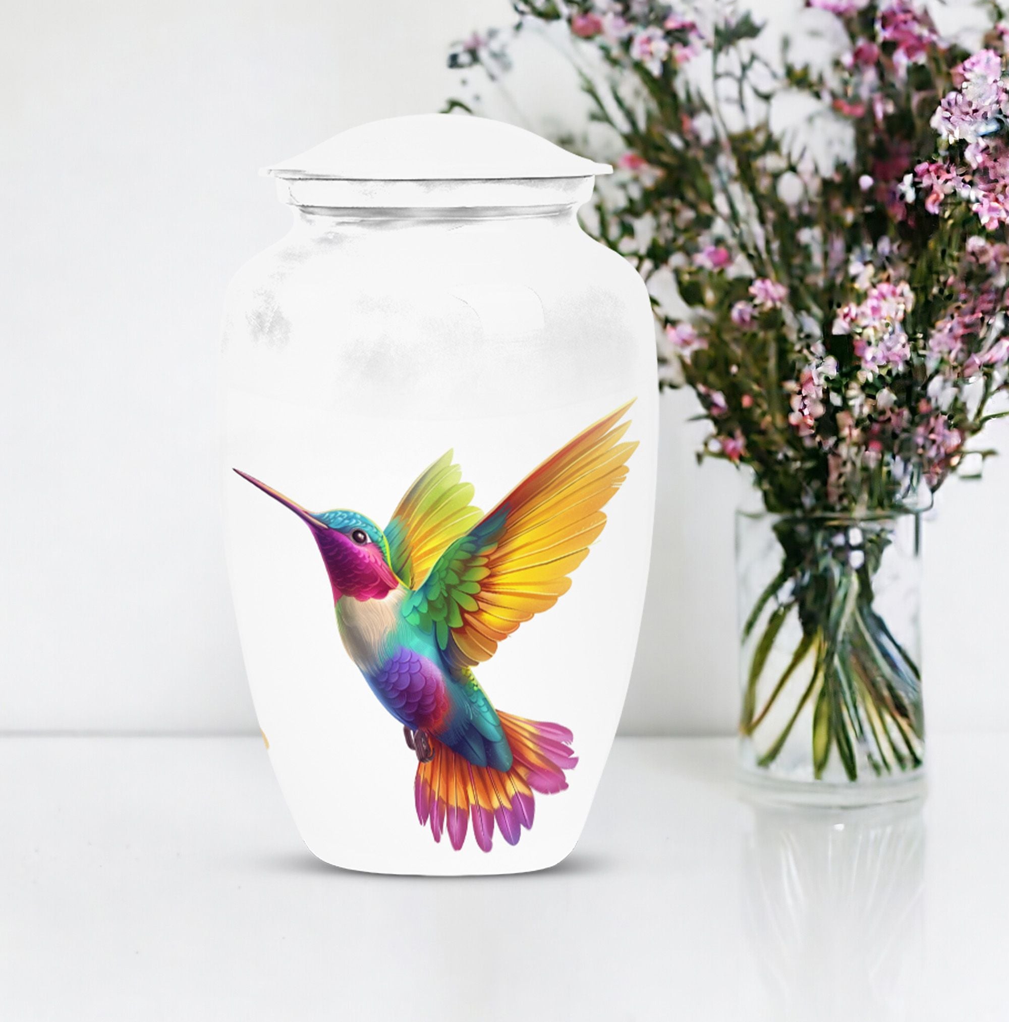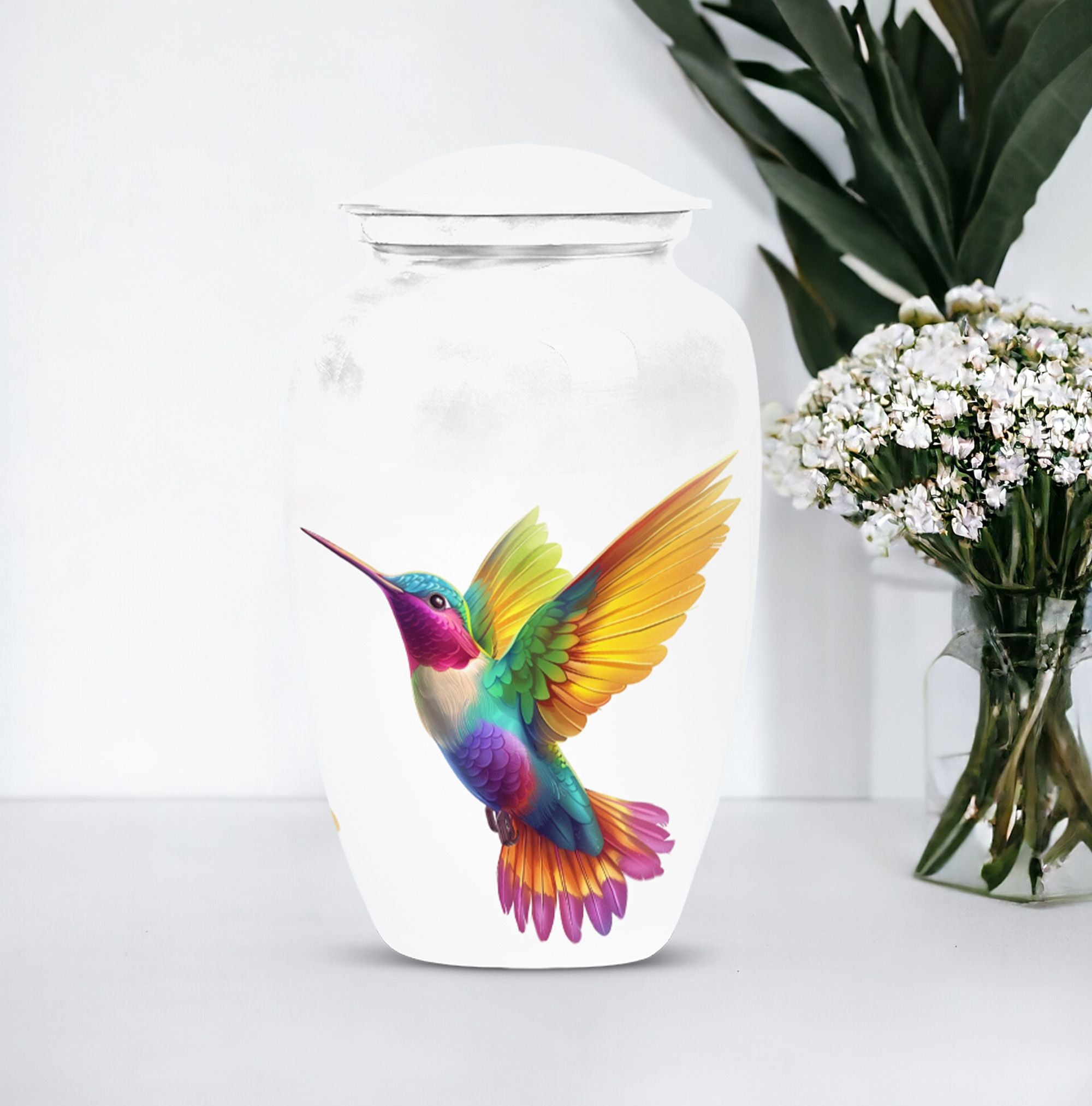 Honor your beloved's memory with our 10-inch Hummingbird Urn, a funeral cremation urn designed with the utmost respect and gratitude in mind. Made from durable aluminium, this urn is not only sturdy but also offers an abstract theme, encapsulating the beautiful complexities of life and death. With a weight of 3.3 pounds and dimensions of 10 inches in height, it is a large urn that can house up to 200 cubic inches of ashes. Each purchase comes with a velvet pouch, ensuring safe containment of your loved one’s ashes. Complementing its classic urn structure, this cremation urn is customize-able - you can personalize it with engraved names, making it a truly unique memorial piece. In your quest for memorial large urns for ashes, ash urn, or urn shaped funeral urns for adult ashes, this one stands out as a poetic tribute to a generously-lived life. Remember, you aren't just buying an urn, but a vessel for countless memories and shared moments.