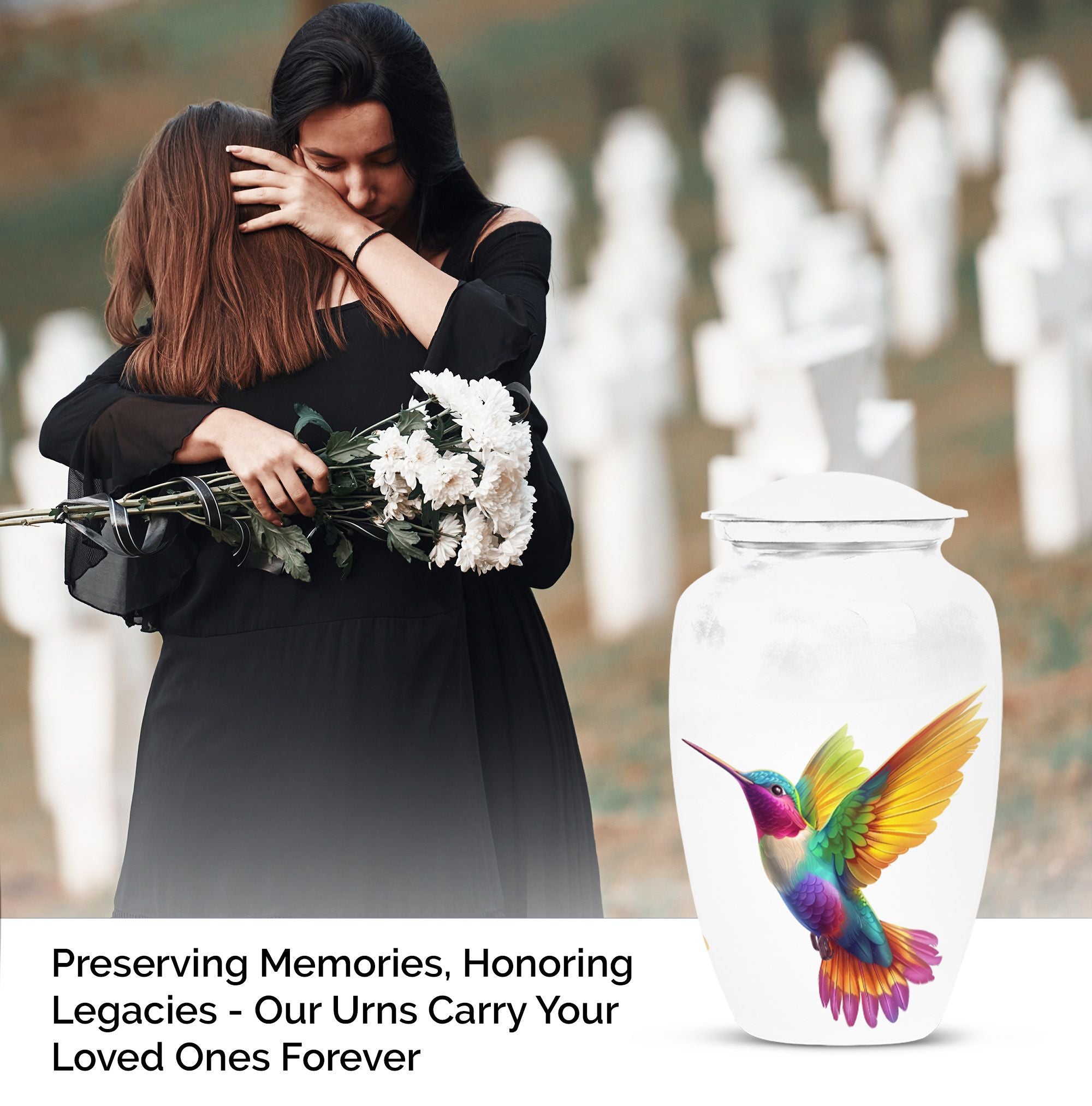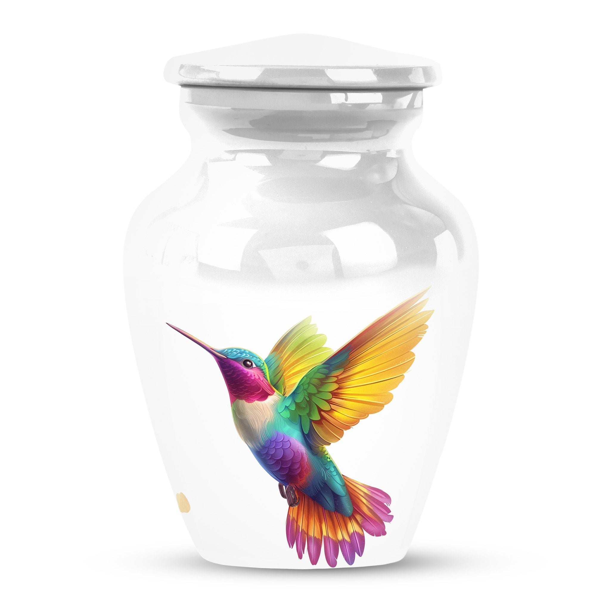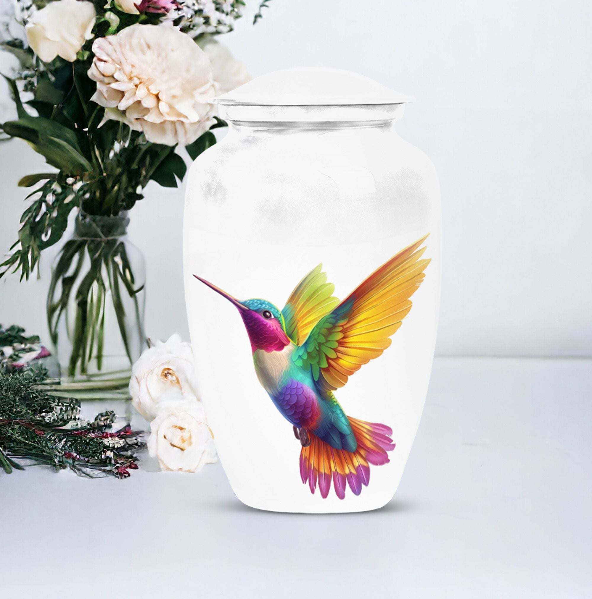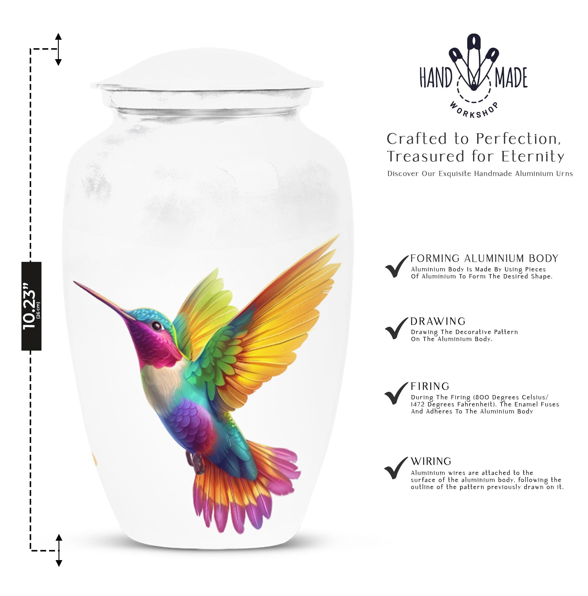 Honor your beloved's memory with our 10-inch Hummingbird Urn, a funeral cremation urn designed with the utmost respect and gratitude in mind. Made from durable aluminium, this urn is not only sturdy but also offers an abstract theme, encapsulating the beautiful complexities of life and death. With a weight of 3.3 pounds and dimensions of 10 inches in height, it is a large urn that can house up to 200 cubic inches of ashes. Each purchase comes with a velvet pouch, ensuring safe containment of your loved one’s ashes. Complementing its classic urn structure, this cremation urn is customize-able - you can personalize it with engraved names, making it a truly unique memorial piece. In your quest for memorial large urns for ashes, ash urn, or urn shaped funeral urns for adult ashes, this one stands out as a poetic tribute to a generously-lived life. Remember, you aren't just buying an urn, but a vessel for countless memories and shared moments.
