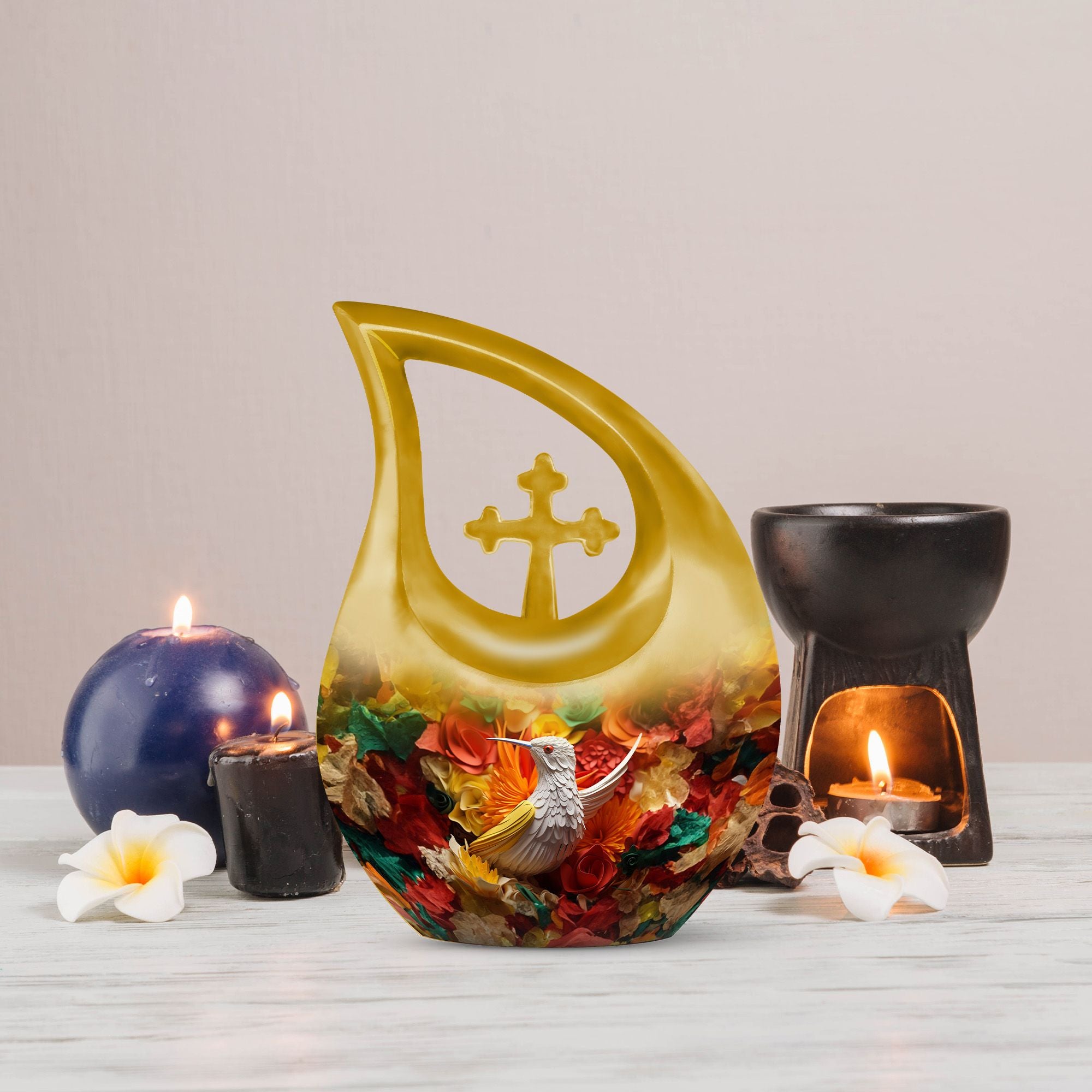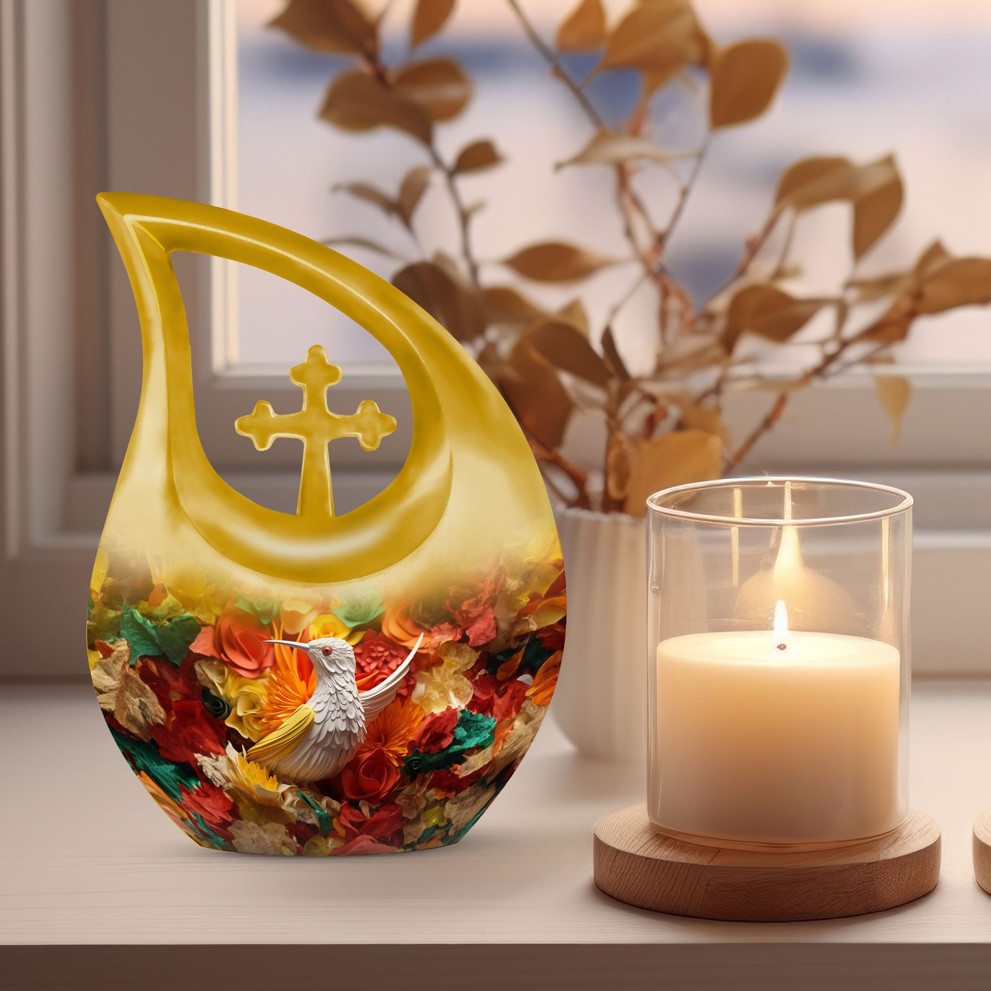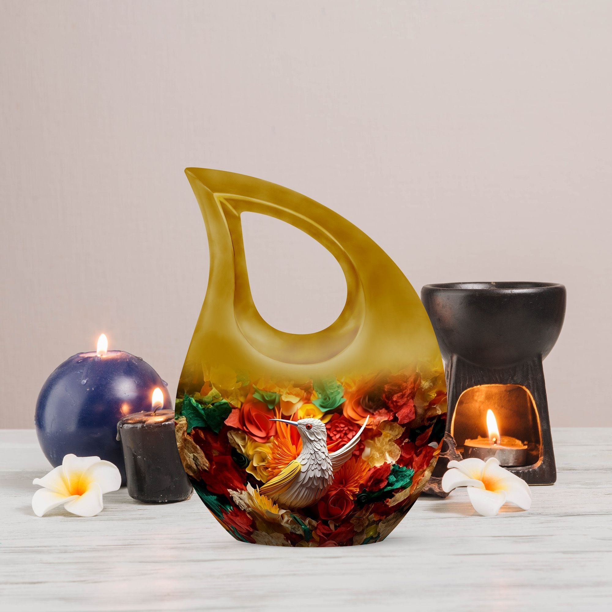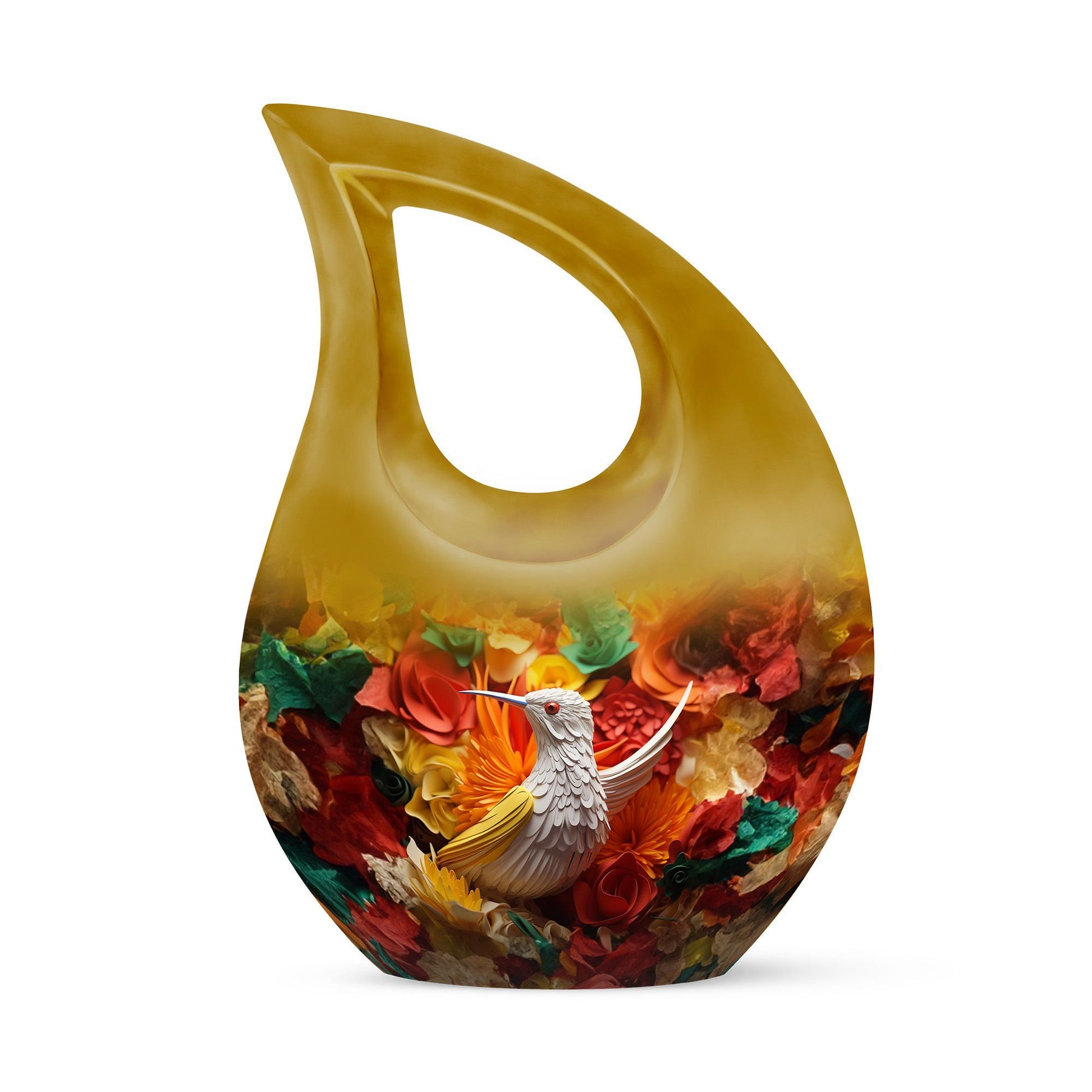 This humming bird memorial urn offers a touching combination of beauty, symbolism, and peace—perfect for families seeking a heartfelt tribute. Its vibrant colors and delicate design create a comforting reminder of love that continues to bloom.