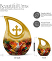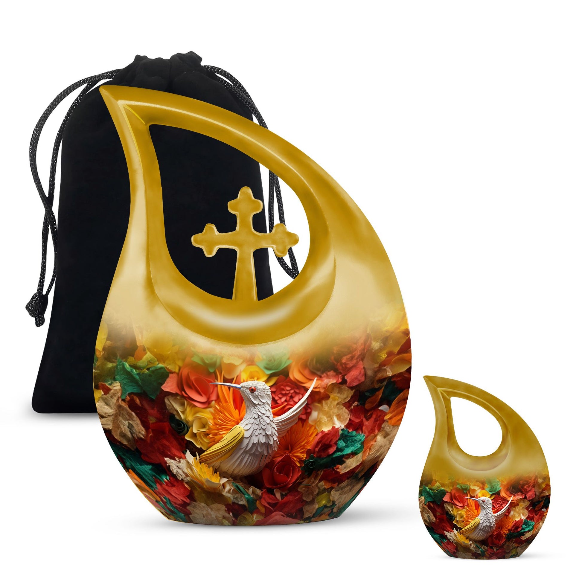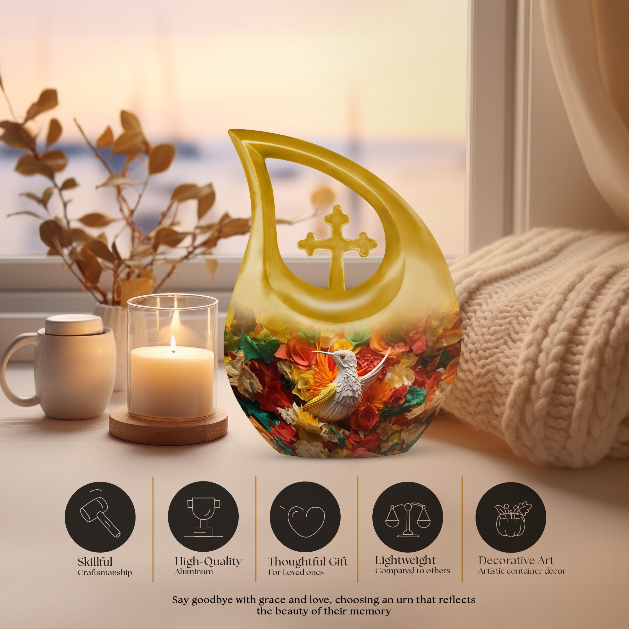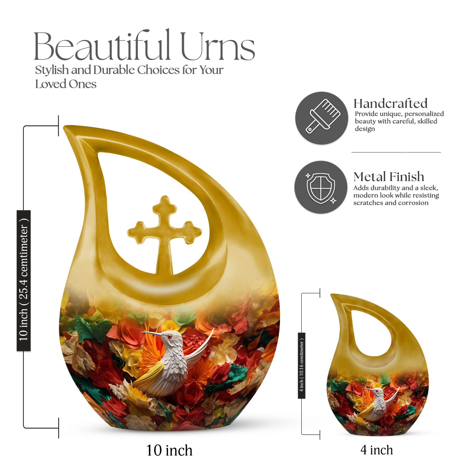 Crafted from durable aluminium, this 10-inch urn features vibrant floral detailing with a radiant hummingbird, symbolizing joy, renewal, and eternal remembrance. Its polished decorative finish makes it ideal for those looking for elegant cremation urns women, a versatile urn for adult male & female, or a memorial piece suitable for funeral, burial, or home display. The secure screw-top lid ensures long-term protection of ashes, while matching keepsake options—such as tiny urns for women & men, keepsake urns for men ashes, or small urns women—allow families to share precious memories in a personal and meaningful way. It also serves beautifully as an urn ashes for women, burial urn men, or an artistic women adult urn with lasting symbolism.