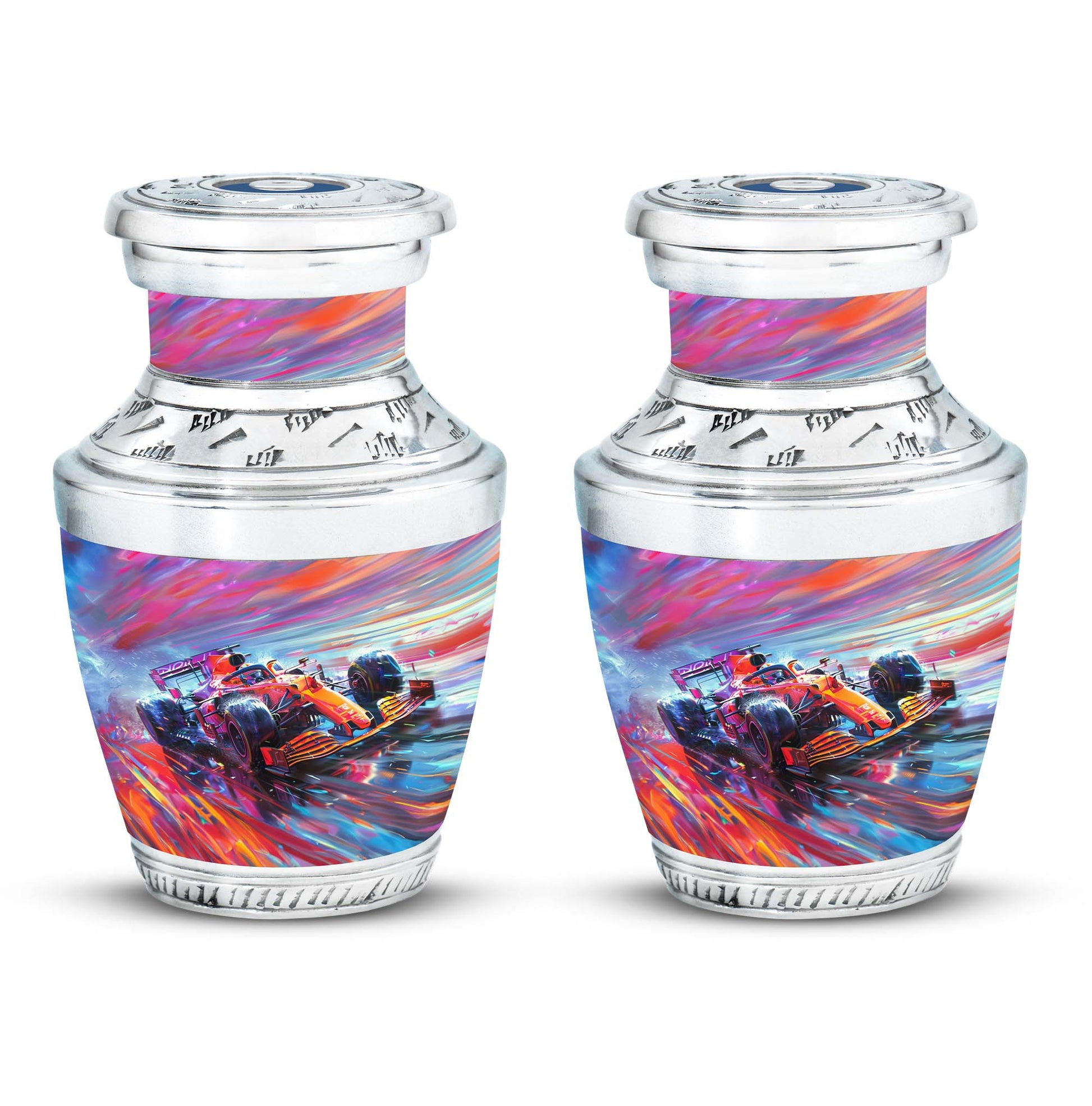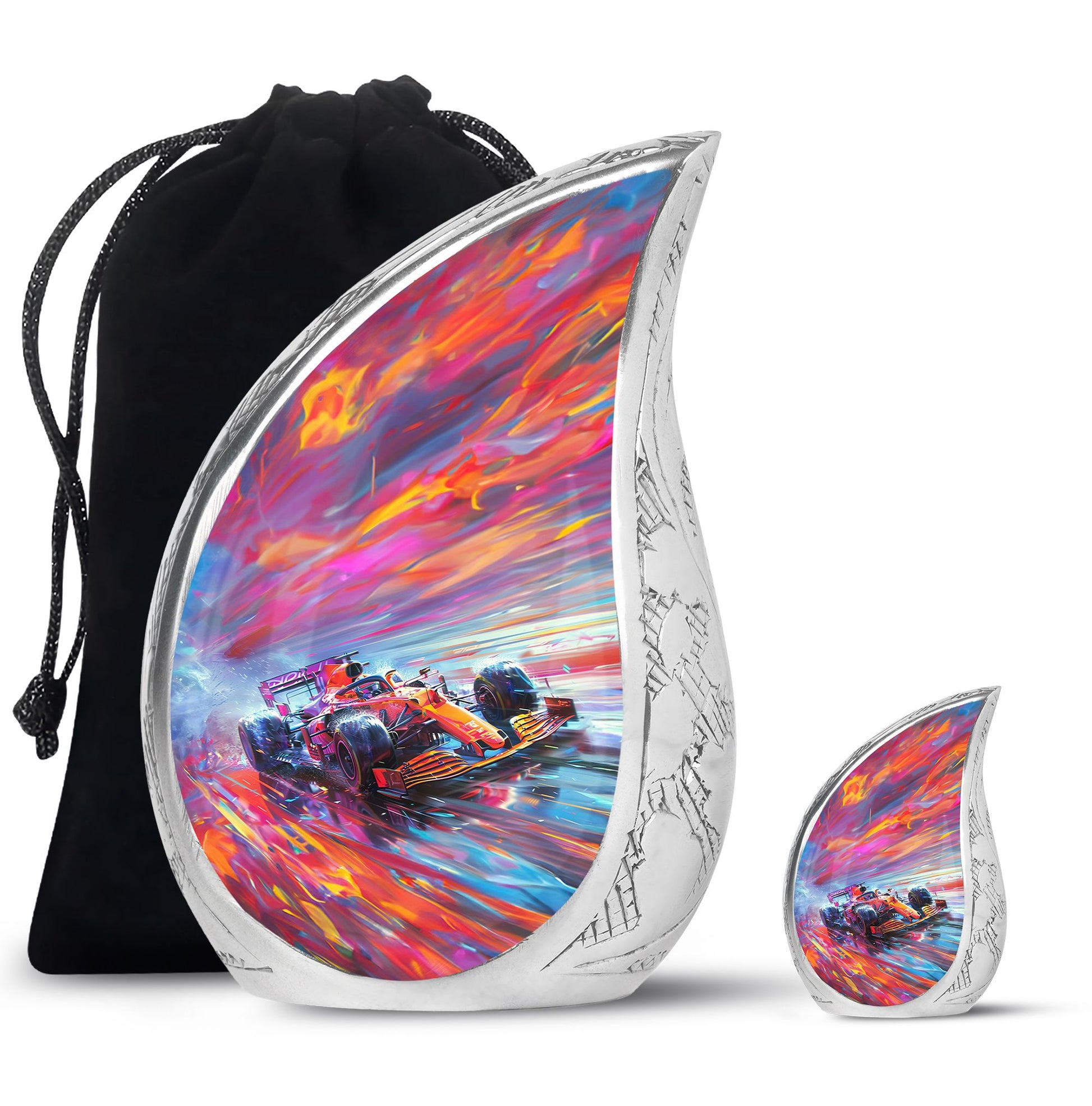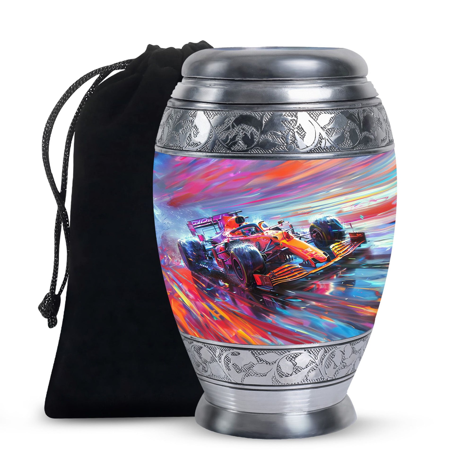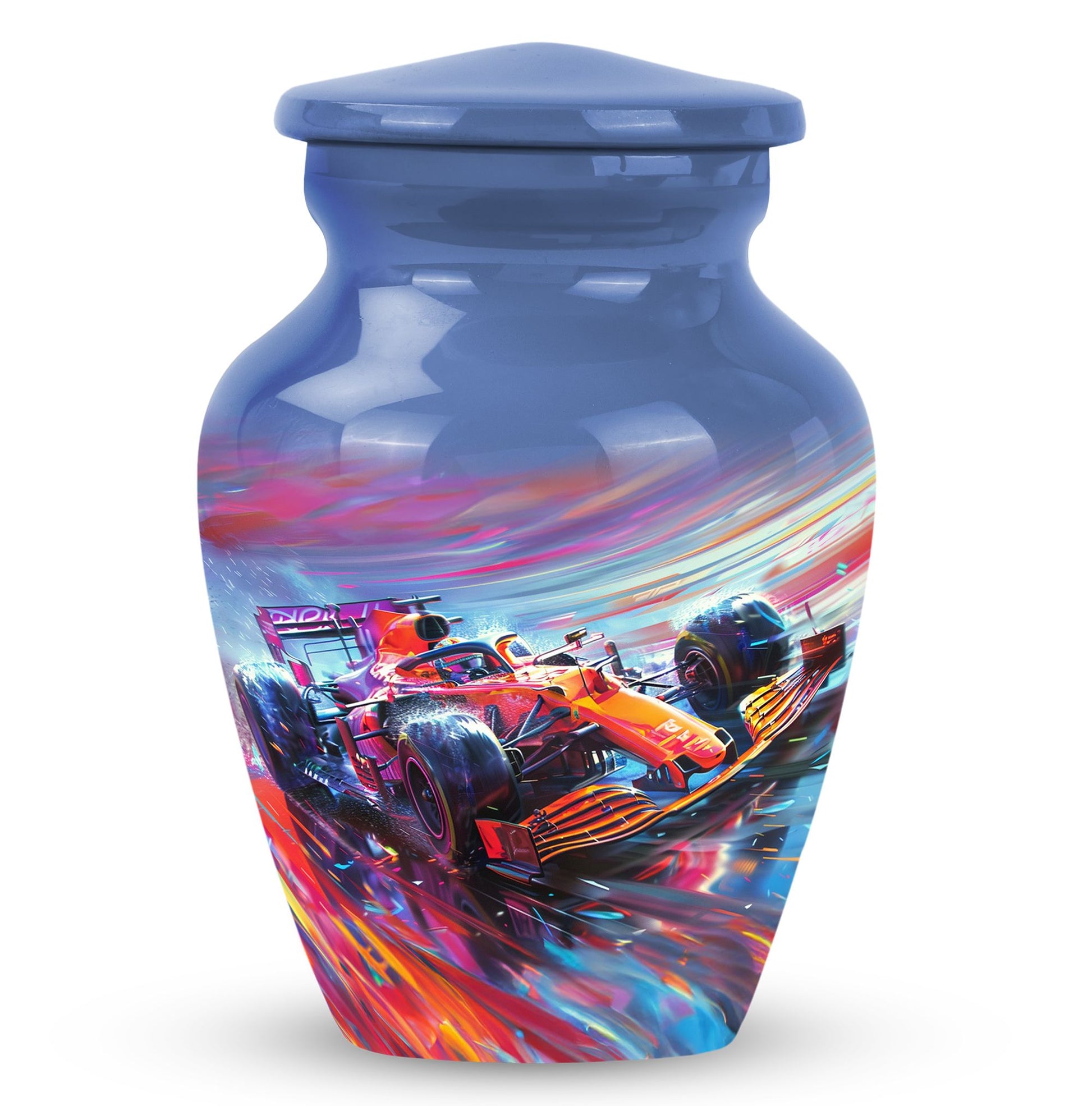 The **Hyperdrive Racing Chaos Urn** embodies the **pulse-pounding intensity of street racing, neon-lit highways, and the rush of acceleration, symbolizing adventure and an unbreakable will**.