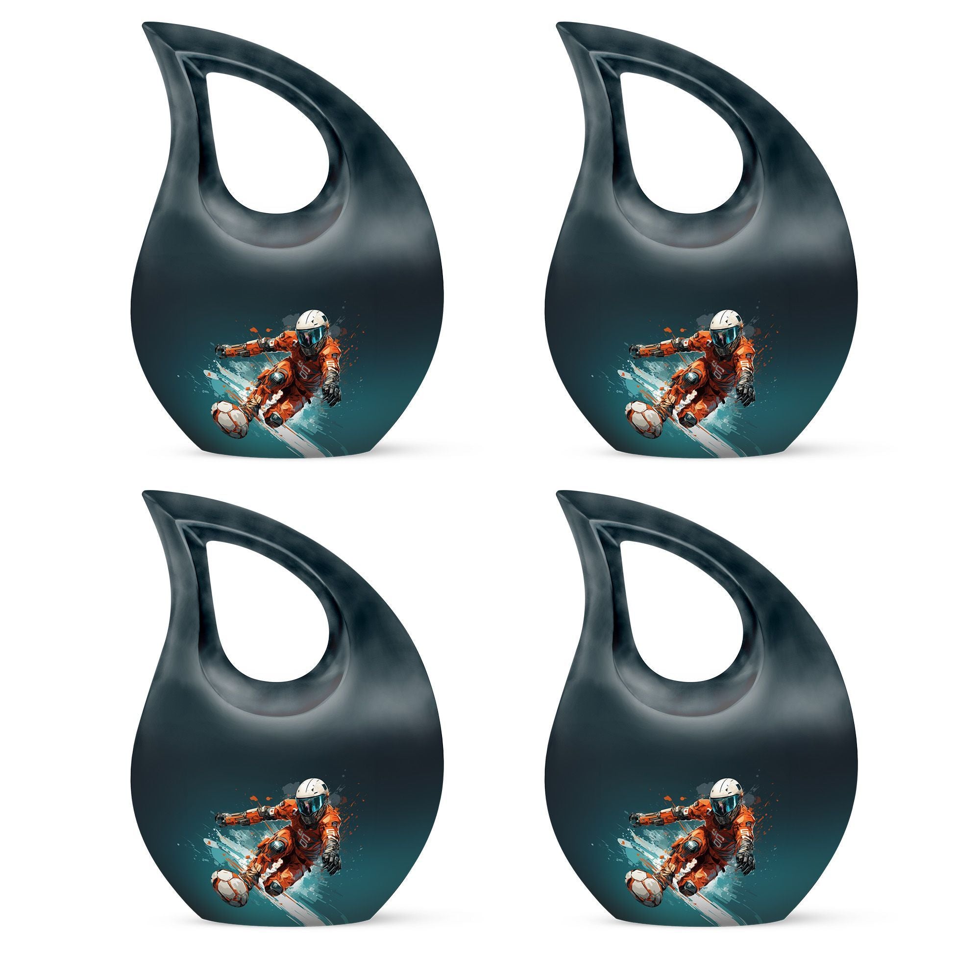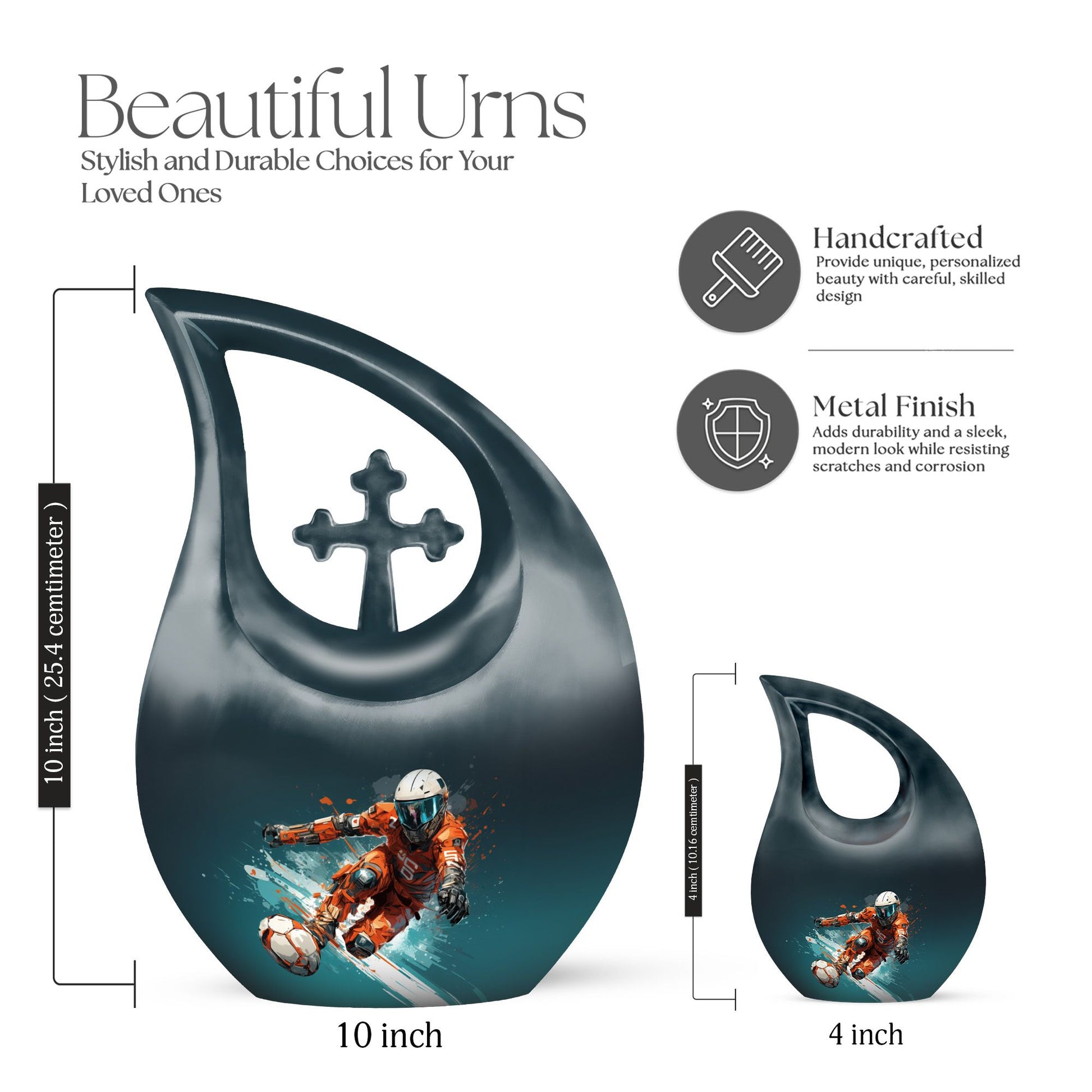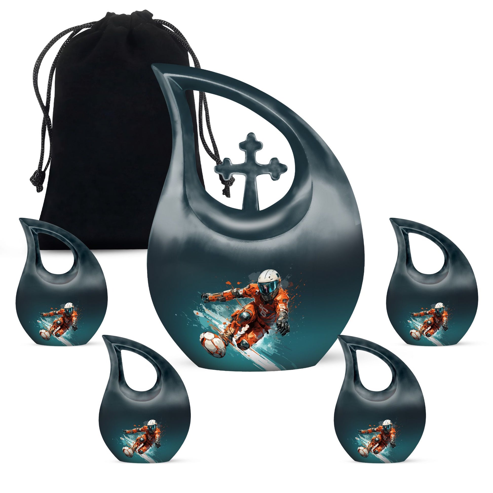 Crafted from durable aluminum, this large and keepsake urn set showcases detailed football-inspired artwork symbolizing strength, dedication, and passion. Its secure screw-top lid ensures long-term protection, while its spacious interior makes it ideal for burial urns for human ashes adult male, large urns for human ashes adult male, or large urns for female & male. For families who wish to share ashes, it pairs beautifully with mini urns for human ashes adult male, urns for adult male small keepsakes, or options such as urn female adult, urn female ashes, urn ash adult female, or urn human ash adult female. Its design supports a wide range of memorial needs while maintaining a unified and dignified style.