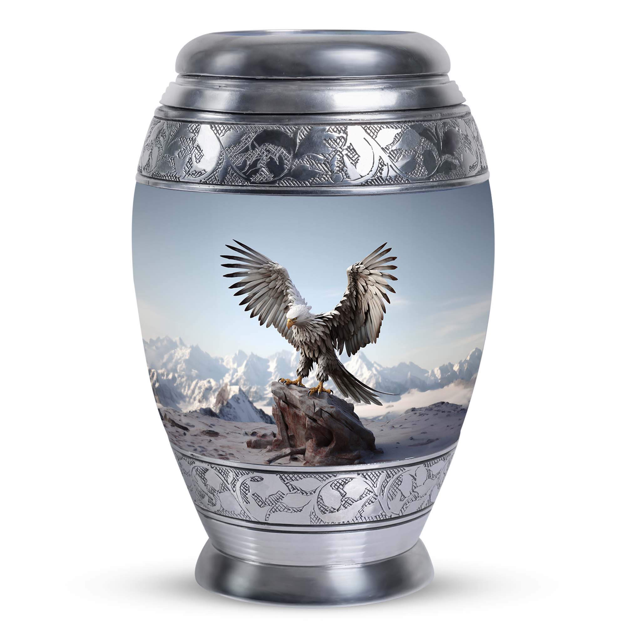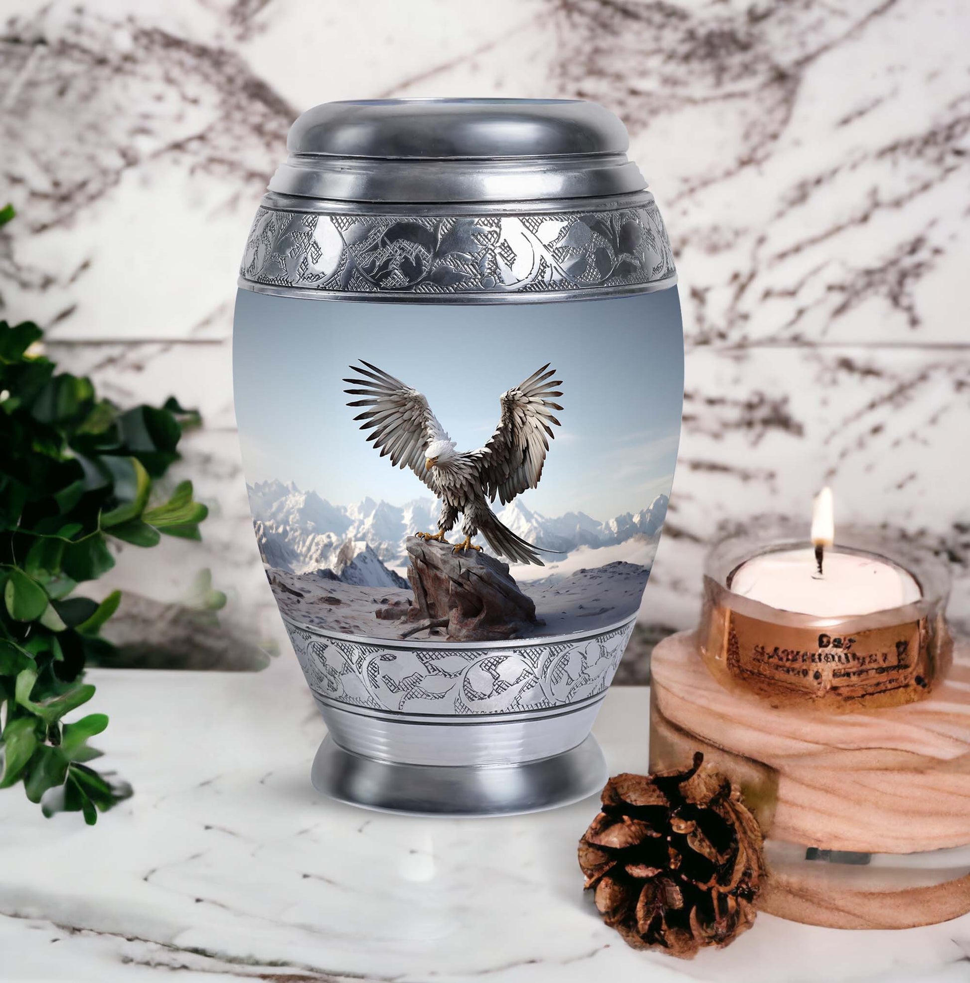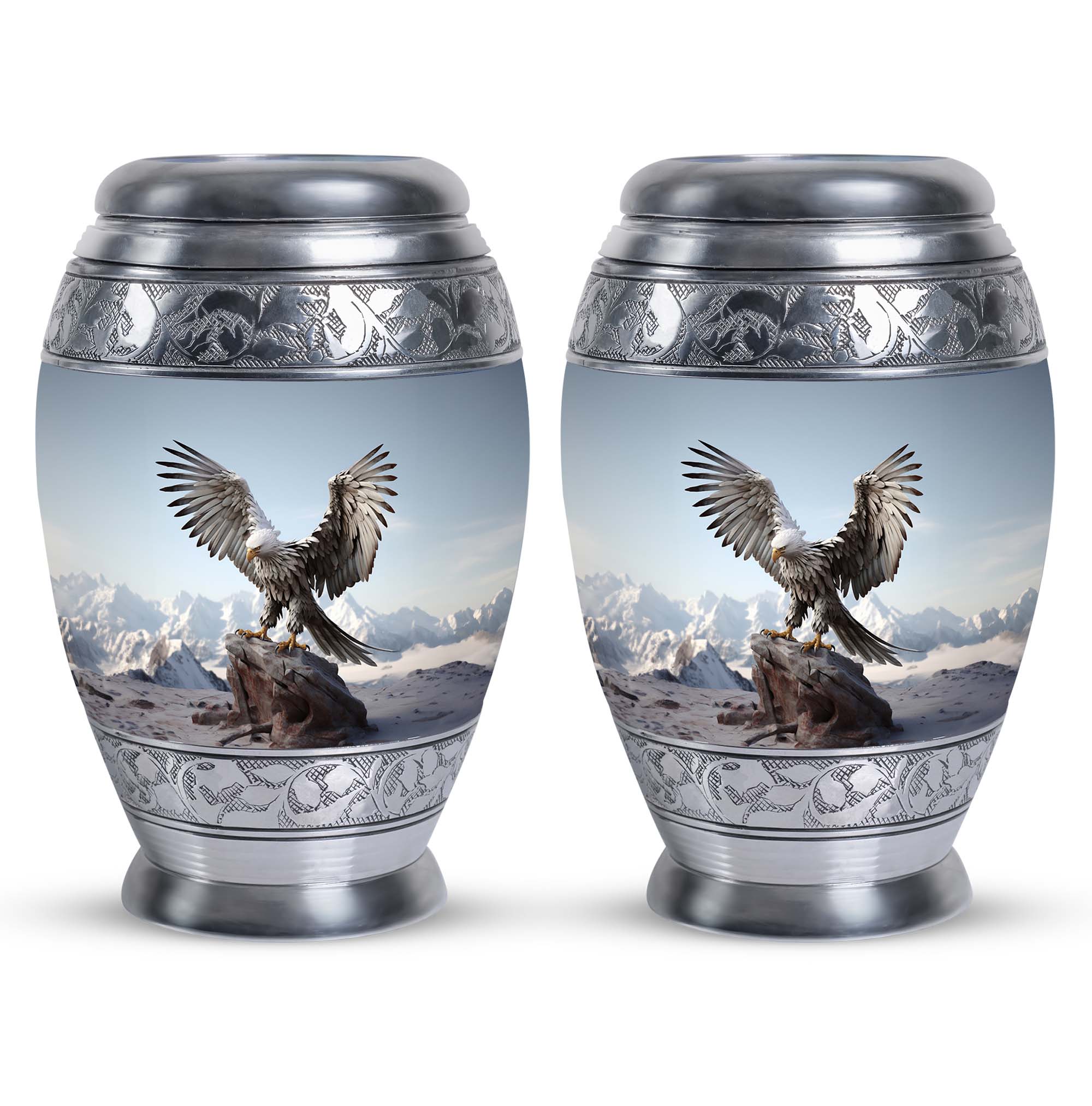 Experience the serenity and respect that your loved ones deserve with our Large, 3 Inch 'Eagle Urns for Ashes'. Crafted from resilient aluminium, these cremation urns stand 10 inches tall and provide a comforting home to about 200 cubic inches of your cherished one's remains. These urns weigh a solid yet manageable 3.3 pounds, symbolic of the significance of the memories they secure within. Burdened with a personal touch, we offer to customize these urns with engraved names; adding a heartfelt tribute to their memory. The urns also come packaged in a sumptuous velvet pouch, securing your loved one's remains with reverence and dignity. These Personalized Urns are well suited for those searching for 'Urns for Ashes for Dad', 'Urns for Human Remains', or even 'Decorative Urns for Ashes'. These cremation urns bridge the divide between a poignant necessity and a decorative keepsake, treating your loved ones with the consideration they have earned.