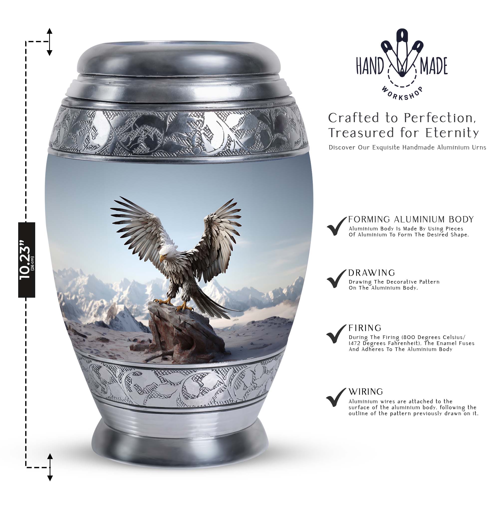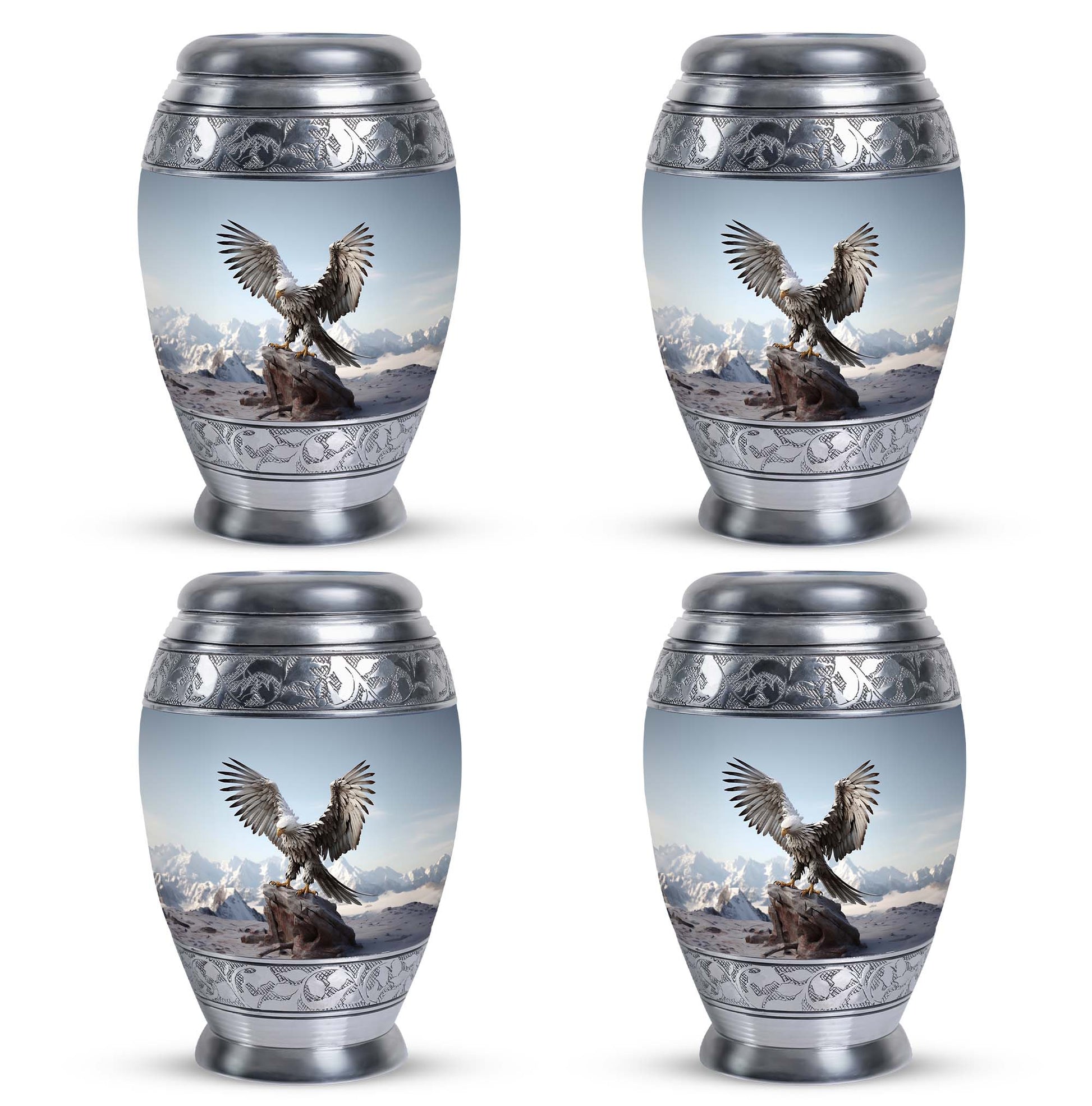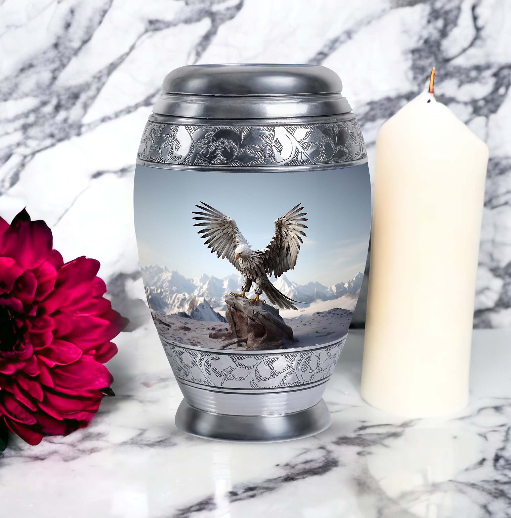 Experience the serenity and respect that your loved ones deserve with our Large, 3 Inch 'Eagle Urns for Ashes'. Crafted from resilient aluminium, these cremation urns stand 10 inches tall and provide a comforting home to about 200 cubic inches of your cherished one's remains. These urns weigh a solid yet manageable 3.3 pounds, symbolic of the significance of the memories they secure within. Burdened with a personal touch, we offer to customize these urns with engraved names; adding a heartfelt tribute to their memory. The urns also come packaged in a sumptuous velvet pouch, securing your loved one's remains with reverence and dignity. These Personalized Urns are well suited for those searching for 'Urns for Ashes for Dad', 'Urns for Human Remains', or even 'Decorative Urns for Ashes'. These cremation urns bridge the divide between a poignant necessity and a decorative keepsake, treating your loved ones with the consideration they have earned.
