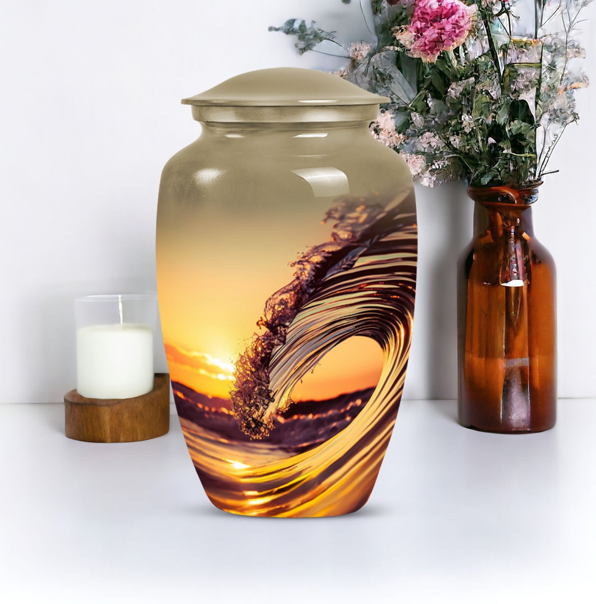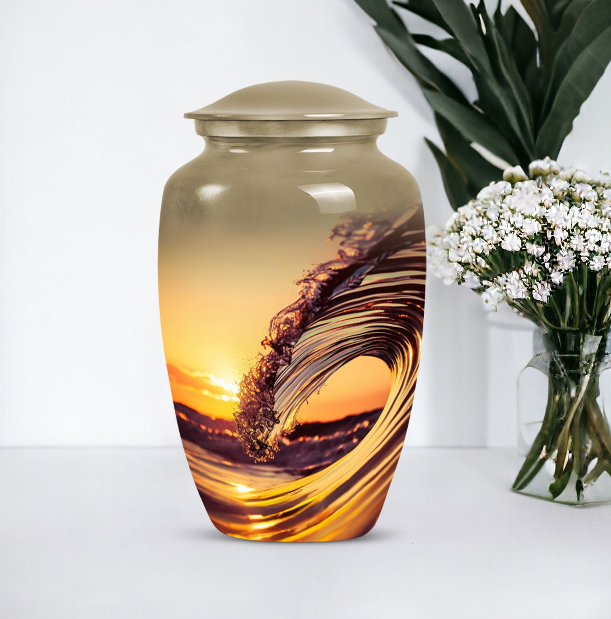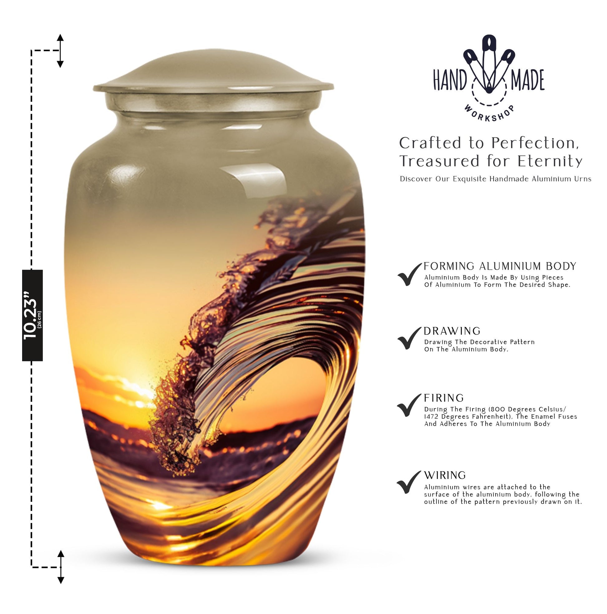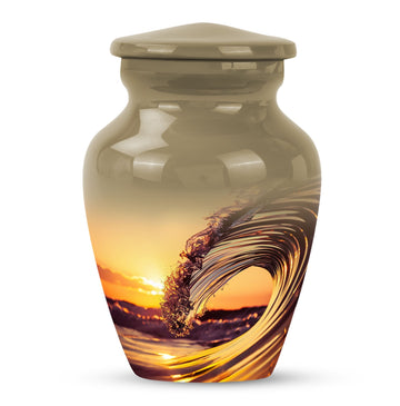 Immerse in serene memories as you embrace the final resting place of your beloved one with this 'Ocean Waves Urn'. This cremation urn is more than a vessel; it's a commemorative piece, meticulously crafted out of aluminium, showcasing an enduring appeal. It is accentuated with a Butterfly theme that adds a symbolic touch of transformation and new beginnings. This large urn, prudently sized at 10 inches in height, can accommodate up to 200 cubic inches, making it apt for adult or senior cremation. It weighs 3.3 pounds, symbolizing a tangible connection with your loved one. The urn comes with a velvet pouch, offering a gentle enclosure for the ashes. With a provision for personalizing with engraved names, the urn preserves your dear one's memory in a truly special way. This cremation large urn resonates with the tranquility of ocean waves, offering a soothing tribute. Let the 'Ocean Waves Urn' serve as a heartfelt reminder of a life well-lived, making a fitting choice among burial ashes urn, human ash urns, funeral urns and all types of cremation urns for human ashes.