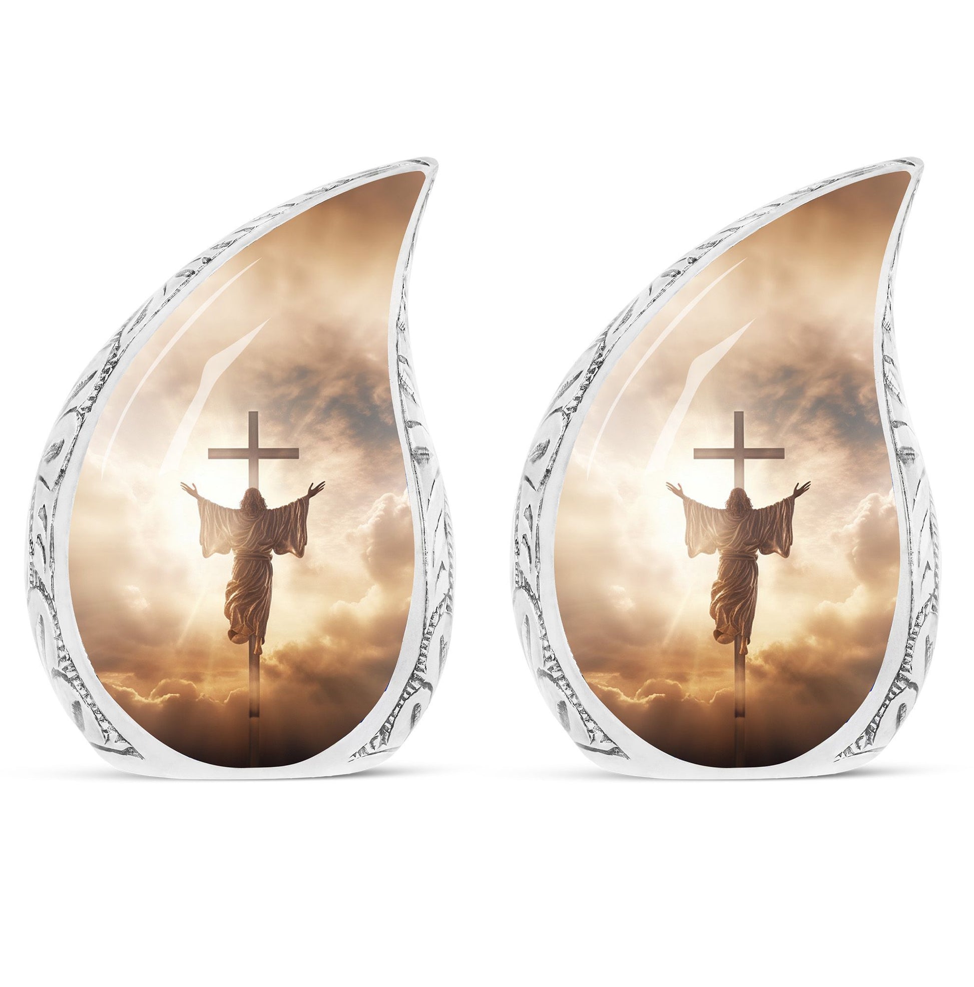 Savor the immortal remembrance of a loved one with our meticulously crafted Jesus Christ cross Urn. Sized at 3 inches, this beautifully designed cremation urn is made from sturdy aluminium ensuring long-lasting memory-keeping. Weighing a modest 3.3 pounds with a height of 10 inches, it has the capacity to securely hold up to 200 cubic inches of ashes. What's more, personalization options are available, allowing you to engrave names on the urn for a more personal and intimate touch. It also comes with a luxurious velvet pouch, providing a dignified containment for the ashes. This large urn for human cremation ashes intertwines sanctity with modernity, creating a divine blend for this standout memorial ceremony supply. Embrace the culture of love, honour, and remembrance with our commemorative masterpiece.