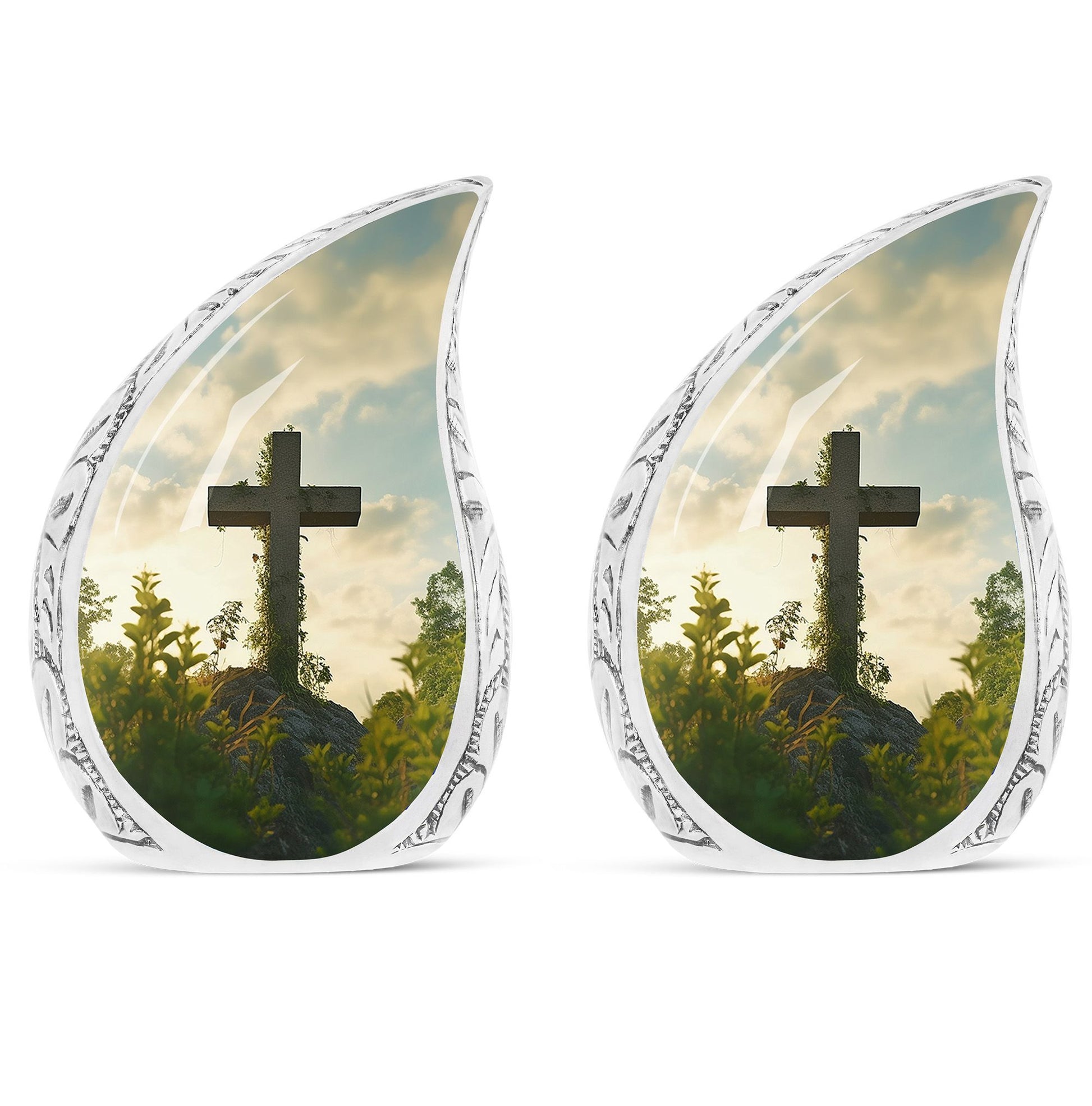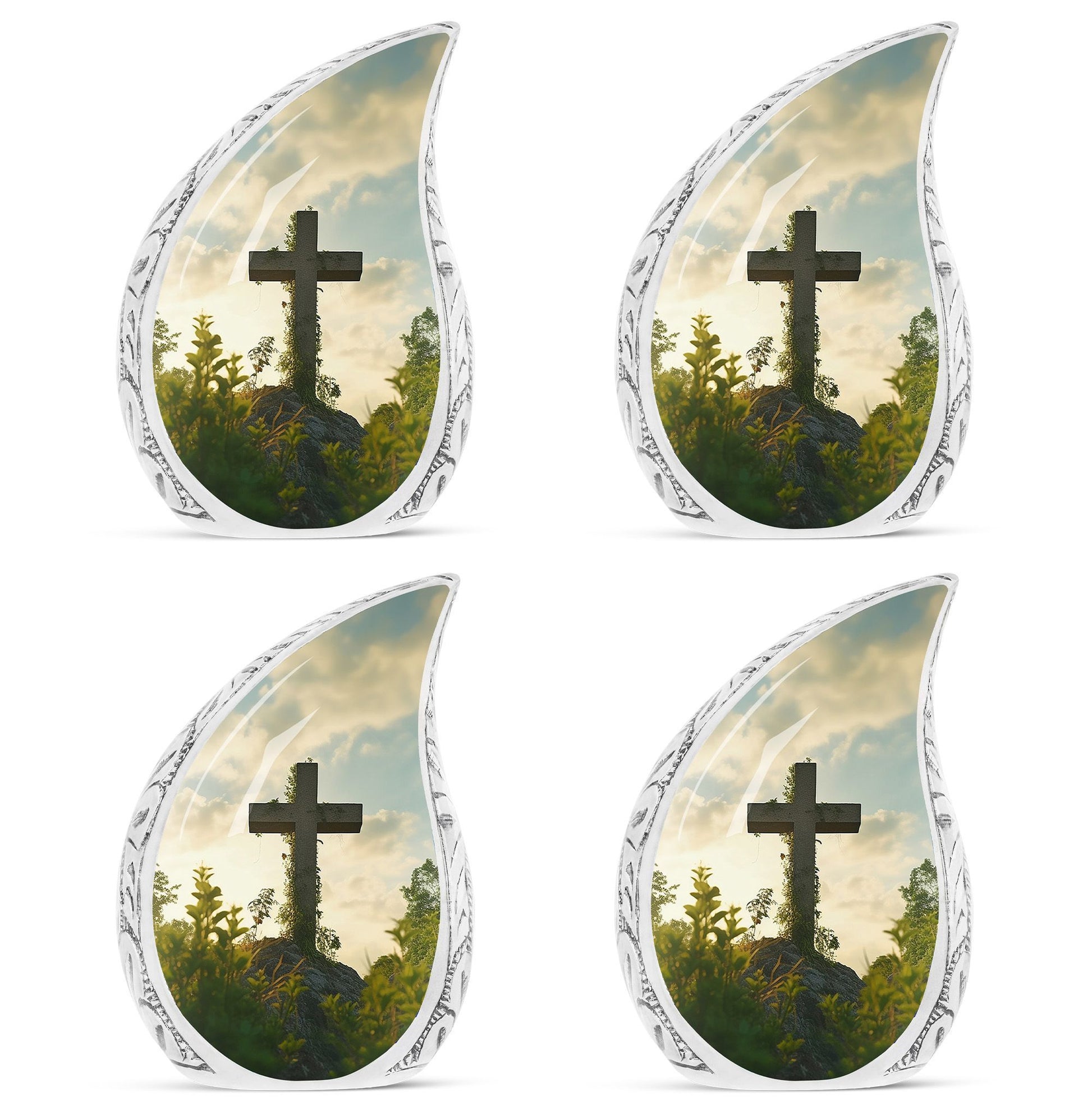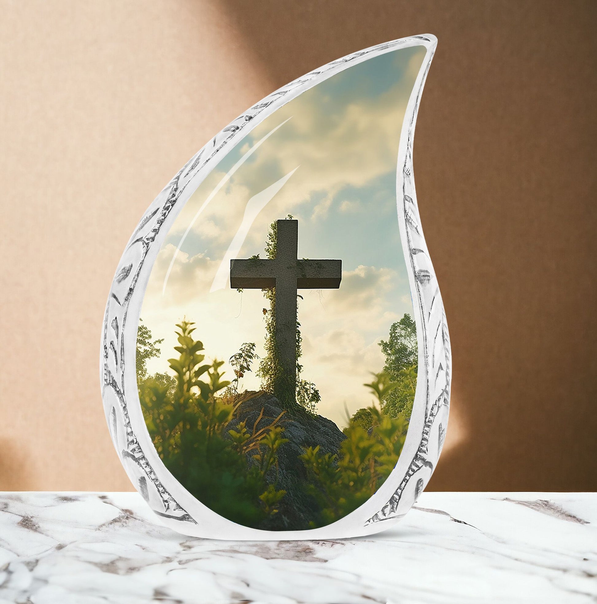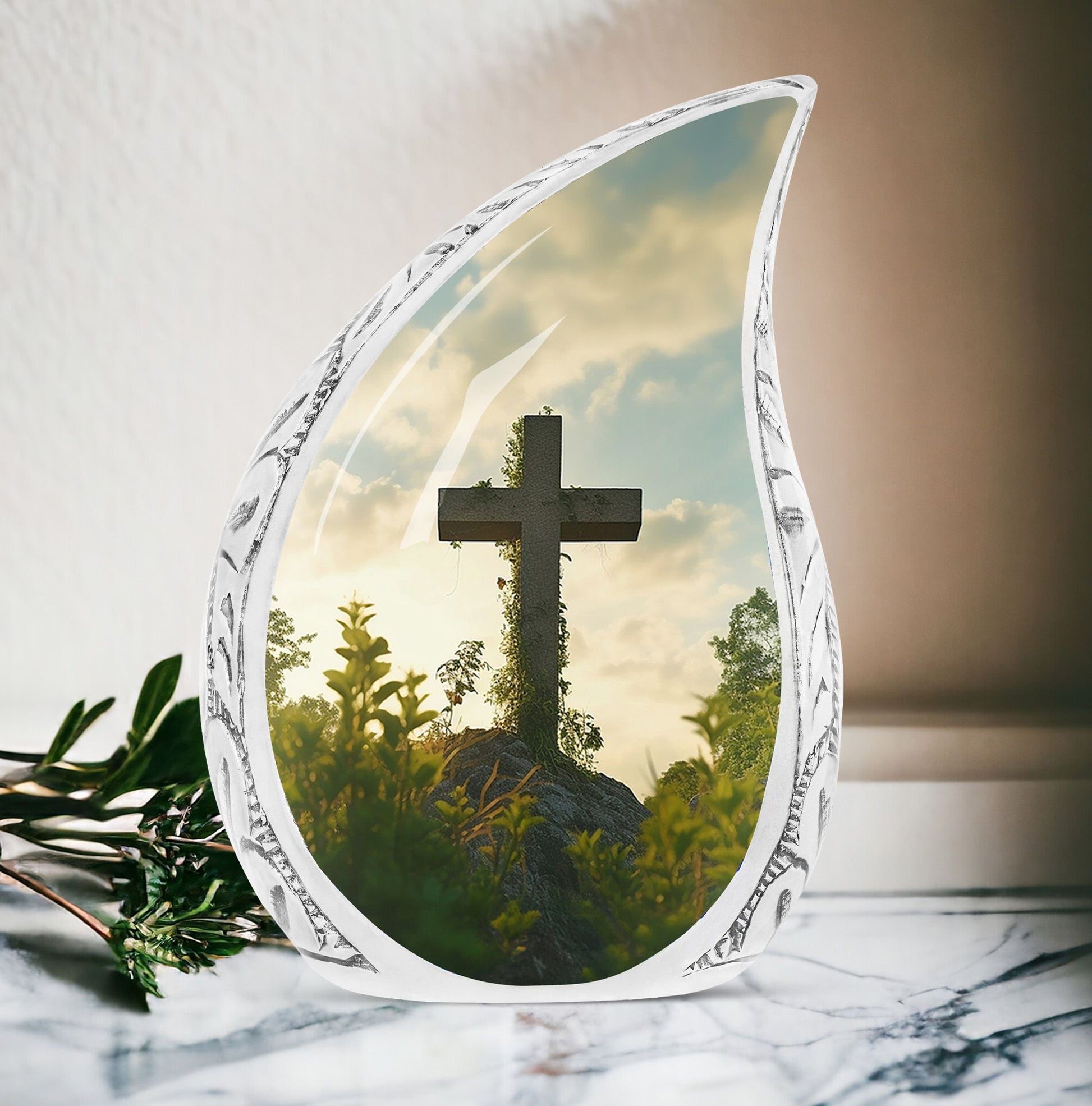 Pay your respects to your departed loved ones with our Jesus Christ Cross Memorial Urn. Crafted meticulously with Aluminium, our large urn is revered for its superior durability. The dimensions of our uniquely designed urn stands at 10 inches in height and weighs in at 3.3 pounds. This classic urn design carries approximately 200 cubic inches of ashes, perfect for the containment of your loved one's remains. This urn is also customizable to truly make it unique to your eternal memory. You can personalize it with engraved names making it a distinctive memorial urn. Included with your purchase is a velvet pouch perfect for the preservation and containment of your cherished one's remains. This 3-inch urn stand as a small yet enduring testament to your eternal love. Perfectly suitable for those searching specifically for 'Unique Urns for Dad, Metal Urns for Human Ashes, Urns for Ashes for Mom, Decorative Urns for Human Ashes'.