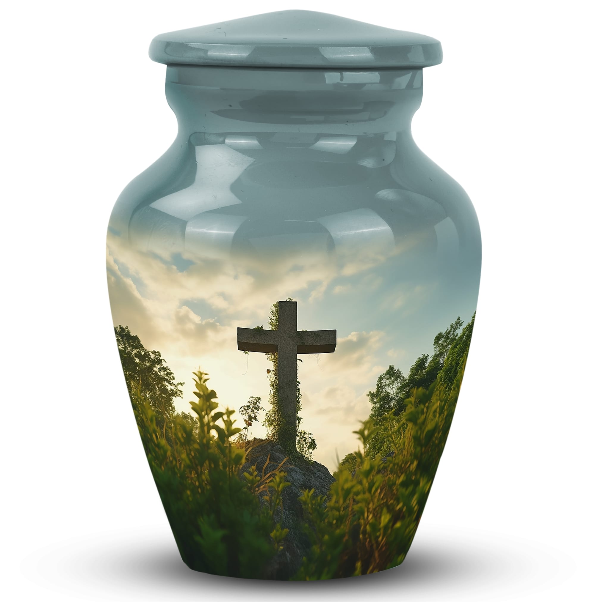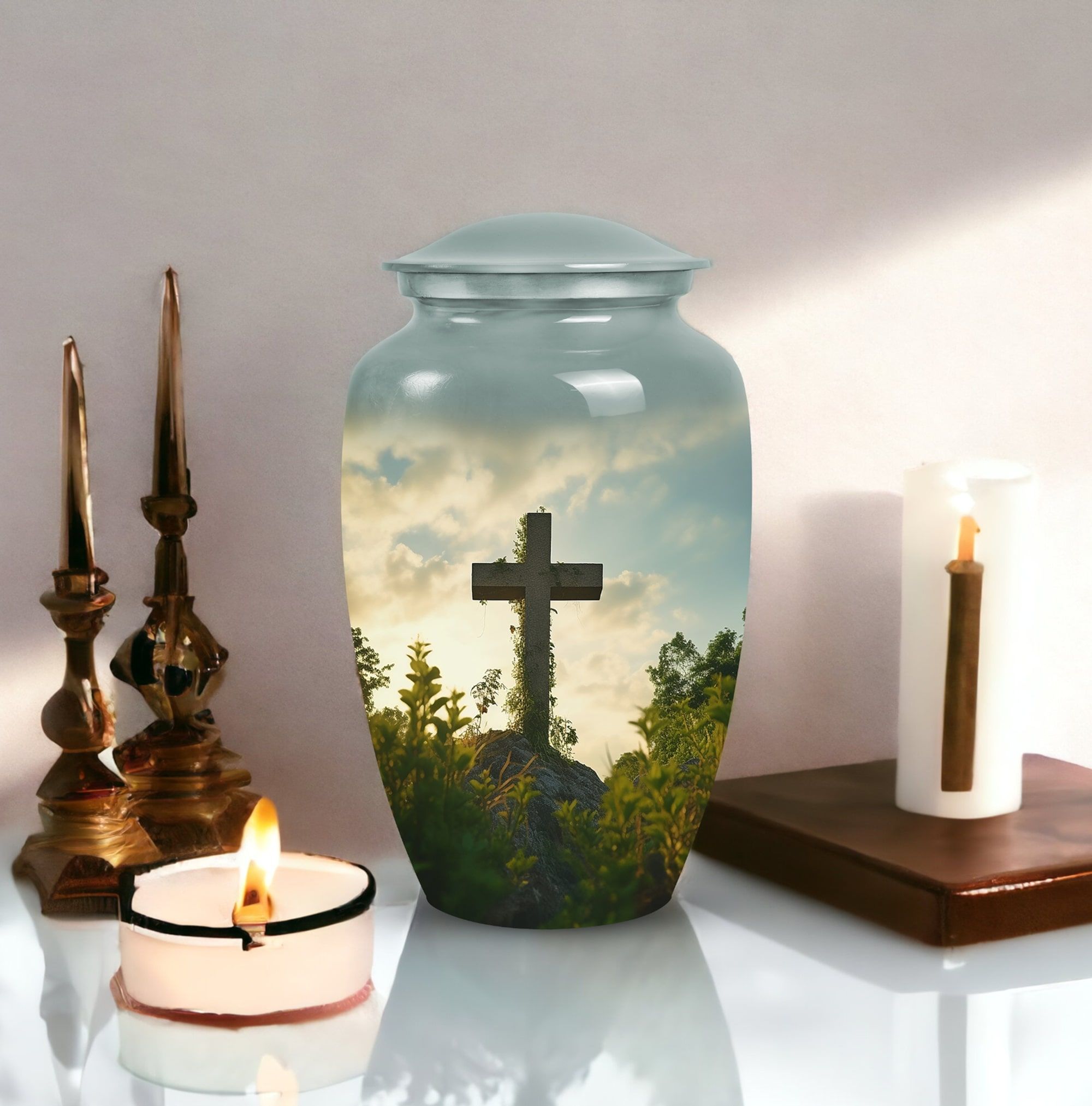 Find solace in our Jesus Christ cross Memorial Urn, an exquisite representation of your fond memories and reverence for your loved ones. Handcrafted in durable and lightweight Aluminium, this 3 inch, 3.3-pound large urn provides an everlasting resting place, radiant in its simplicity. Its remarkable 200 cubic inch capacity can preserve the ashes of your beloved with dignity. The urn's sublime 10-inch height and classic design serve as a tribute to the affectionate relationship you shared. Personalize this memorial urn with engraved names, making this more than just a resting place, but also a cherished keepsake. The urn's package is completed with a velvet pouch, ensuring safe containment of ashes, and providing solemn elegance to the urns' presentation. This urn is acutely suited for those searching for unique urns for Dad, Metal Urns for Human Ashes or even decorative Urns for Human Ashes for Mom. Ultimately, our memorial urn serves to comfort, to soothe, and to help you remember those dear.