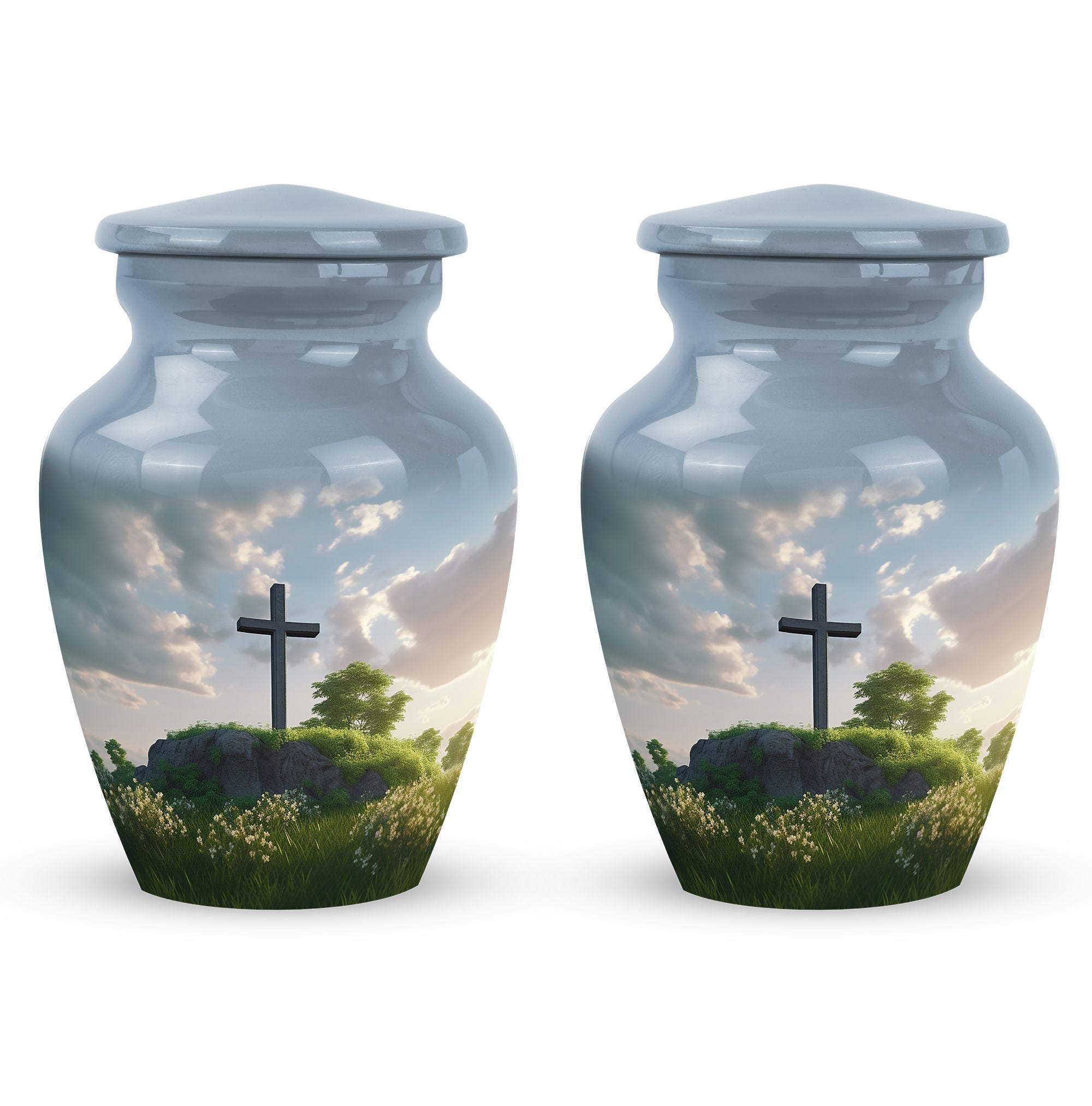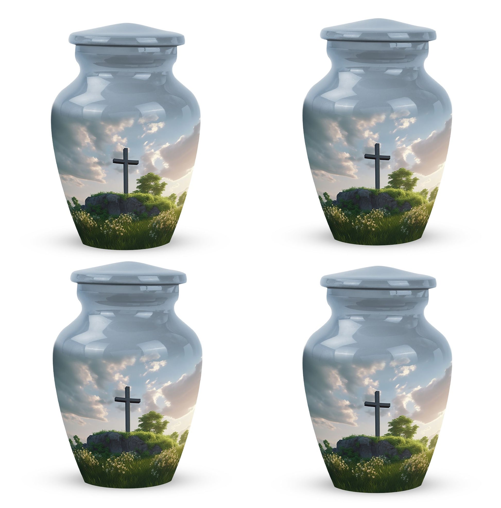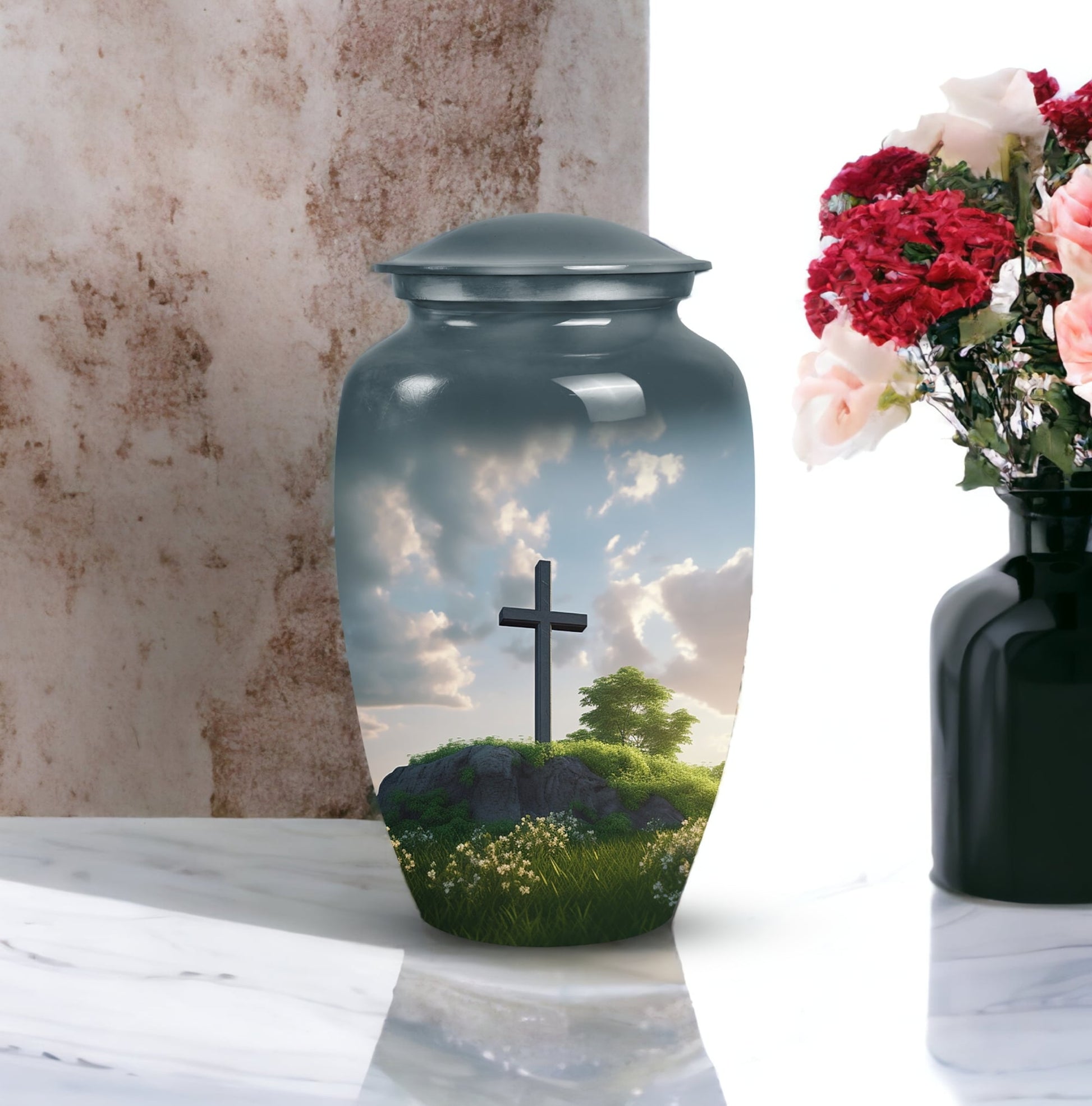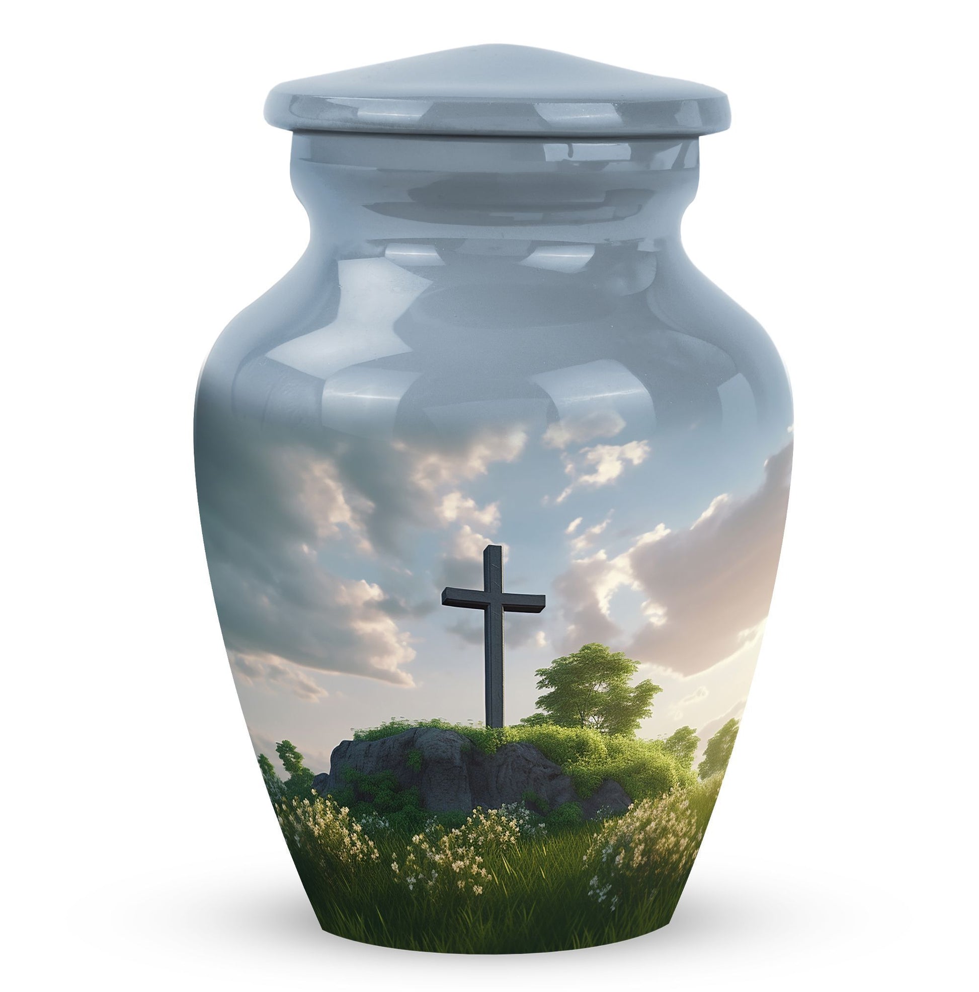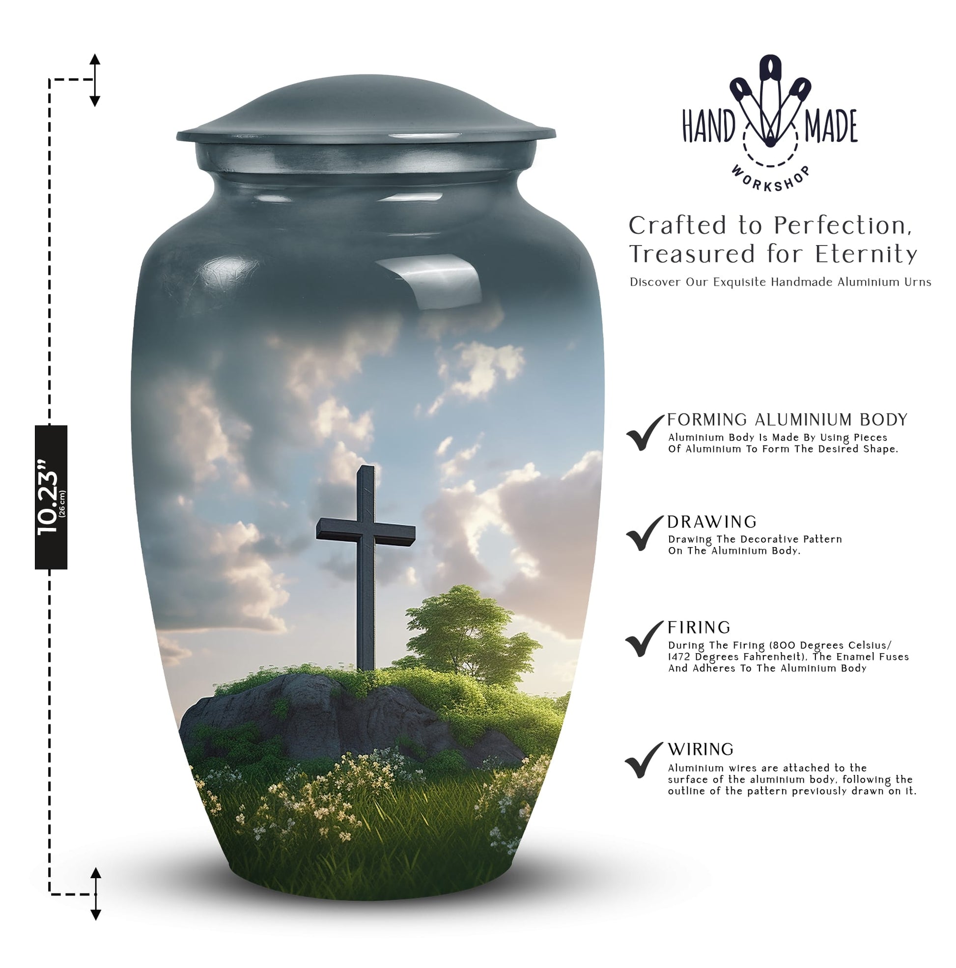 Introducing our meticulously crafted 10-inch Jesus Christ cross urn, an elevated choice for those seeking a distinctive and personalized urn for human ashes. Expertly sized at 3 inches with a competent capacity of 200 cubic inches, this Burial Urn fabricates a significant charm with its unique allure. Its classic construction brings a comforting presence during your most challenging times. Rendered in high-quality Aluminium, it exhibits a substantial weight of 3.3 pounds proving its high durability. Our 3-inch cremation urn comes with a soft velvet pouch, ensuring secure containment of ashes. The urn supports customization, enabling you to personalize your keepsake with engraving names. Guaranteeing originality, this product distinguishes itself from the common metal cremation urns. This large urn is not only an object of remembrance but also a remarkable piece of artwork for those adults and seniors seeking something uncommon. So trust your loved one's memory to our Jesus Christ cross urn, a truly unique cremation urn for human ashes.
