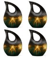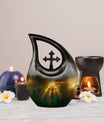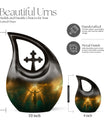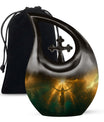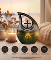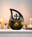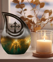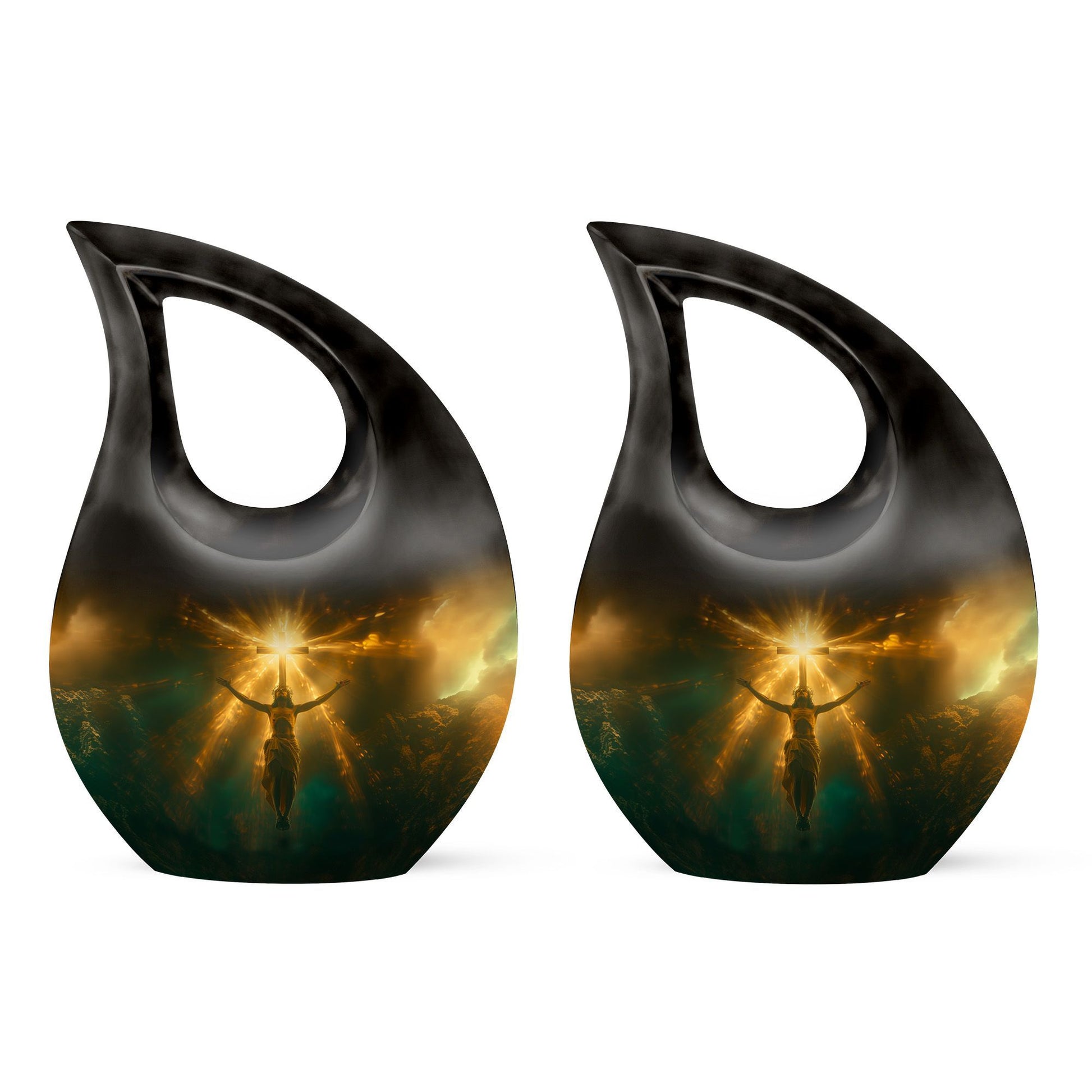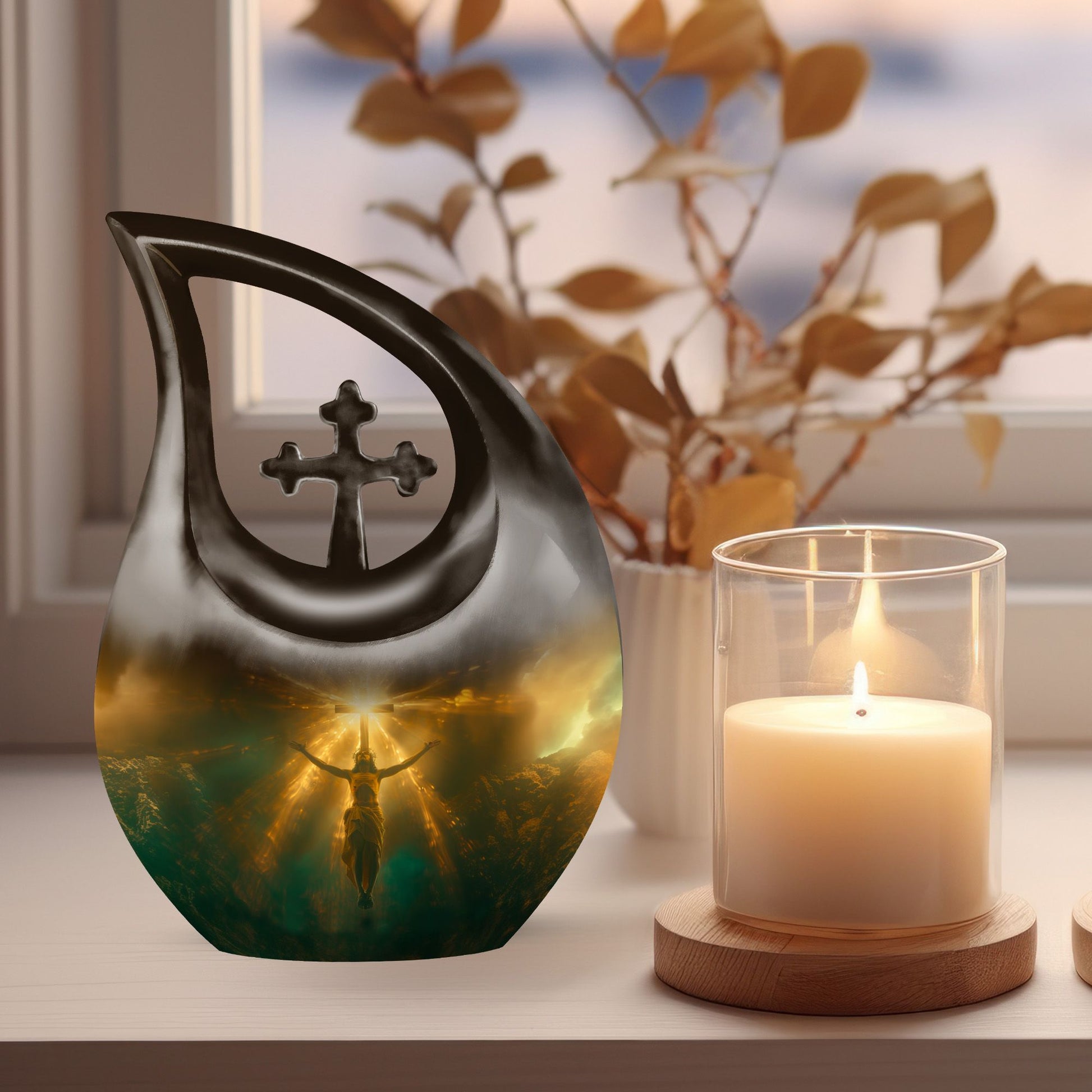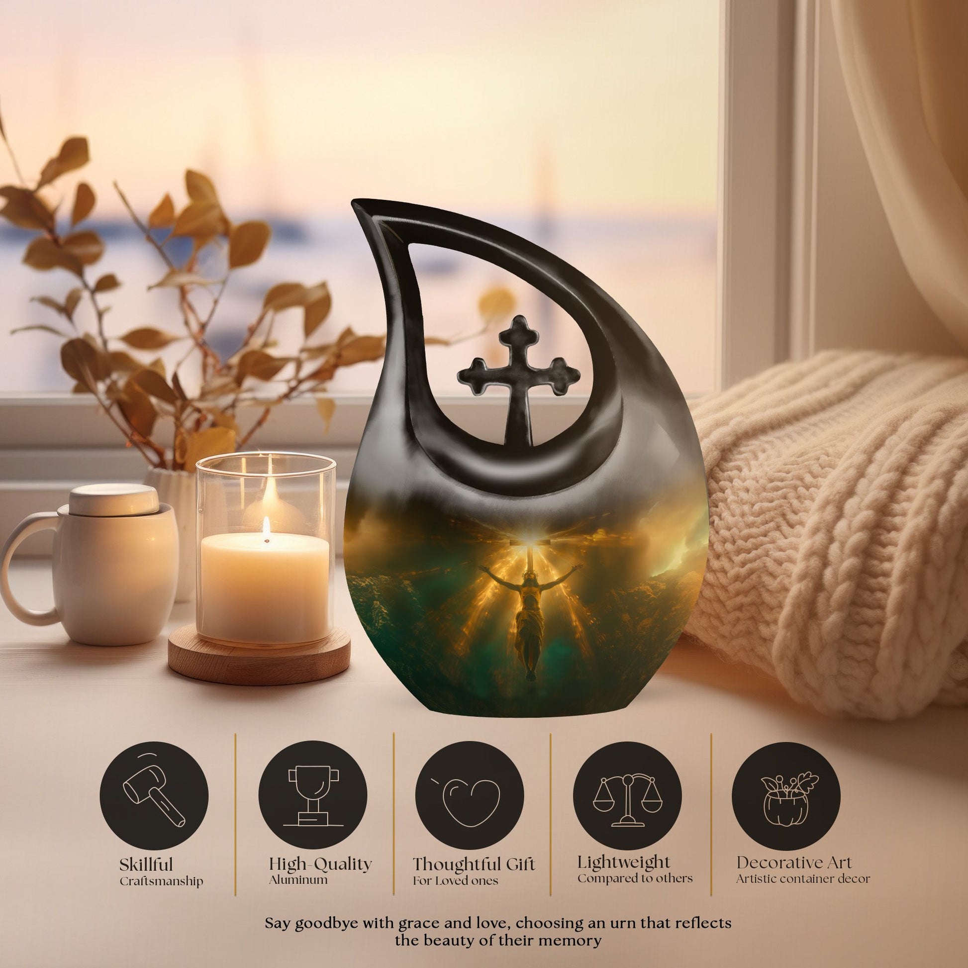 Immerse yourself in a reverent remembrance with our Large Jesus Cross Drop Urn. Tailored specifically for adults and seniors who seek unique pieces for memorial ceremonies, this 10-inch urn, weighing a solid 3.3 pounds, has a noble presence. Skillfully manufactured from robust aluminium, it accommodates up to 200 cubic inches of ashes, creating a heartfelt memorial to the departed. Equipped with personalization options, it is possible to engrave names and bring a touch of individuality to this tender tribute. The package includes a soft velvet pouch for secure containment of shaken ashes. This unique cross drop urn aims to provide a sense of solace in times of sorrow, embodying the timeless inspiration drawn from Jesus. Harnessing keywords such as Jesus Urn, Memorial Urns, Affordable Cremation Urns, Urns for Ashes for Adults, and affordable cremation, this product encapsulates an affordable and respectful choice amongst memorial ceremony supplies.