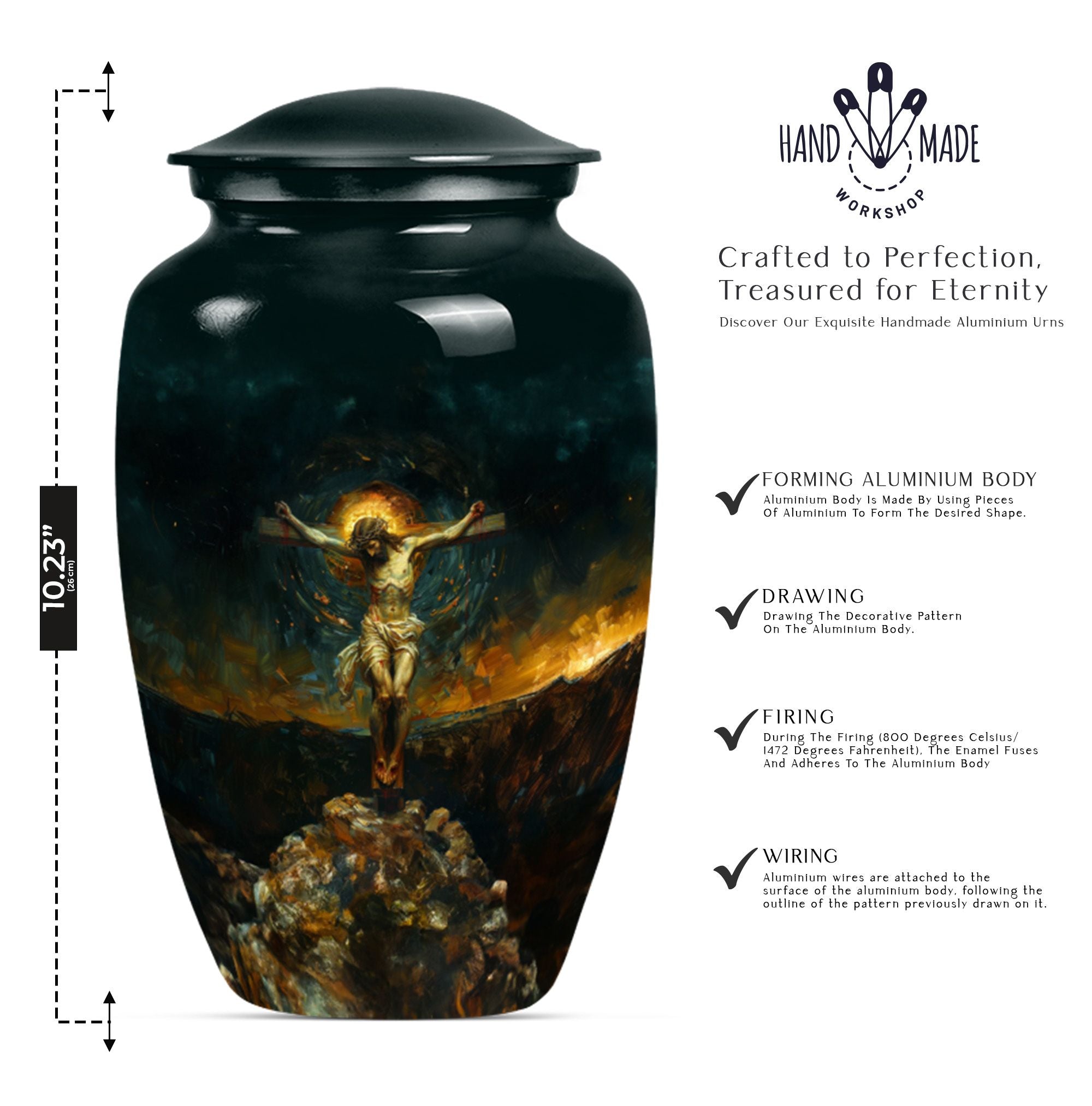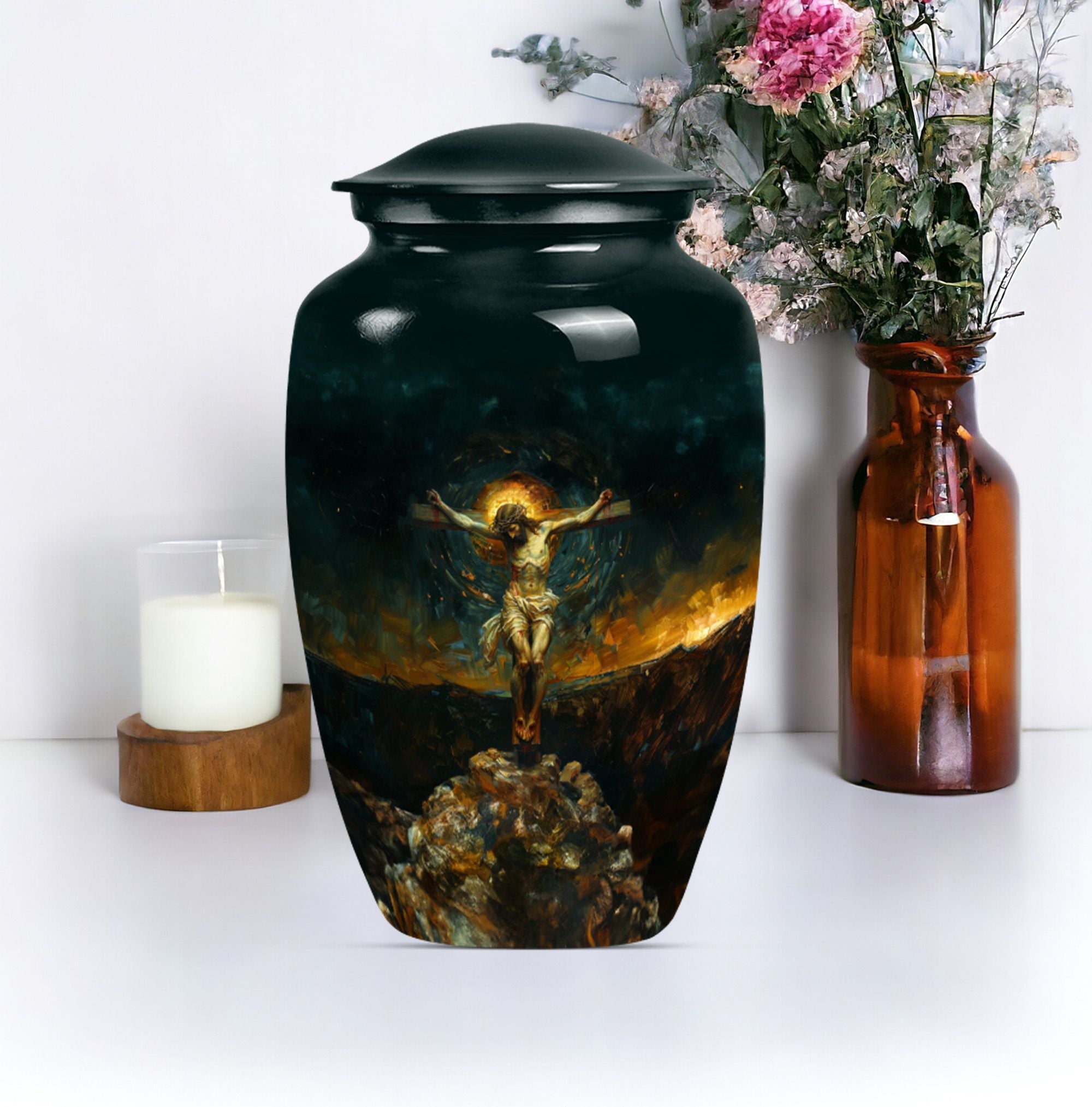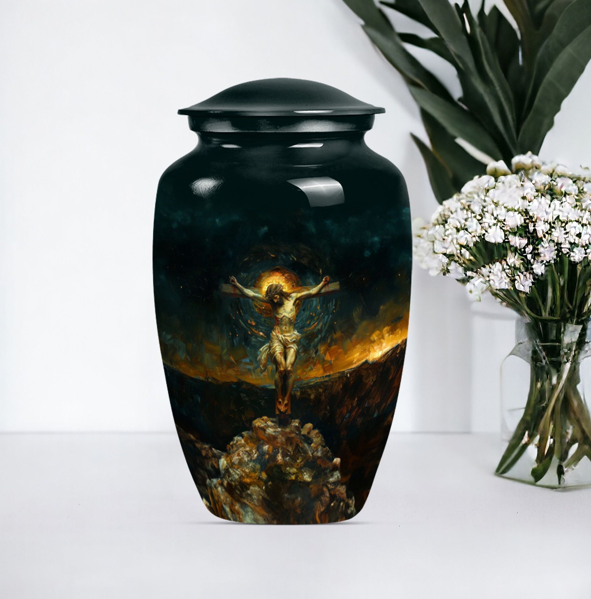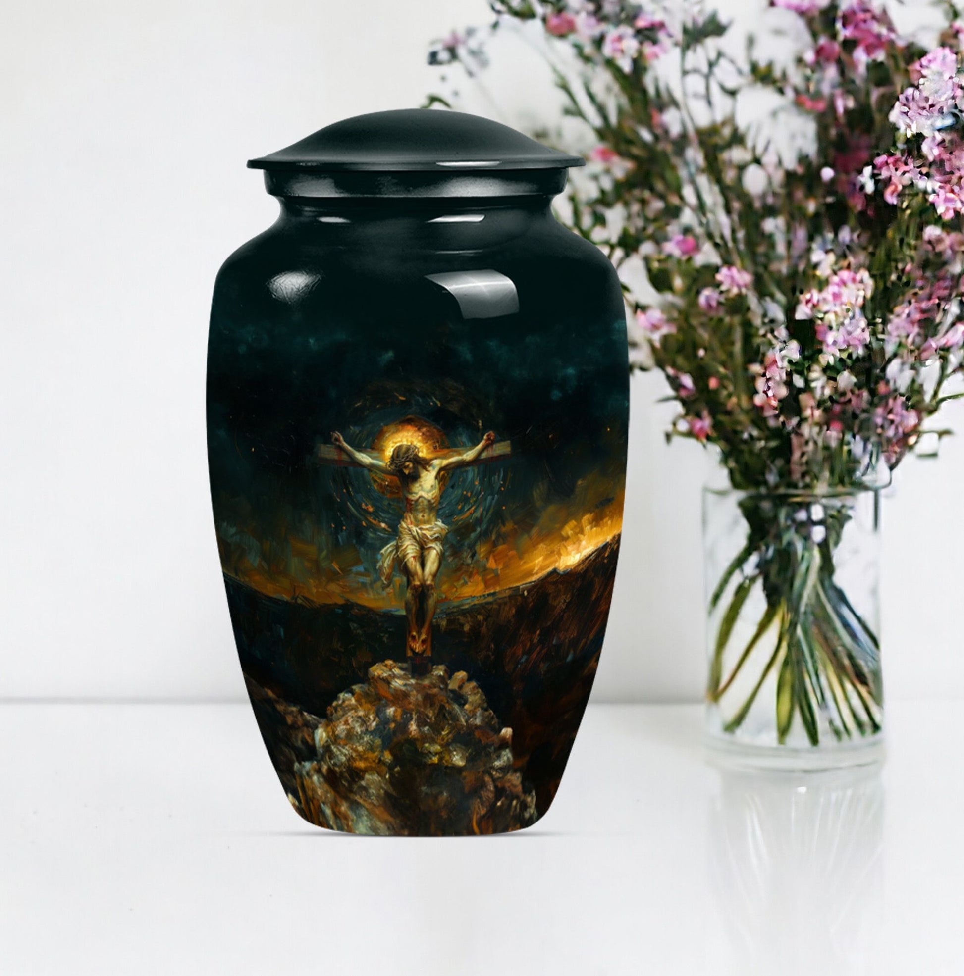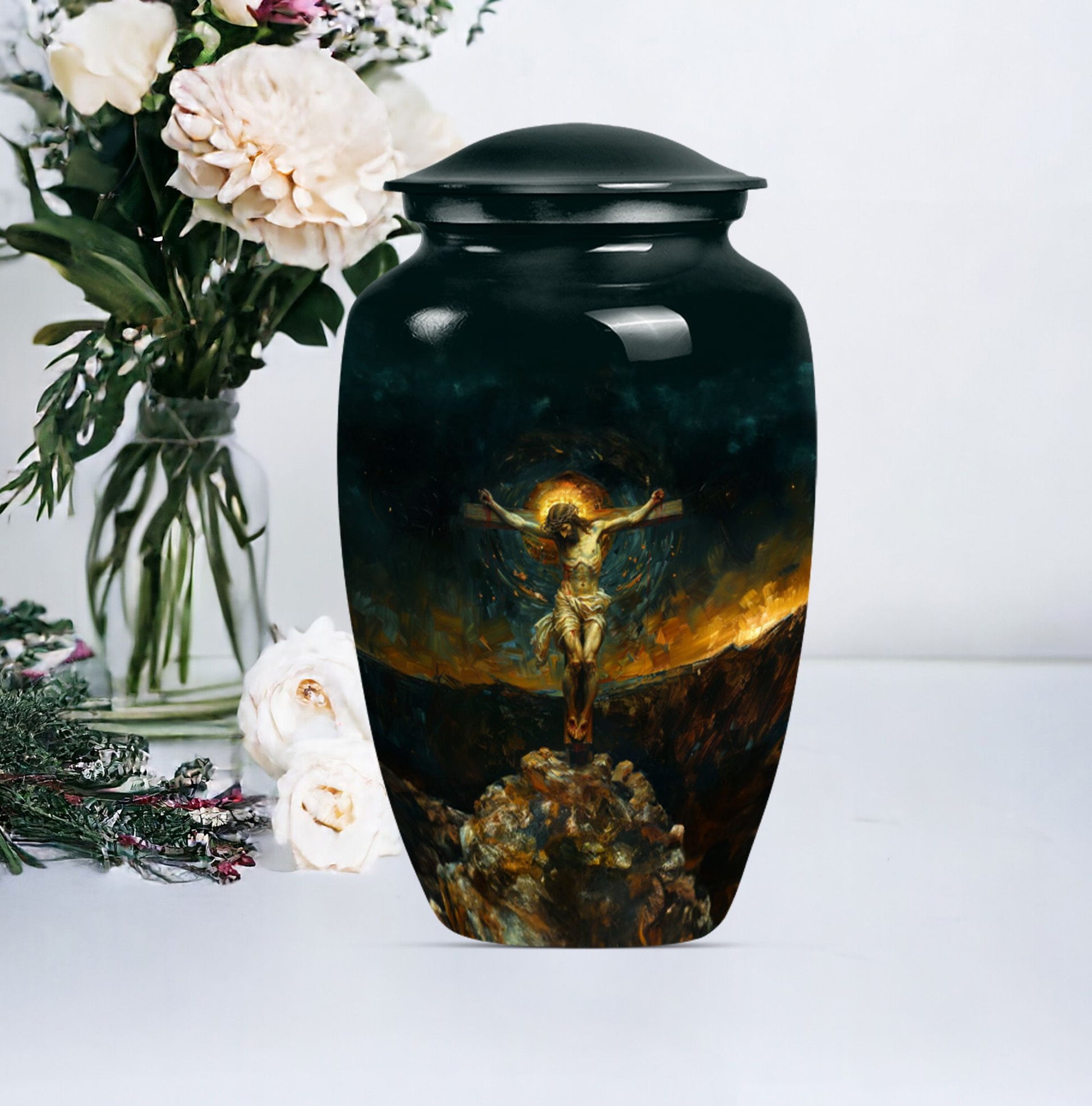 Honoring your loved ones with respect and alacrity, the 'Jesus Urn' serves as a dignified resting place for those cherished. Available in a size of 10 inches, this large urn is made from solid, sturdy Aluminium, promising longevity and enduring charm. It's not just a burial ash urn for humans, the Classic Urn design, abstract theme, and striking features present a confluence of aesthetics and emotion. weighing a manageable 3.3 pounds, it offers a secure capacity of 200 cubic inches. This ensures ample space for ashes from an adult, whether male or female, staying true to its essence as a 'cremation urn'. You're even provided with a plush velvet pouch for sensitive containment of ashes—preserving dignity and grace in every aspect. For a touch of personalized sentiment, engrave names of the departed on this urn, making it a unique testament to their life. From usage as an urn for adult cremation ashes to suitably a cremation urn for adult ashes for men, its adaptability prevails. In the world of adult cremation urns, its distinctiveness outshines. Remember your loved one with this lovingly-crafted Jesus Urn.
