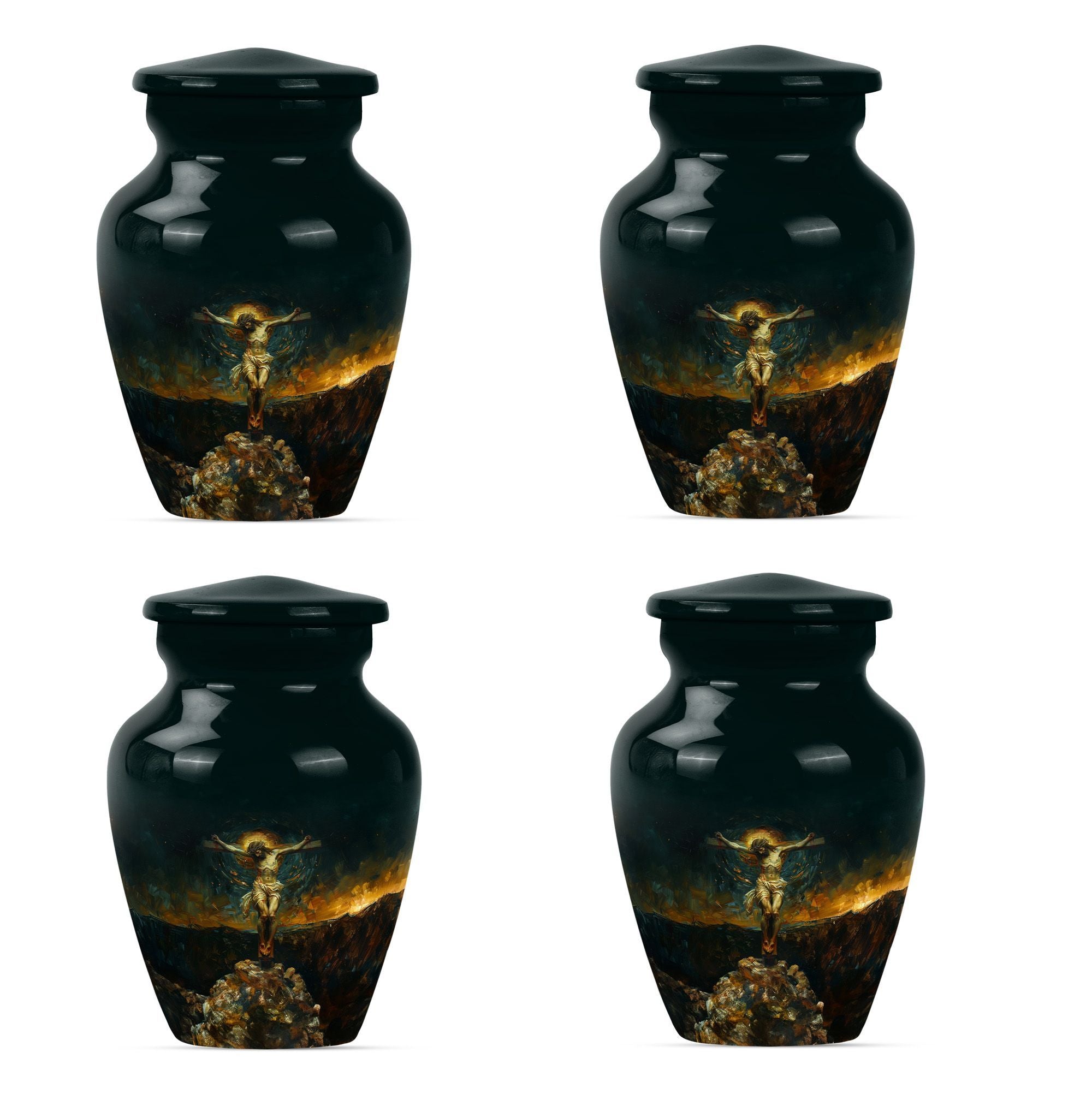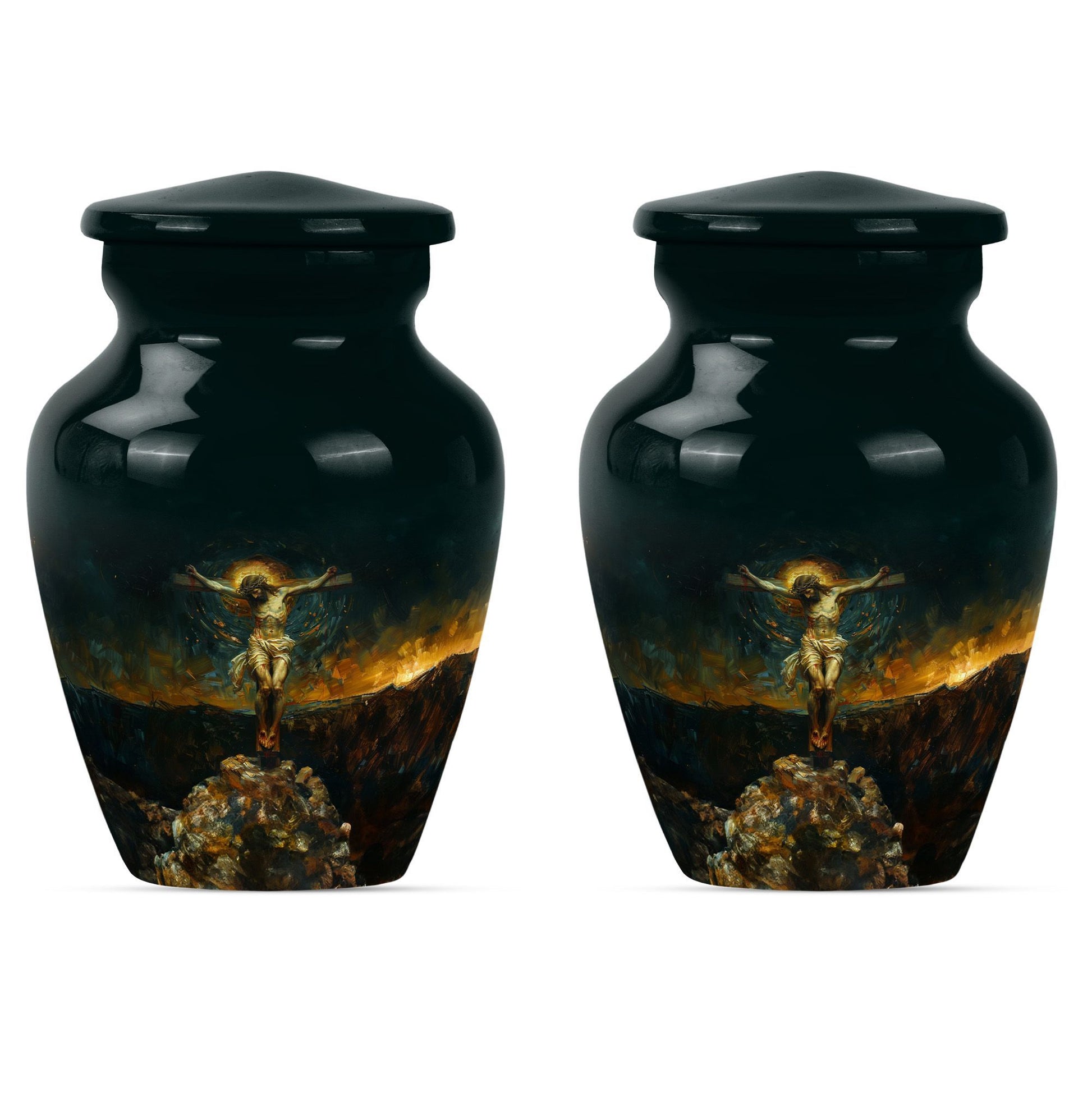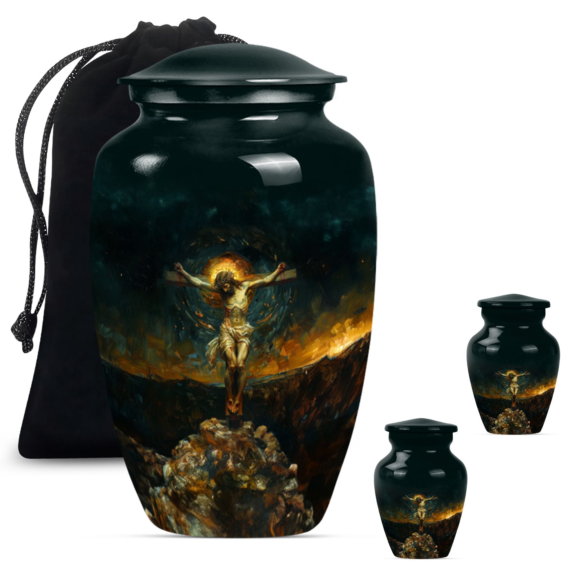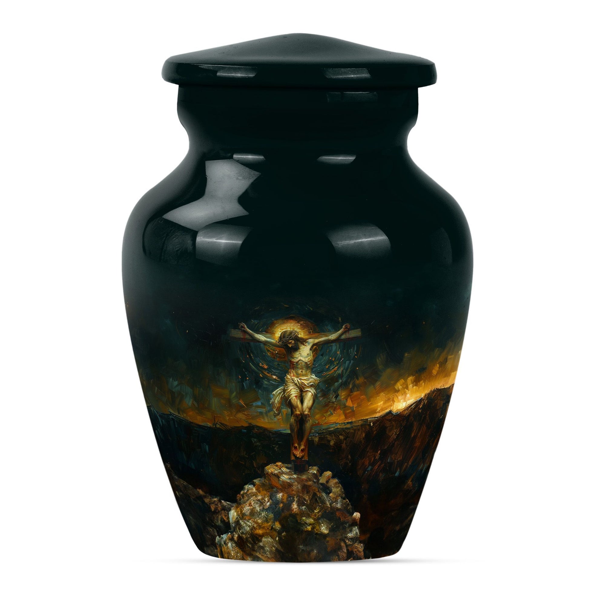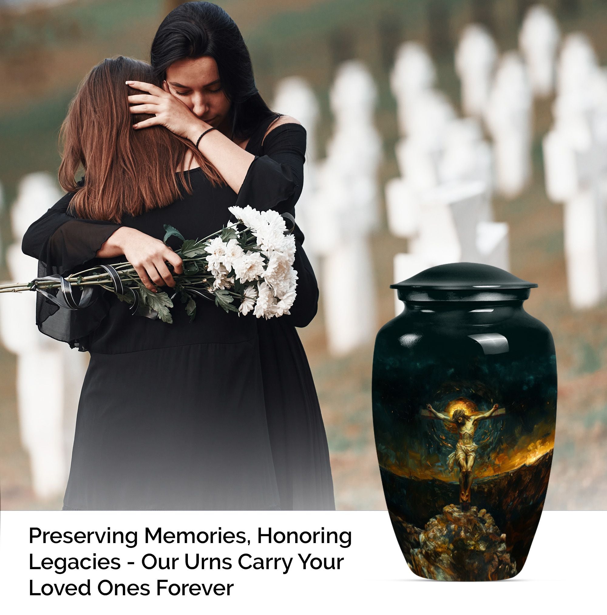 Honoring your loved ones with respect and alacrity, the 'Jesus Urn' serves as a dignified resting place for those cherished. Available in a size of 10 inches, this large urn is made from solid, sturdy Aluminium, promising longevity and enduring charm. It's not just a burial ash urn for humans, the Classic Urn design, abstract theme, and striking features present a confluence of aesthetics and emotion. weighing a manageable 3.3 pounds, it offers a secure capacity of 200 cubic inches. This ensures ample space for ashes from an adult, whether male or female, staying true to its essence as a 'cremation urn'. You're even provided with a plush velvet pouch for sensitive containment of ashes—preserving dignity and grace in every aspect. For a touch of personalized sentiment, engrave names of the departed on this urn, making it a unique testament to their life. From usage as an urn for adult cremation ashes to suitably a cremation urn for adult ashes for men, its adaptability prevails. In the world of adult cremation urns, its distinctiveness outshines. Remember your loved one with this lovingly-crafted Jesus Urn.