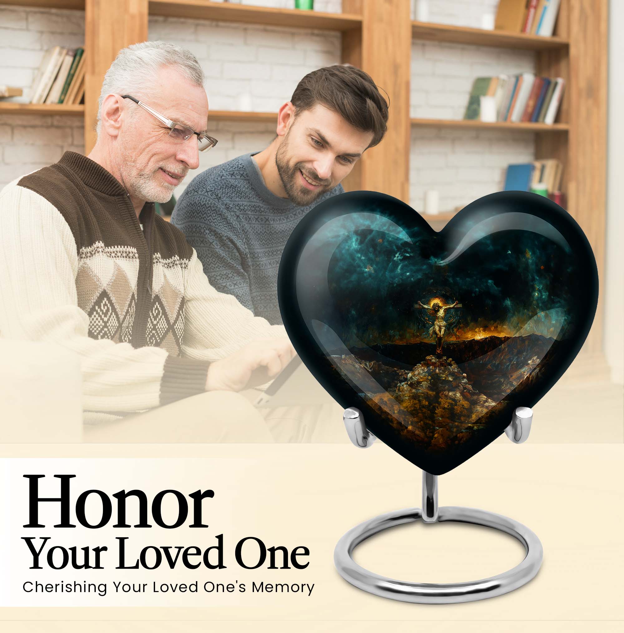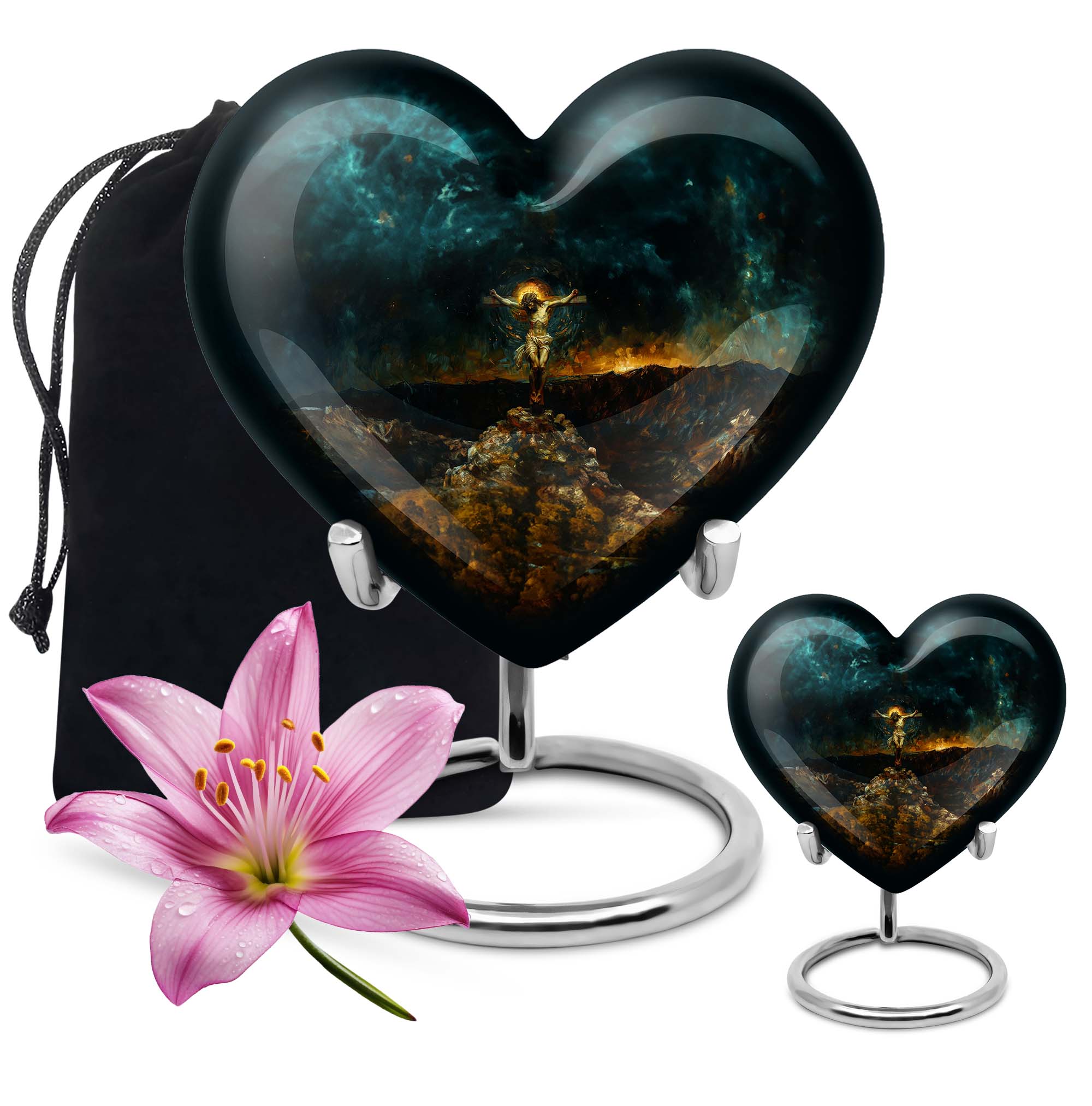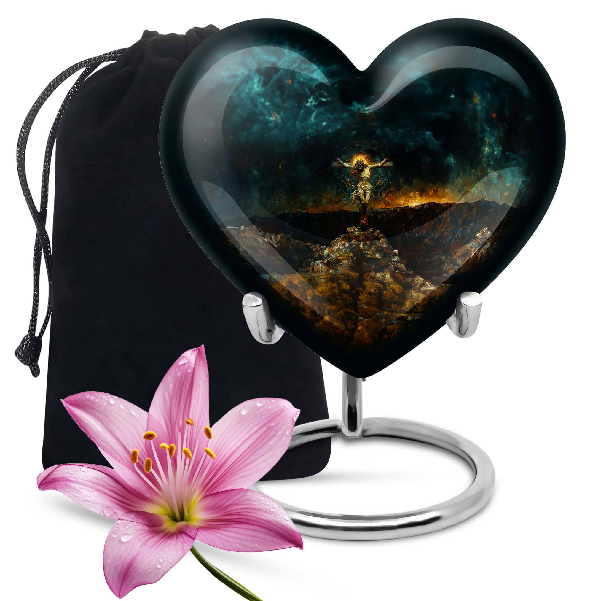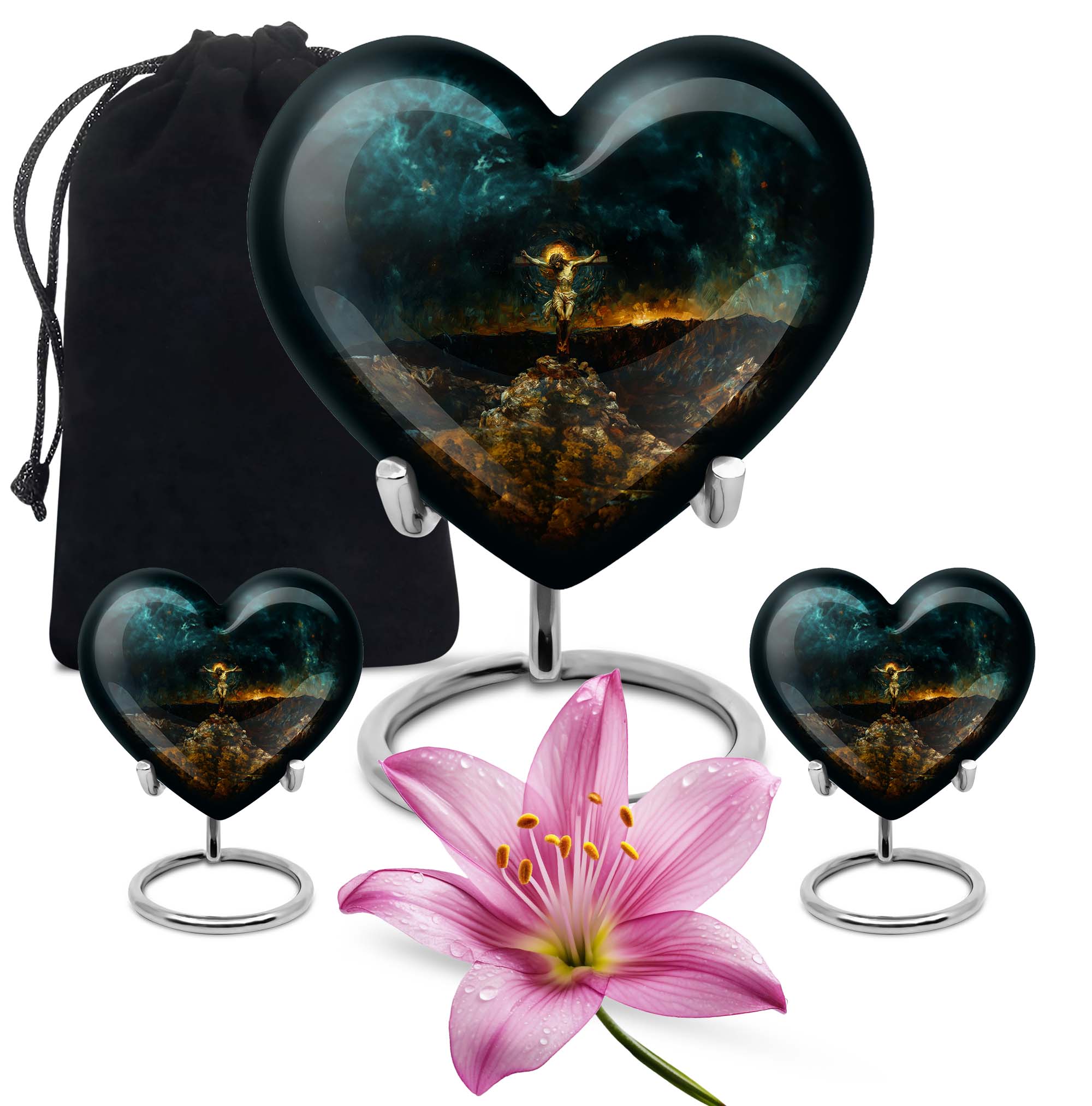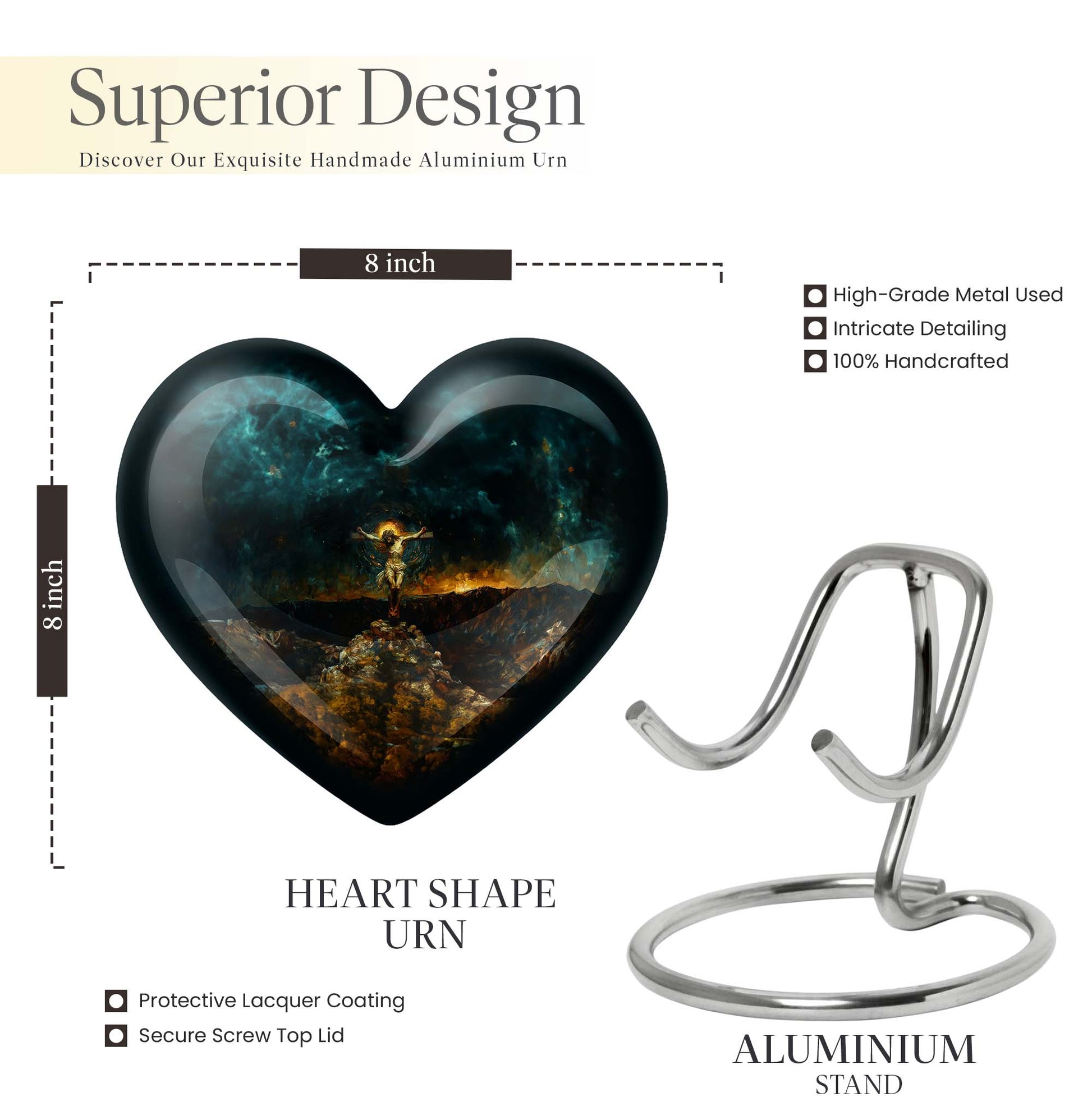 Experience a spiritual remembrance and reconnect with your lost loved ones with our 10-inch aluminium Jesus Urn. Weighing a sturdy 3.3 pounds and boasting a spacious capacity of 200 cubic inches, this large urn is designed to securely hold cremation ashes. Our abstract-themed heart-shaped urn brings a sense of serenity and peace, offering a beautiful commemorative symbol for your dearly departed. The package includes a velvet pouch for safeguarding the ashes, adding an extra layer of protection and reverence. Moreover, to bring a sense of personal connection, you can personalize this burial ash urn with engraved names, creating a unique remembrance. Beyond its practical use, our cremation urn serves as a touching tribute to your loved ones, ensuring their memory lives on. With the phrase 'cremation urn' and keywords such as 'Jesus Urn', 'burial ash urns for humans' and 'cremation urns for adult ashes men' expected to be popular amongst consumers, our product stands as a masterful blend of devotion and commemorative artistry.