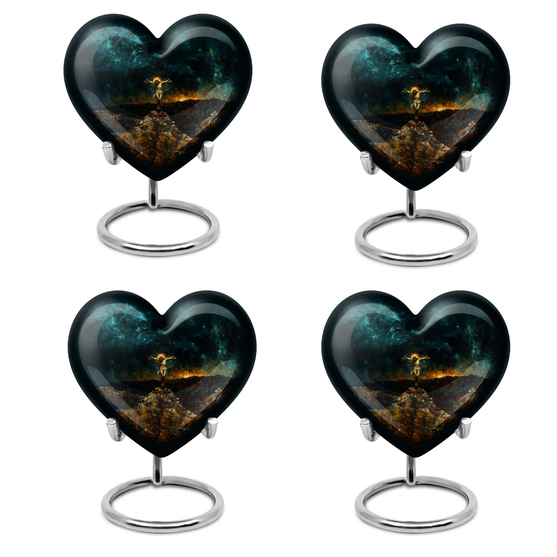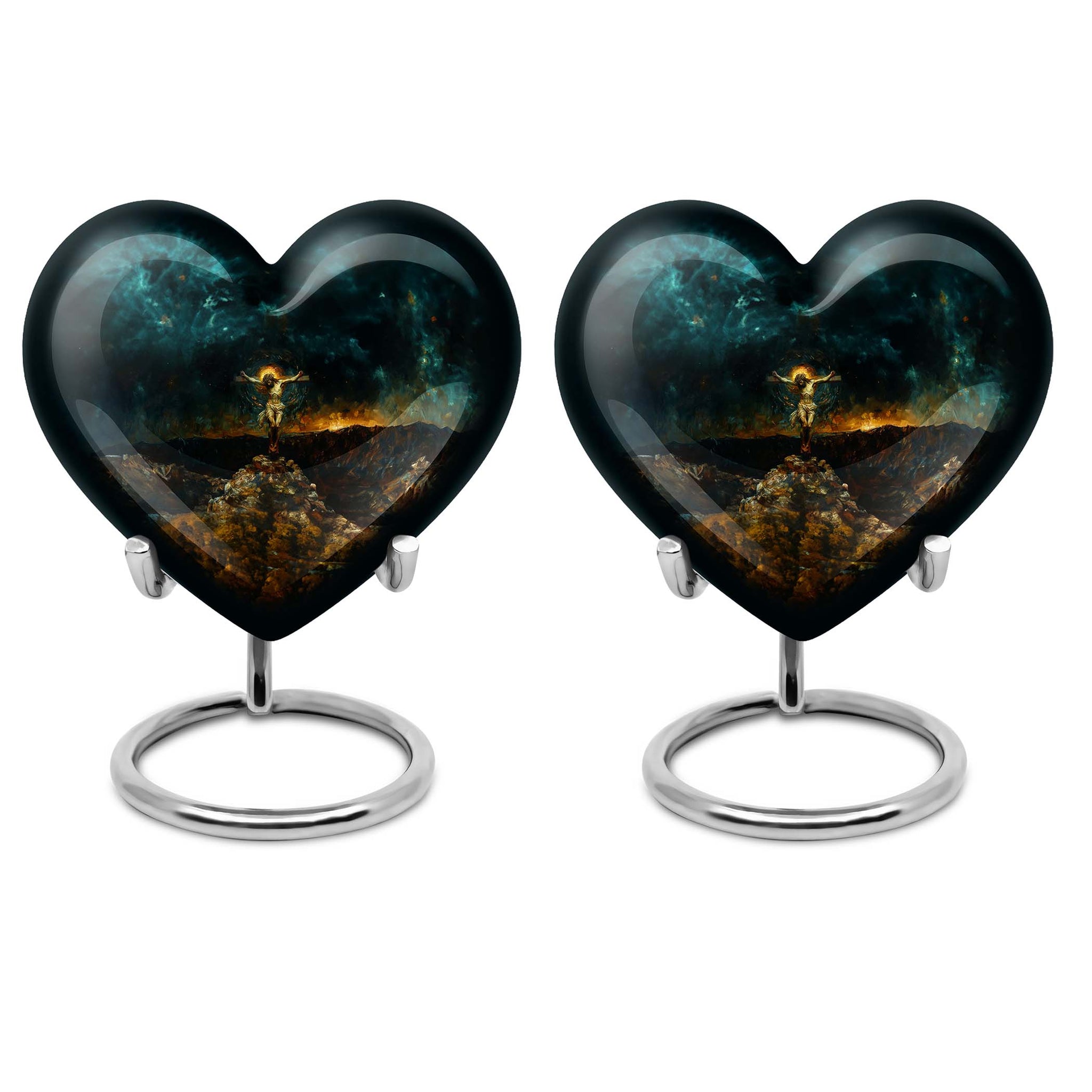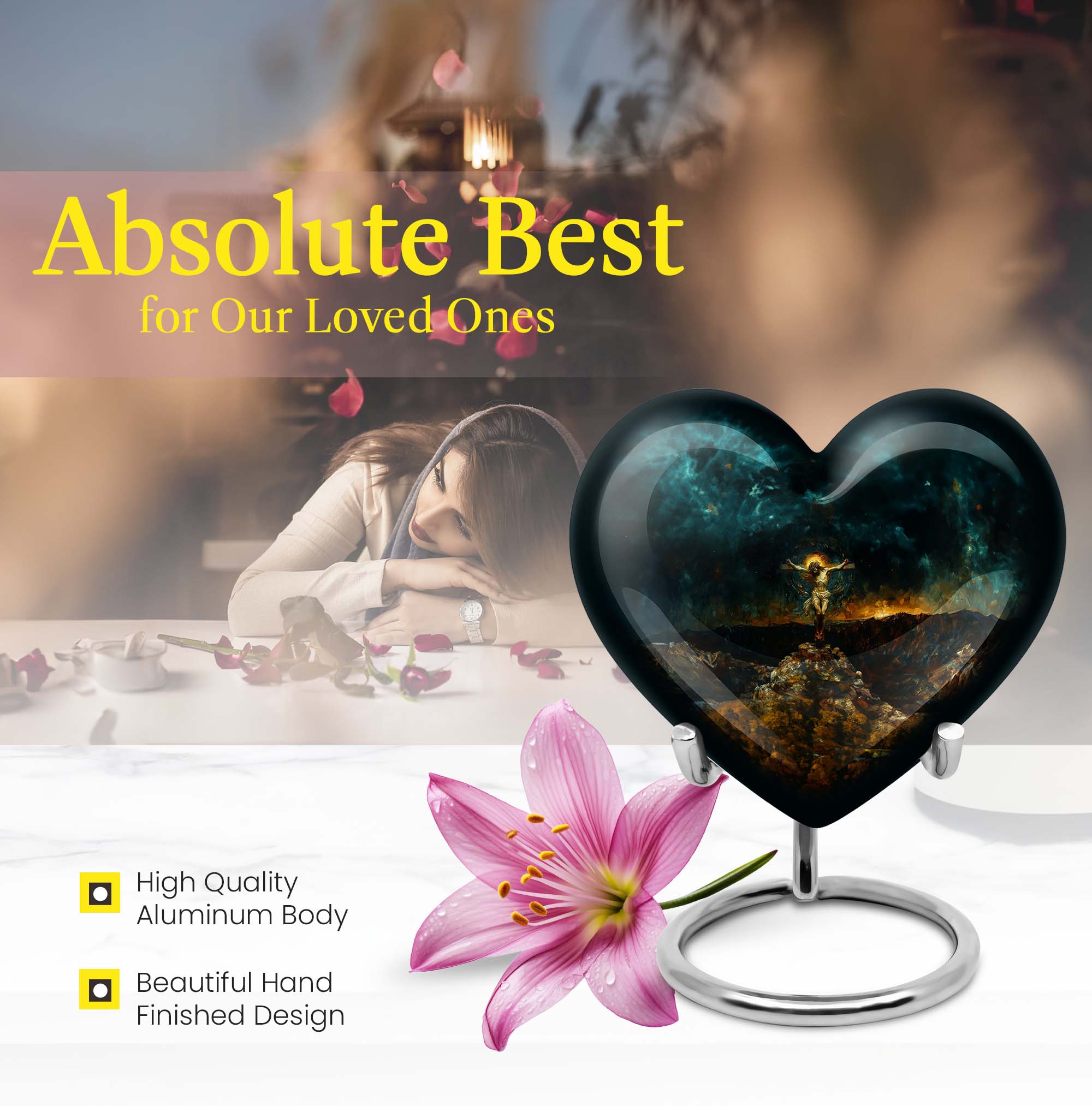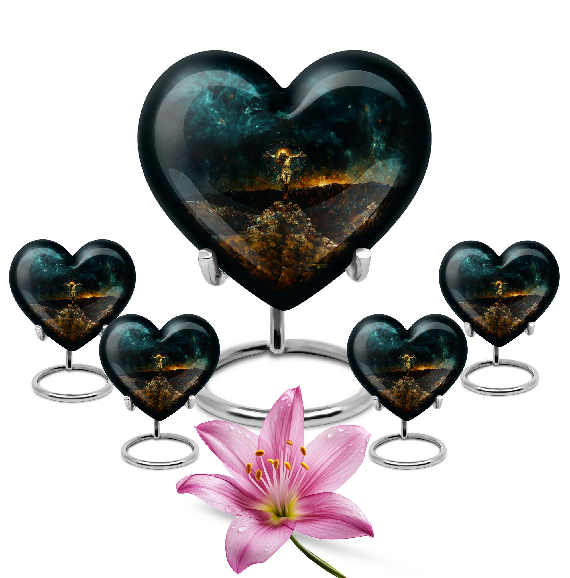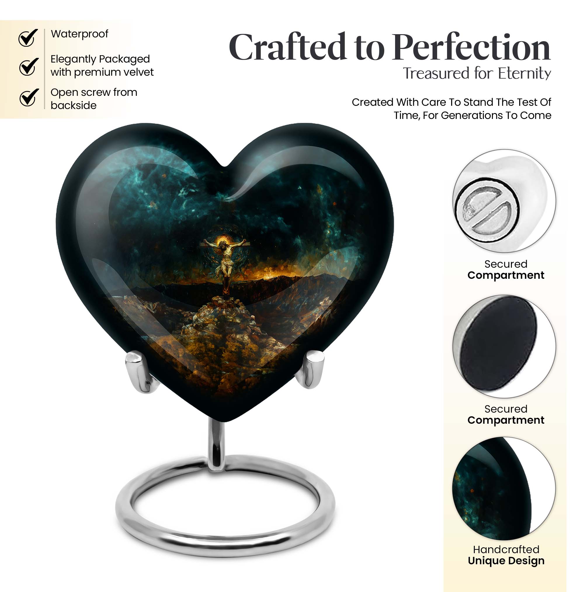 Experience a spiritual remembrance and reconnect with your lost loved ones with our 10-inch aluminium Jesus Urn. Weighing a sturdy 3.3 pounds and boasting a spacious capacity of 200 cubic inches, this large urn is designed to securely hold cremation ashes. Our abstract-themed heart-shaped urn brings a sense of serenity and peace, offering a beautiful commemorative symbol for your dearly departed. The package includes a velvet pouch for safeguarding the ashes, adding an extra layer of protection and reverence. Moreover, to bring a sense of personal connection, you can personalize this burial ash urn with engraved names, creating a unique remembrance. Beyond its practical use, our cremation urn serves as a touching tribute to your loved ones, ensuring their memory lives on. With the phrase 'cremation urn' and keywords such as 'Jesus Urn', 'burial ash urns for humans' and 'cremation urns for adult ashes men' expected to be popular amongst consumers, our product stands as a masterful blend of devotion and commemorative artistry.