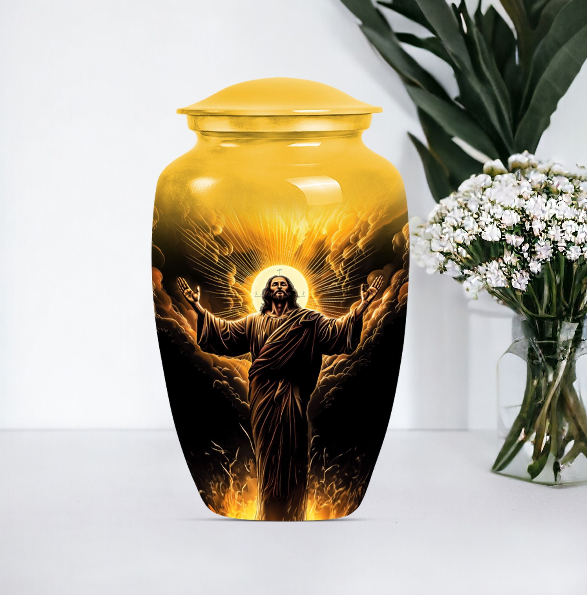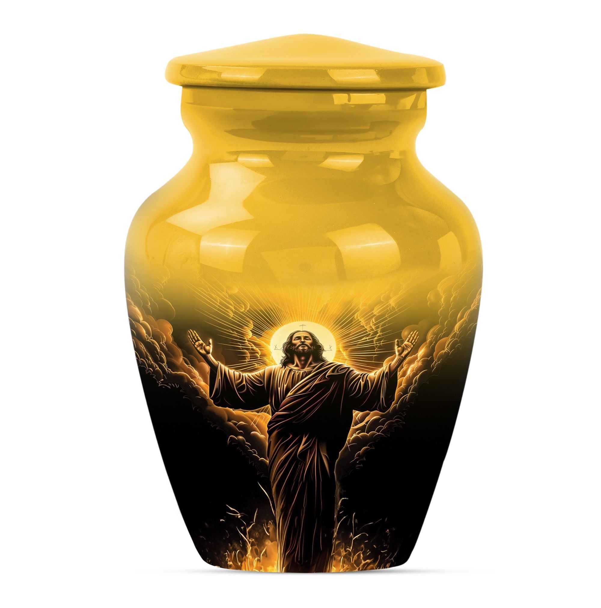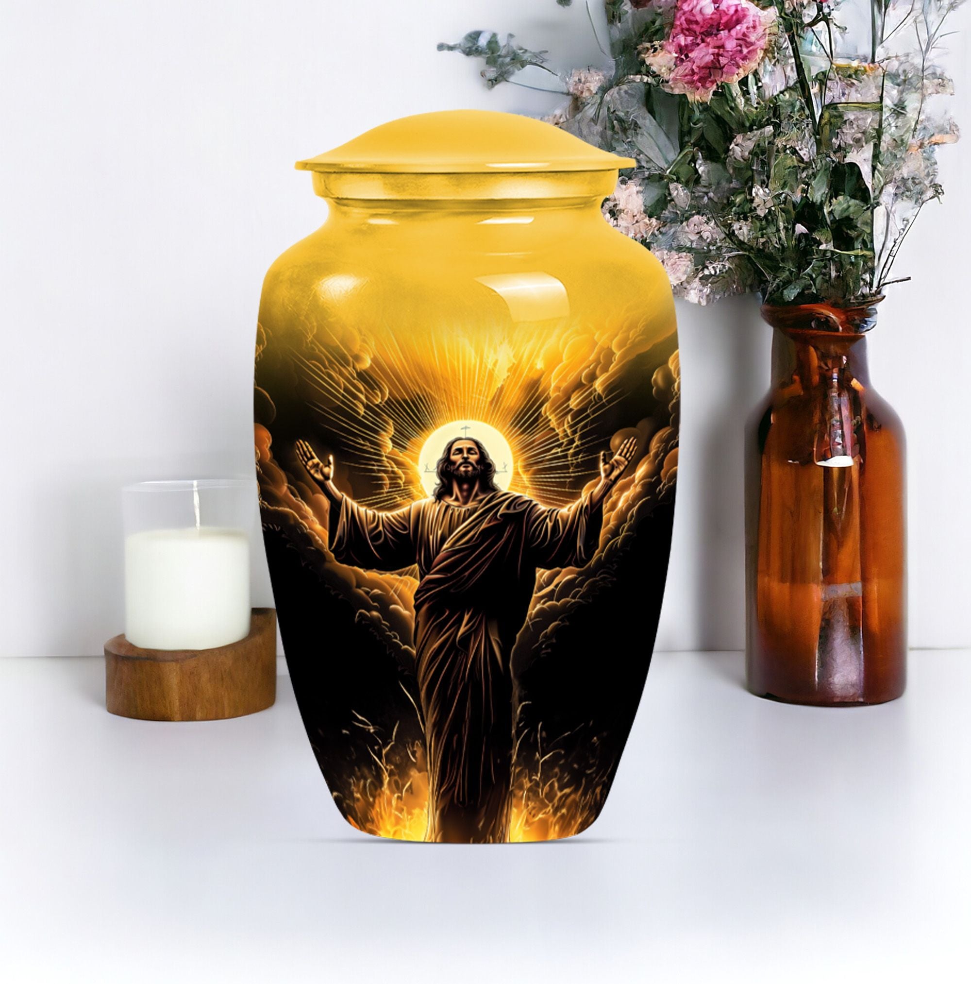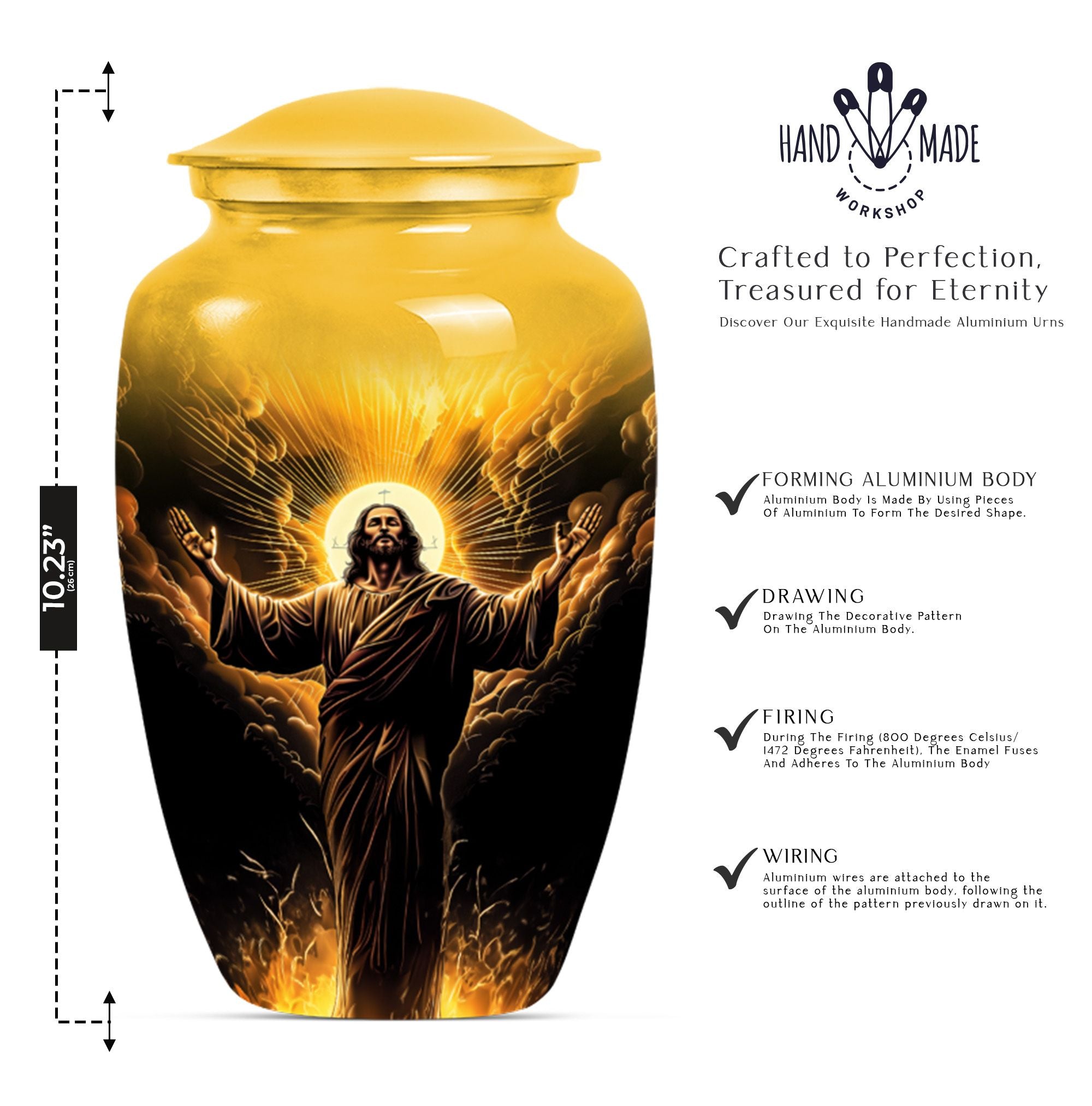 Embrace a timeless tribute with this 10-inch Jesus Urn, crafted with impeccable detail and profound respect for your loved one's memory. This funeral medium sized urn offers the strength and longevity of aluminium, promising a reliable sanctuary for human ashes. Within a comforting weight of 3.3 pounds, it proffers ample capacity of 200 cubic inches, making it a perfect choice for retaining an adult's ash post cremation process. The Abstract theme imbues it with an understated elegance not commonly seen in large urns. Each purchase is accompanied with a velvet pouch for respectful containment of ashes, showcasing a thoughtful approach to such delicate matters. Offering an optional personal touch, you can further honor your cherished ones by personalizing this cremation urn with engraved names. By incorporating a 'memorial medium urn' or 'urn human ash adult ash', this product adapts to an array of funeral requirements with ease. Our Jesus Urn does not just preserve the physical remains but also the countless memories and emotions intertwined with them.