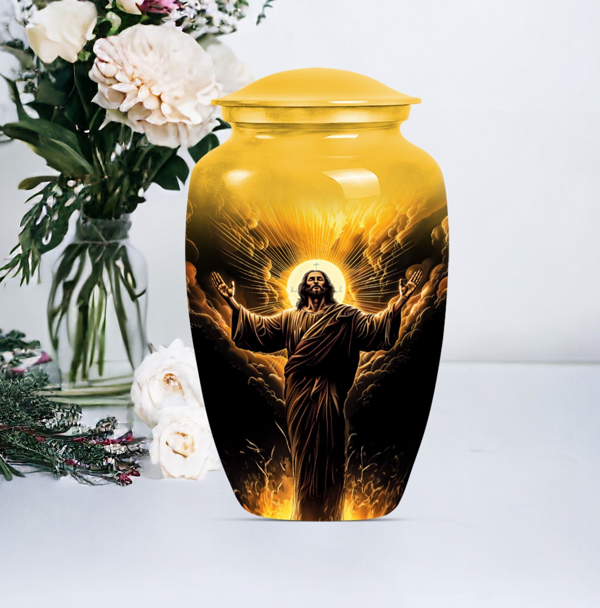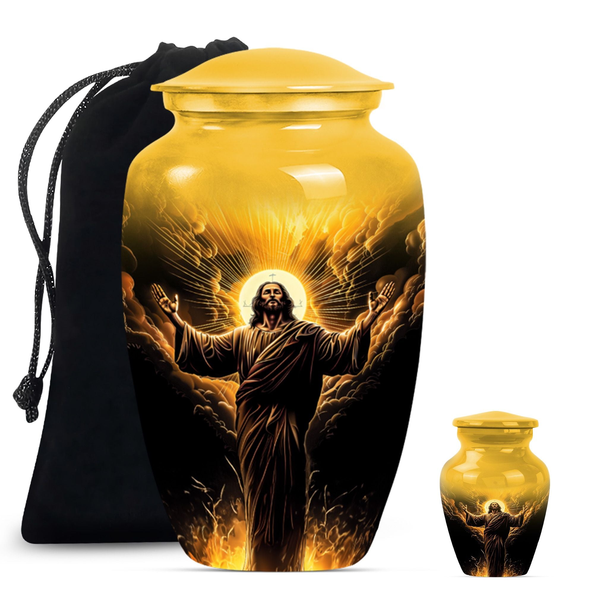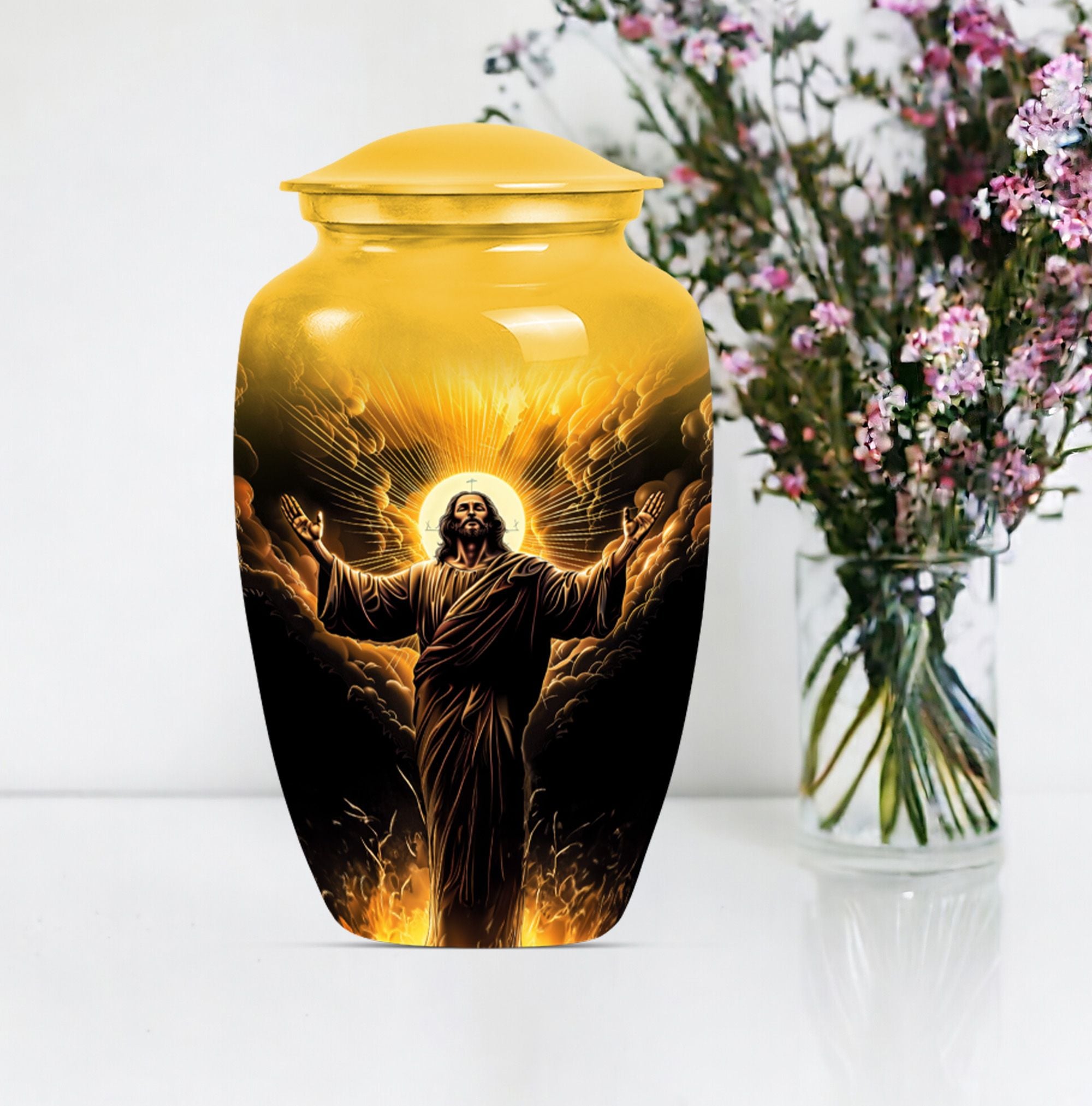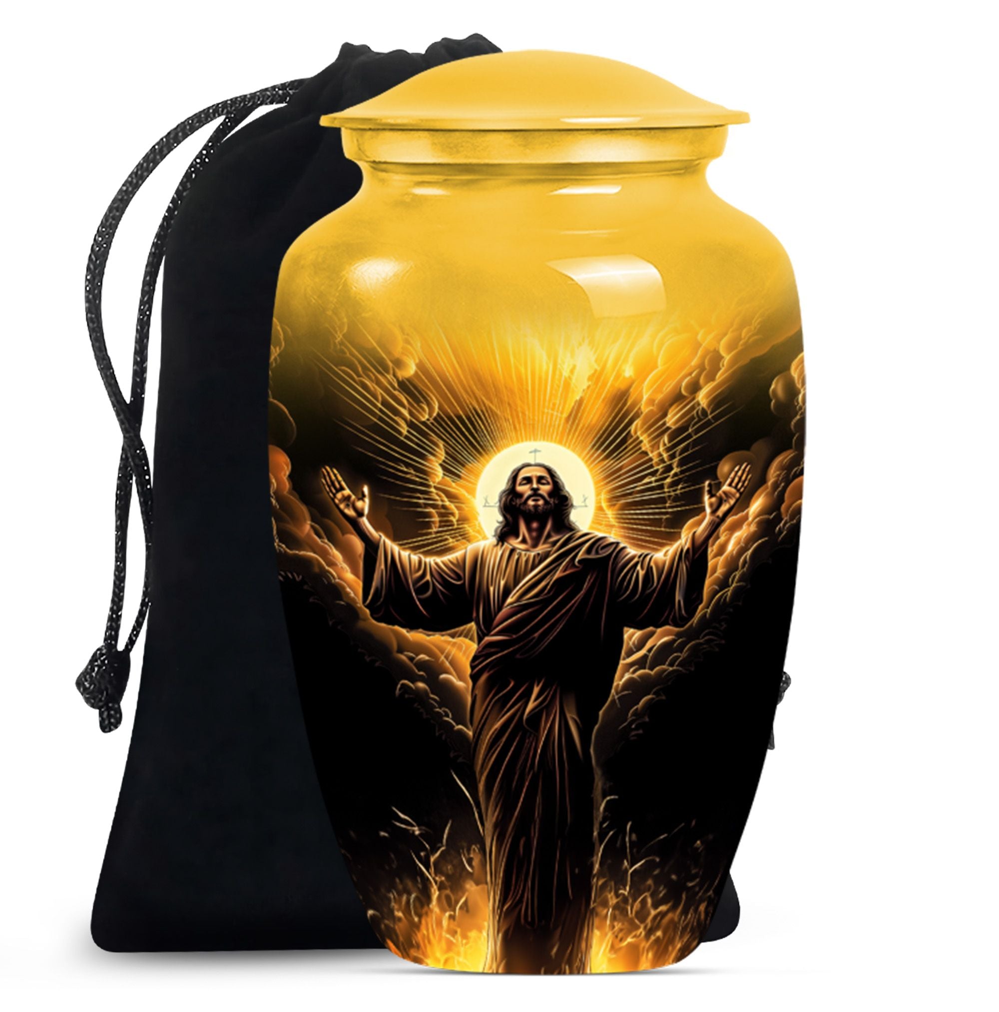 Embrace a timeless tribute with this 10-inch Jesus Urn, crafted with impeccable detail and profound respect for your loved one's memory. This funeral medium sized urn offers the strength and longevity of aluminium, promising a reliable sanctuary for human ashes. Within a comforting weight of 3.3 pounds, it proffers ample capacity of 200 cubic inches, making it a perfect choice for retaining an adult's ash post cremation process. The Abstract theme imbues it with an understated elegance not commonly seen in large urns. Each purchase is accompanied with a velvet pouch for respectful containment of ashes, showcasing a thoughtful approach to such delicate matters. Offering an optional personal touch, you can further honor your cherished ones by personalizing this cremation urn with engraved names. By incorporating a 'memorial medium urn' or 'urn human ash adult ash', this product adapts to an array of funeral requirements with ease. Our Jesus Urn does not just preserve the physical remains but also the countless memories and emotions intertwined with them.