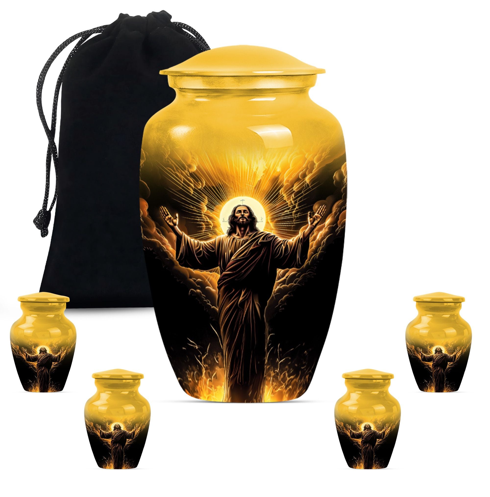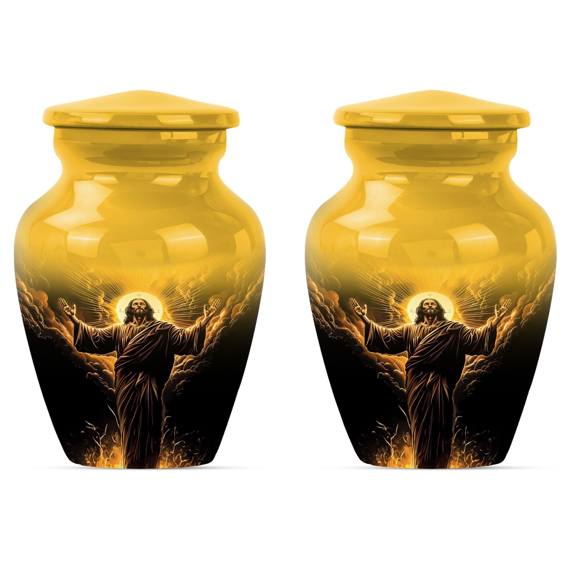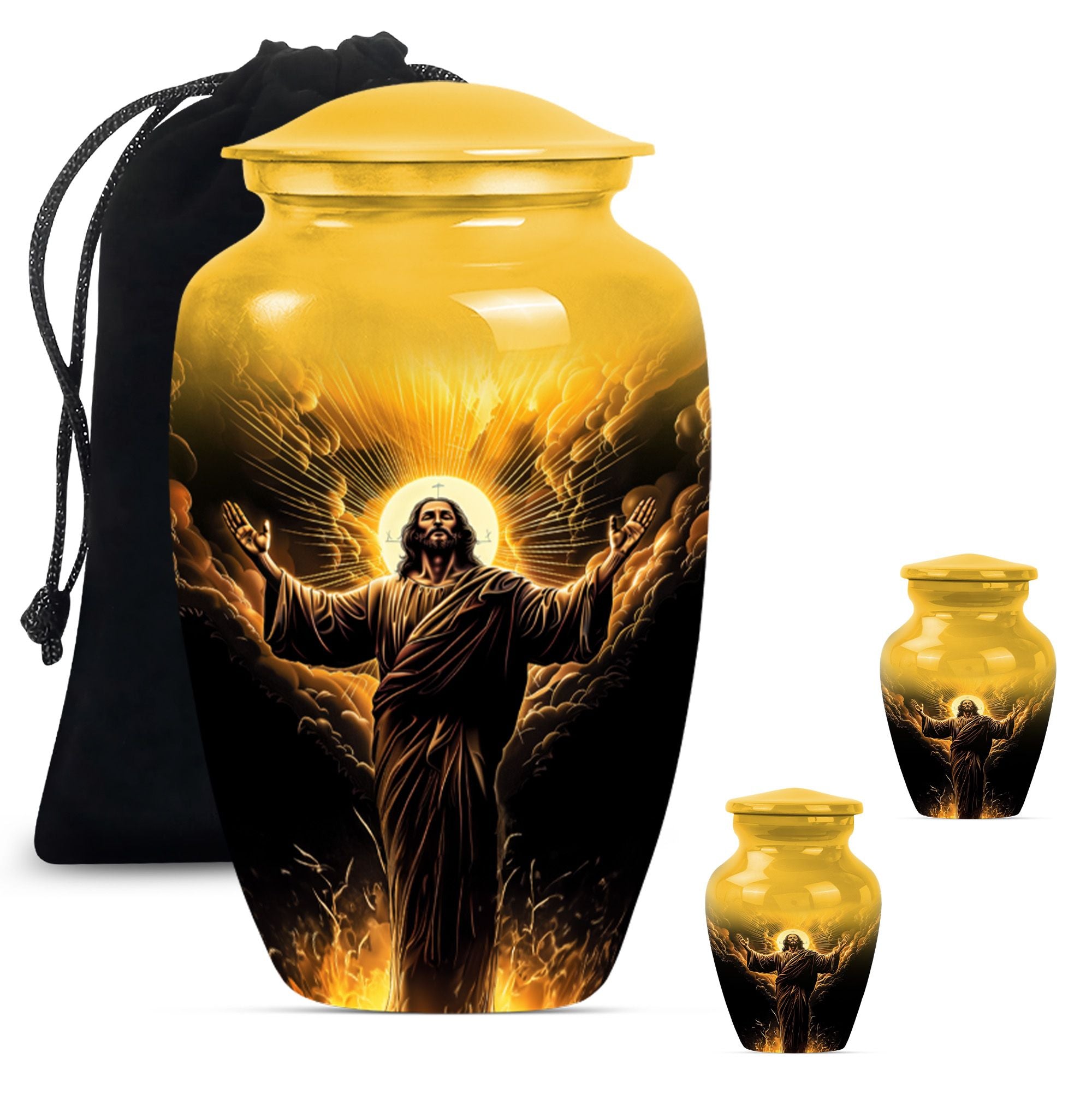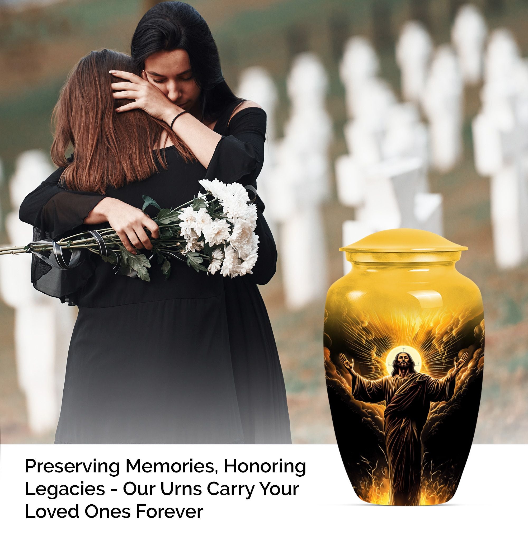 Embrace a timeless tribute with this 10-inch Jesus Urn, crafted with impeccable detail and profound respect for your loved one's memory. This funeral medium sized urn offers the strength and longevity of aluminium, promising a reliable sanctuary for human ashes. Within a comforting weight of 3.3 pounds, it proffers ample capacity of 200 cubic inches, making it a perfect choice for retaining an adult's ash post cremation process. The Abstract theme imbues it with an understated elegance not commonly seen in large urns. Each purchase is accompanied with a velvet pouch for respectful containment of ashes, showcasing a thoughtful approach to such delicate matters. Offering an optional personal touch, you can further honor your cherished ones by personalizing this cremation urn with engraved names. By incorporating a 'memorial medium urn' or 'urn human ash adult ash', this product adapts to an array of funeral requirements with ease. Our Jesus Urn does not just preserve the physical remains but also the countless memories and emotions intertwined with them.