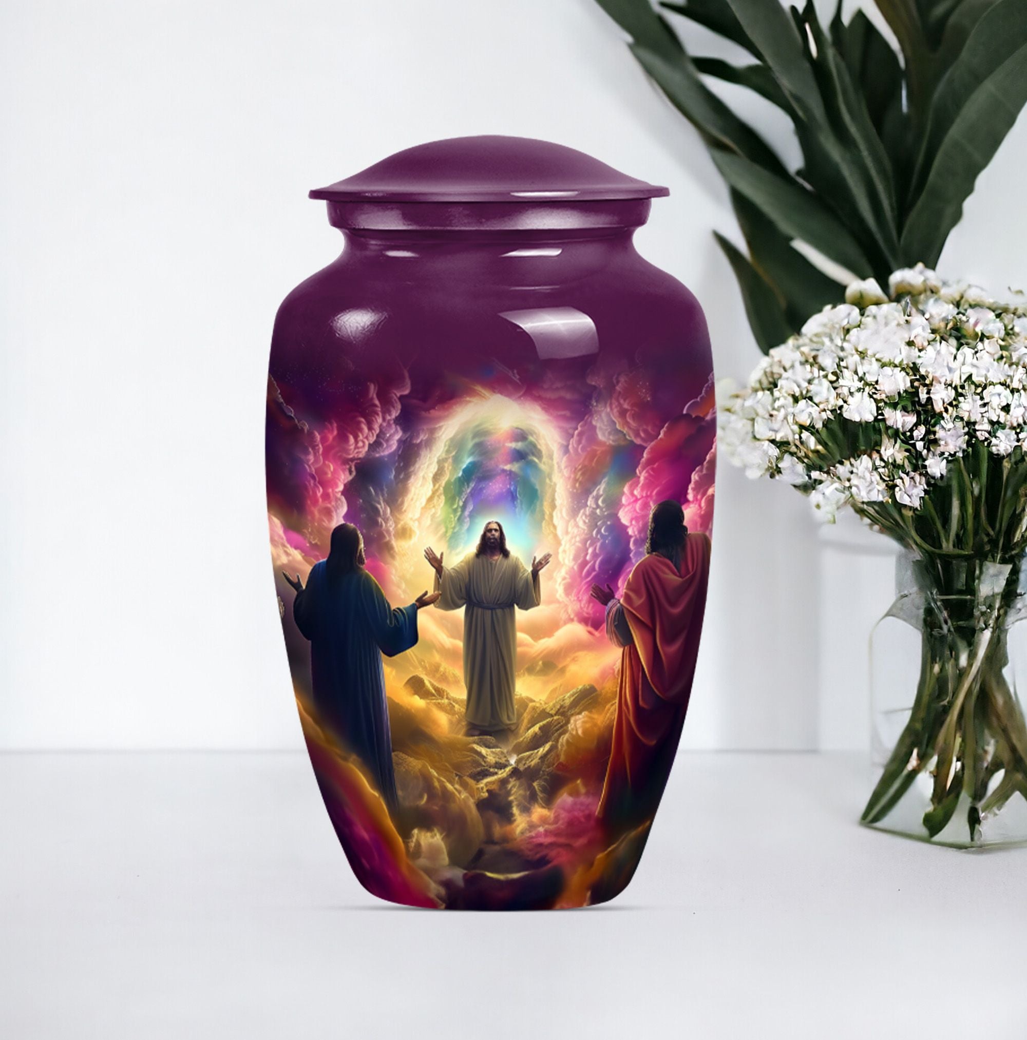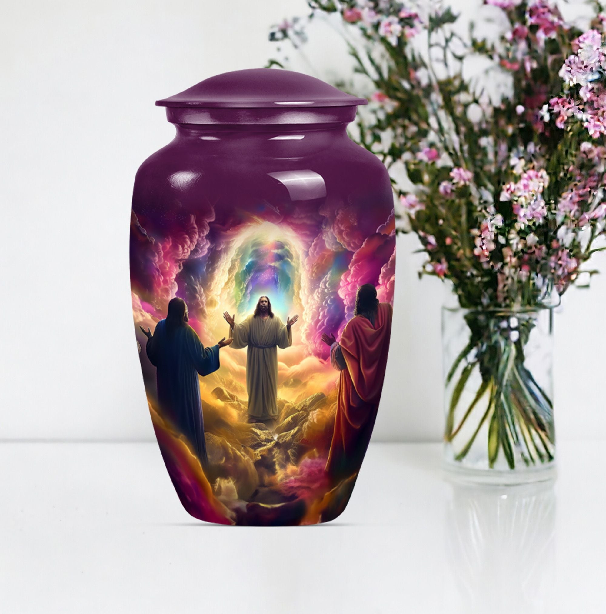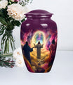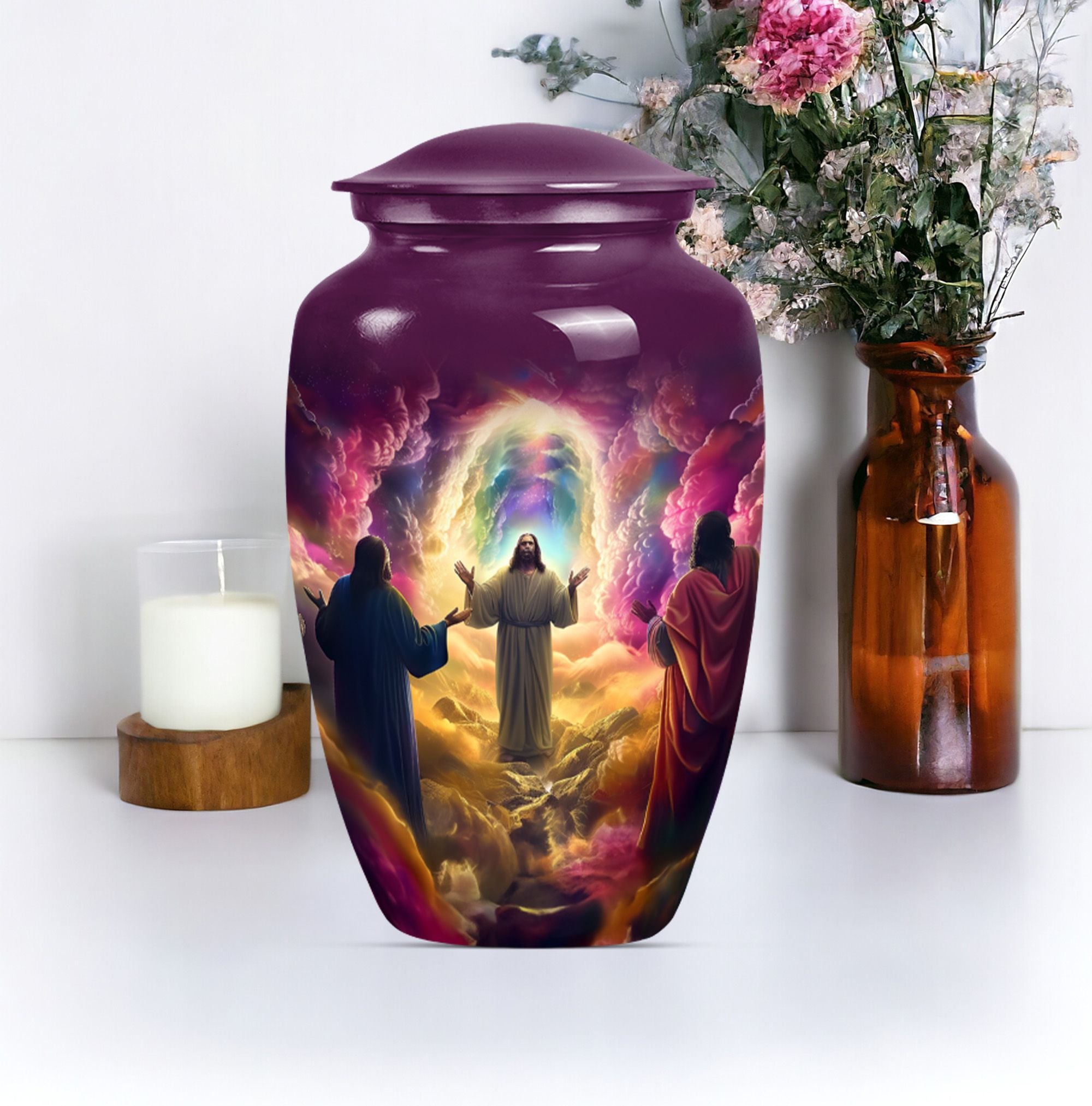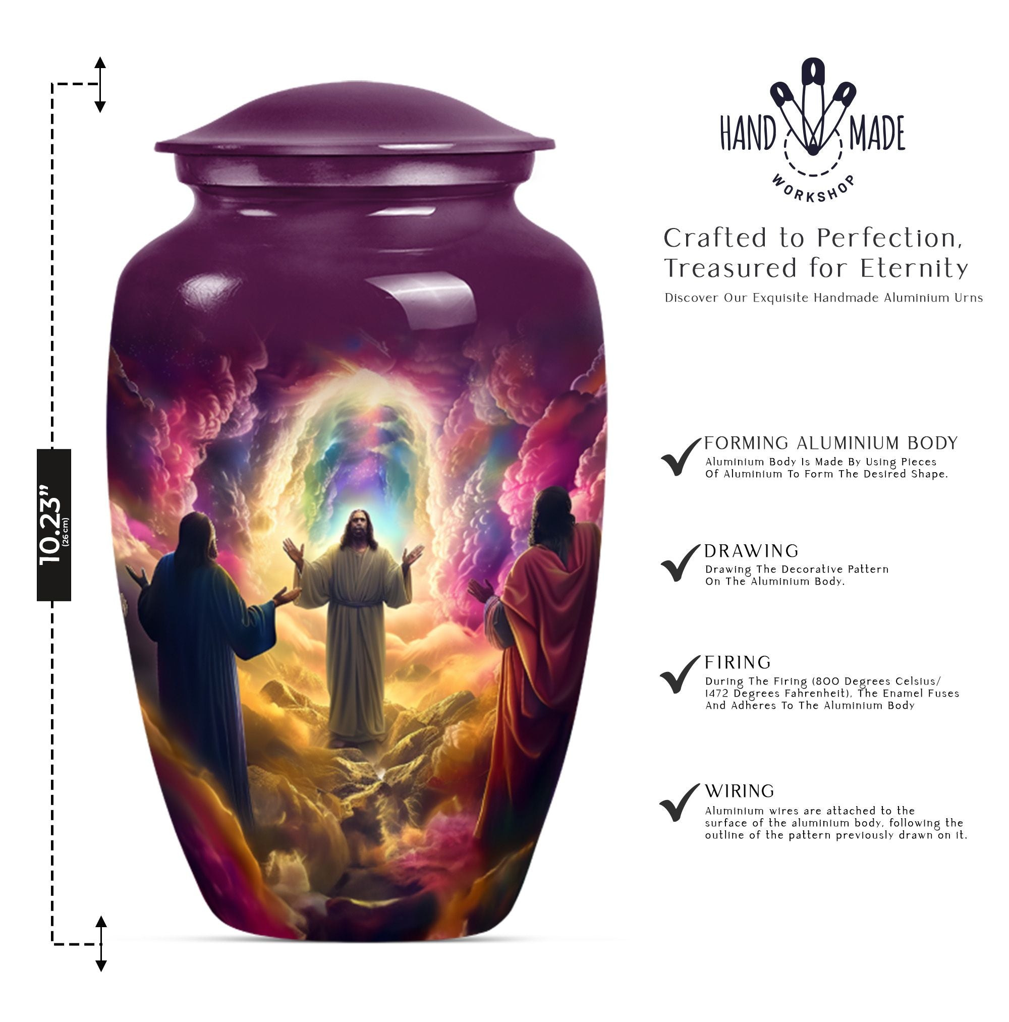 This 10 Inch Jesus Urn is a profound and meaningful piece to pay respect to a beloved departed. Built from high-grade aluminium, the large urn is sturdy and weighs a mere 3.3 pounds, making it manageable yet resilient. Its abstract theme lends it a unique appeal; an understated, non-traditional charm, dear to the sensibilities of many. This cremation urn can hold up to 200 cubic inches of ashes, and comes with a velvet pouch for containment and respectful handling of the remains. Being one of the select cremation funeral urns offering personalization, it allows engraving names to make the urn exclusive to your loved one. No two goodbyes are the same, and this urn appreciates that. This product is aptly poised in the memorial urns category assuring quality and thoughtfulness that elevates your memorium. Whether you're looking for funeral decorative urns or just an urn for ashes, this product rises to the occasion as a meritorious choice.