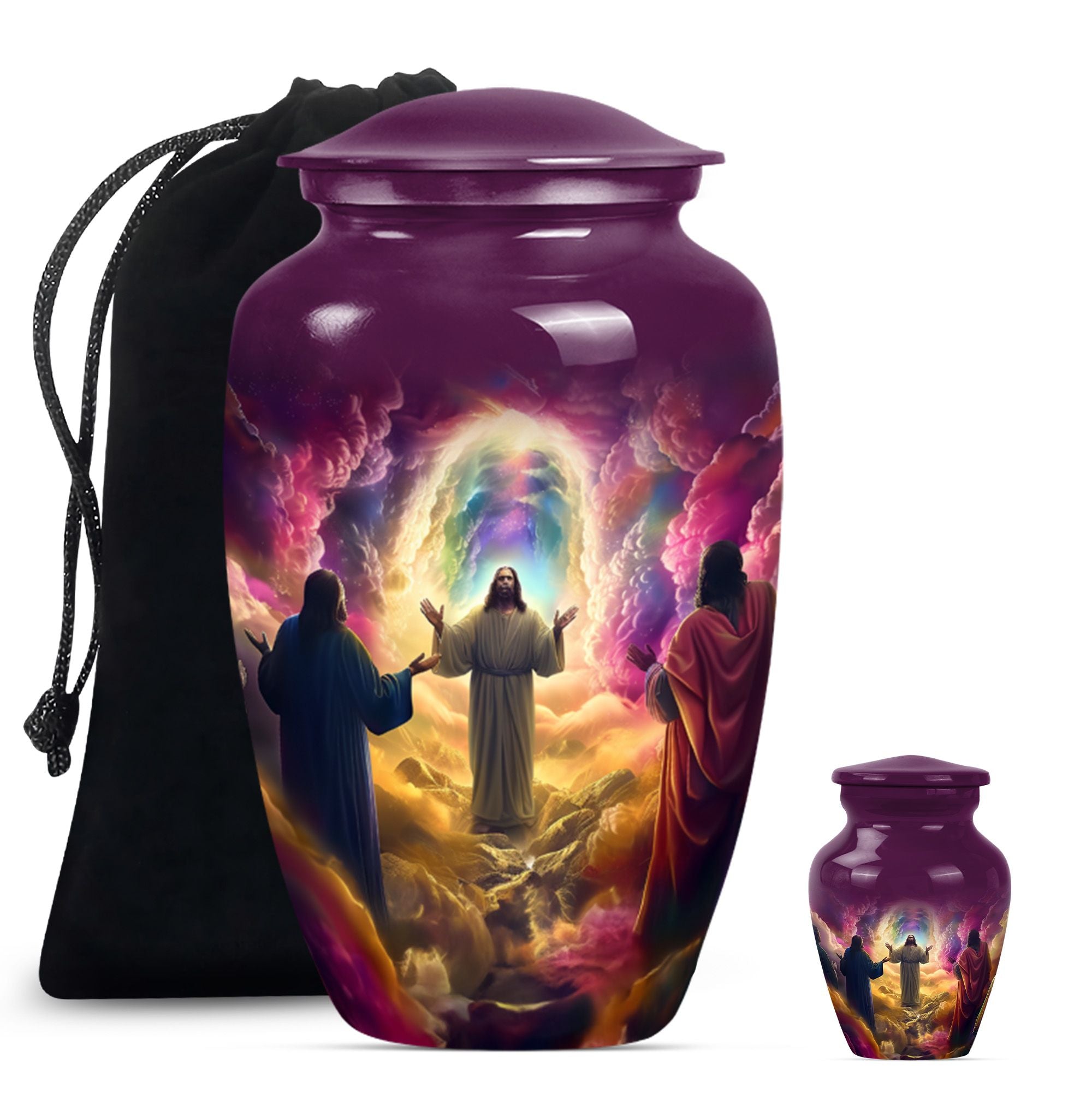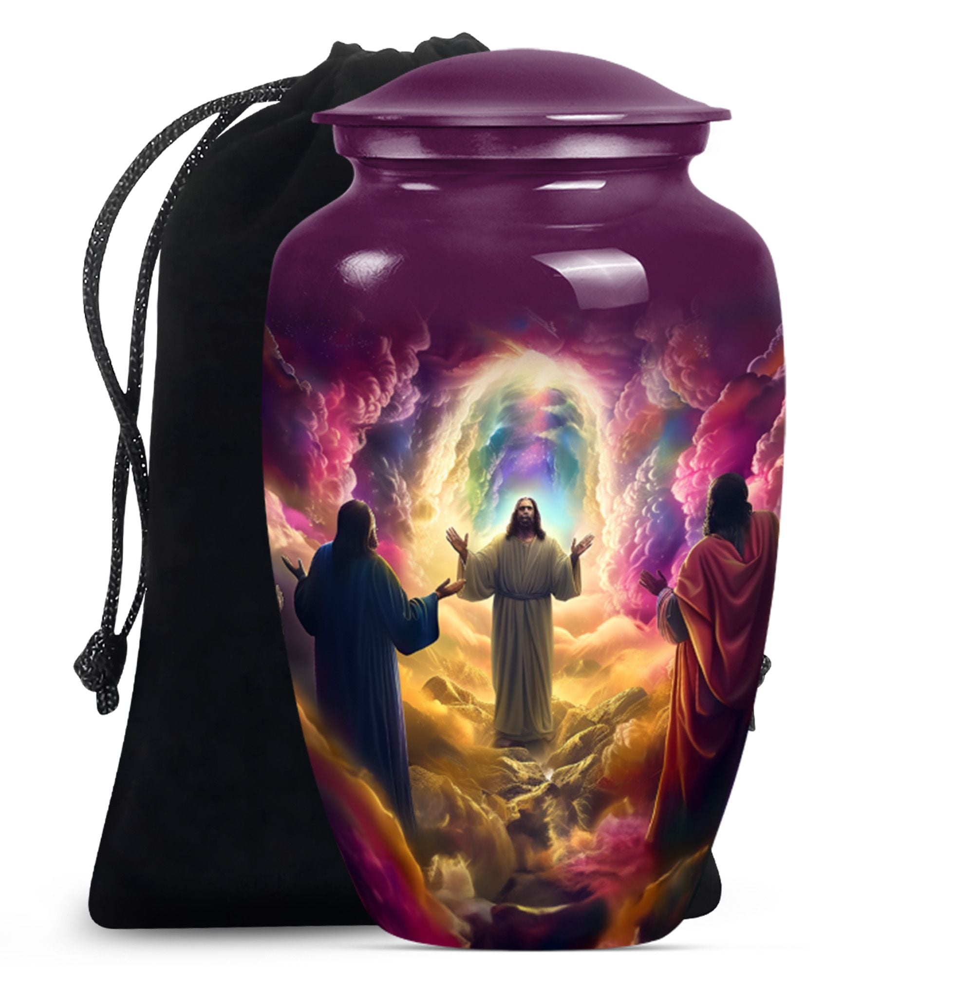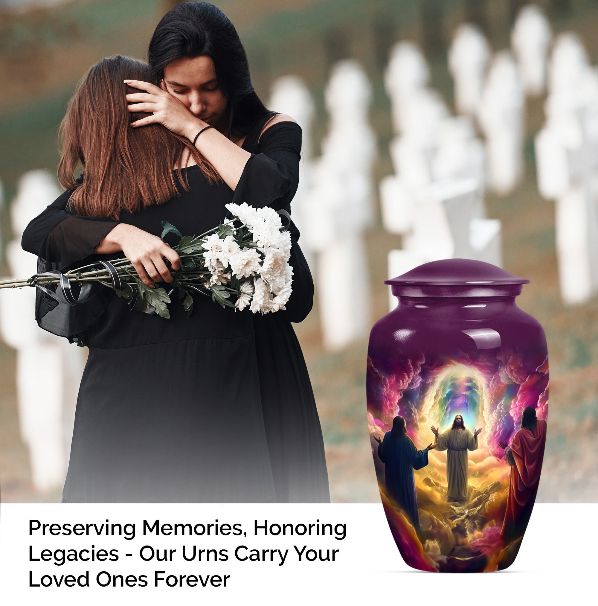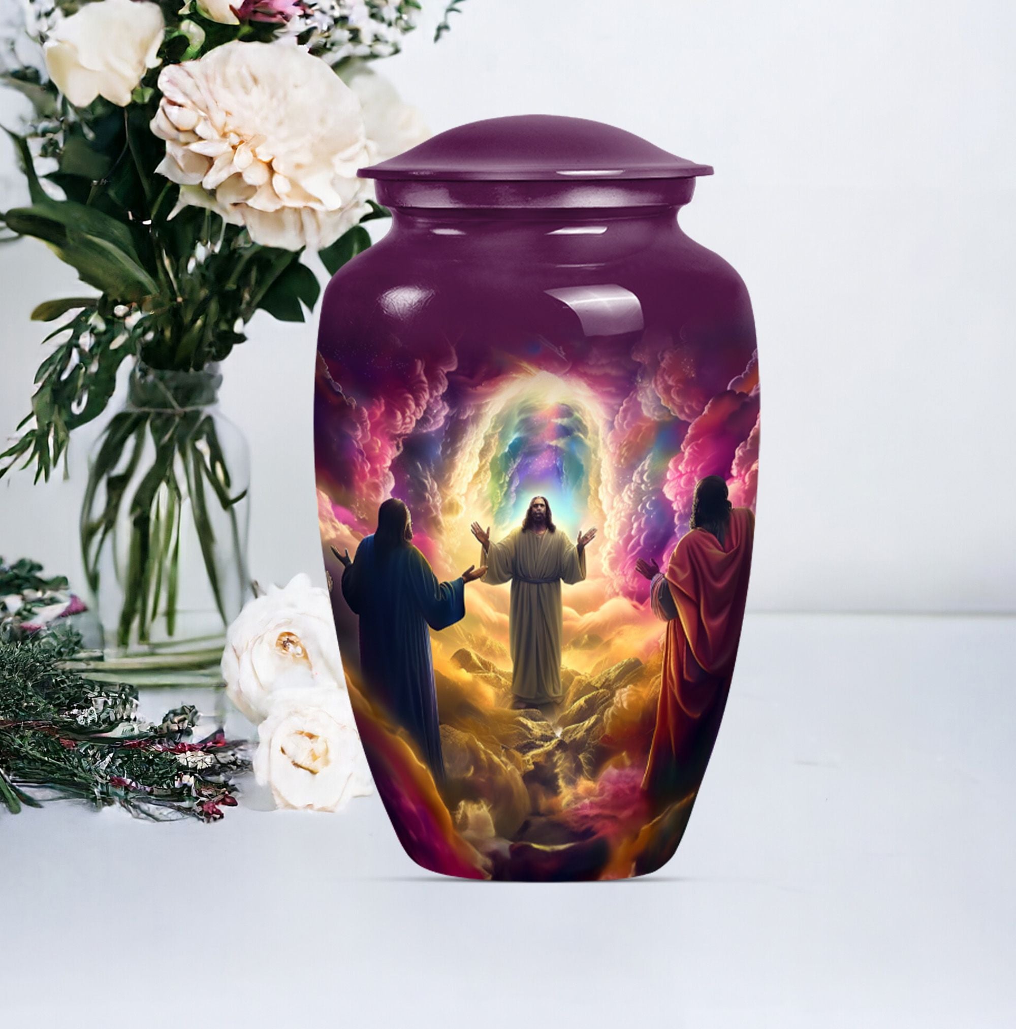 This 10 Inch Jesus Urn is a profound and meaningful piece to pay respect to a beloved departed. Built from high-grade aluminium, the large urn is sturdy and weighs a mere 3.3 pounds, making it manageable yet resilient. Its abstract theme lends it a unique appeal; an understated, non-traditional charm, dear to the sensibilities of many. This cremation urn can hold up to 200 cubic inches of ashes, and comes with a velvet pouch for containment and respectful handling of the remains. Being one of the select cremation funeral urns offering personalization, it allows engraving names to make the urn exclusive to your loved one. No two goodbyes are the same, and this urn appreciates that. This product is aptly poised in the memorial urns category assuring quality and thoughtfulness that elevates your memorium. Whether you're looking for funeral decorative urns or just an urn for ashes, this product rises to the occasion as a meritorious choice.