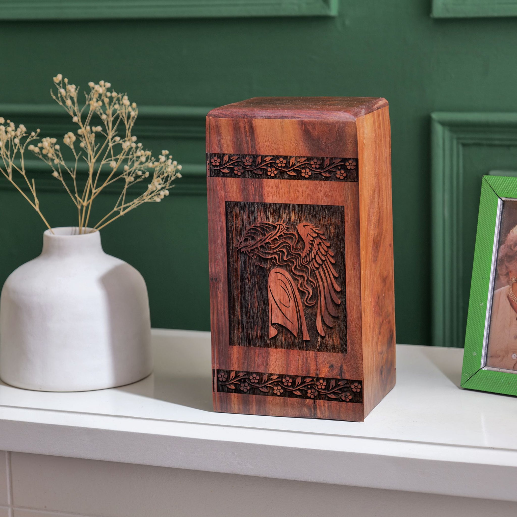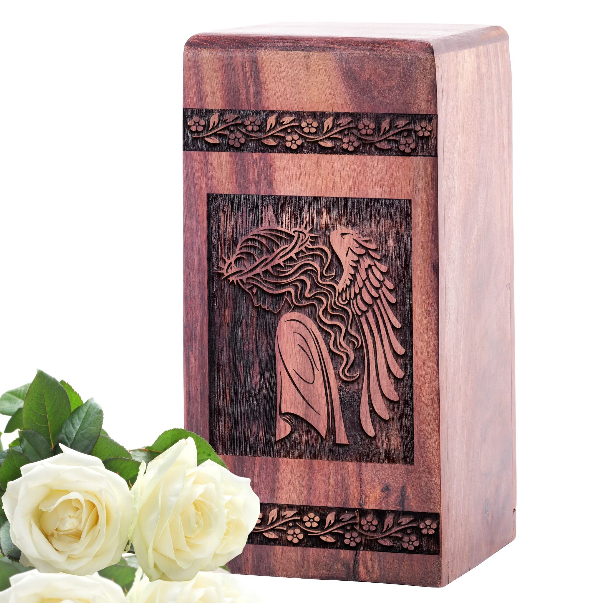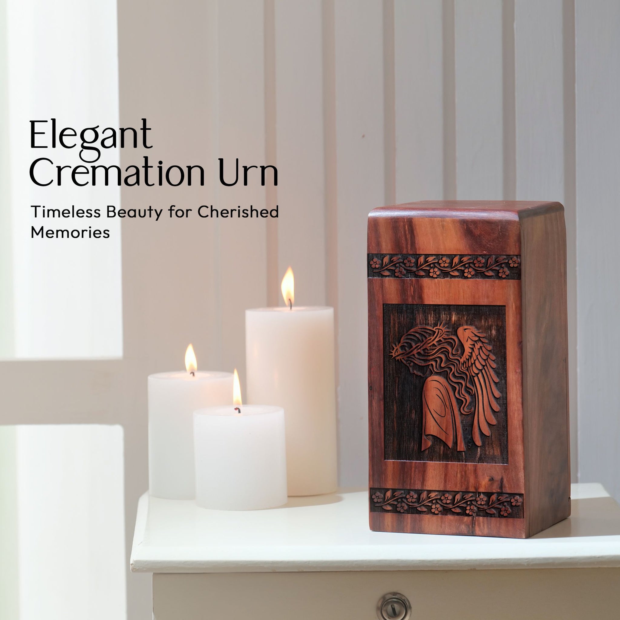 Experience the comfort and solace of spiritual connection with our Jesus urns, intricately handcrafted wooden urns designed specifically for human ashes. Ideal for adults and most especially the elderly who embrace their faith with resilience, our urns symbolize the eternal rest in the divine embrace. The exceptional workmanship in the urns offers an elegant, dignified final resting place for your loved ones. Not just urns for ashes for adult humans, these cremation containers also stand out as exquisite pieces of art elevating the ambiance of any memorial space. Highly sought after cremation companion urns, they allow couples or close friends to stay bonded together even after departure from the physical world. With the option of personalized engravings, these urns communicate a story, a celebration of life lived with faith. Our creamated ash urns reflect the refinement and tranquility associated with spiritual passage. Staying true to your beliefs, you can honor the memory of your loved ones in a serene and sacred manner. Embrace the dignity of our cremation urns – an epitome of love, faith, and lasting companionship.