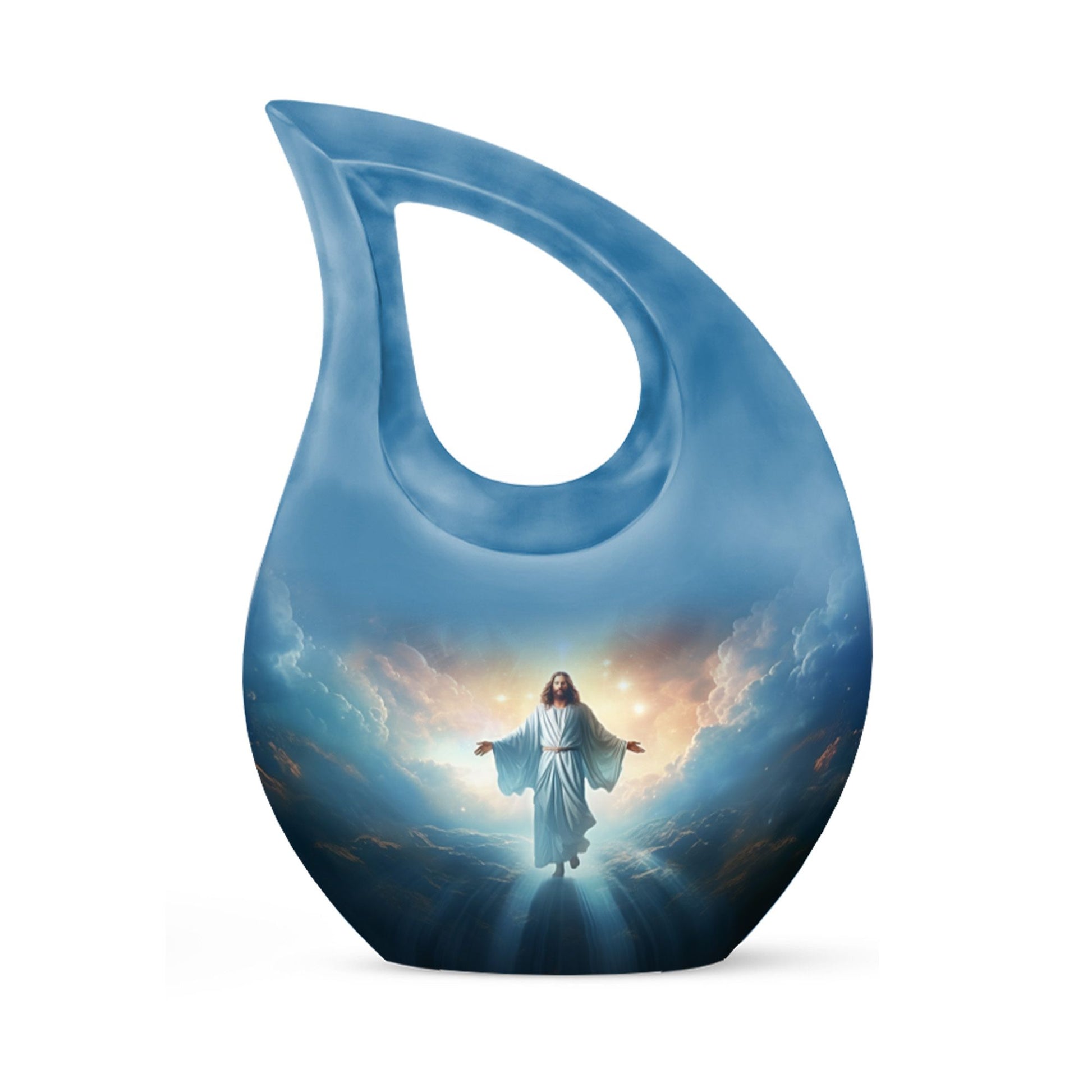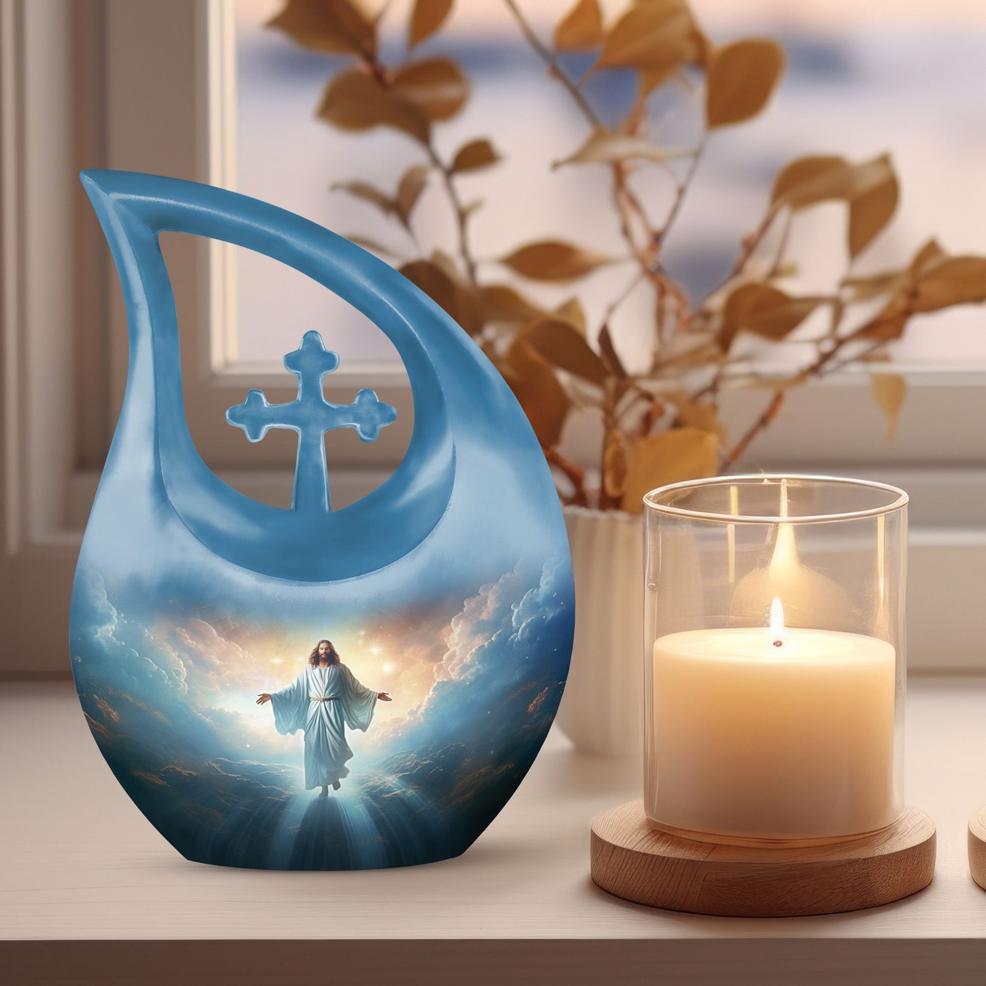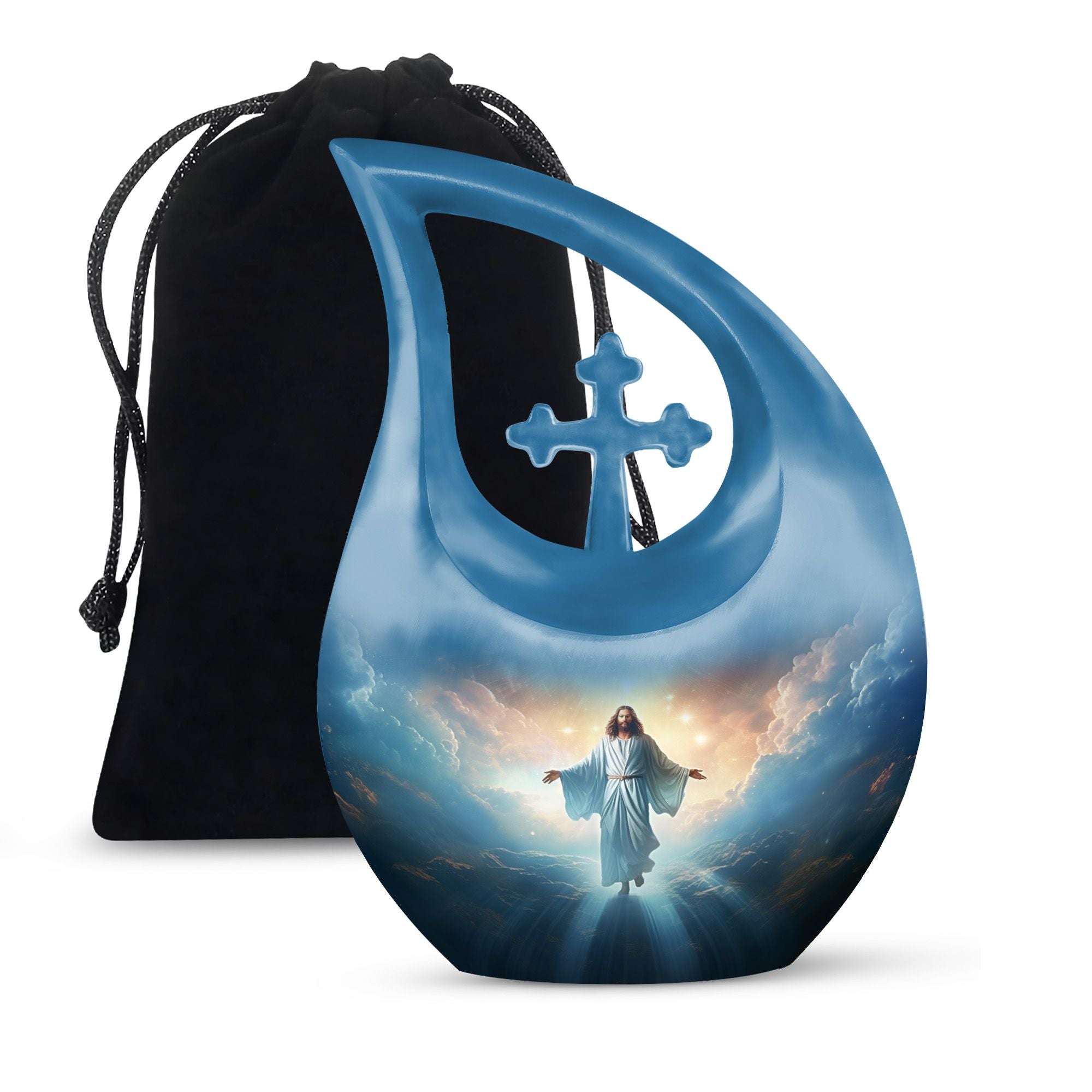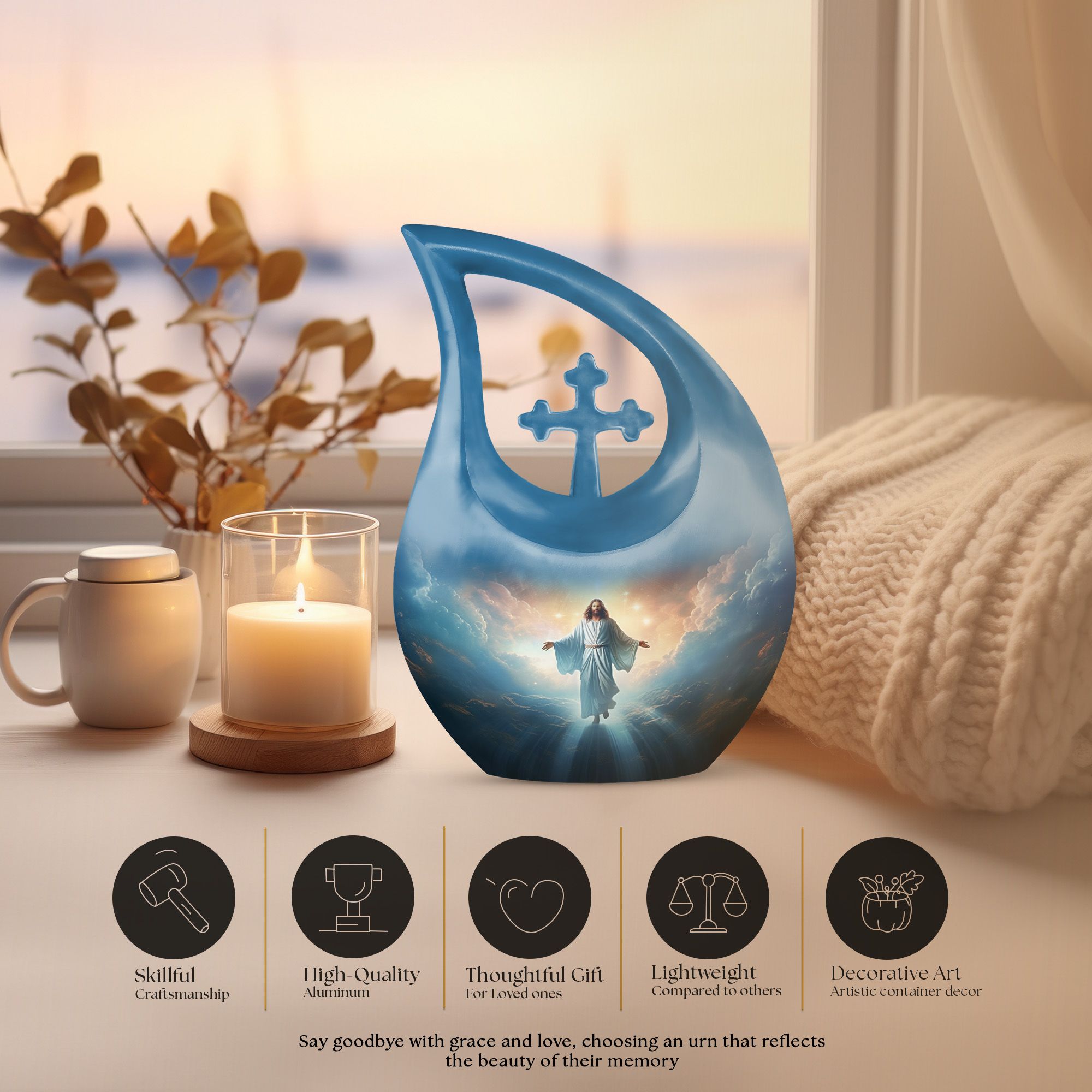 Celebrate a life of faith and devotion with the Jesus-Themed Aluminium Commemorative Urn – Blue Urn for Humans. Designed to symbolize peace, hope, and eternal love, this memorial piece is perfect for families seeking an urn for ashes for men or a meaningful tribute among funeral urns for women. The serene blue tones reflect comfort and spiritual strength during times of remembrance.
