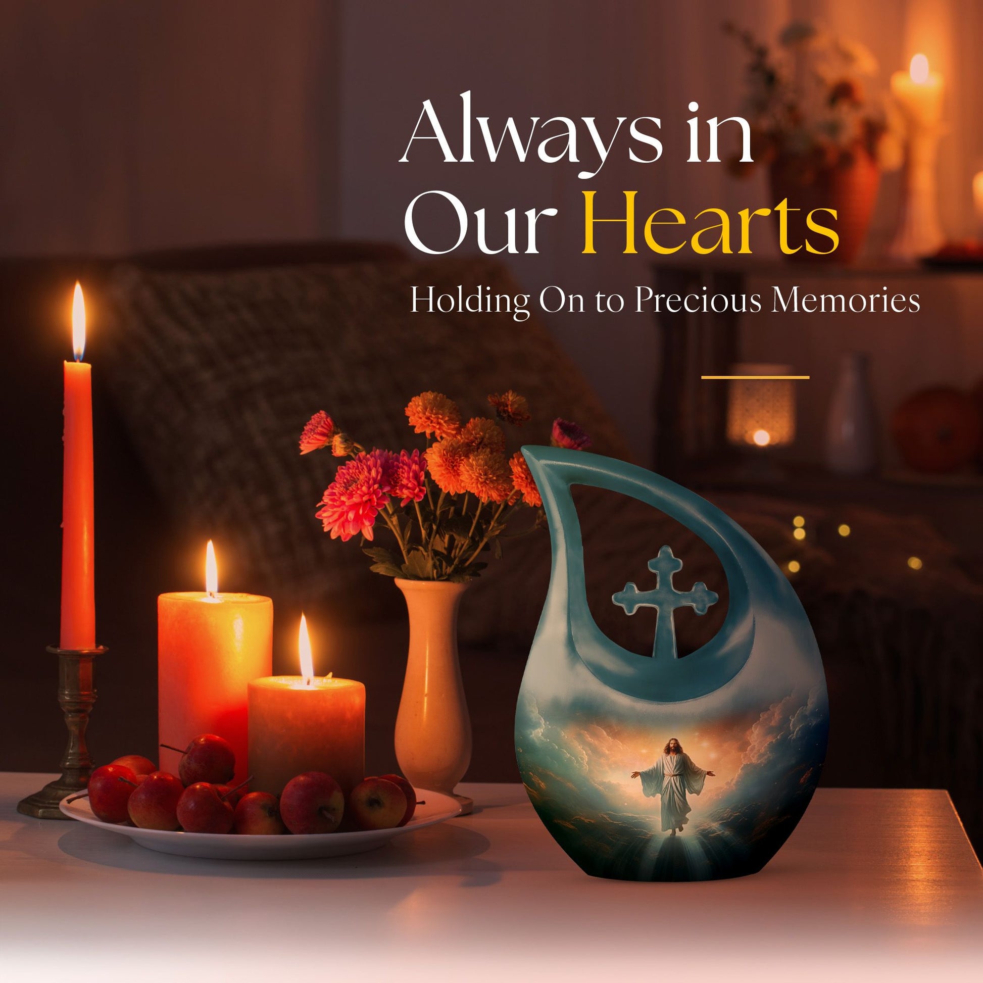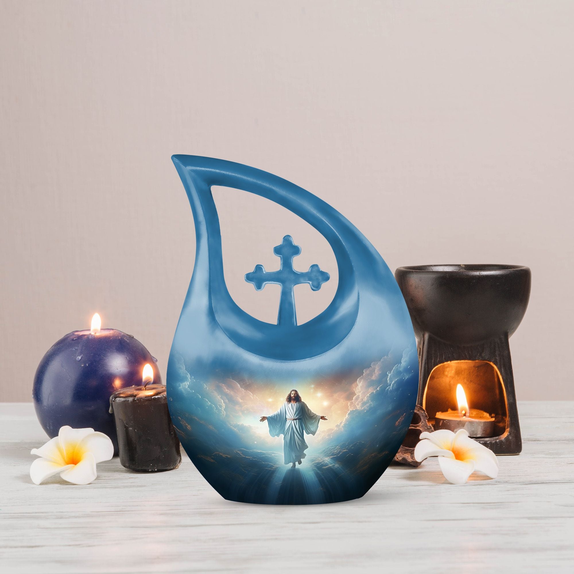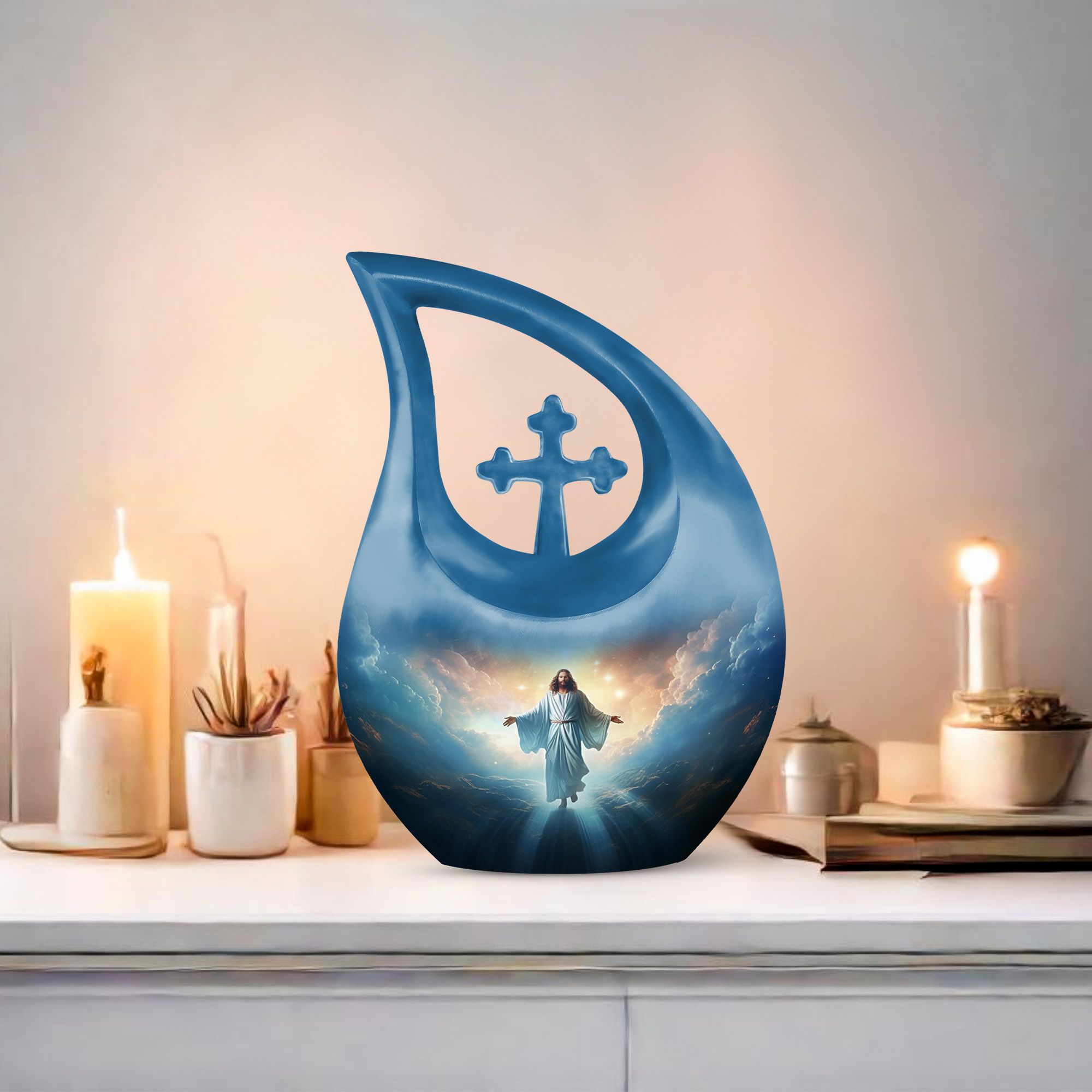 A heartfelt choice for anyone seeking a faith-inspired vessel, this urn for human ashes adult women or men brings comfort through its spiritual symbolism. The Jesus-themed design serves as a gentle reminder of eternal guidance, everlasting love, and peaceful rest.