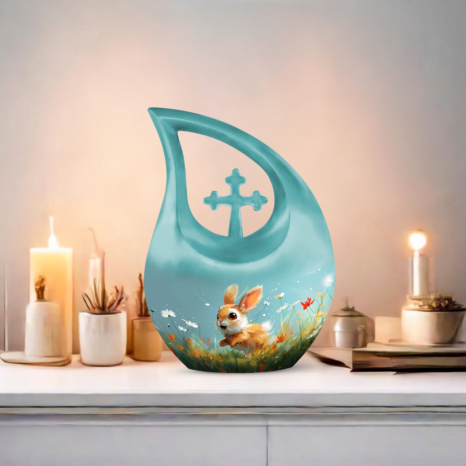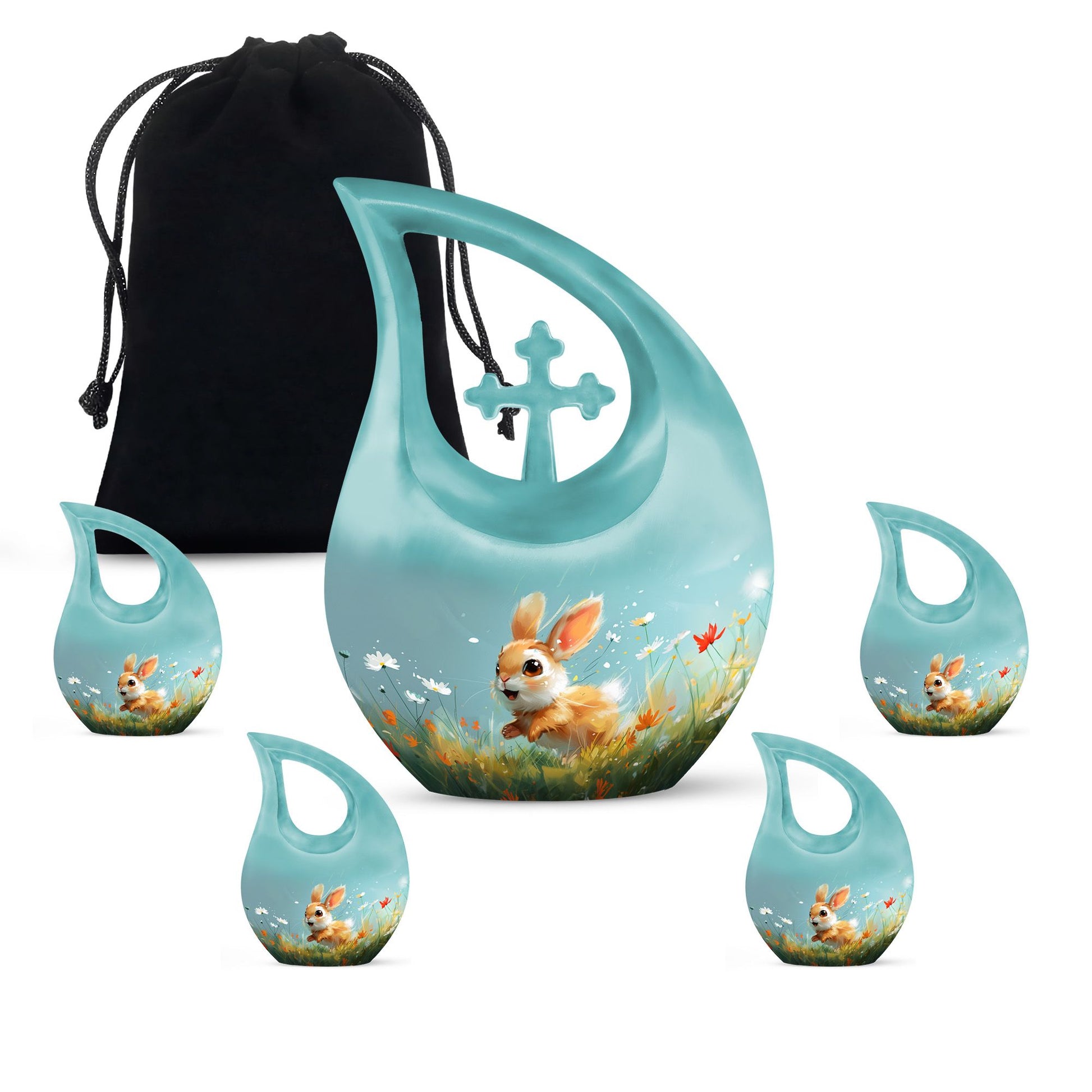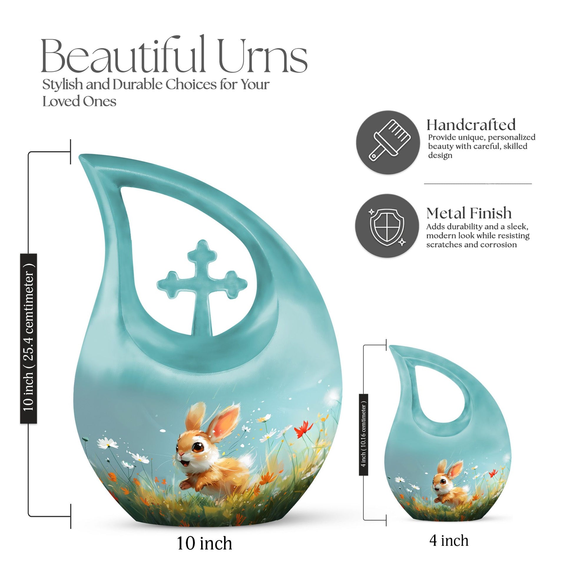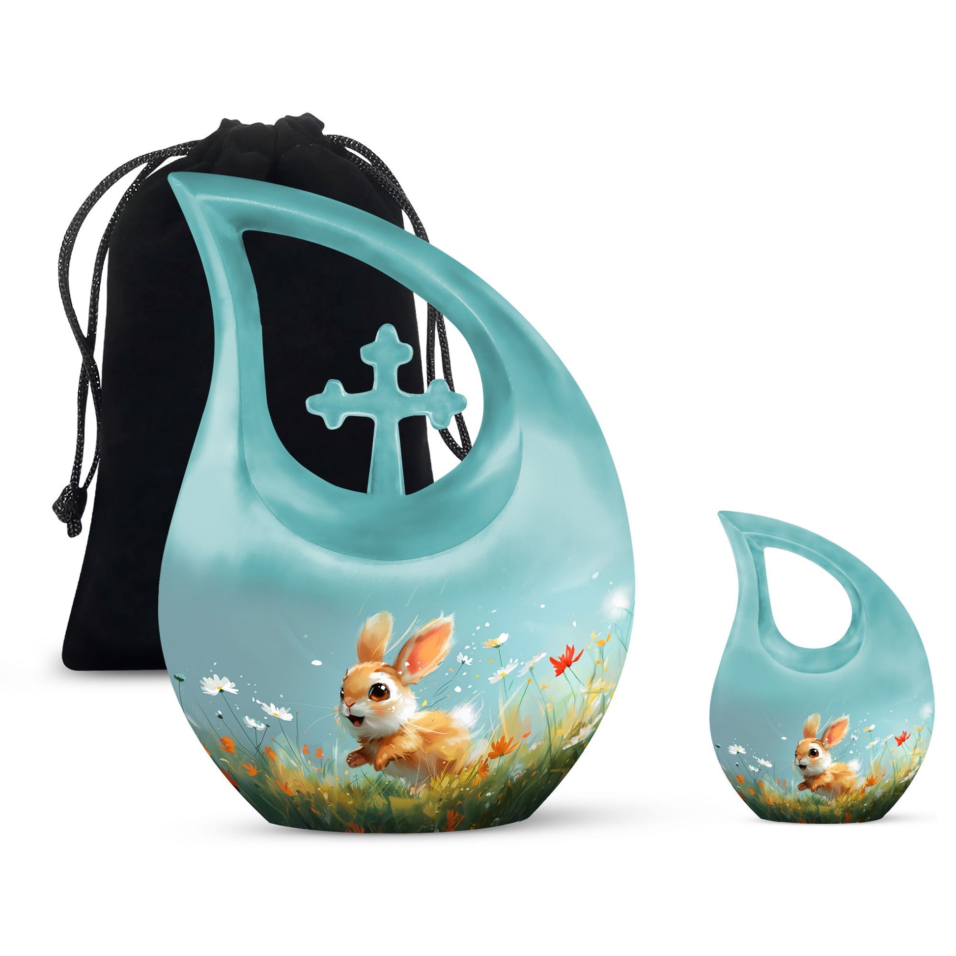 Introducing the Joyful Meadow Bunny Urn, this exquisite Large Urn, perfect for two persons and functionally designed to provide solemn respect to your loved ones. Constructed with sturdy Aluminium material, the urn measures 10 inches in height and captures the essence of tranquility with a unique Cross Drop theme. It weighs 3.3 pounds and has an ample capacity of 200 cubic inches to securely contain the ashes. Along with the urn, a velvet pouch is included for containment of the ashes, ensuring that your loved one's remains are preserved respectfully. The urn can also be personalized by engraving names, helping to eternalize the memory of the departed. Target keywords like Affordable Cremation and Burial Urn, Biodegradable Urn, Cremation Containers for Humans, and Cremation Vaults further elucidate the product's features. Ideal for individuals searching for memorial urns, this Joyful Meadow Bunny Urn is not only an expression of love but also a testament to one's existence.