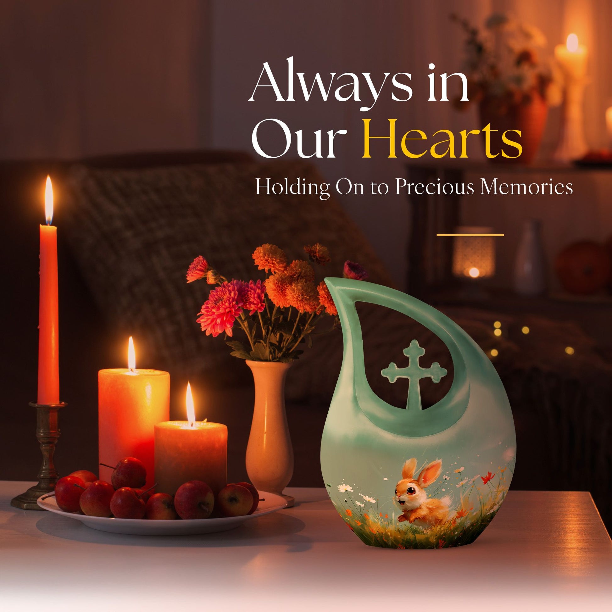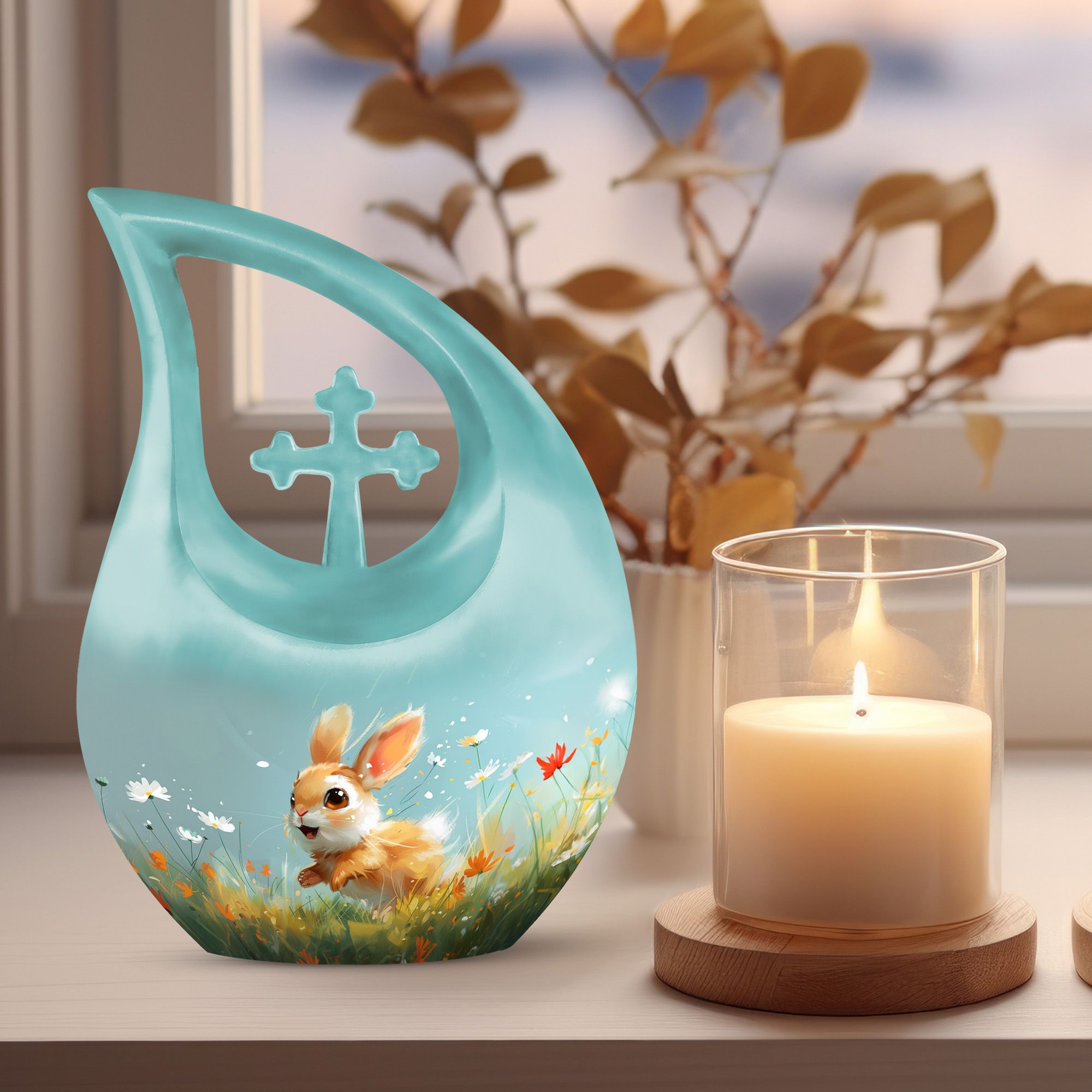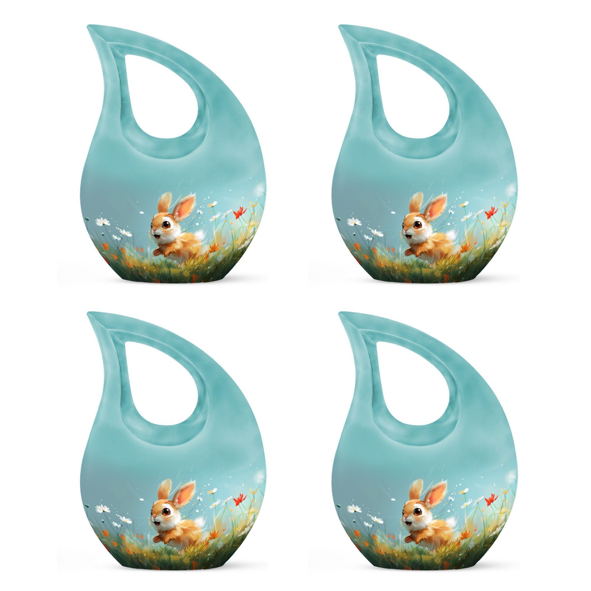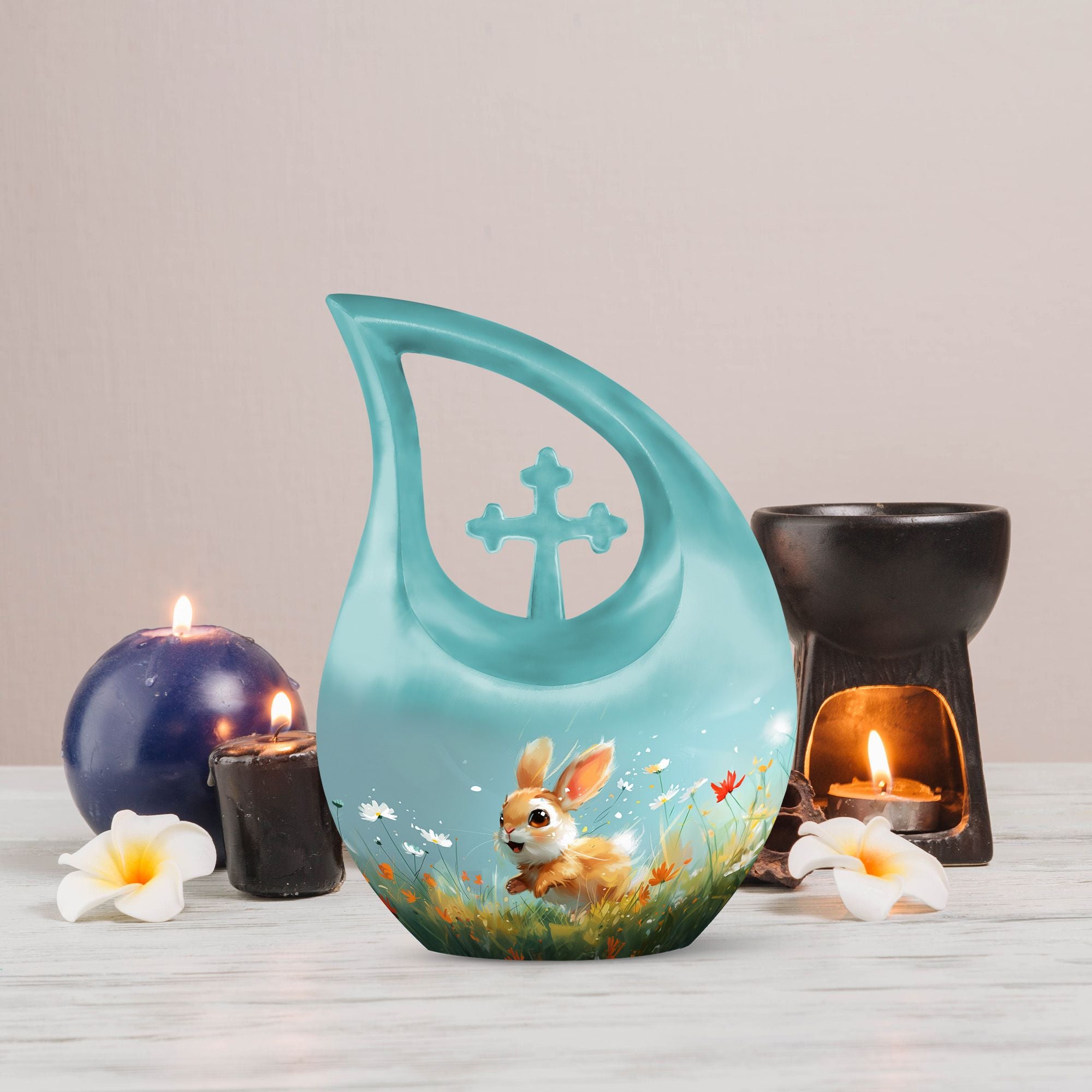 Introducing the Joyful Meadow Bunny Urn, this exquisite Large Urn, perfect for two persons and functionally designed to provide solemn respect to your loved ones. Constructed with sturdy Aluminium material, the urn measures 10 inches in height and captures the essence of tranquility with a unique Cross Drop theme. It weighs 3.3 pounds and has an ample capacity of 200 cubic inches to securely contain the ashes. Along with the urn, a velvet pouch is included for containment of the ashes, ensuring that your loved one's remains are preserved respectfully. The urn can also be personalized by engraving names, helping to eternalize the memory of the departed. Target keywords like Affordable Cremation and Burial Urn, Biodegradable Urn, Cremation Containers for Humans, and Cremation Vaults further elucidate the product's features. Ideal for individuals searching for memorial urns, this Joyful Meadow Bunny Urn is not only an expression of love but also a testament to one's existence.