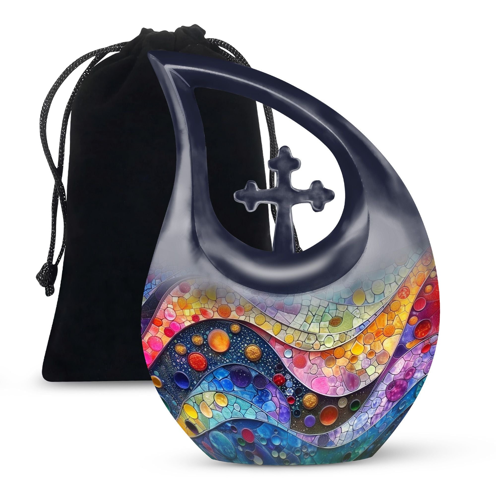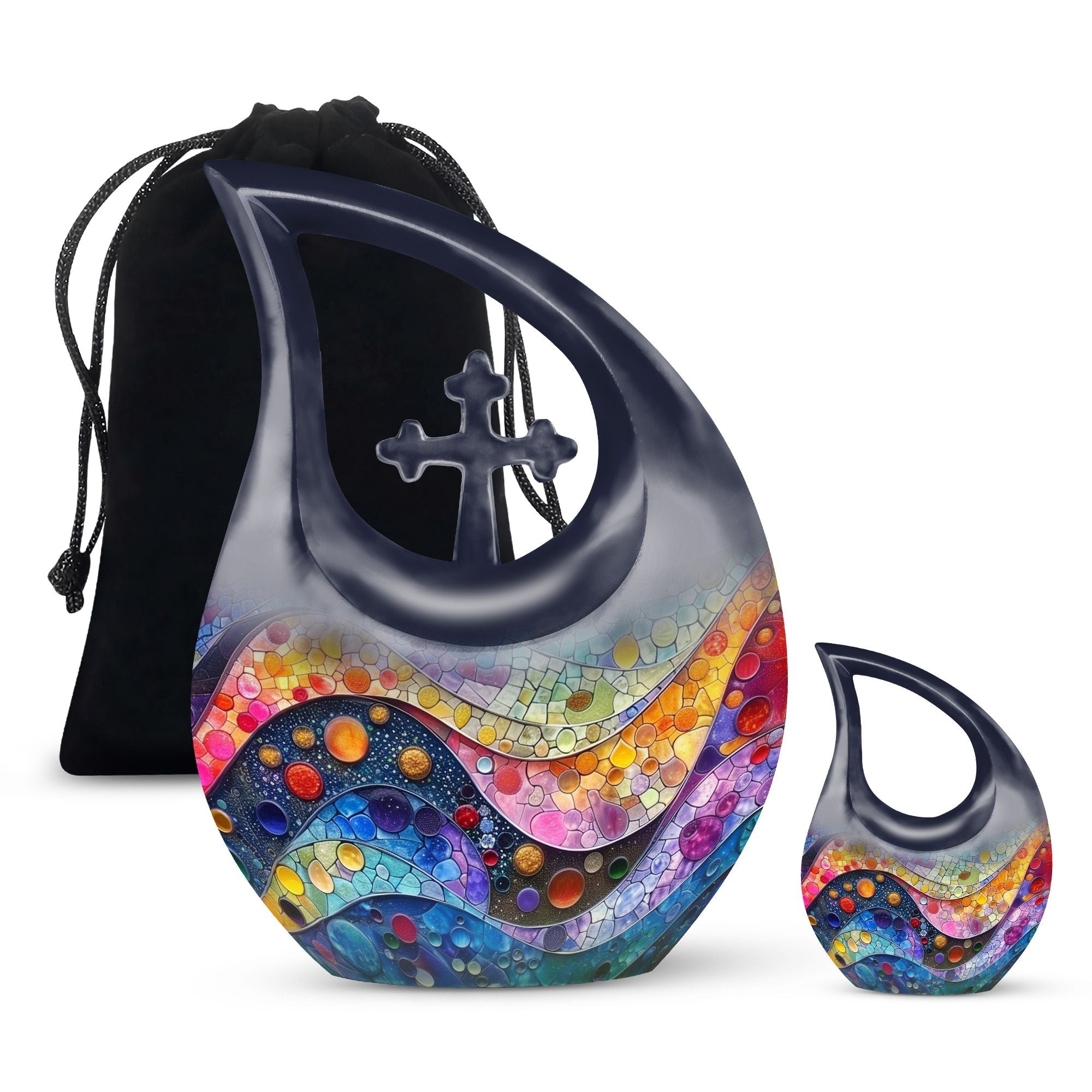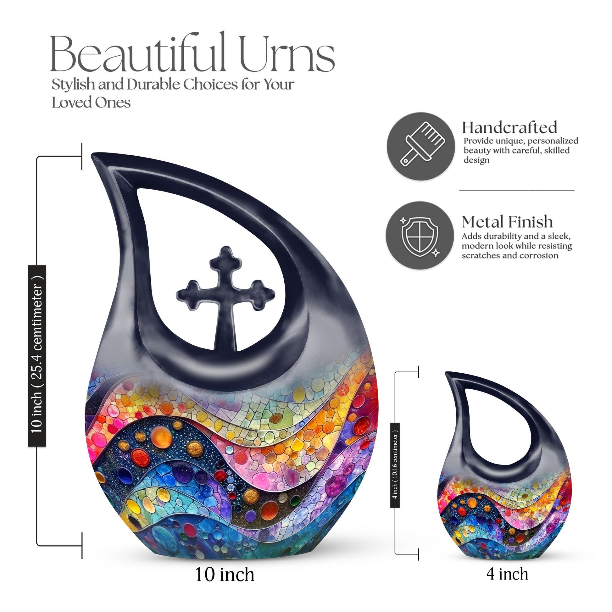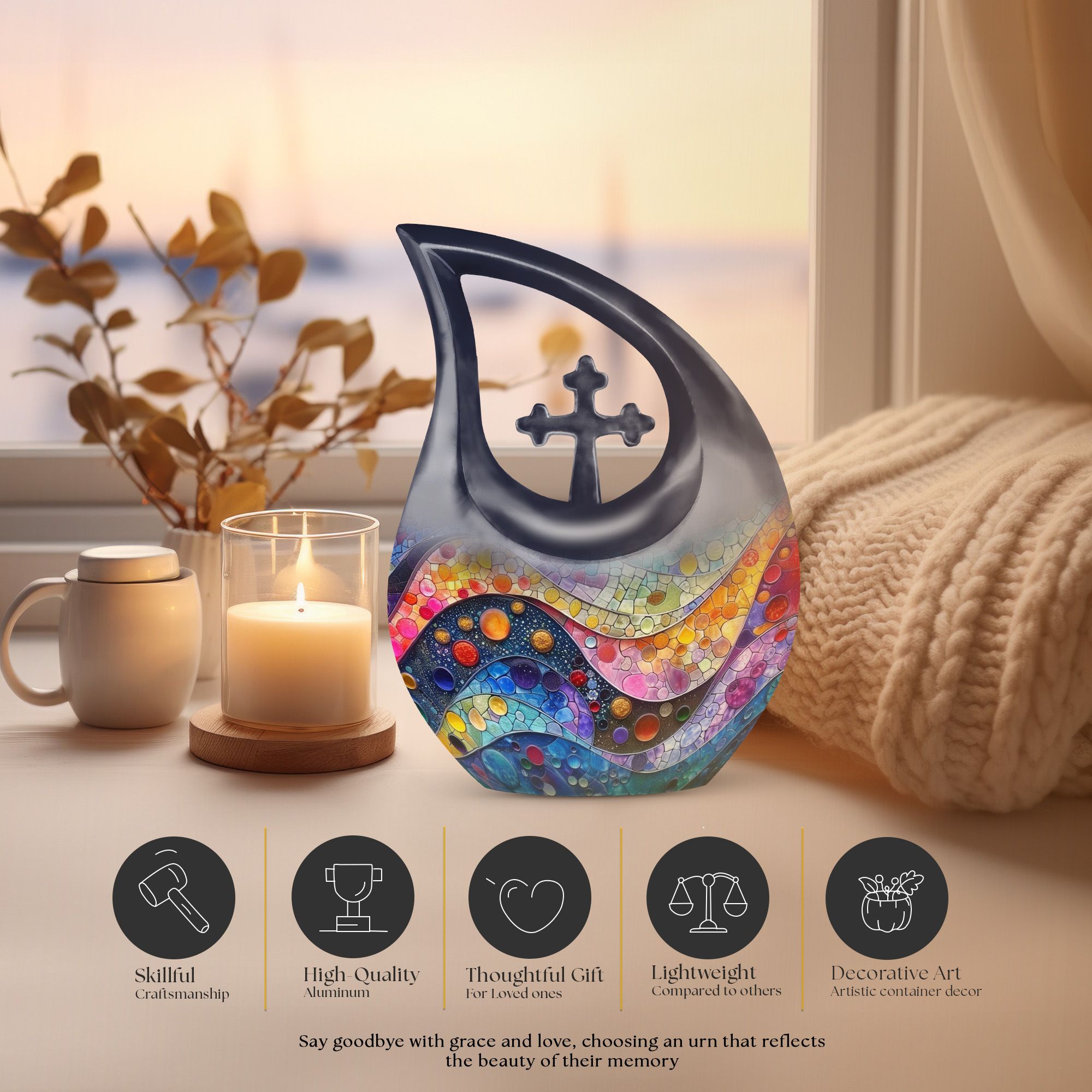 Experience the unique blend of serenity and elegance with our 'Kaleidoscopic Dreamscape Spectrum Urn,' a stunning piece of memorial ceremony supply! Sized at 10 inches, these cool urns bring forward an exquisite blend of style and purpose. The urn design, 'Cross Drop,' embodies a symbol of faith and honor, making it apt for your loved ones. Our package features a velvet pouch, perfect for secure containment of ashes. Weighing 3.3 pounds with a capacity of 200 cubic inches, it is perfect for honoring your beloved. Opt for personalization by engraving names, making it a unique keepsake. Large urns crafted from hard-wearing aluminium ensures durability, reflecting our commitment to high quality. So, choose this remarkable and affordable urn to commemorate the beautiful memories of your favourite souls in the most significant manner. Perfect keywords to search for our product could be 'Companion Urns For Human Ashes, Memorial Urns For Human Ashes'.