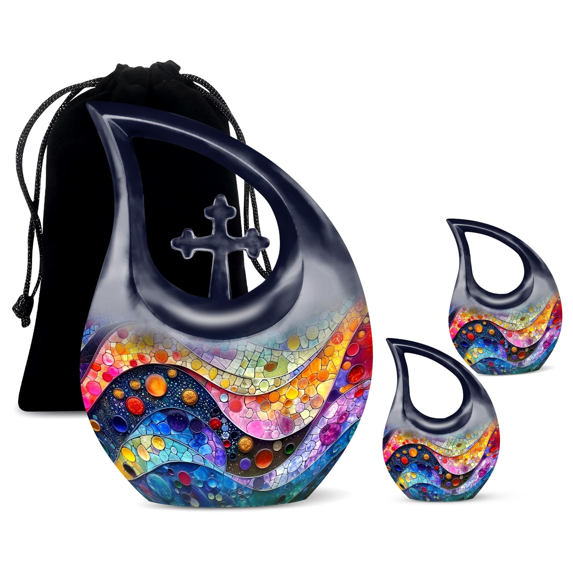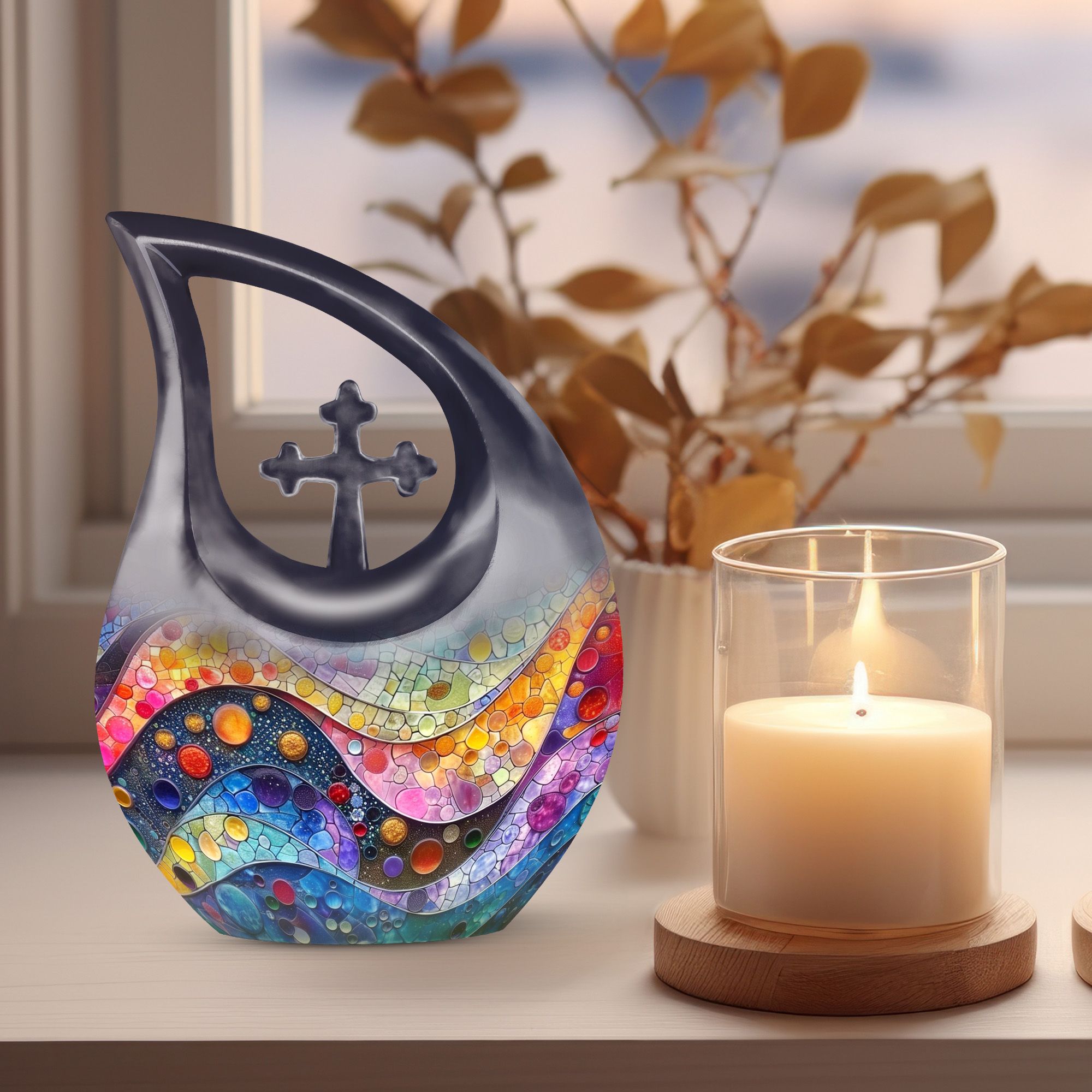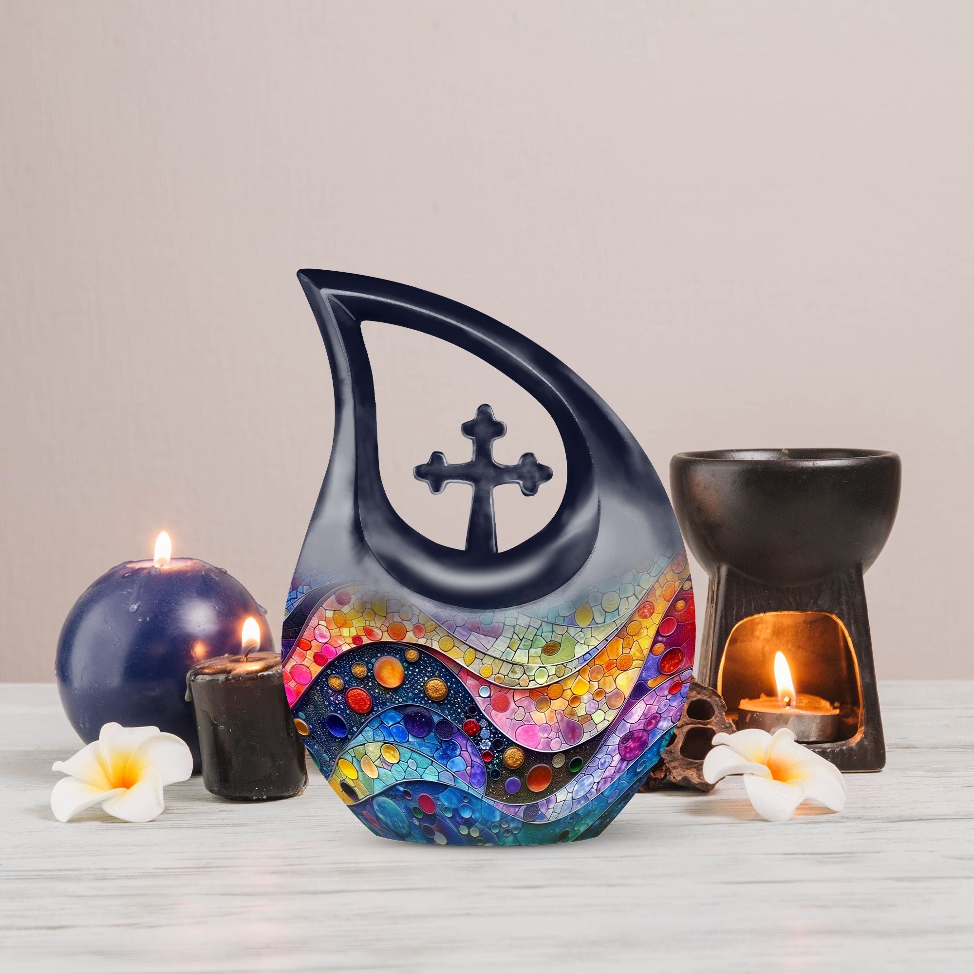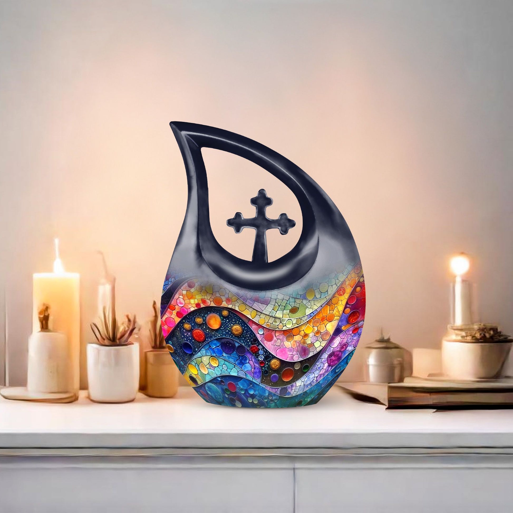 Experience the unique blend of serenity and elegance with our 'Kaleidoscopic Dreamscape Spectrum Urn,' a stunning piece of memorial ceremony supply! Sized at 10 inches, these cool urns bring forward an exquisite blend of style and purpose. The urn design, 'Cross Drop,' embodies a symbol of faith and honor, making it apt for your loved ones. Our package features a velvet pouch, perfect for secure containment of ashes. Weighing 3.3 pounds with a capacity of 200 cubic inches, it is perfect for honoring your beloved. Opt for personalization by engraving names, making it a unique keepsake. Large urns crafted from hard-wearing aluminium ensures durability, reflecting our commitment to high quality. So, choose this remarkable and affordable urn to commemorate the beautiful memories of your favourite souls in the most significant manner. Perfect keywords to search for our product could be 'Companion Urns For Human Ashes, Memorial Urns For Human Ashes'.