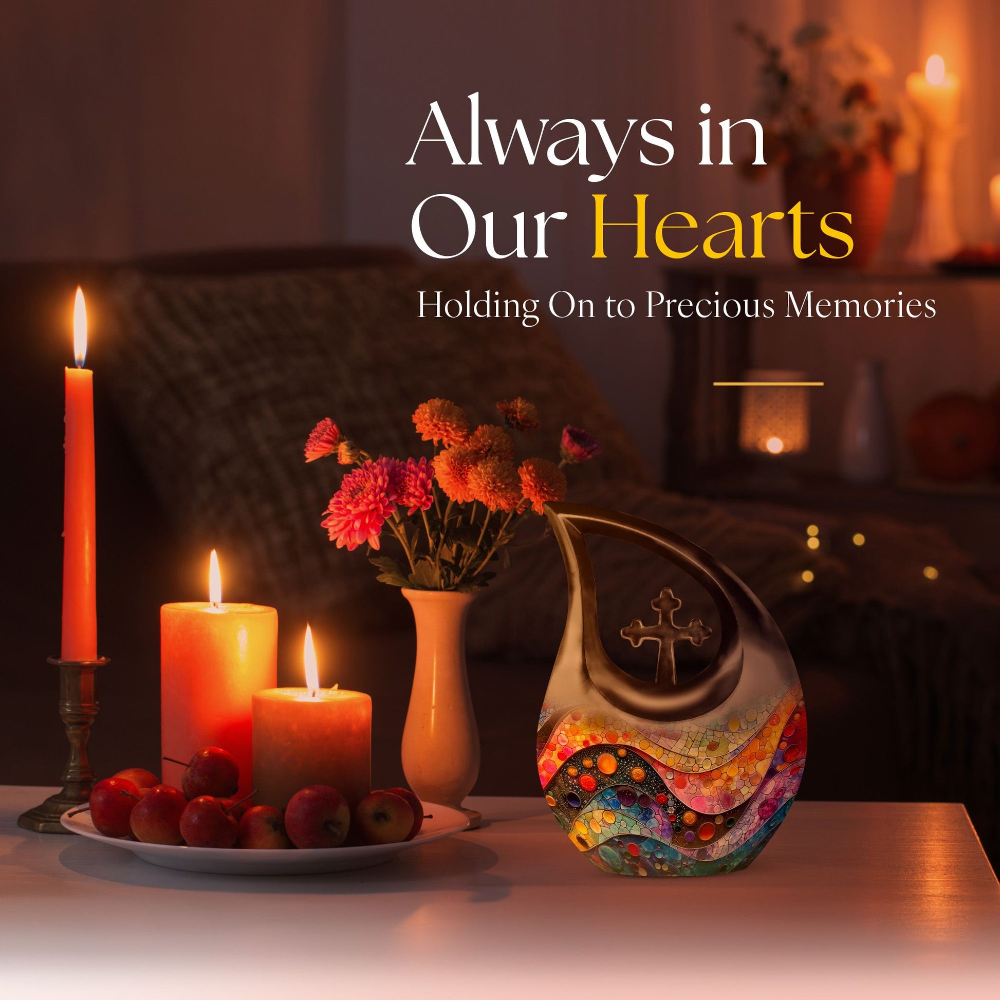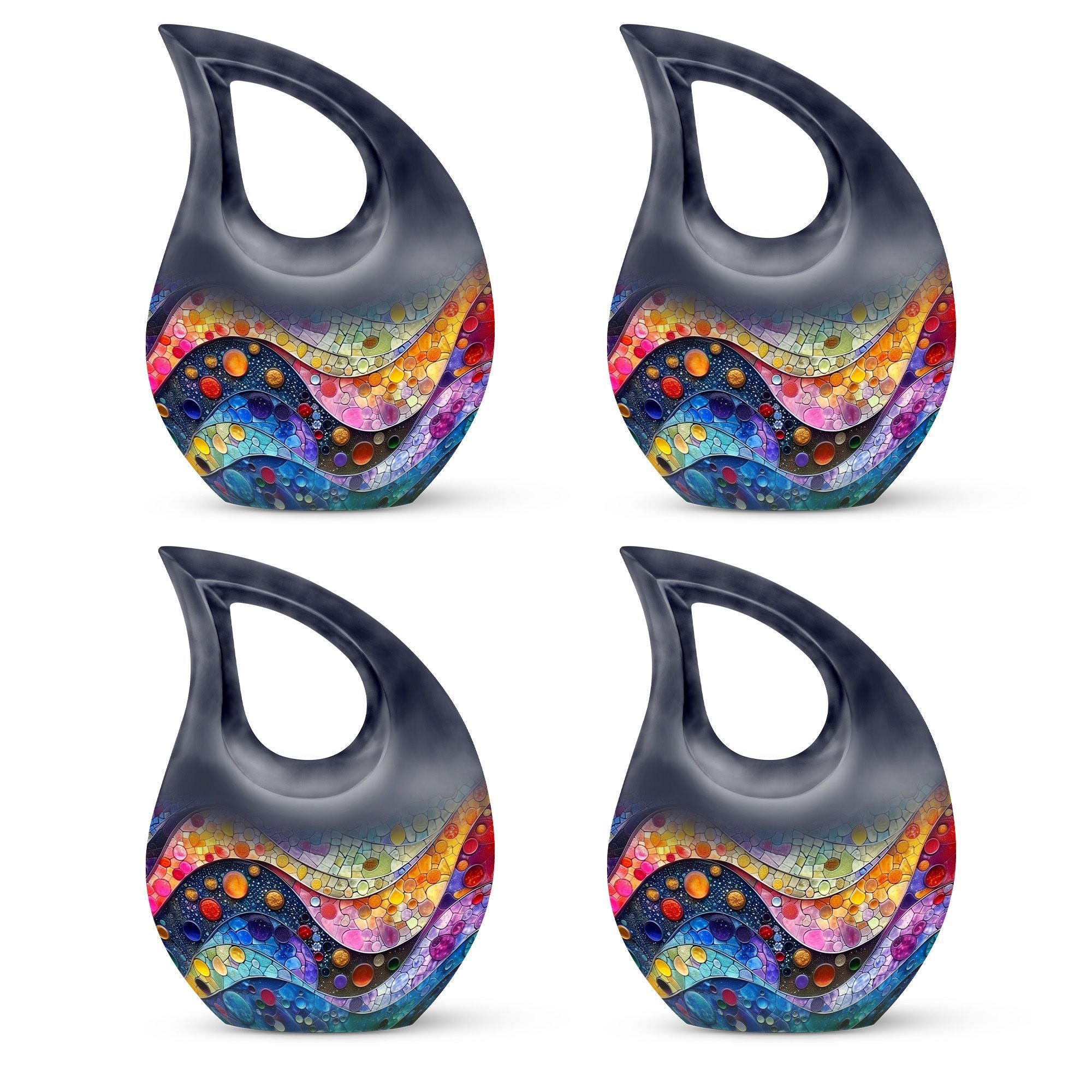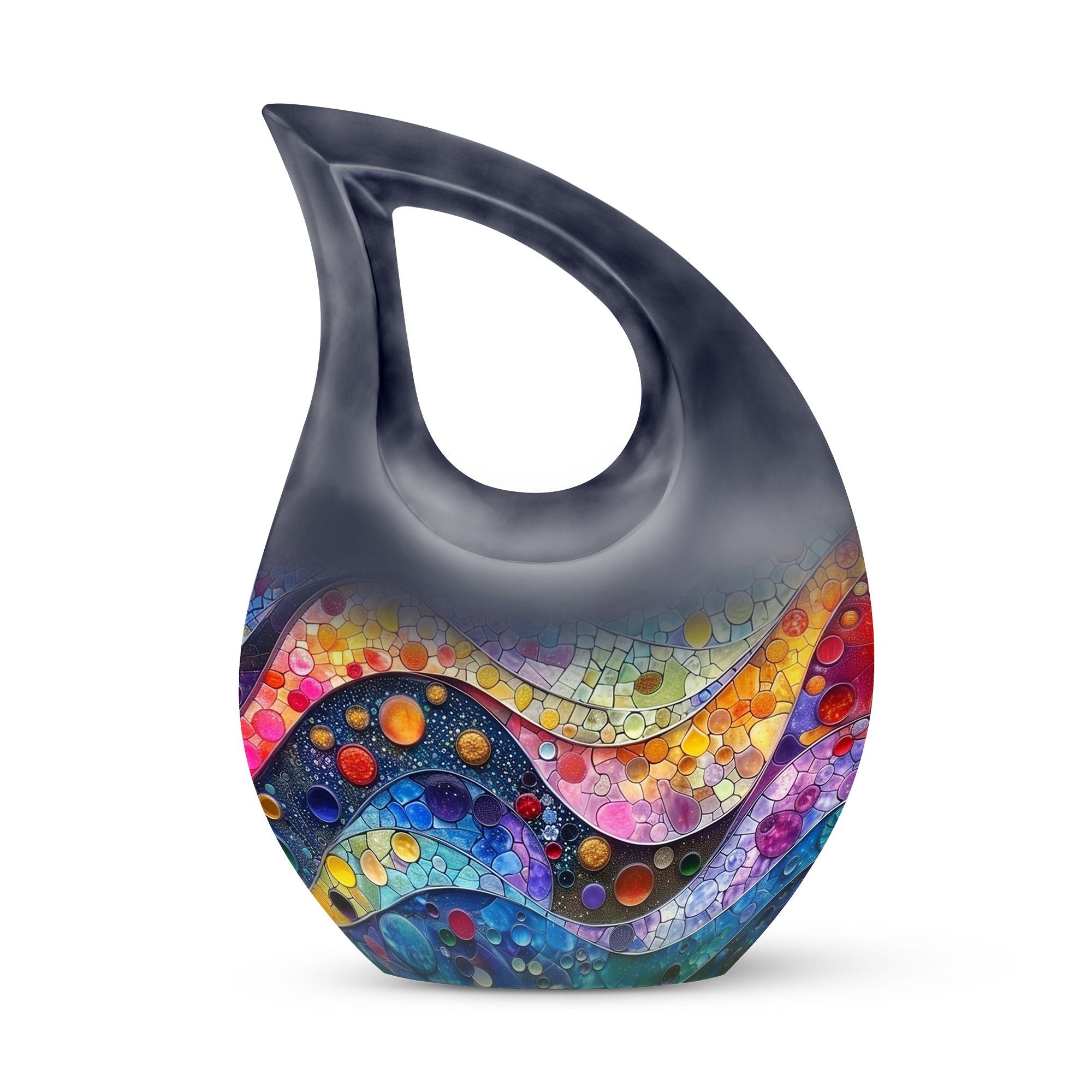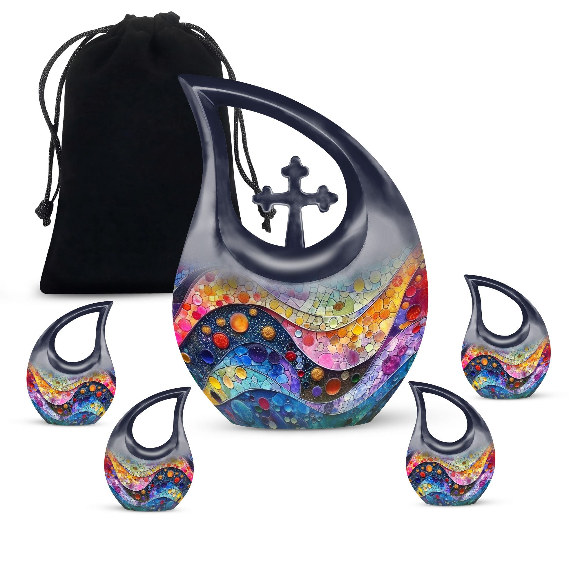 Experience the unique blend of serenity and elegance with our 'Kaleidoscopic Dreamscape Spectrum Urn,' a stunning piece of memorial ceremony supply! Sized at 10 inches, these cool urns bring forward an exquisite blend of style and purpose. The urn design, 'Cross Drop,' embodies a symbol of faith and honor, making it apt for your loved ones. Our package features a velvet pouch, perfect for secure containment of ashes. Weighing 3.3 pounds with a capacity of 200 cubic inches, it is perfect for honoring your beloved. Opt for personalization by engraving names, making it a unique keepsake. Large urns crafted from hard-wearing aluminium ensures durability, reflecting our commitment to high quality. So, choose this remarkable and affordable urn to commemorate the beautiful memories of your favourite souls in the most significant manner. Perfect keywords to search for our product could be 'Companion Urns For Human Ashes, Memorial Urns For Human Ashes'.
