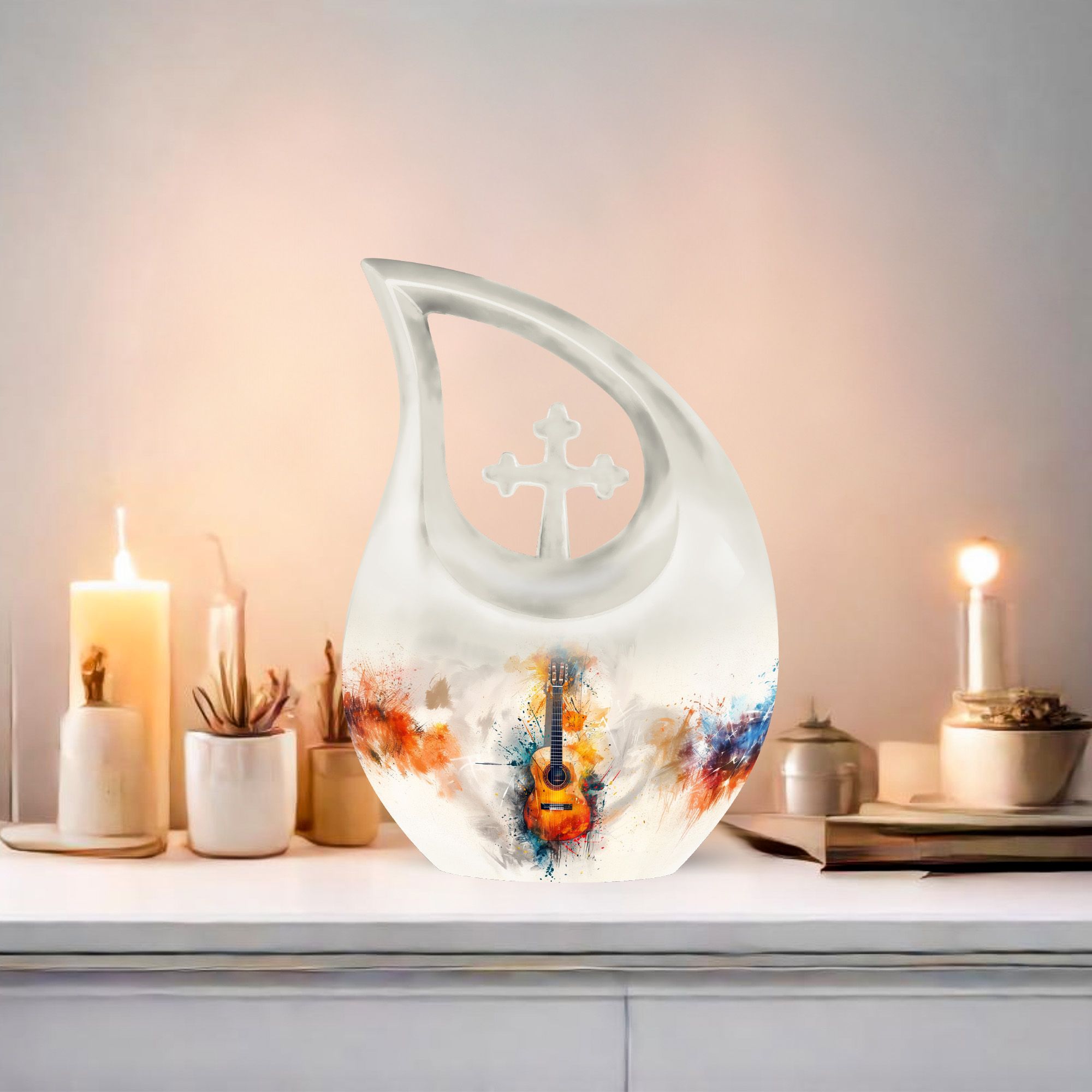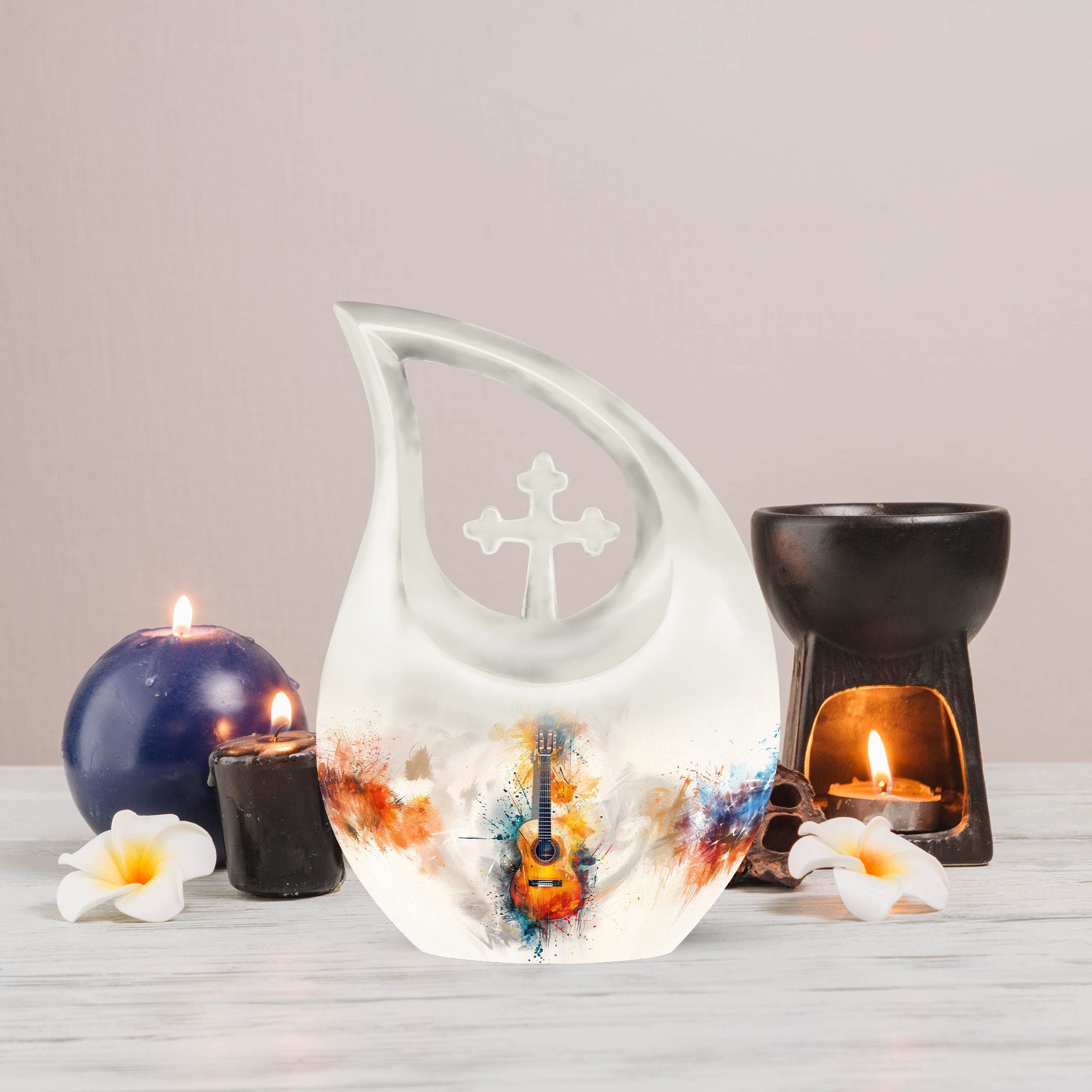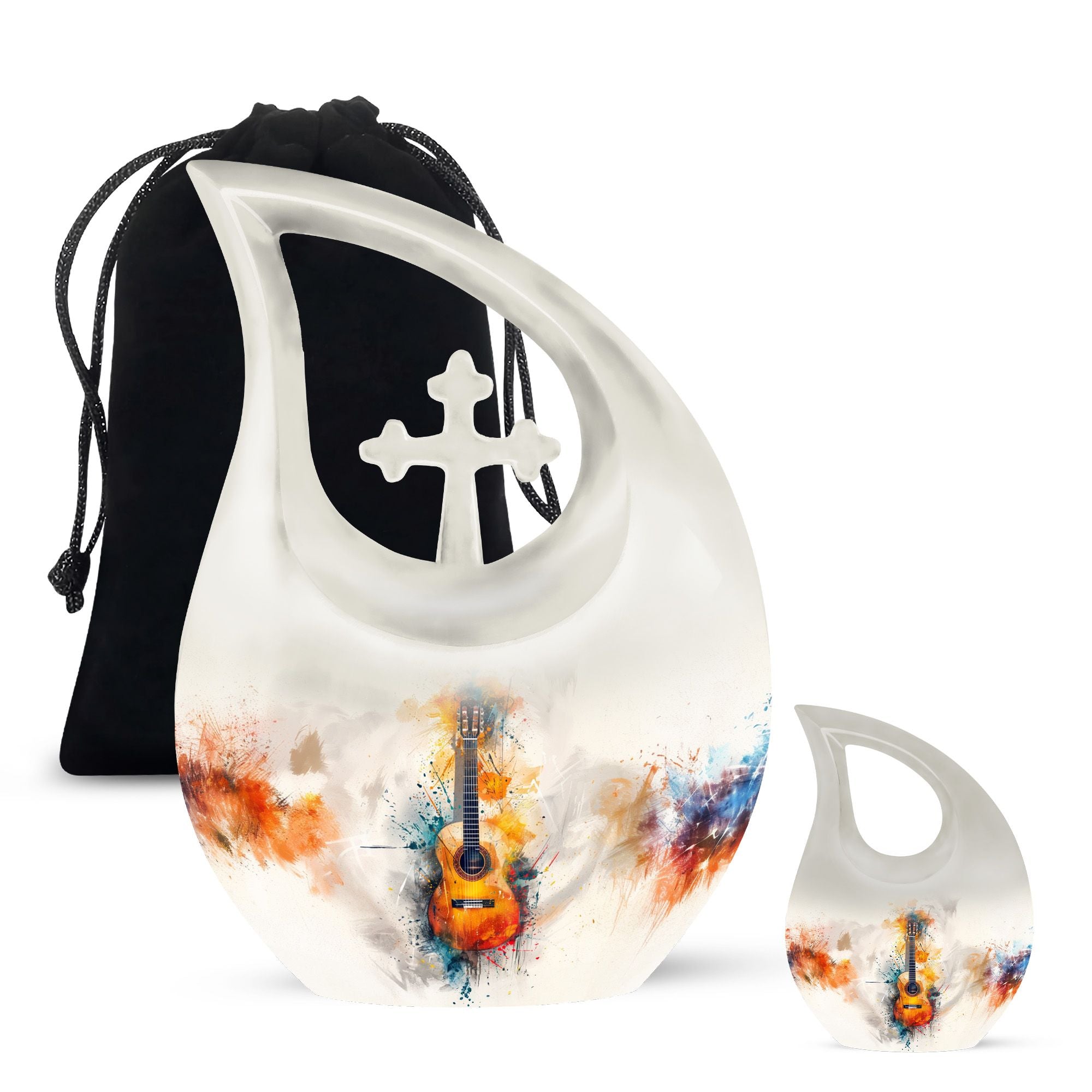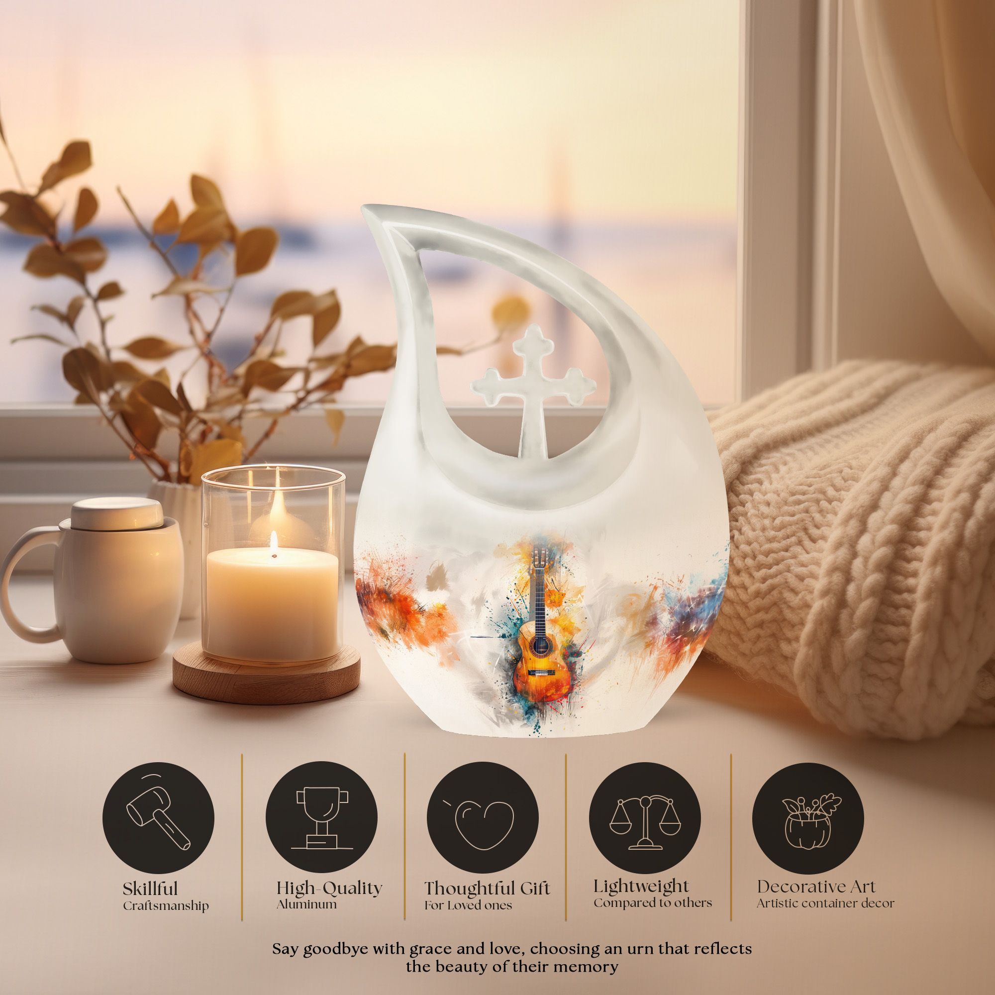 Immerse in profound serenity as you honor your loved one with our Cross Drop Guitar Urn. As one of our distinguishing large urns for men's ashes, this piece adds a unique spin to memorial urns, celebrating a passion for music. The masterfully crafted aluminium urn stands 10 inches tall, with an accommodating size of 200 cubic inches, making it capable of housing the ashes of an adult. For a weight of 3.3 pounds, it features a 'Cross Drop' theme, subtly interweaving faith with a love for the guitar. This specialty item comes complete with a velvet pouch providing a respectful repository for the ashes of your loved one. For an added touch of intimacy, we offer personalization, allowing for engraved names. If you seek tribute items beyond the customary, such as extra large cremation urns or keepers for ashes for a man, our Cross Drop Guitar Urn stands as a soulful alternative. Elevate your memorial ritual with this unique urn, a sublime blend of comfort, creativity, and reverence.