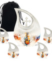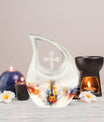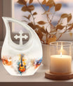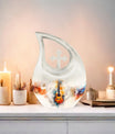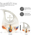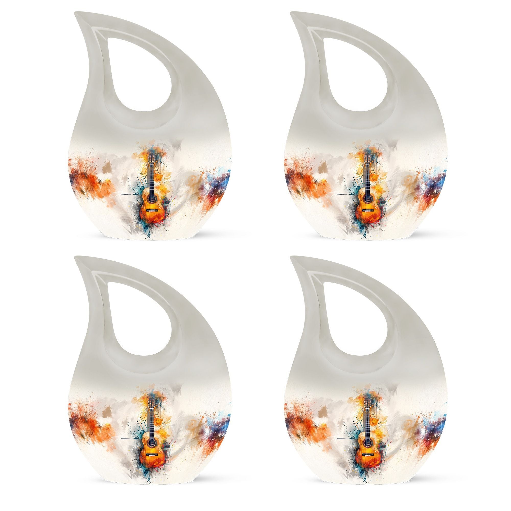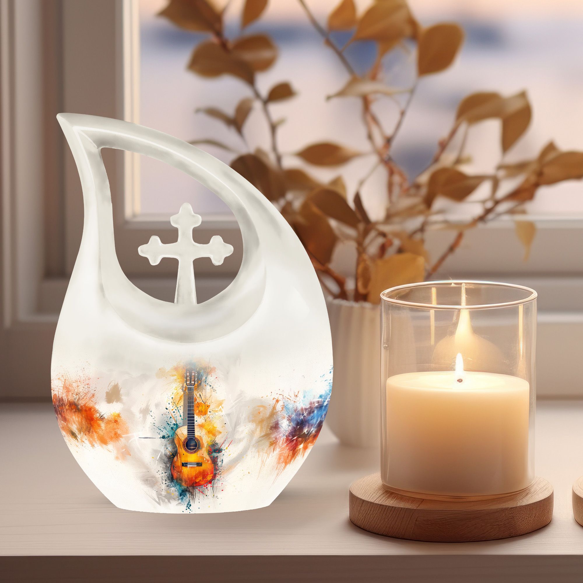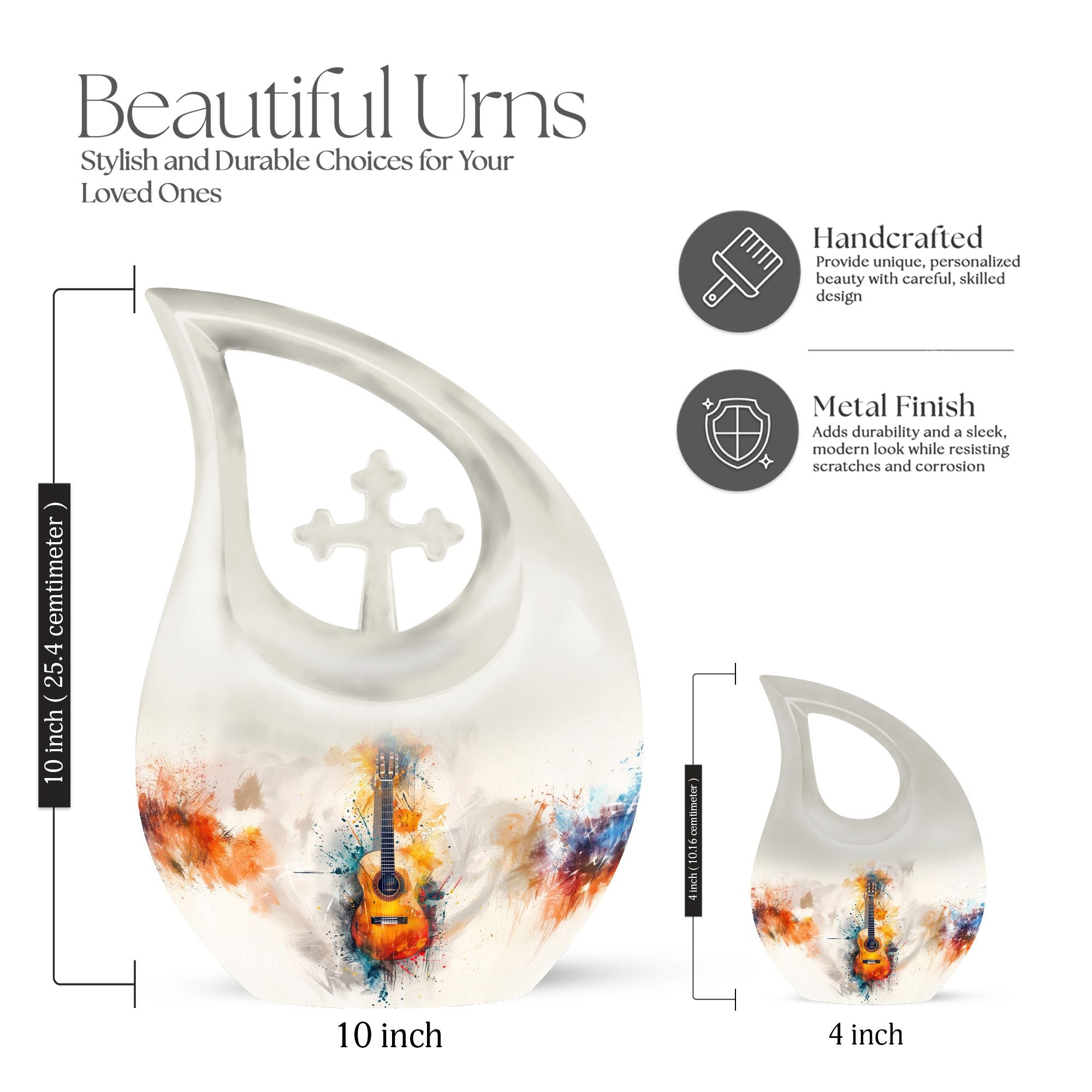 Immerse in profound serenity as you honor your loved one with our Cross Drop Guitar Urn. As one of our distinguishing large urns for men's ashes, this piece adds a unique spin to memorial urns, celebrating a passion for music. The masterfully crafted aluminium urn stands 10 inches tall, with an accommodating size of 200 cubic inches, making it capable of housing the ashes of an adult. For a weight of 3.3 pounds, it features a 'Cross Drop' theme, subtly interweaving faith with a love for the guitar. This specialty item comes complete with a velvet pouch providing a respectful repository for the ashes of your loved one. For an added touch of intimacy, we offer personalization, allowing for engraved names. If you seek tribute items beyond the customary, such as extra large cremation urns or keepers for ashes for a man, our Cross Drop Guitar Urn stands as a soulful alternative. Elevate your memorial ritual with this unique urn, a sublime blend of comfort, creativity, and reverence.