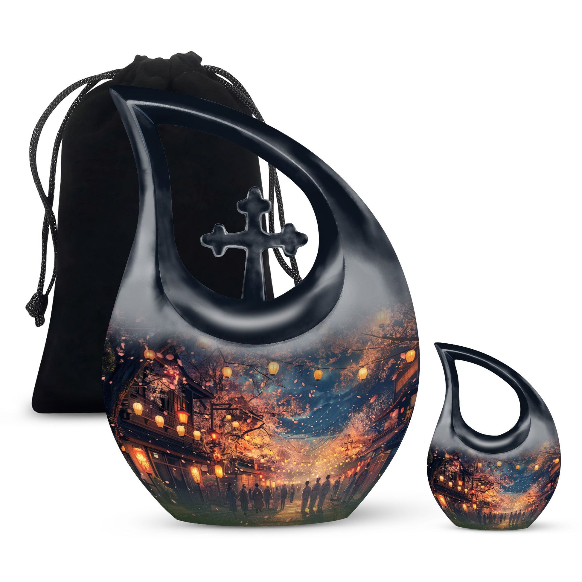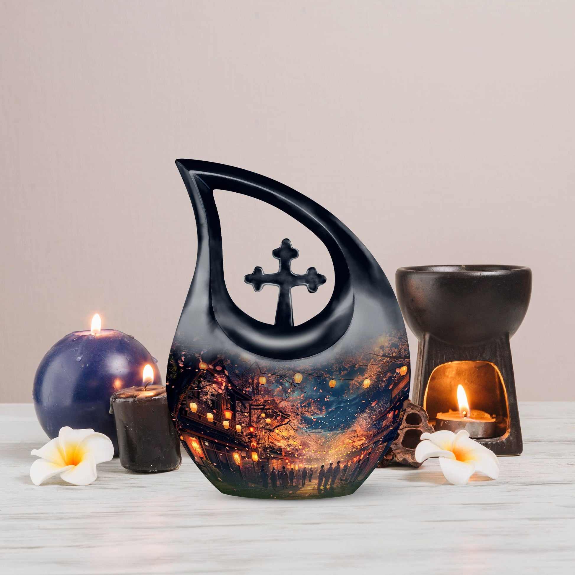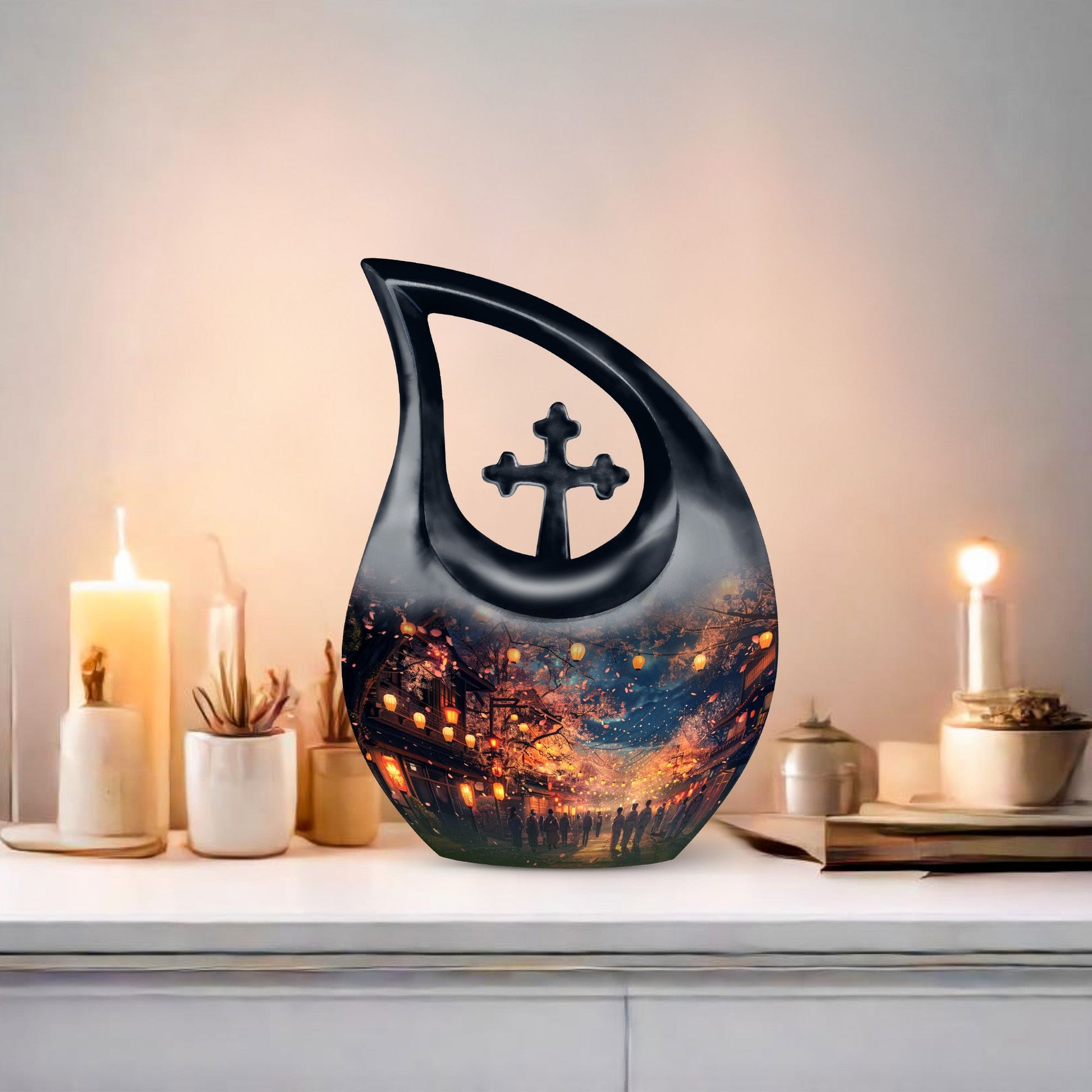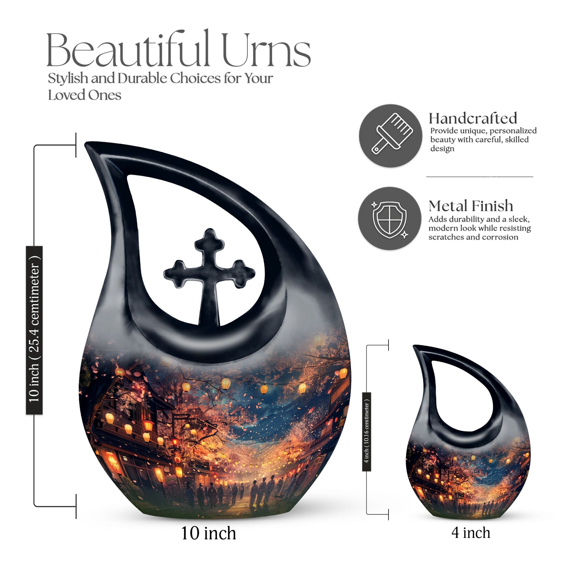 Our 'Lanterns Aglow In Urn' offers a unique and meaningful way to honor a loved one's memory. Crafted with dedication, this large cremation urn is made of robust aluminium, ensuring lasting beauty and durability. Avowedly it stands at 10 inches in height, embracing a weight of 3.3 pounds with a generous storage capacity of 200 cubic inches. This intriguing 'Cross Drop' style captures attention while still maintaining the aura of the memorial urns. Personalize this urn with engraved names to create a keepsake as unique as your loved one. The urn is accompanied by a lustrous velvet pouch for sensitive containment and transport of the ashes. Whether you're seeking cremation urn vaults, unique cremation keepsakes or special urns, our 'Lanterns Aglow In Urn' is an exquisite choice. Note: Design attributes are not included in this description as per restrictions.