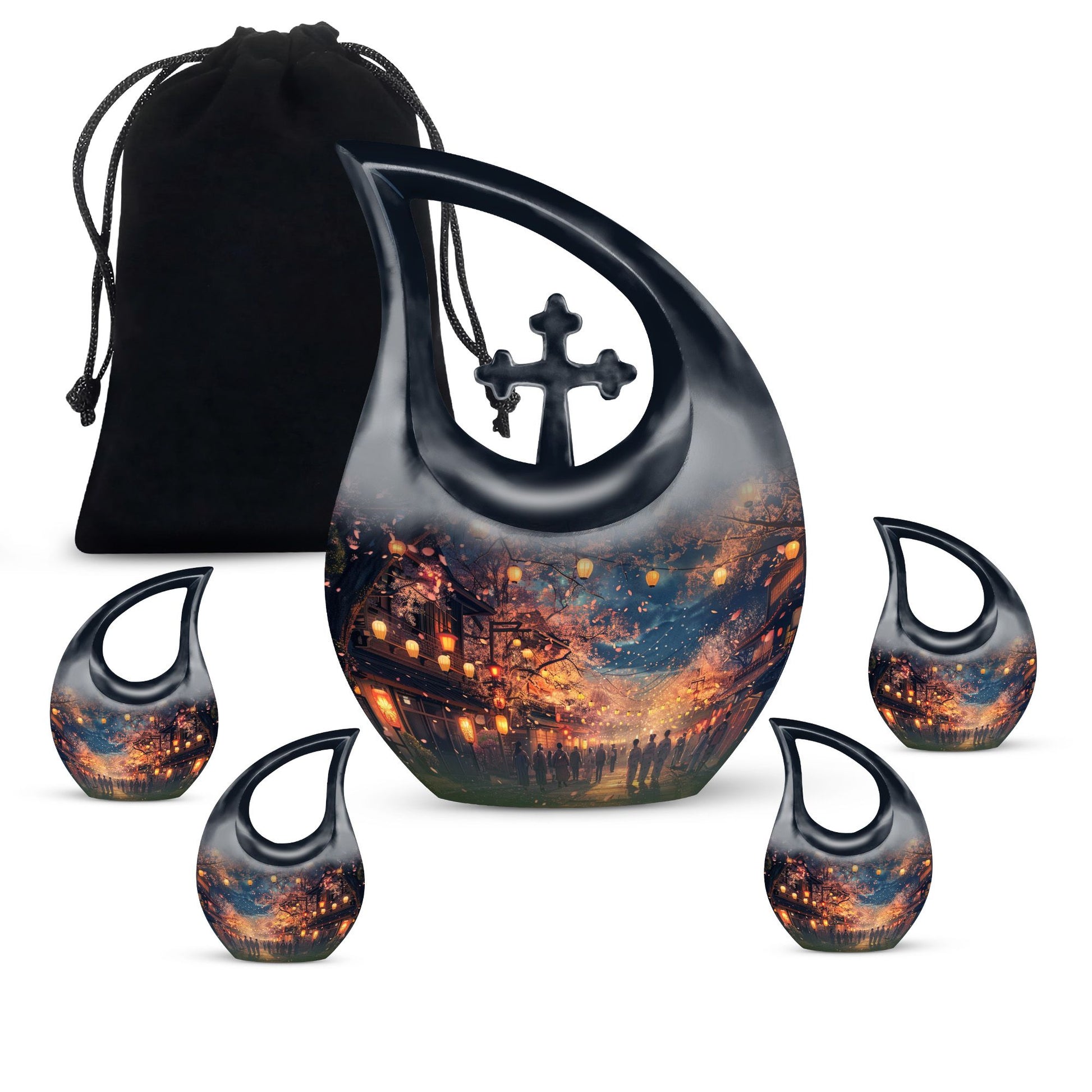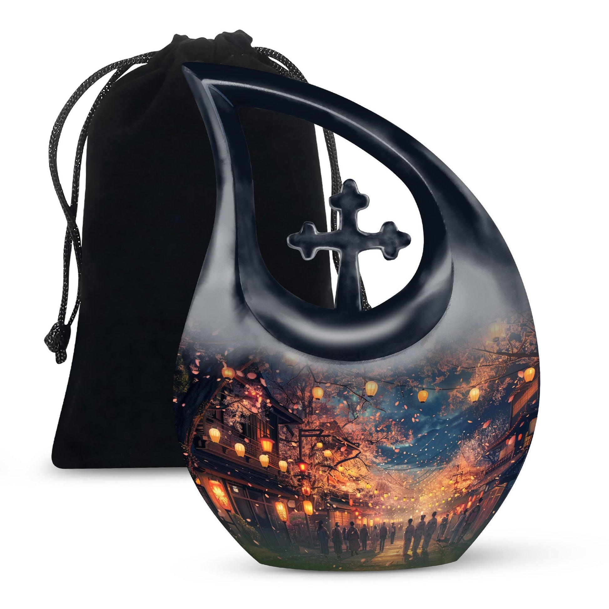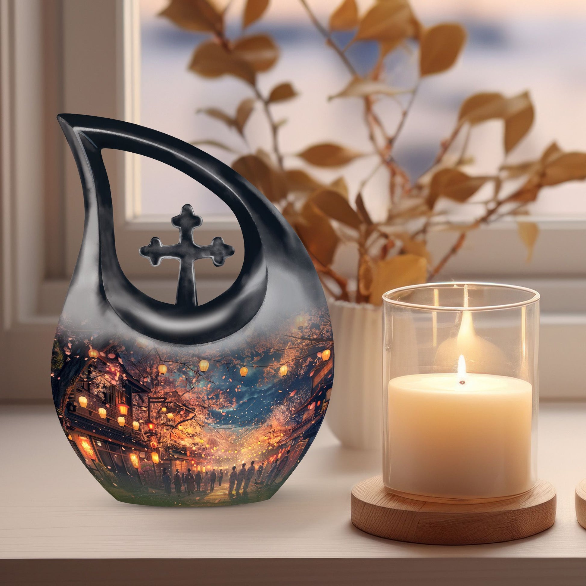 Our 'Lanterns Aglow In Urn' offers a unique and meaningful way to honor a loved one's memory. Crafted with dedication, this large cremation urn is made of robust aluminium, ensuring lasting beauty and durability. Avowedly it stands at 10 inches in height, embracing a weight of 3.3 pounds with a generous storage capacity of 200 cubic inches. This intriguing 'Cross Drop' style captures attention while still maintaining the aura of the memorial urns. Personalize this urn with engraved names to create a keepsake as unique as your loved one. The urn is accompanied by a lustrous velvet pouch for sensitive containment and transport of the ashes. Whether you're seeking cremation urn vaults, unique cremation keepsakes or special urns, our 'Lanterns Aglow In Urn' is an exquisite choice. Note: Design attributes are not included in this description as per restrictions.